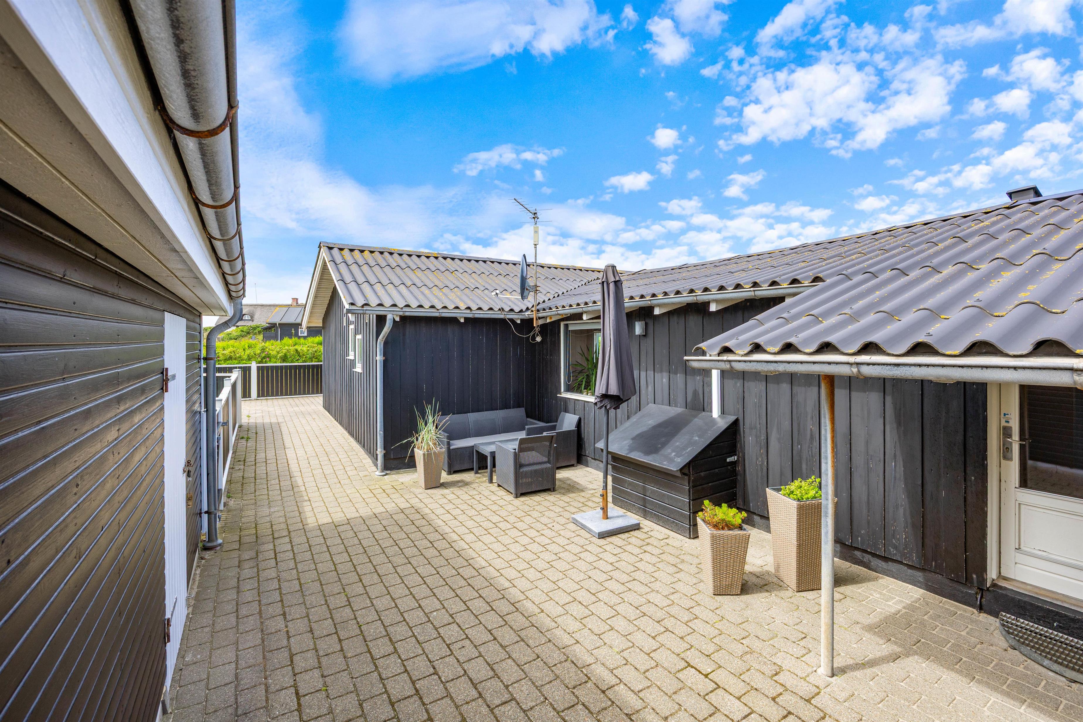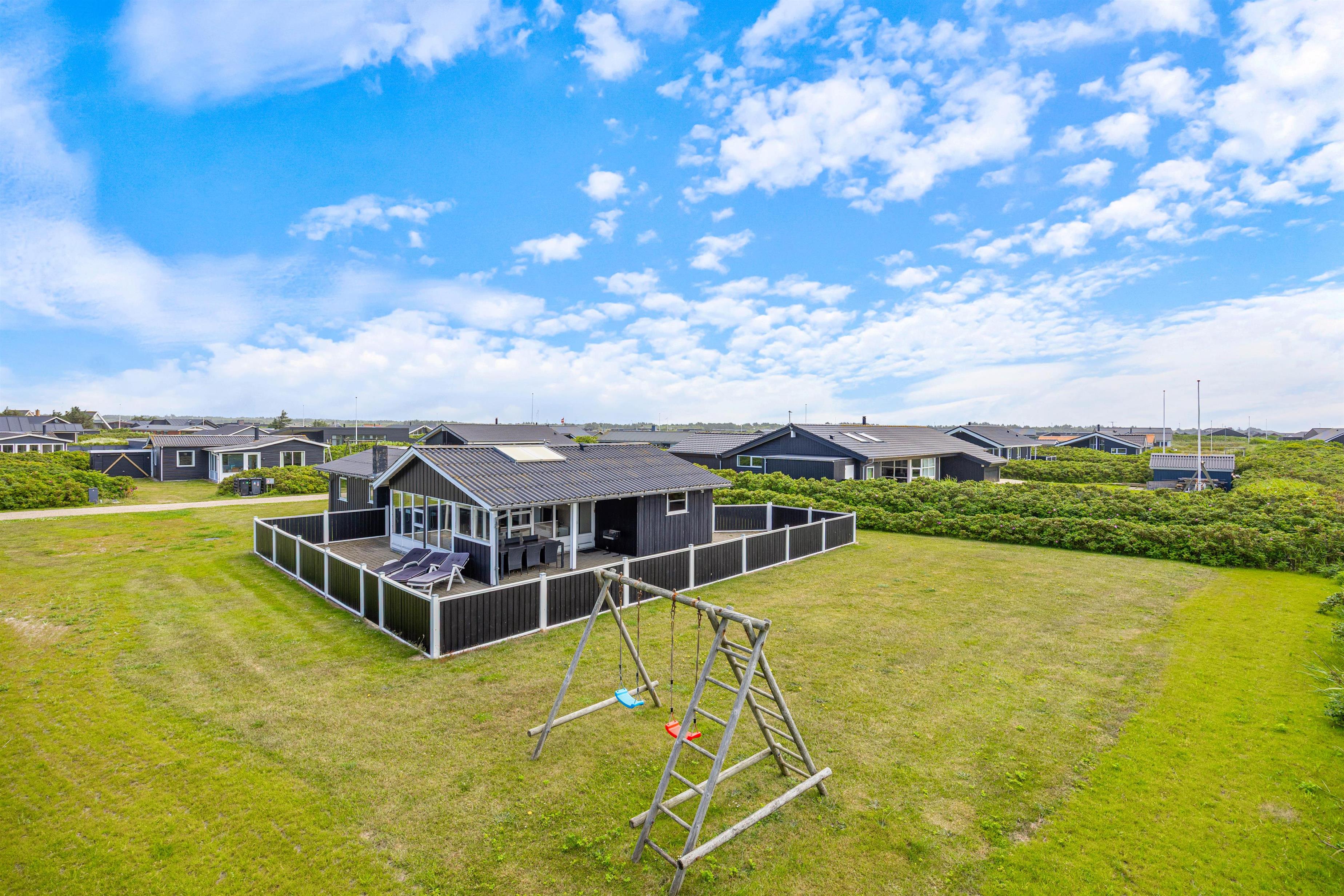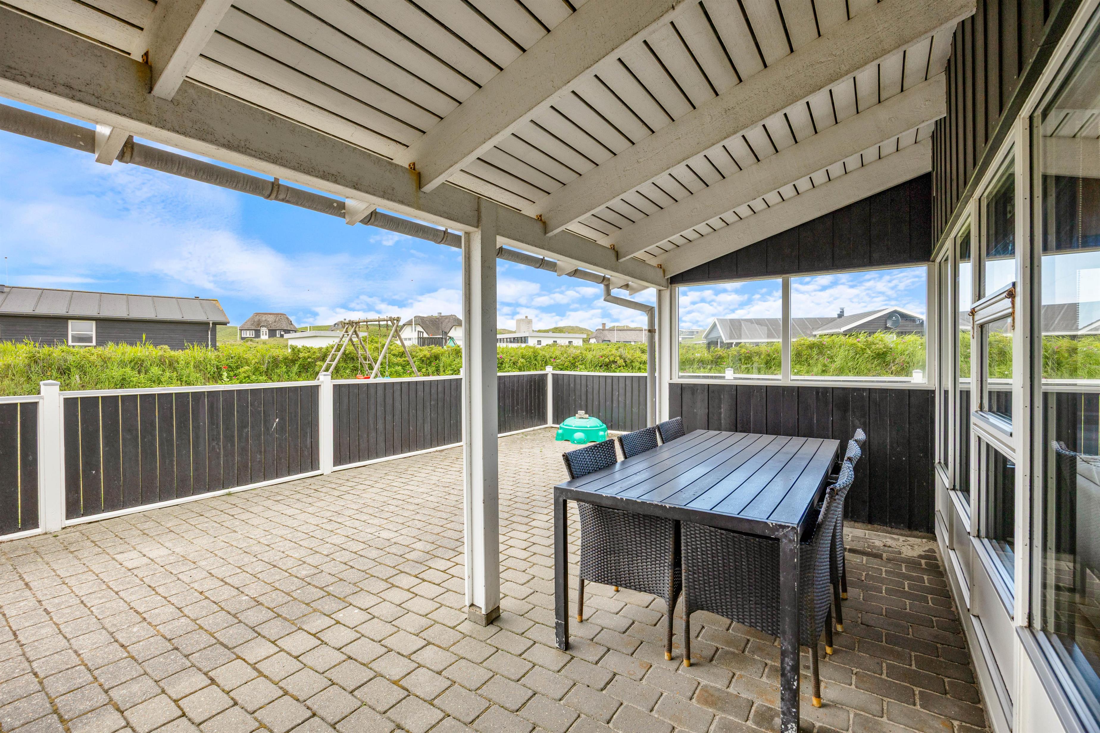 Udenfor har Sommerhuset i Søndervig også en række faciliteter, der passer til alle aldre.Hele vejen rundt om huset har du en dejlig lukket terrasse med flere lækroge, så også her kan du sidde ude og nyde den friske luft og omgivelserne. For de mindste er der en gynge og en sandkasse, mens de voksne kan nyde et koldt glas vin eller andet på den skønne afskærmede terrasse. Den lukkede og overdækkede terrasse giver jer mulighed for at nyde udendørs måltider på alle tidspunkter af dagen. Grillen og havemøblerne indbyder til hyggelige grill-aftener med venner og familie.