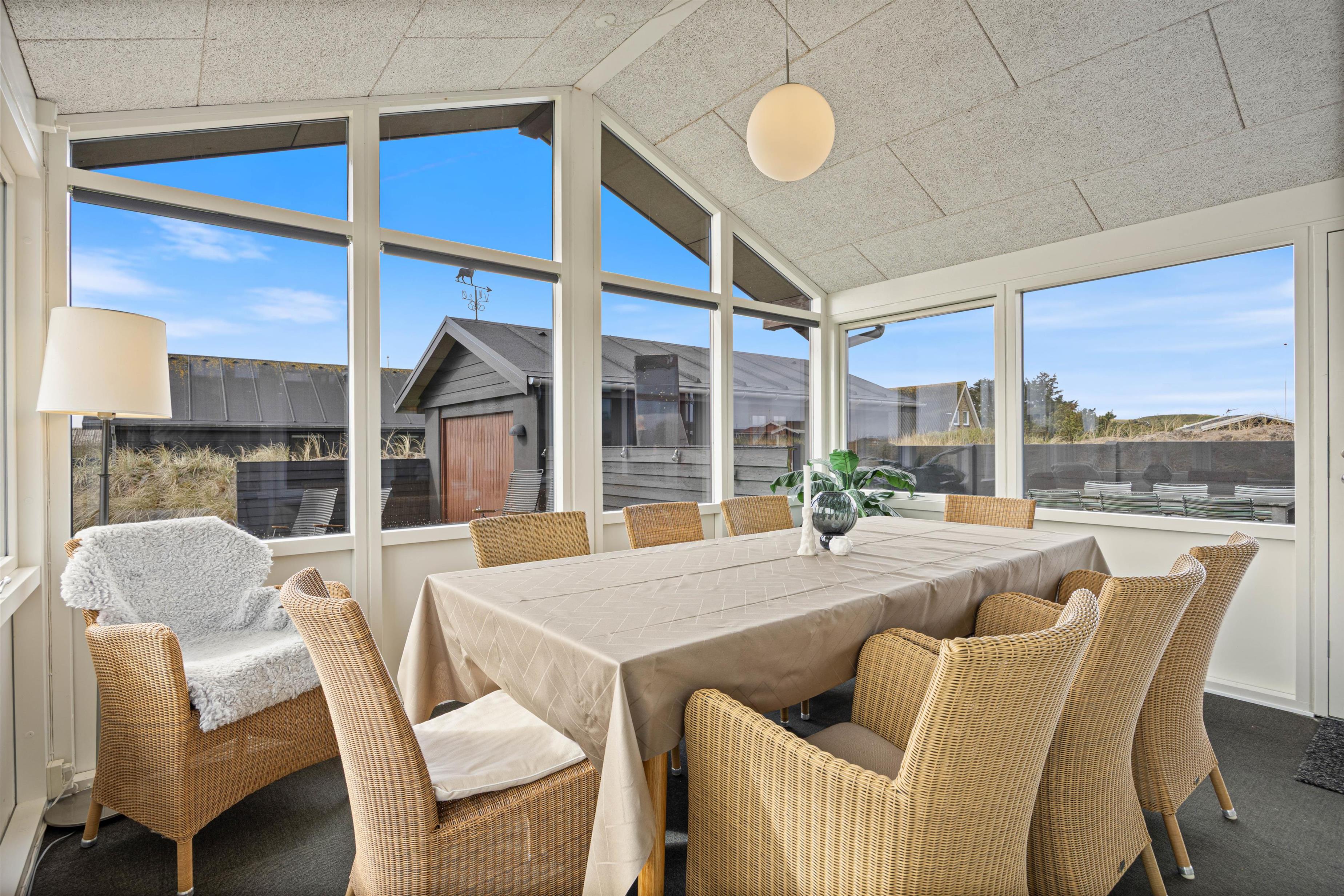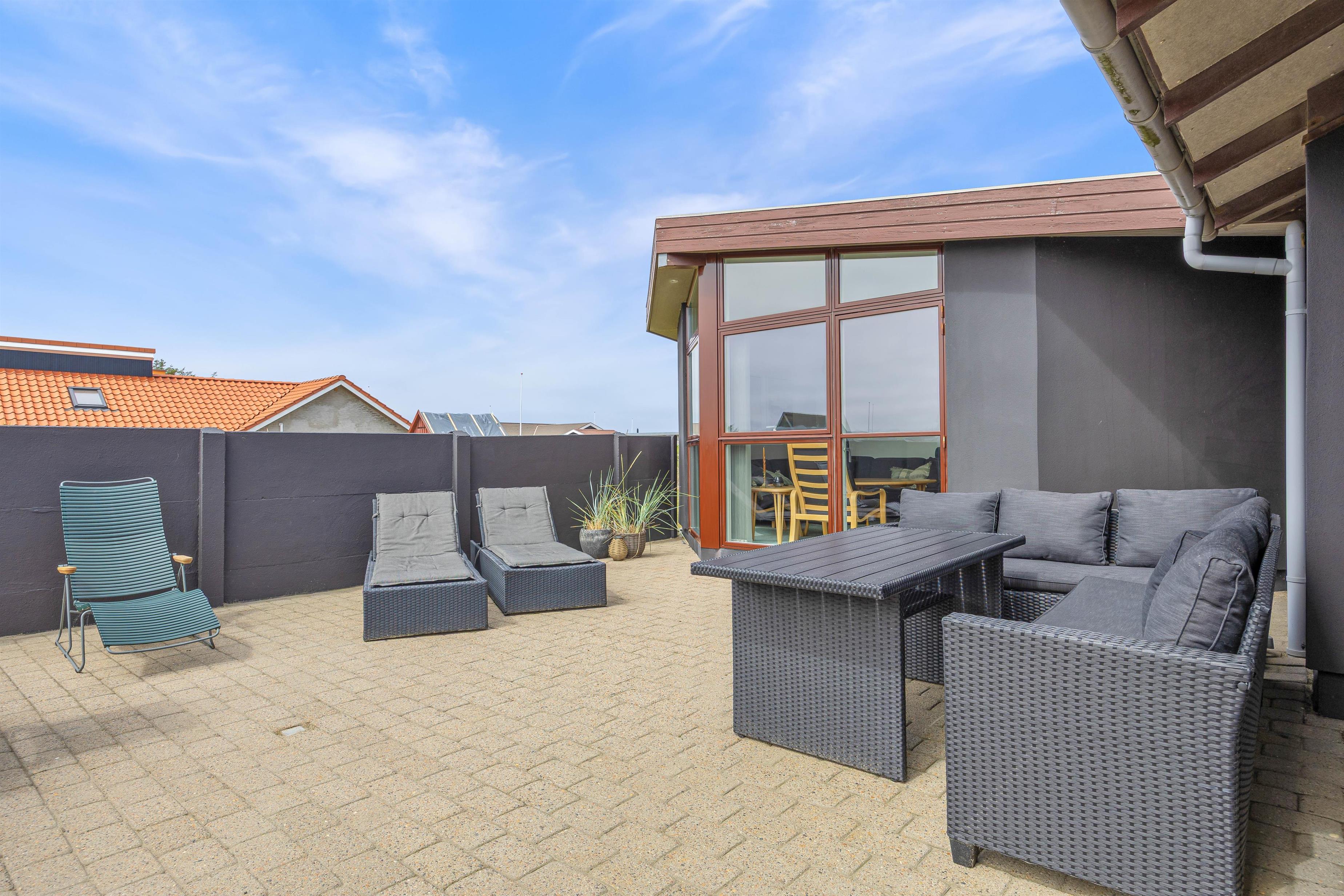 De skønne og solrige dage kan nydes på sommerhusets lukkede og afskærmede terrasse. Tag en lur på udendørs-hjørnesofaen, nyd jeres aftensmad ved havebordet eller nyd solens stråler fra en af liggestolene. Udelivet kan nydes i lige så høj grad som livet indendørs!