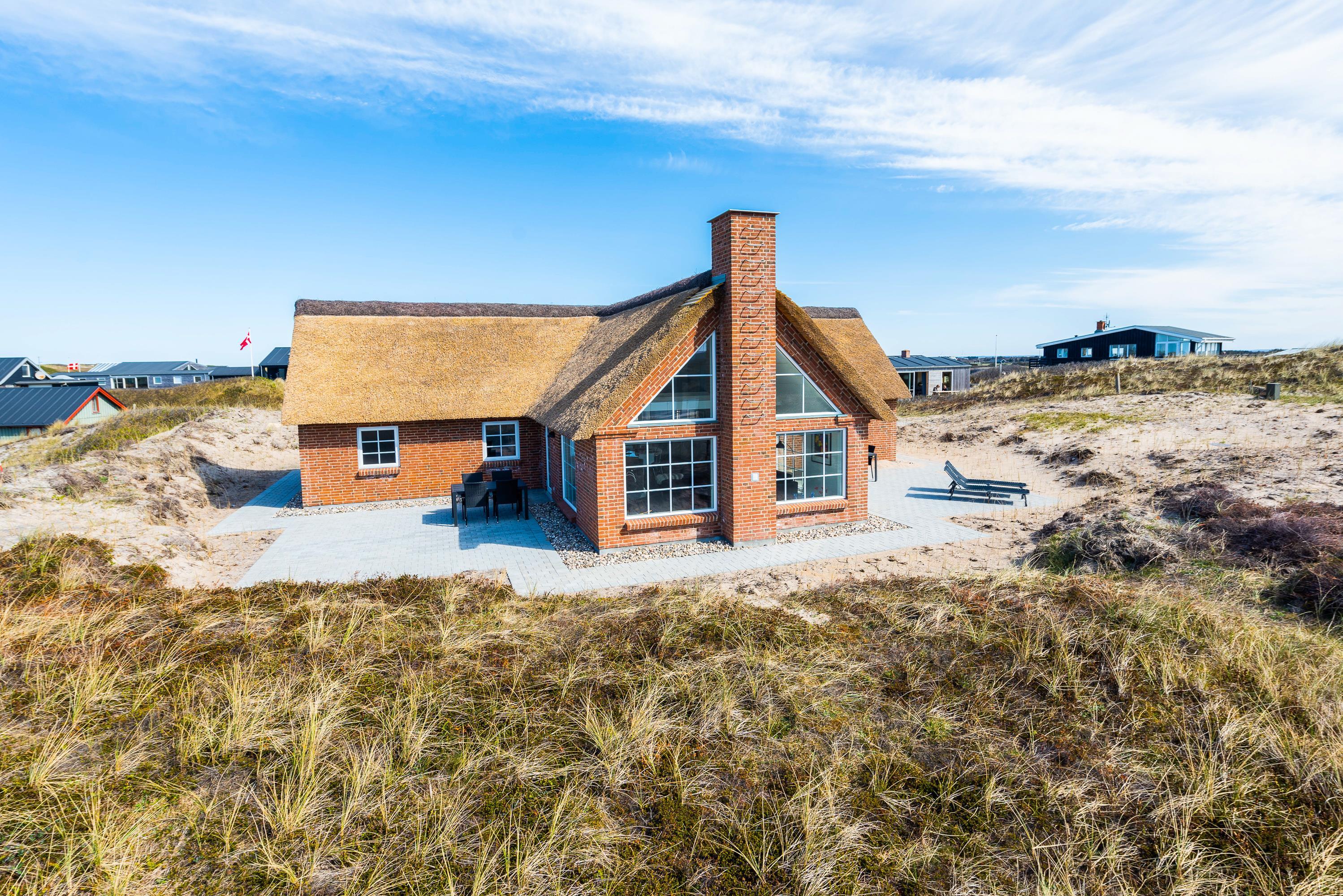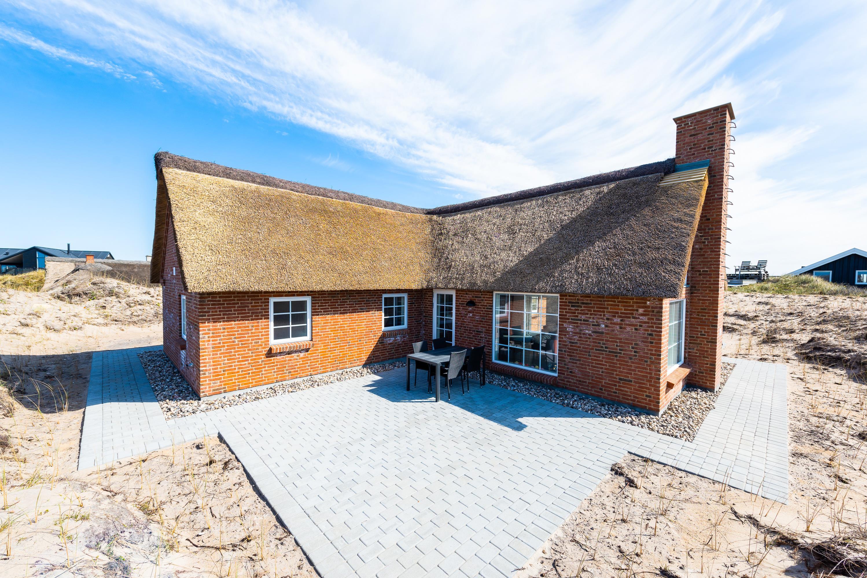 Rundt om sommerhuset går en dejlig terrasse til solbadning i liggestolene. Der er selvfølgelig en grill, så I kan spise en lækker middag rundt om havebordet på de dejlige lune sommeraftener. Sommerhusets beliggenhed er helt fantastisk. Vesterhavet ligger kun 150 meter væk, og på en stille dag kan I nærmest høre bølgernes brusen, når I sidder på terrassen. Den kilometerlange sandstrand indbyder til lange gåture i den friske havluft, og både børnene og hundene vil elske at udforske stranden.