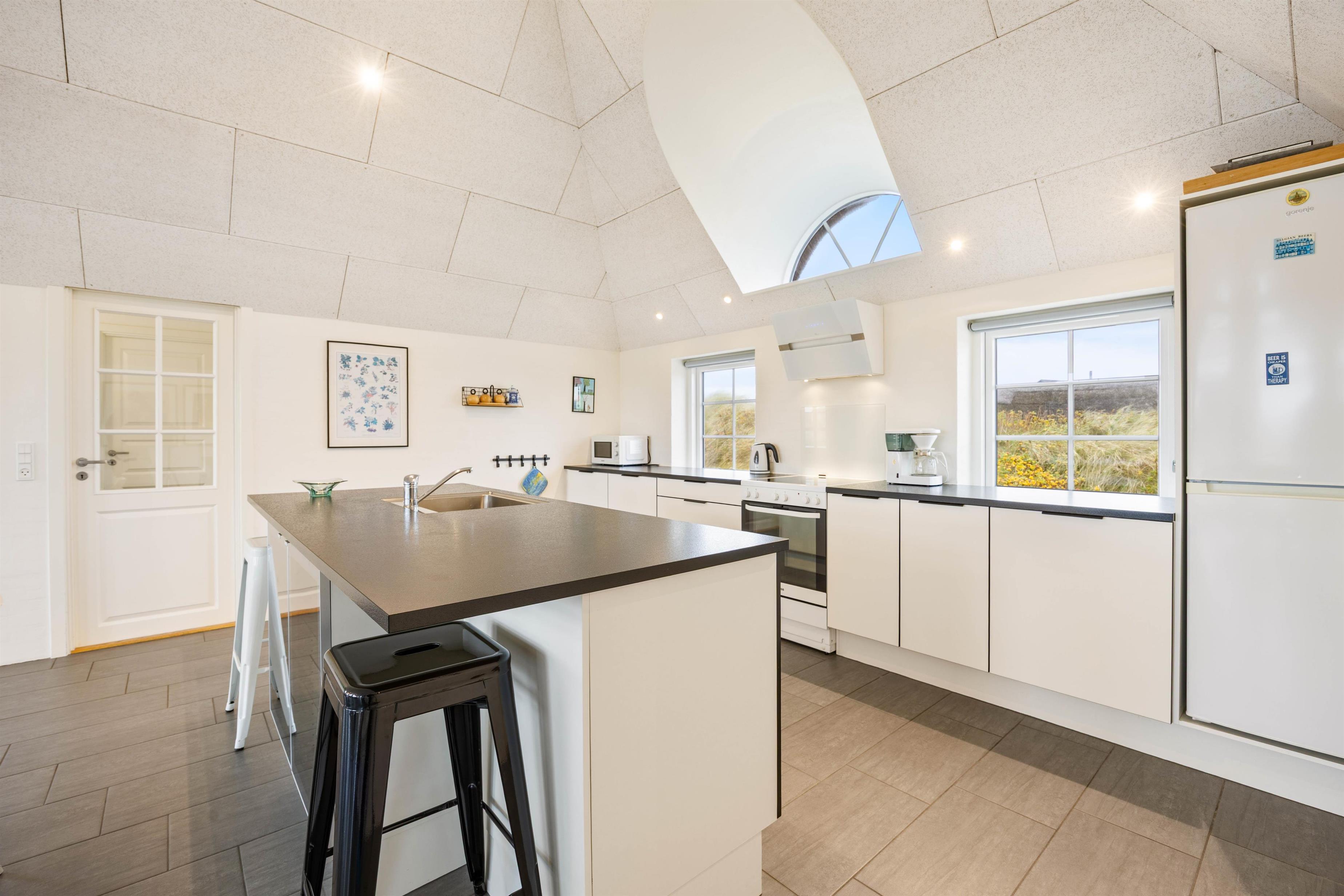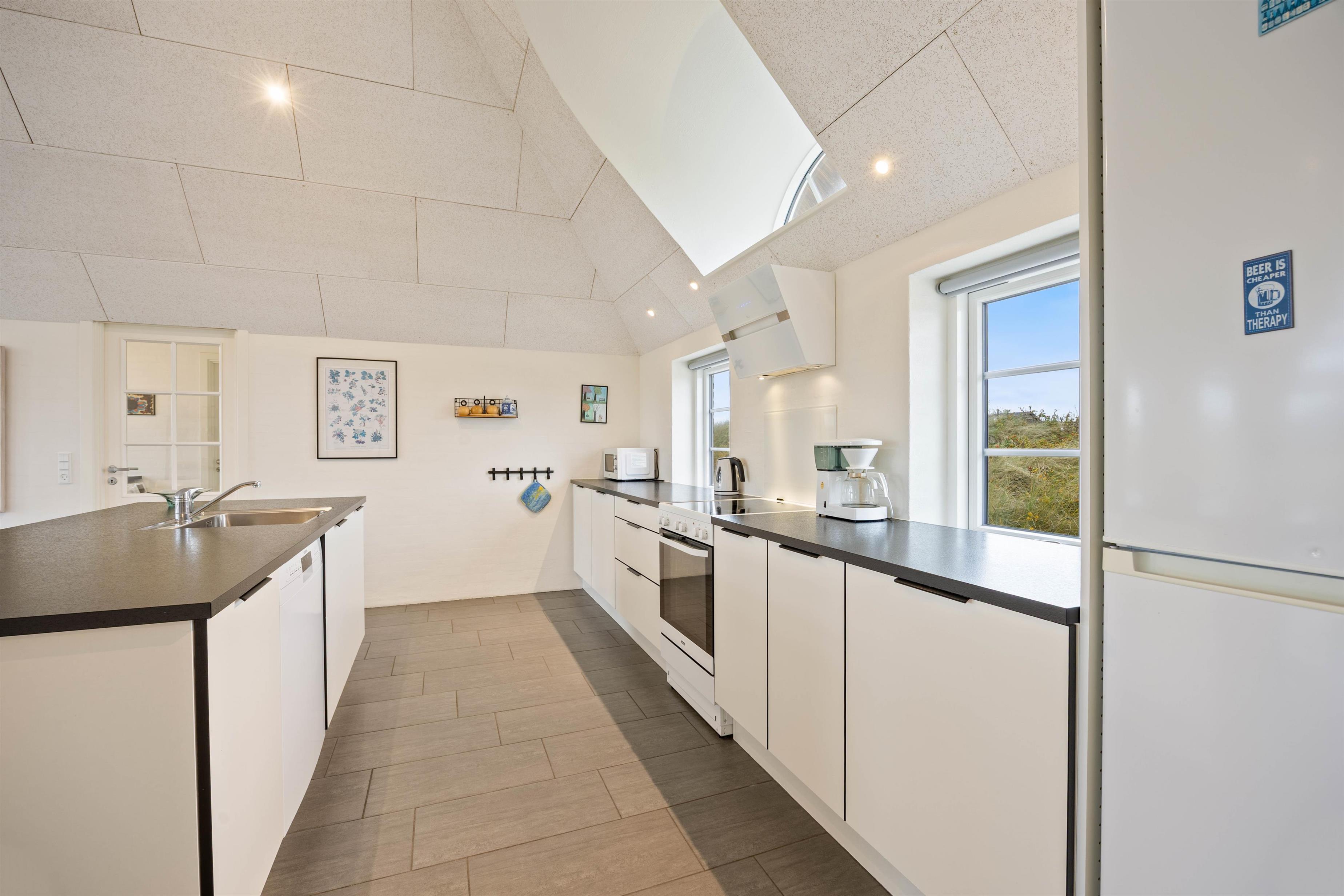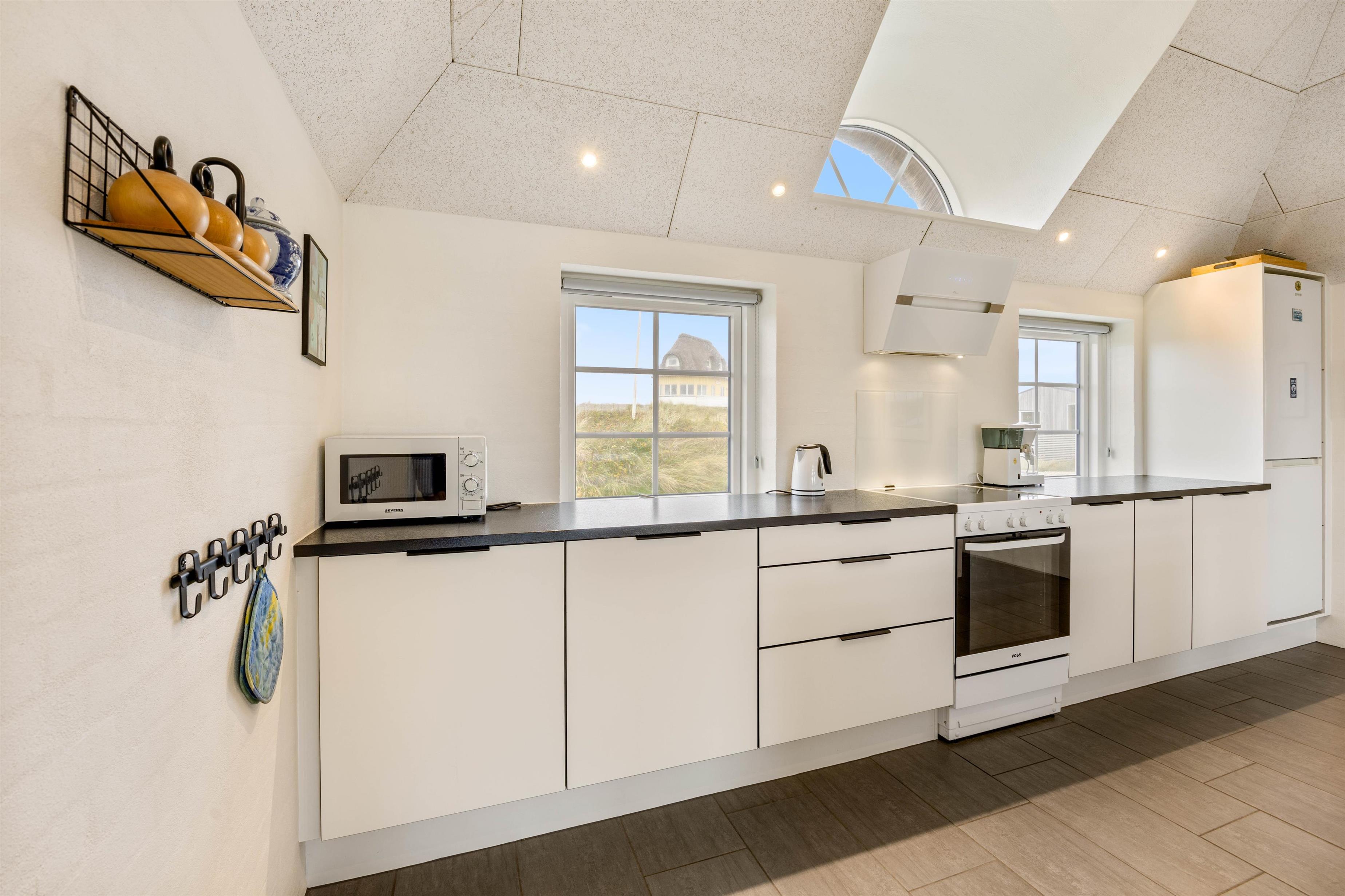 Sommerhuset der er opført i 2020, tilbyder en moderne og indbydende indretning med komfort i højsæde. Huset råder over en rummelig stue med brændeovn, der skaber den perfekte atmosfære efter en dag ved stranden, og giver en klassisk feriestemning, og de knitrende flammer gør det endnu hyggeligere at sidde indenfor i varmen, når vinden rusker udenfor. Stuen åbner op til køkkenet, som er fuldt udstyret med alt, hvad I har brug for, herunder opvaskemaskine og en 60 liters separat fryser, hvilket gør det nemt at forberede måltiderne. For ekstra komfort og bekvemmelighed har sommerhuset både vaskemaskine og tørretumbler til jeres rådighed.