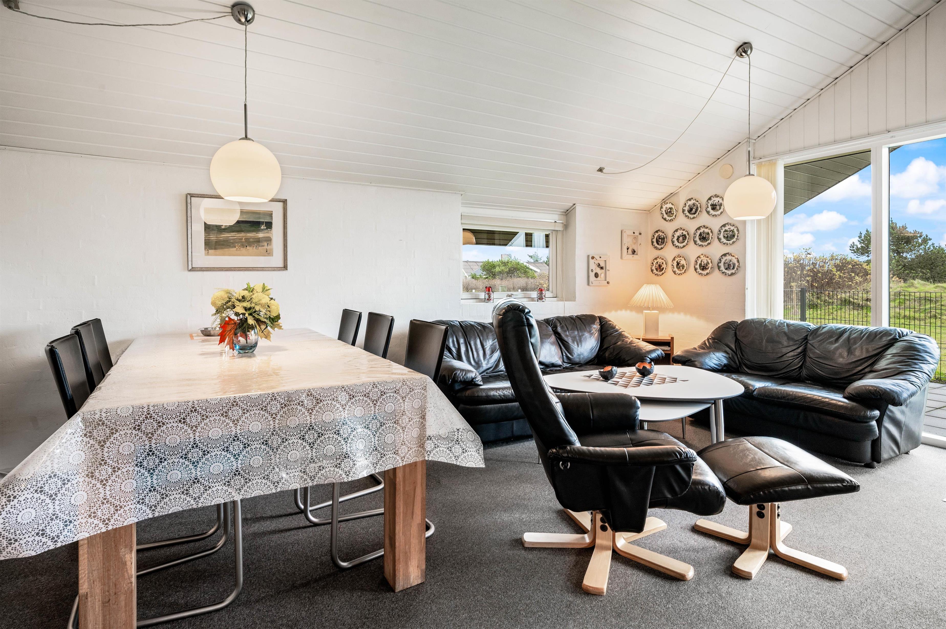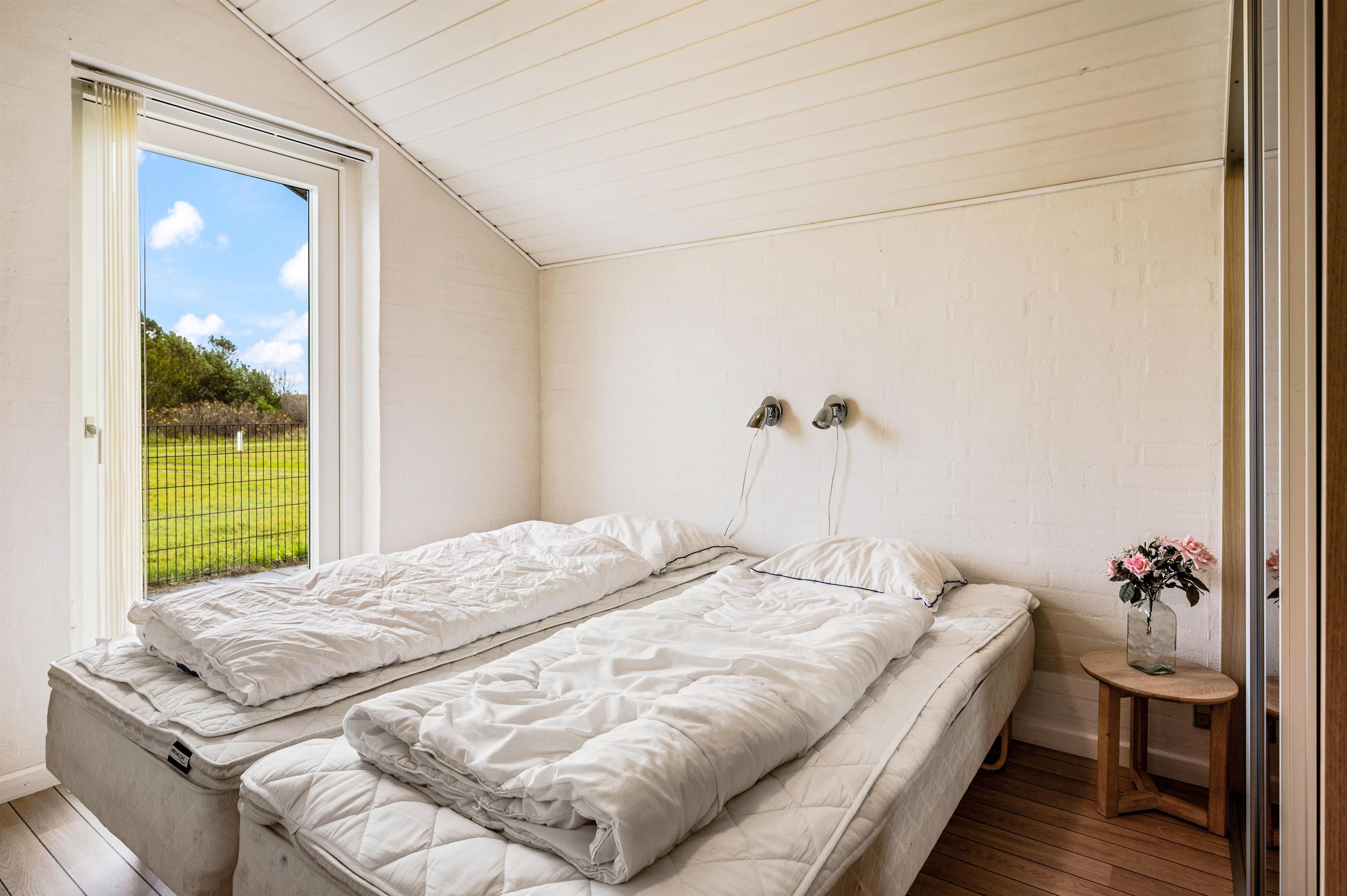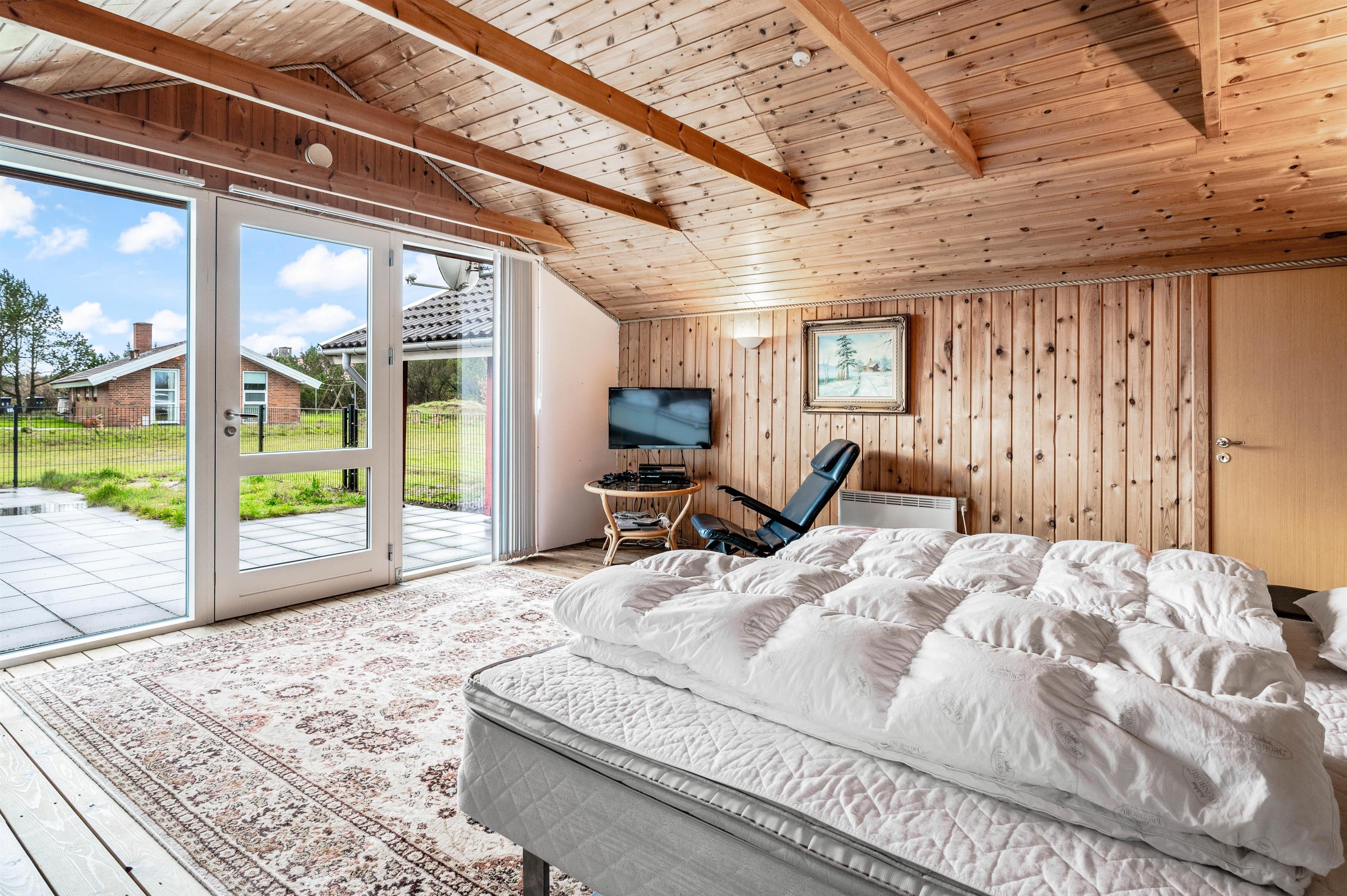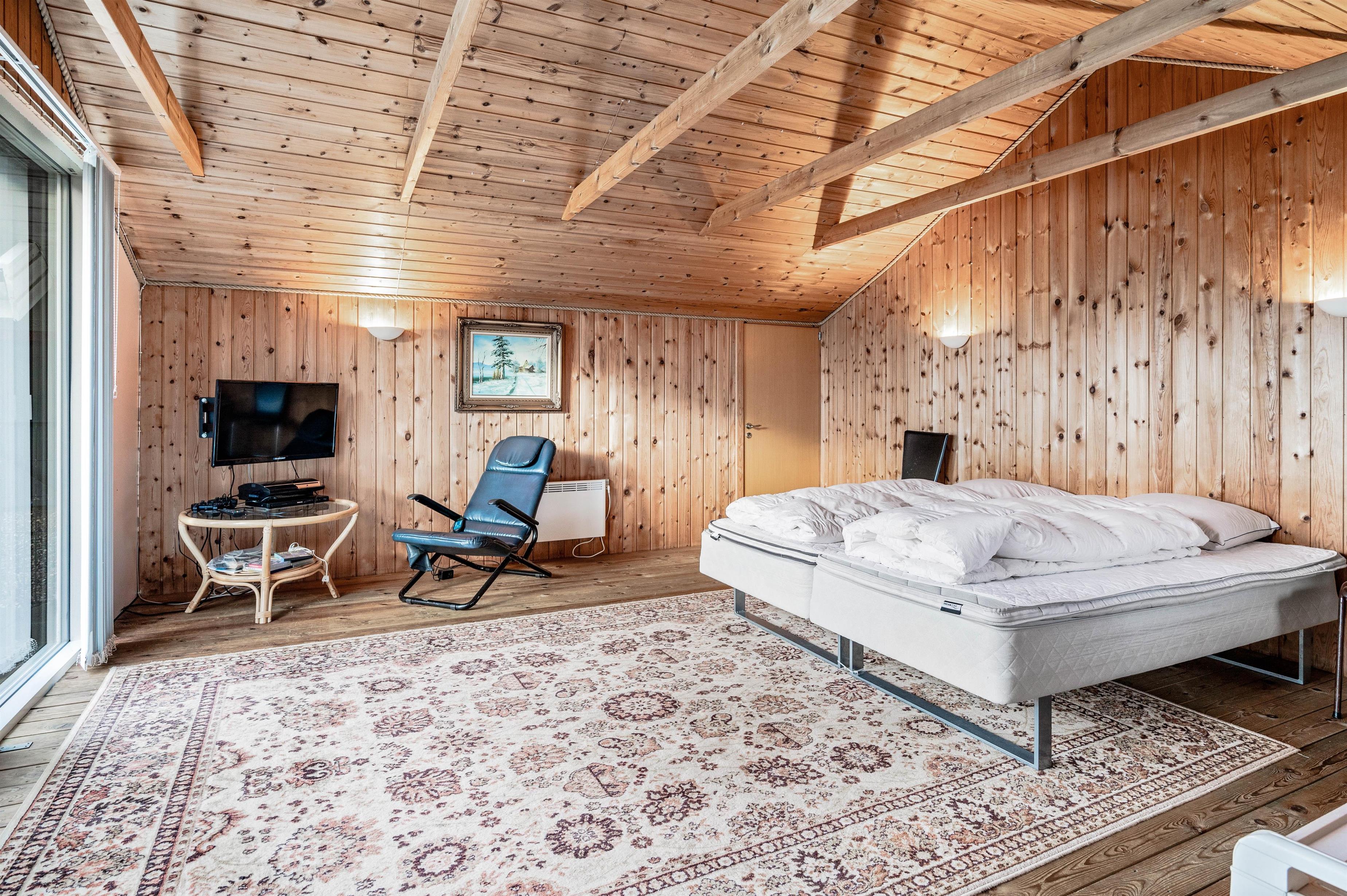 Fra pladsen i sofaen har I kig til køkkenet, der er veludstyret med blandt andet mikroovn og køleskab med 89 liters frysekapacitet. Herudover råder huset over 3 gode værelser med dobbeltsenge samt et mindre kammer med sovesofa. I det største soveværelse er der endnu et tv med DVD og PlayStation spillekonsol.