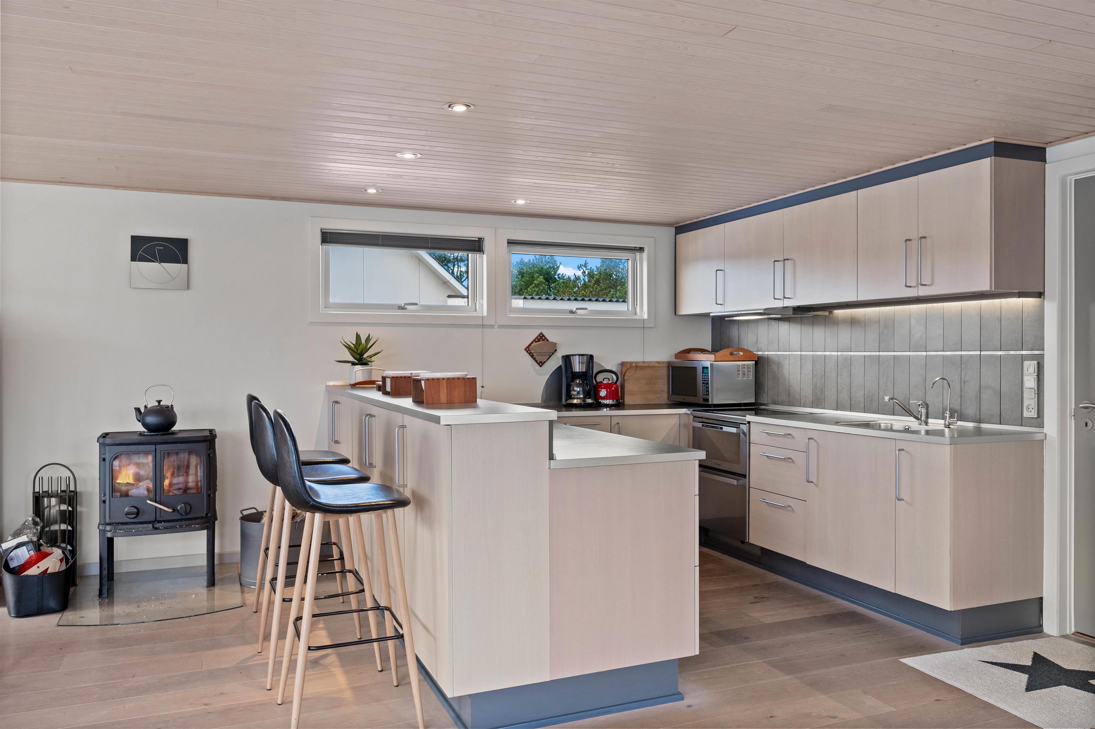 Sommerhusets entré udgør på samme tid en fin udestue, som giver jer mulighed for at nyde omgivelserne hele året rundt. De 2 energivenlige varmepumper sikrer, at I altid har et behageligt indeklima. Derudover kan I få en hjælpende hånd fra vaskemaskinen, tørretumbleren og opvaskemaskinen til hverdagens gøremål.