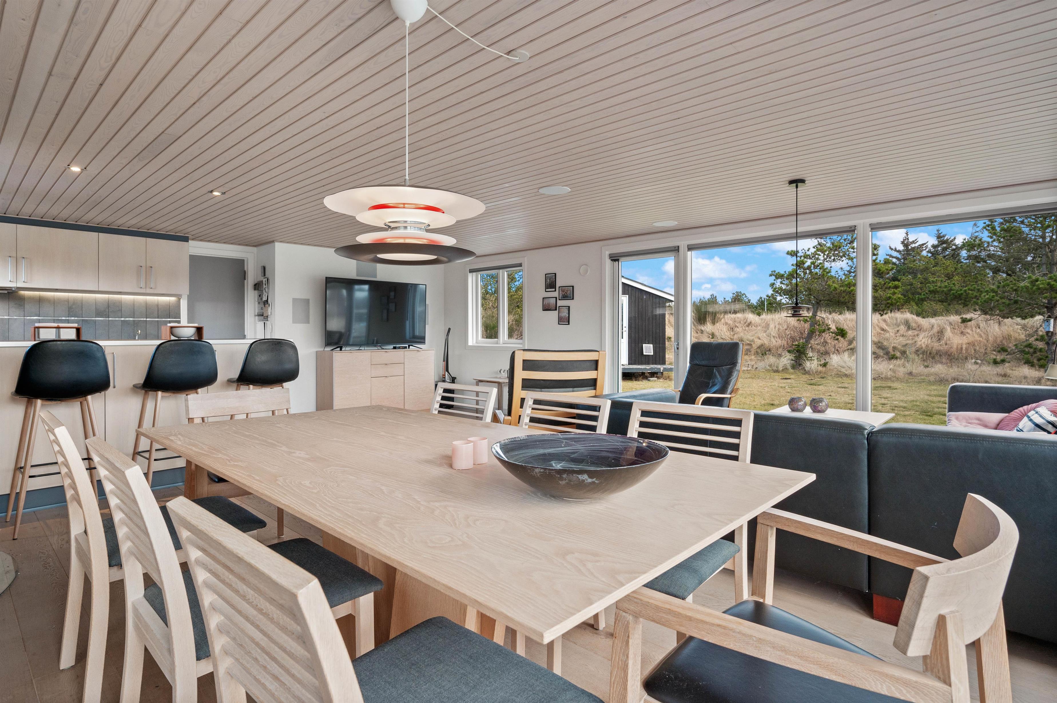 Feriehusets hjerte er det åbne alrum, der uden tvivl kommer til at danne rammer om en masse mindeværdige feriestunder. Mens de store vinduesfronter giver jer et dejligt lysindfald og inviterer den vestjyske natur indenfor, sørger brændeovnens knitrende ild for både varme og idyllisk feriestemning.