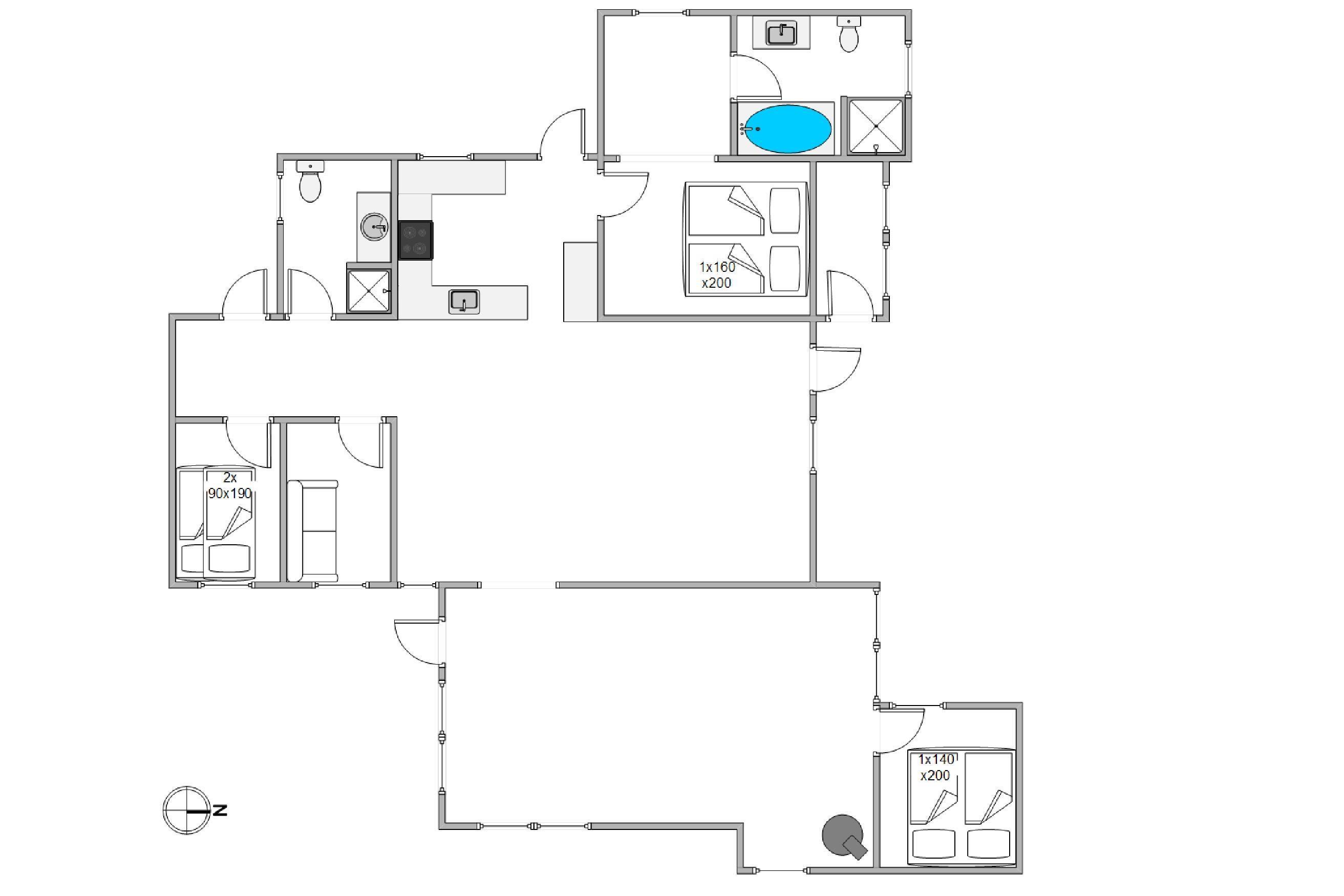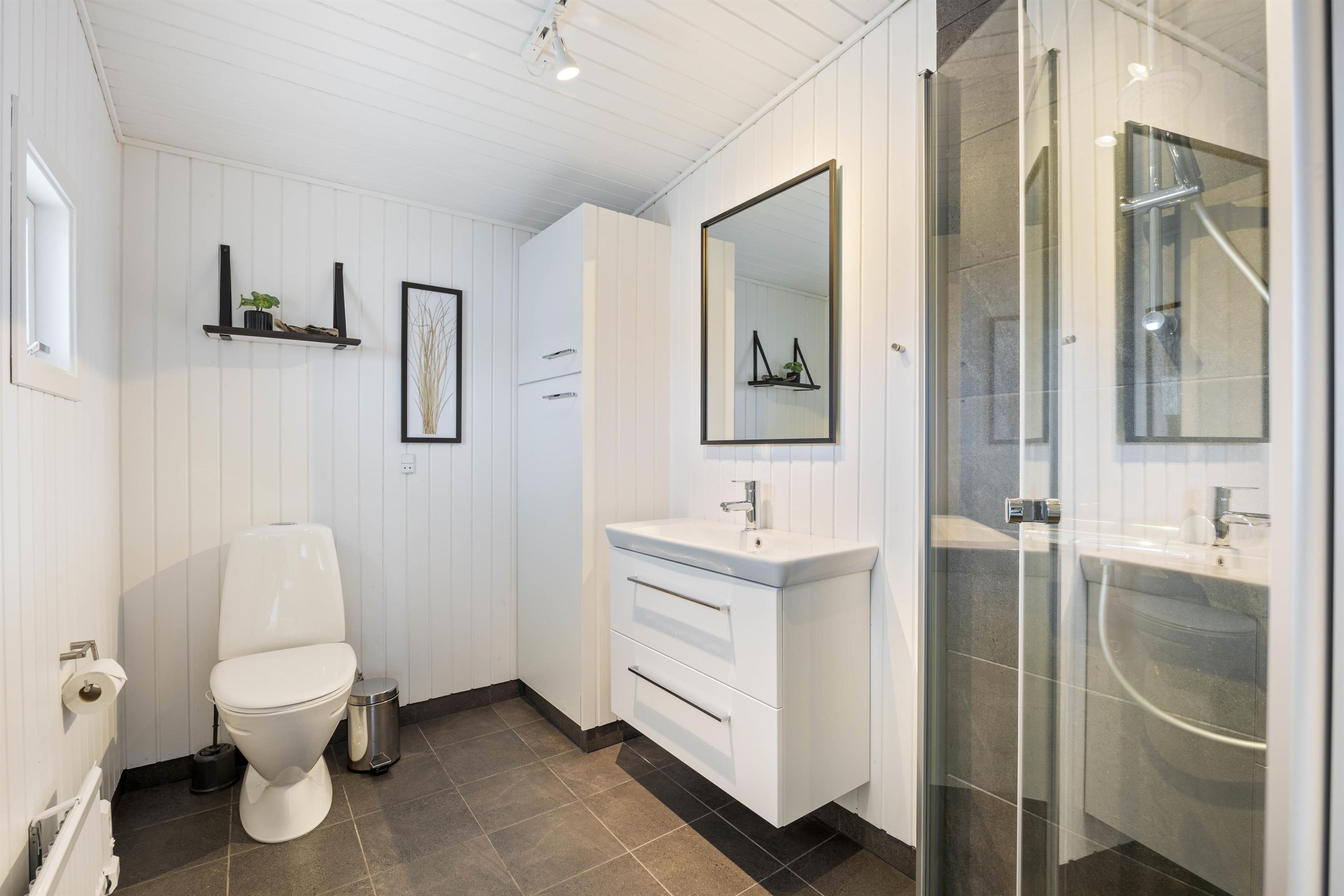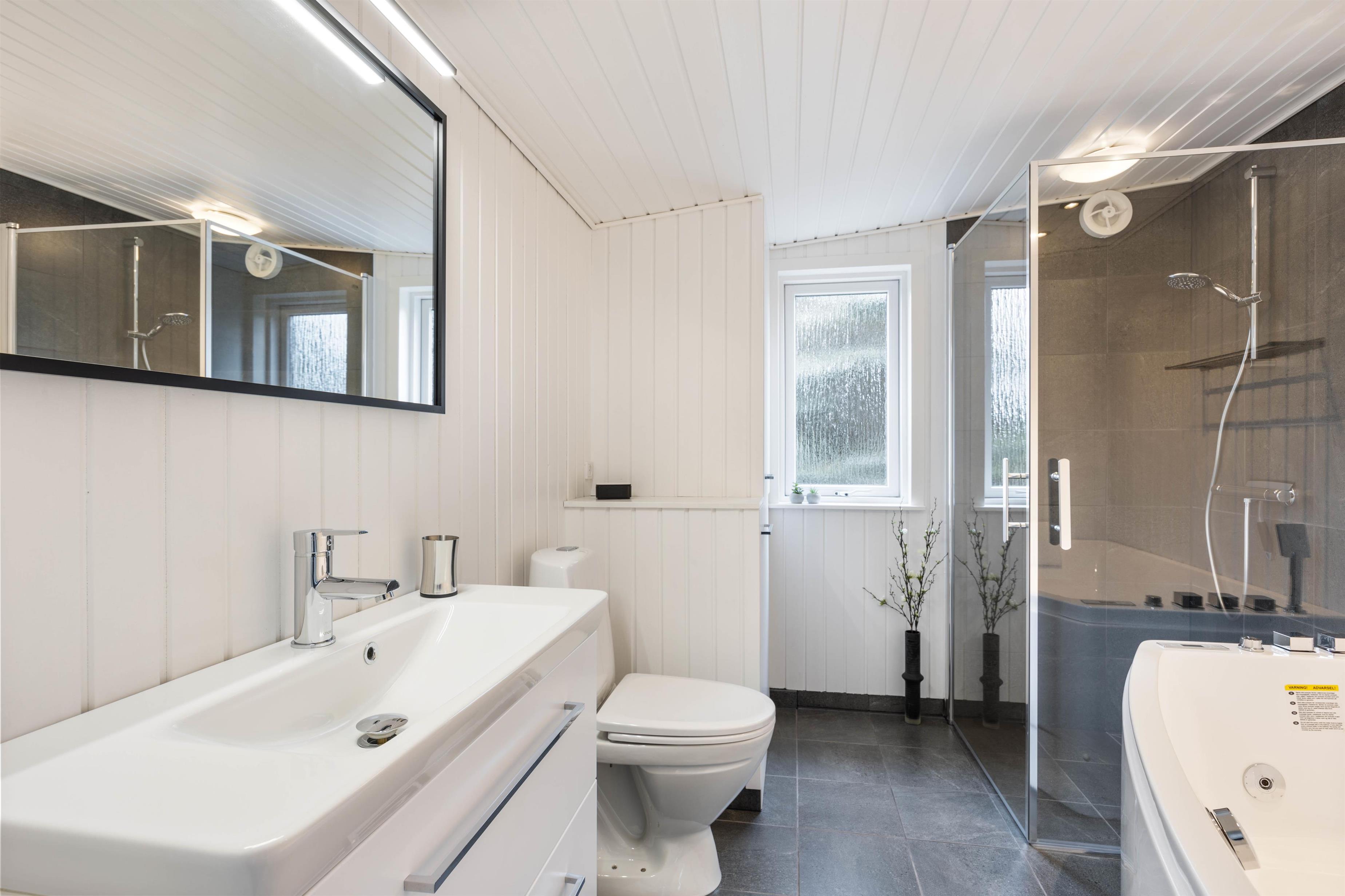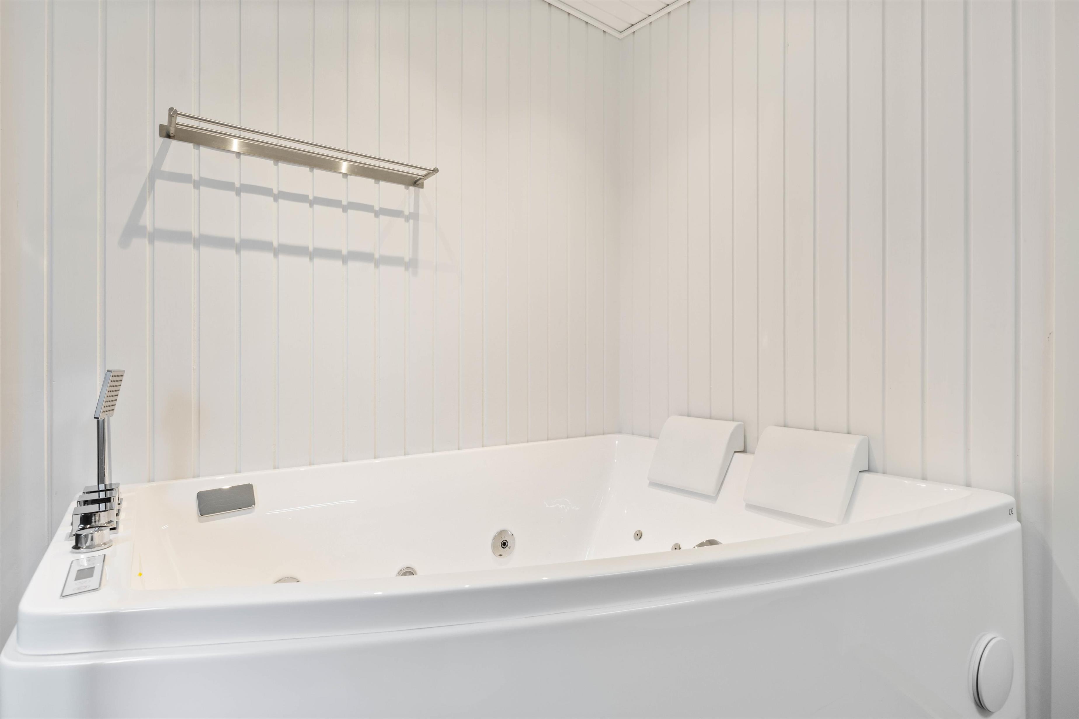 Der er to badeværelser, begge med moderne faciliteter såsom gulvvarme og en tømmespa, der sikrer ekstra komfort under jeres ophold. Sommerhuset byder også på en brændeovn, som giver en hyggelig atmosfære på kølige aftener, og en luft-til-luft varmepumpe der holder rummene behagelige hele året. I finder også Chromecast, der sikrer at I kan streame lige netop det I vil - Helt ligesom derhjemme.