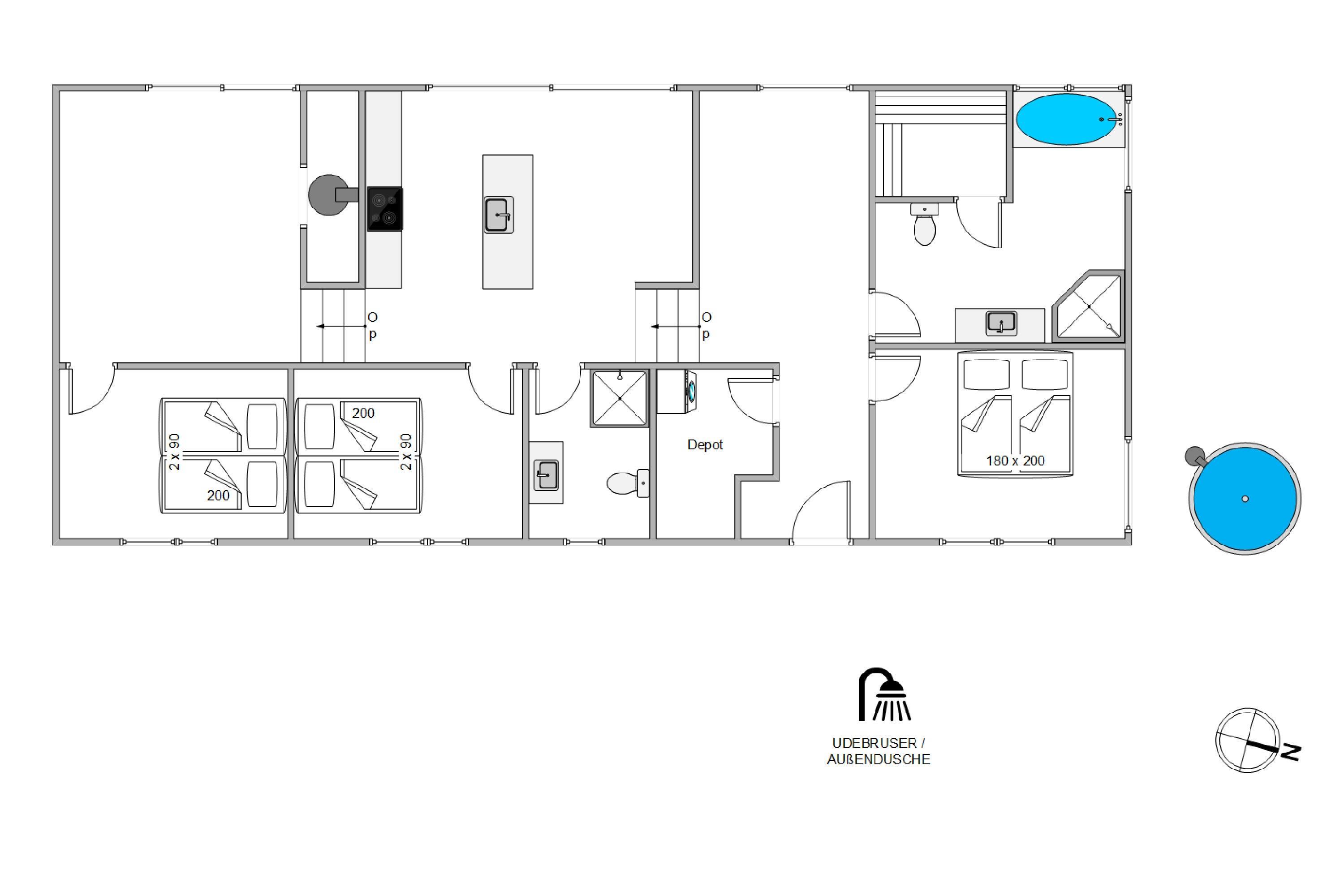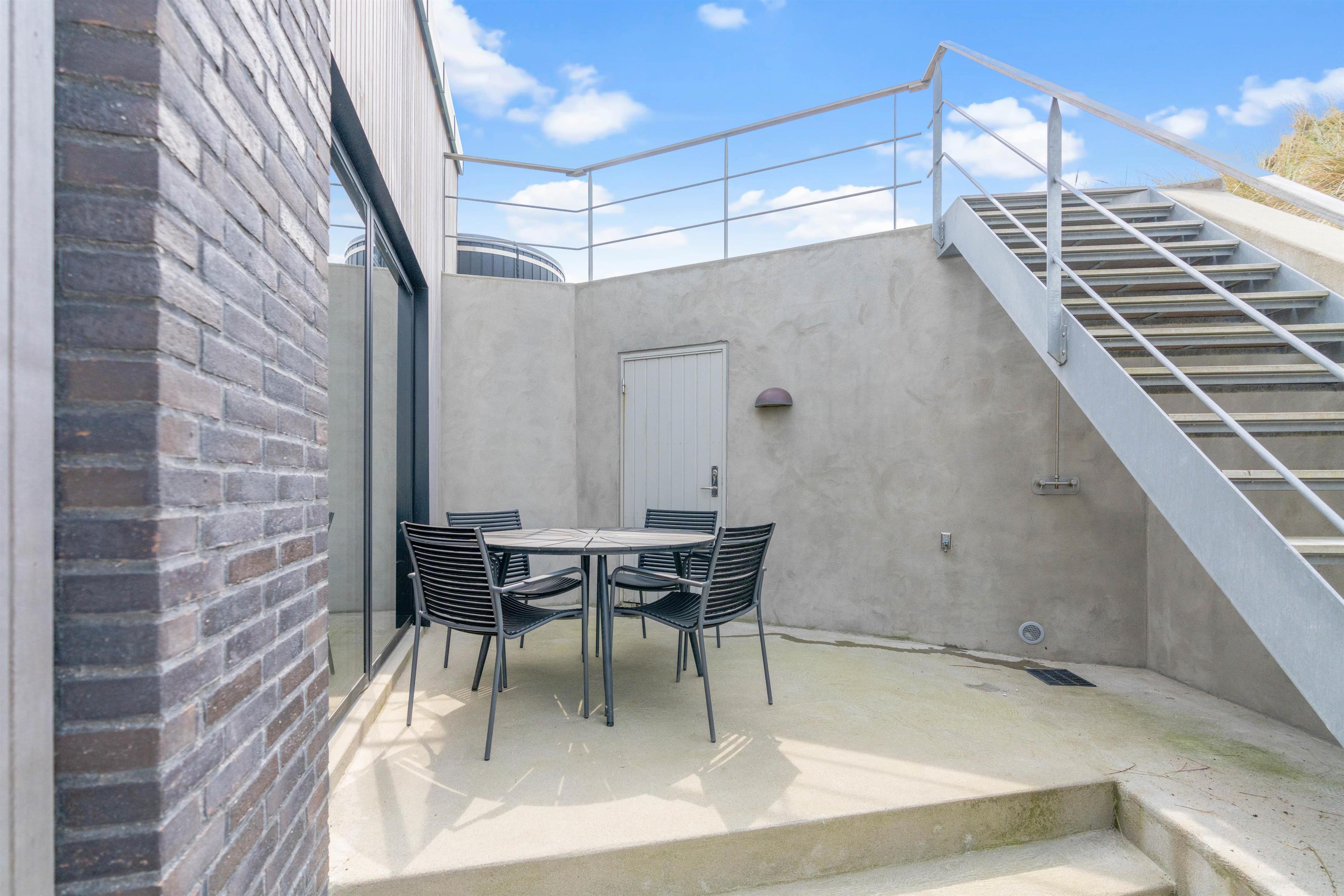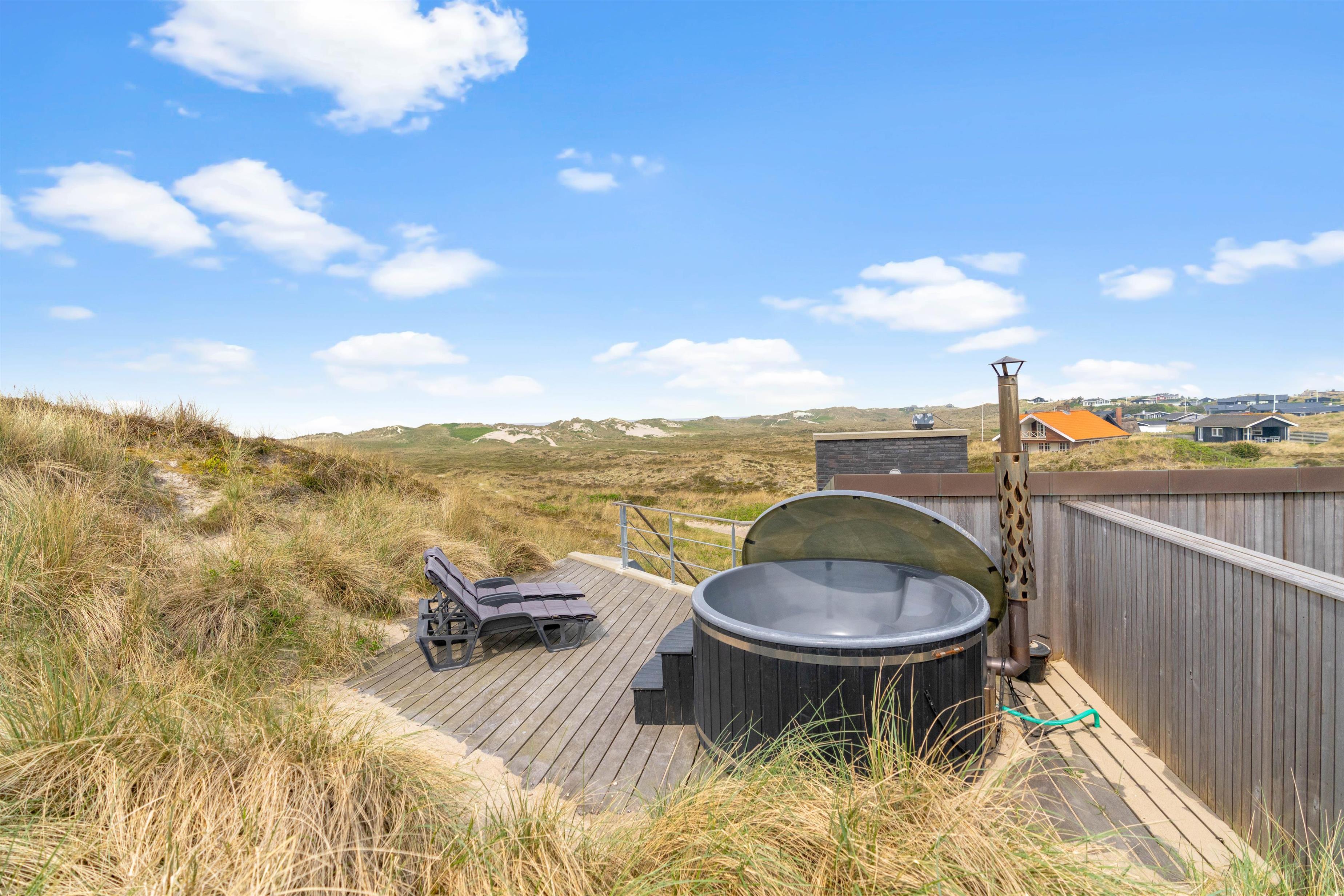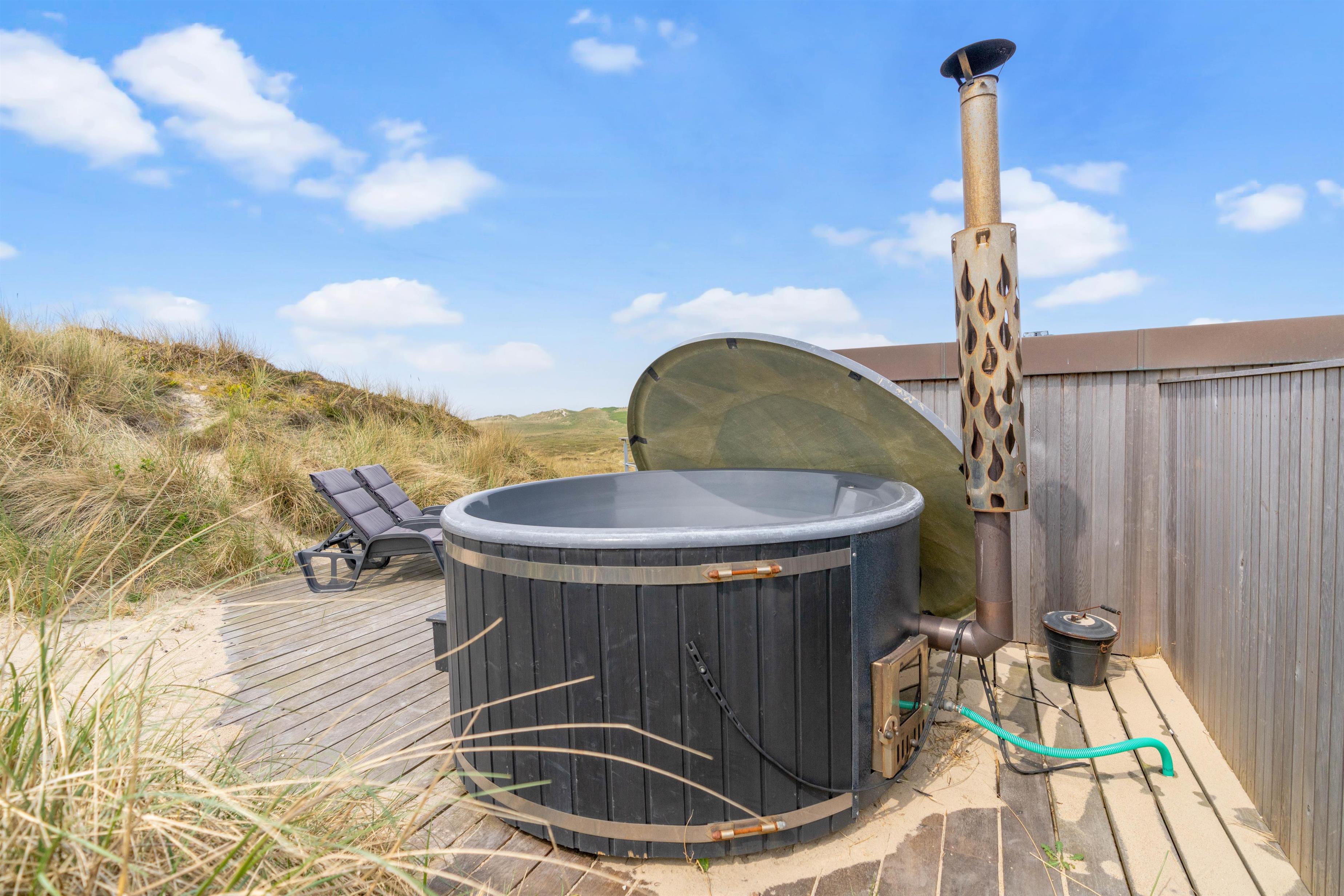 Åben terrasse med vildmarksbad, udendørsbruser, strandbesøg og hyggelige dage