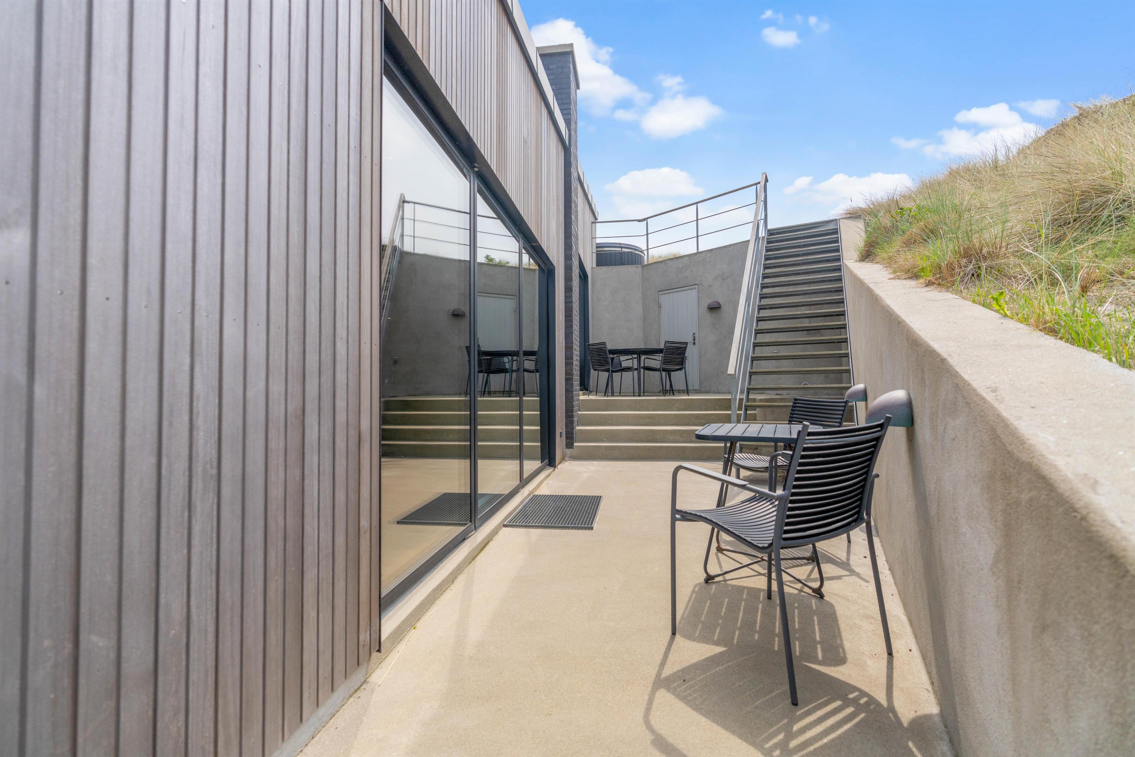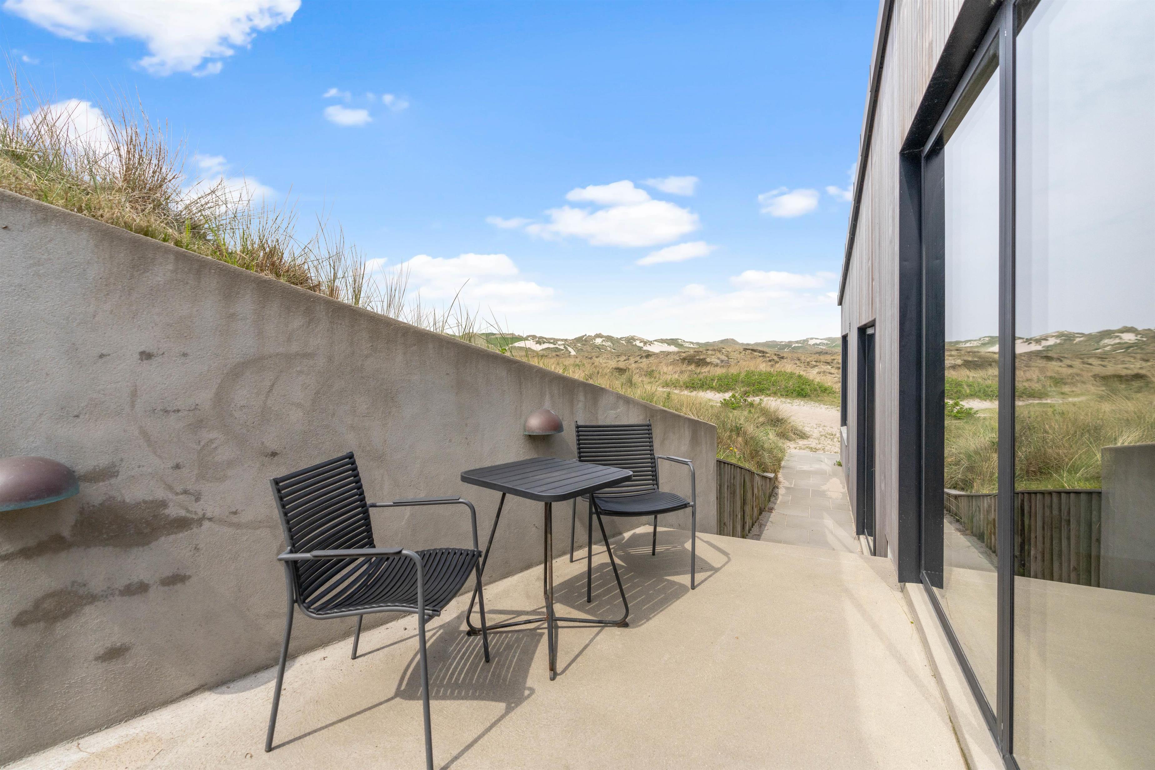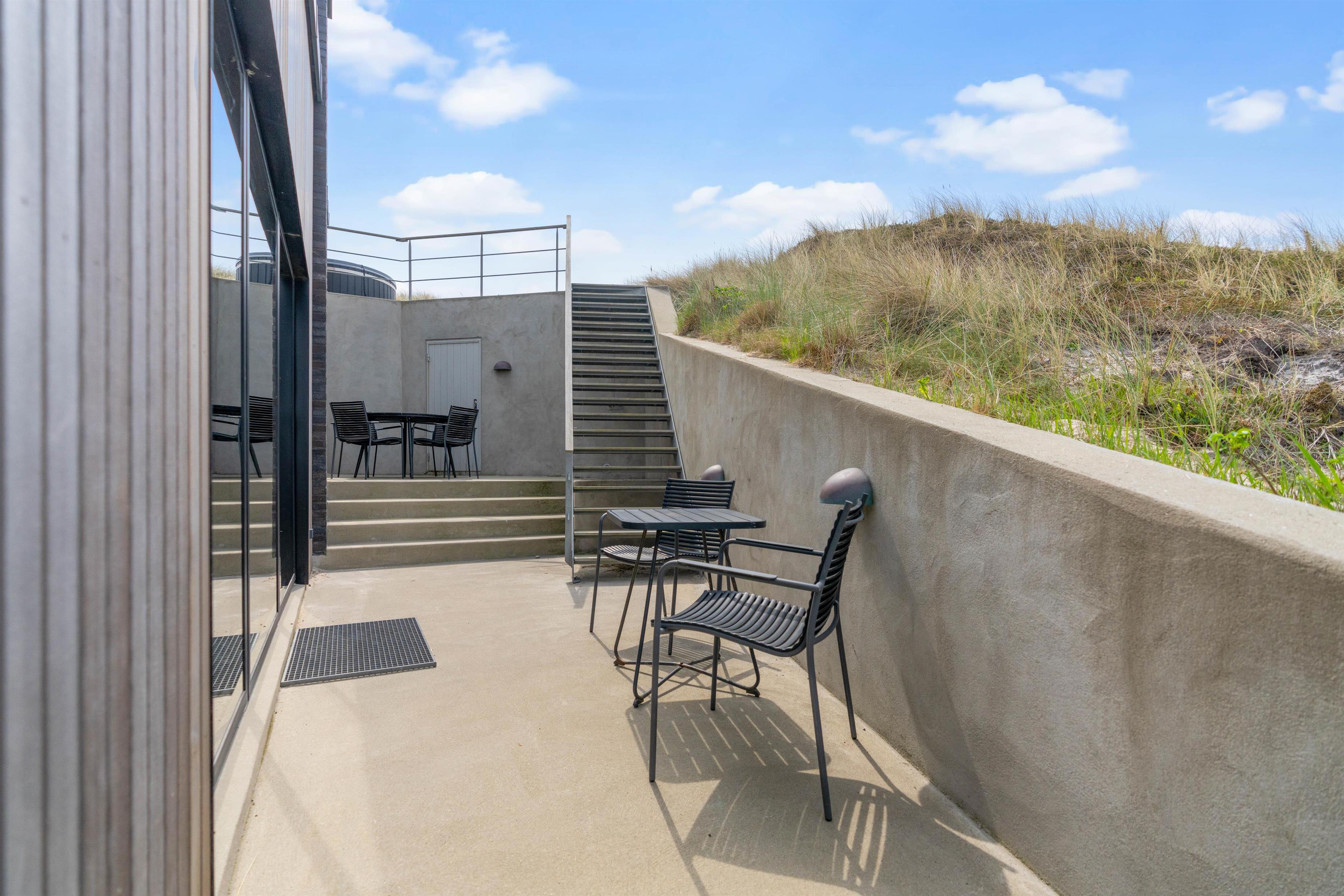Der er en højt beliggende, åben terrasse med vildmarksbad og en flot udsigt. Fra stueplan har I direkte adgang til den afskærmede terrasse med udebruser. Udebruseren kan benyttes i perioden april til november. Der er selvfølgelig sørget for gode havemøbler, liggestole og en grill, så I kan nyde de dejlige solskinsdage i fulde drag.