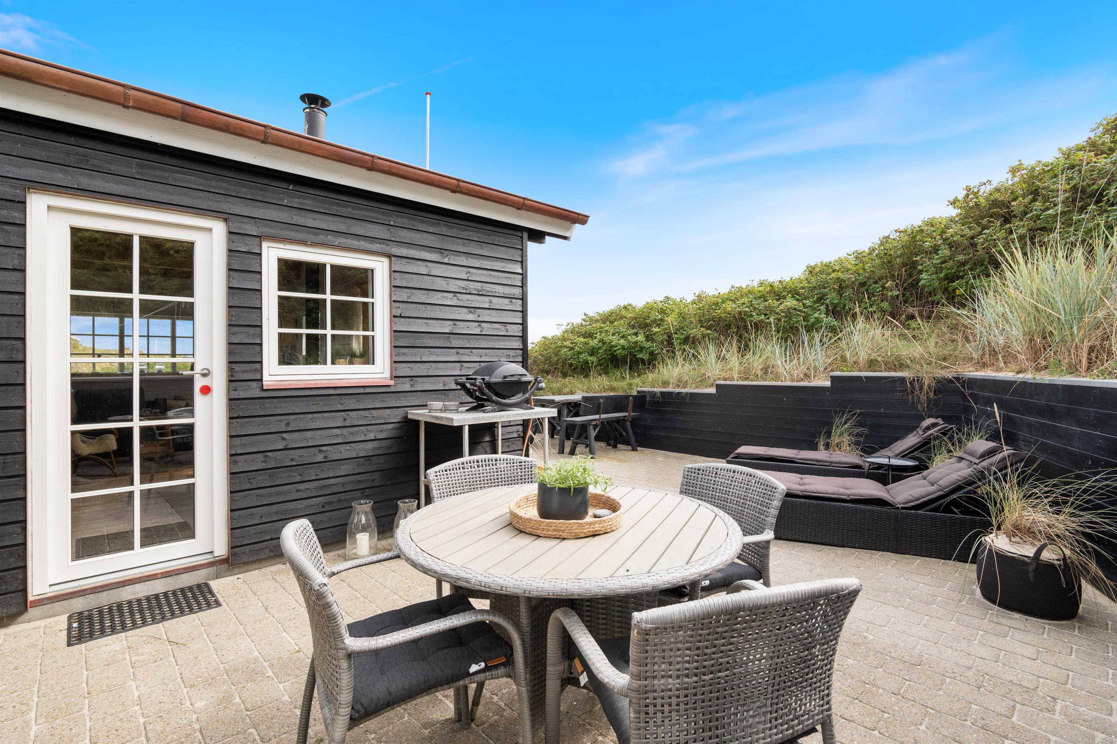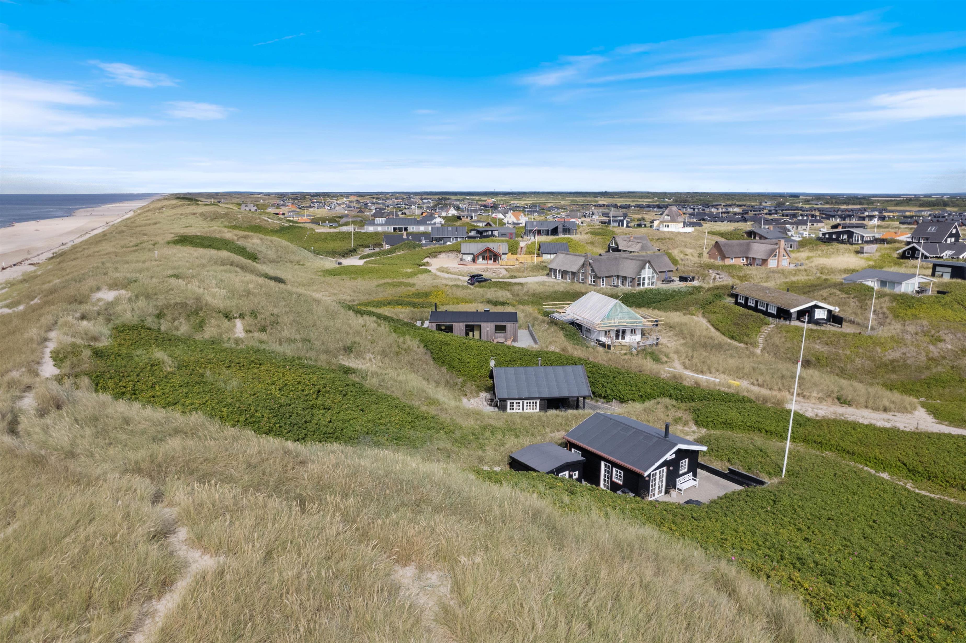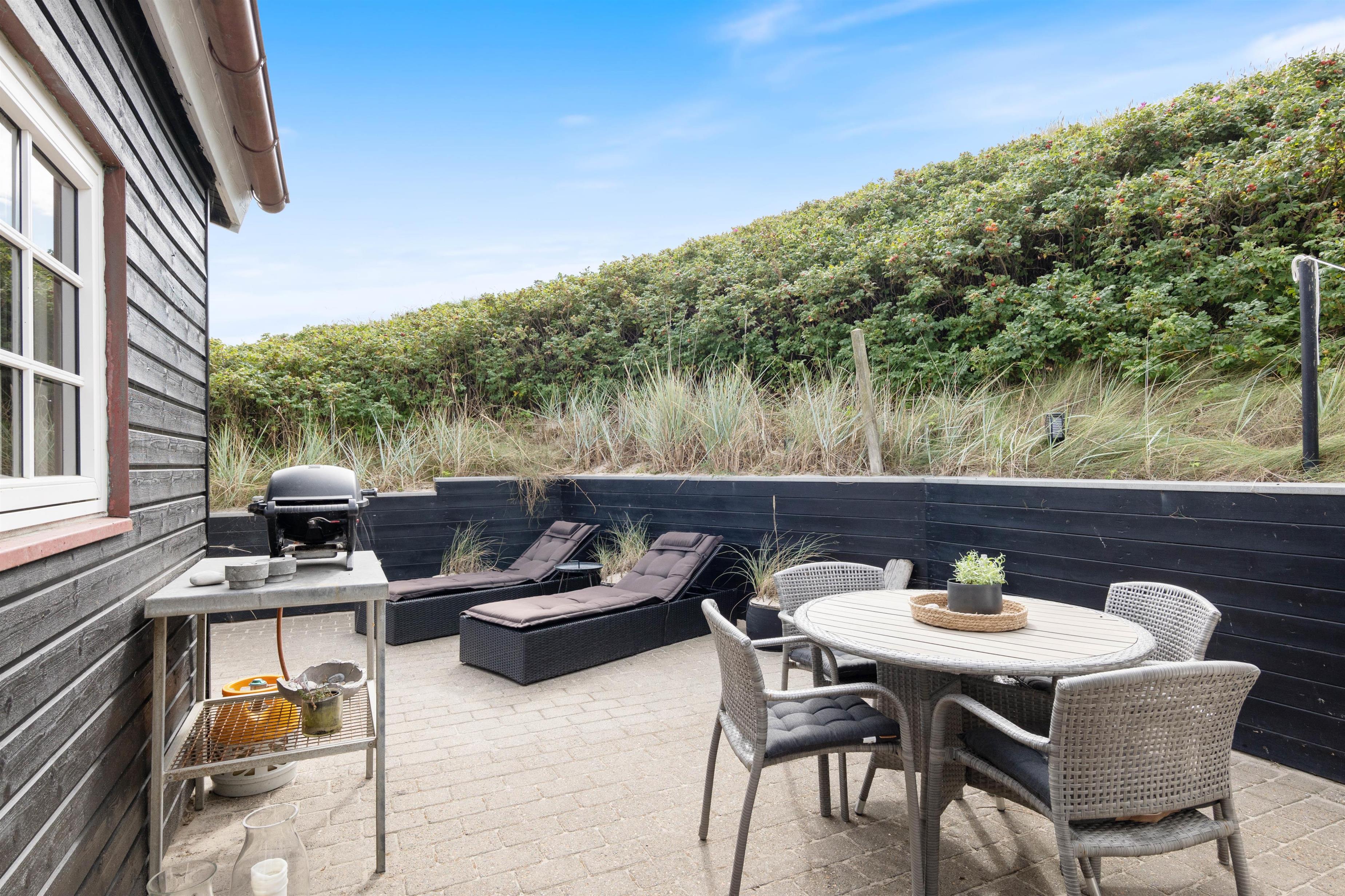 Beliggenheden er helt fantastisk. Sommerhuset ligger i første klitrække, kun 50 meter fra stranden, og med udsigt til sommerhusområdet. Terrassen er godt afskærmet af buskads, og I kan høre Vesterhavets brusen, når I slapper af i havemøblerne eller tænder op i grillen.