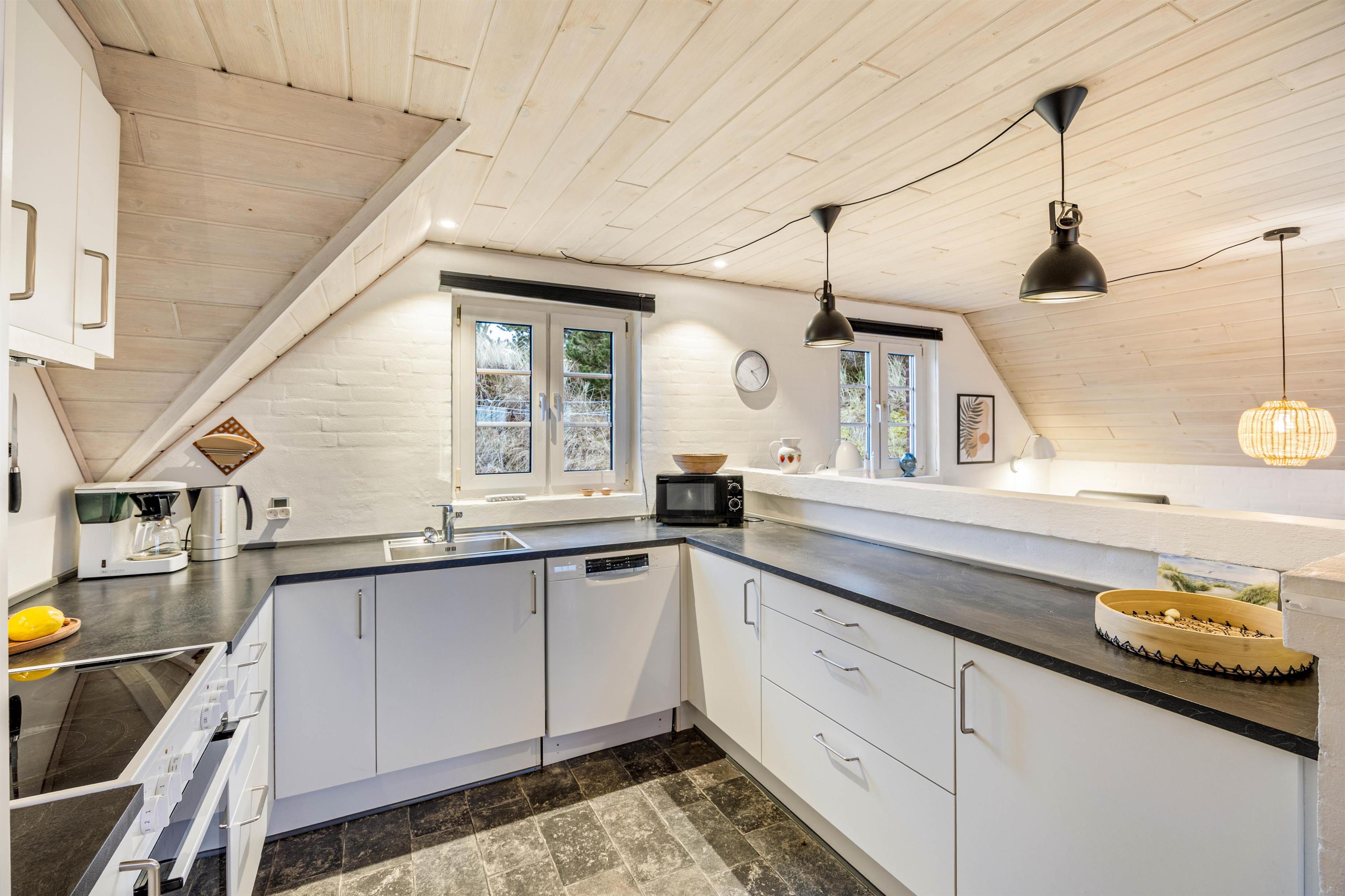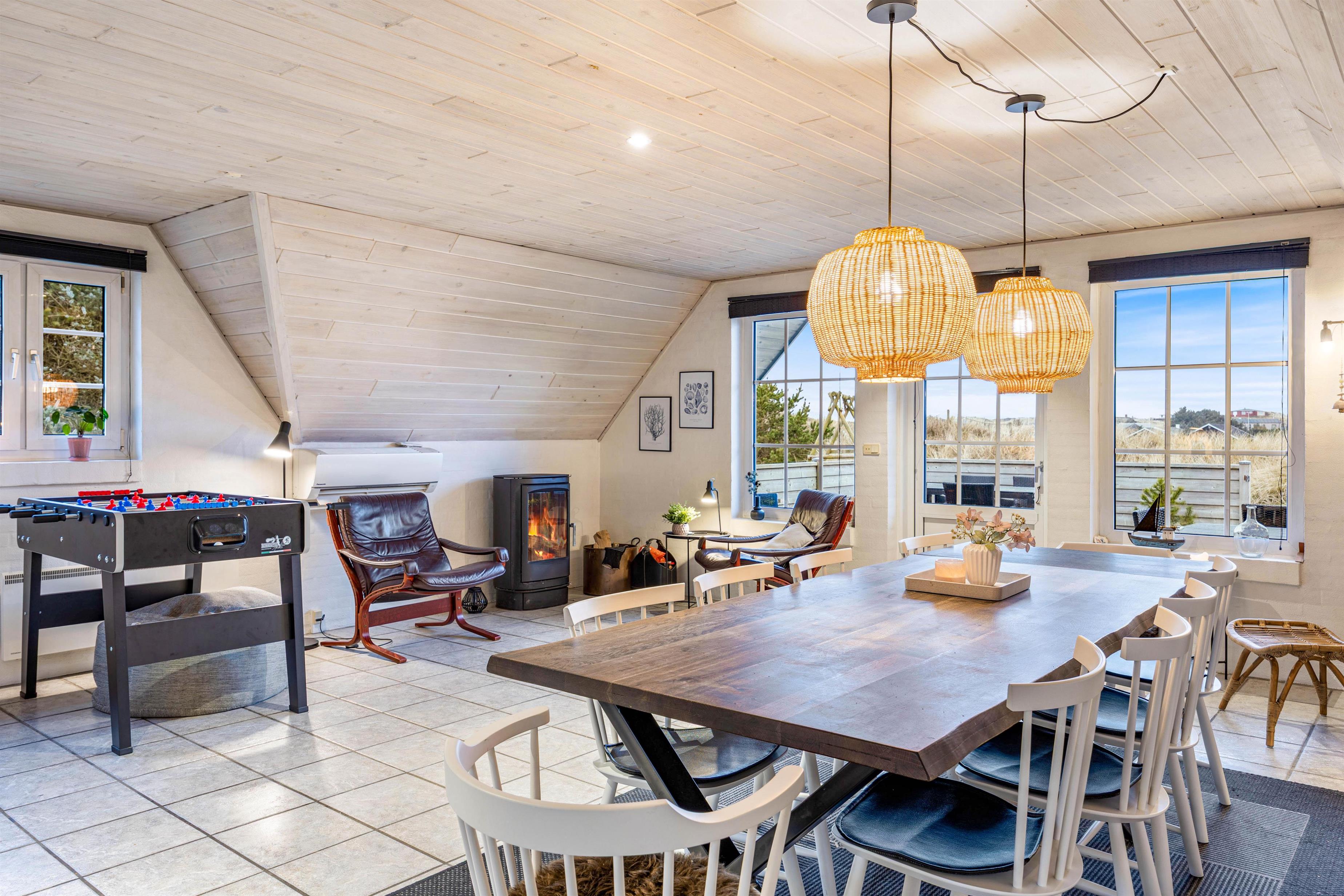 Det fine renoverede køkken og stue er samlet i et stort rum, og derfor fungerer disse som husets hjerte, rummet bliver opvarmet med en energibesparende luft-til-luft varmepumpe. Dette rum samler hele familien til hyggelige stunder omkring brændeovnen - og får man lyst, kan man også udfordre hinanden i en omgang bordfodbold. Ferieboligen kan rumme op til ti personer, hvor fire ud af sommerhuset fem værelser er med dobbeltseng. Det sidste værelse er udstyret med to enkeltsenge