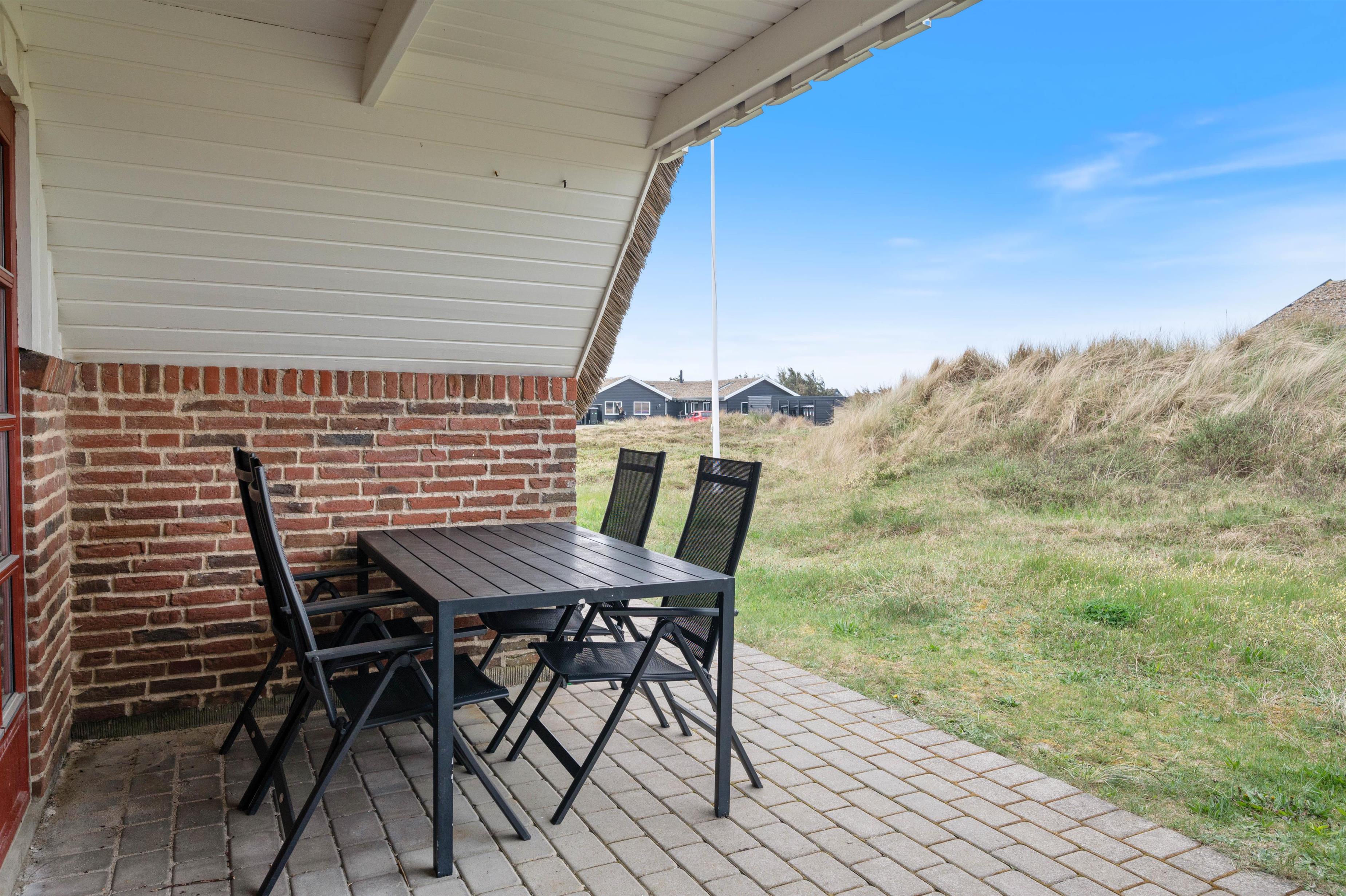 Sommerhusets terrasse er delvist overdækket og omslutter huset, så I kan altid finde jer et godt sted at sætte jer til rette i liggestole og havemøbler, uanset om I foretrækker at sidde i sol eller skygge. I kan desuden nyde solens stråler fra både syd og vest. På terrassen kan I nyde en lækker middag sammen på grillen, mens dagen går på hæld.