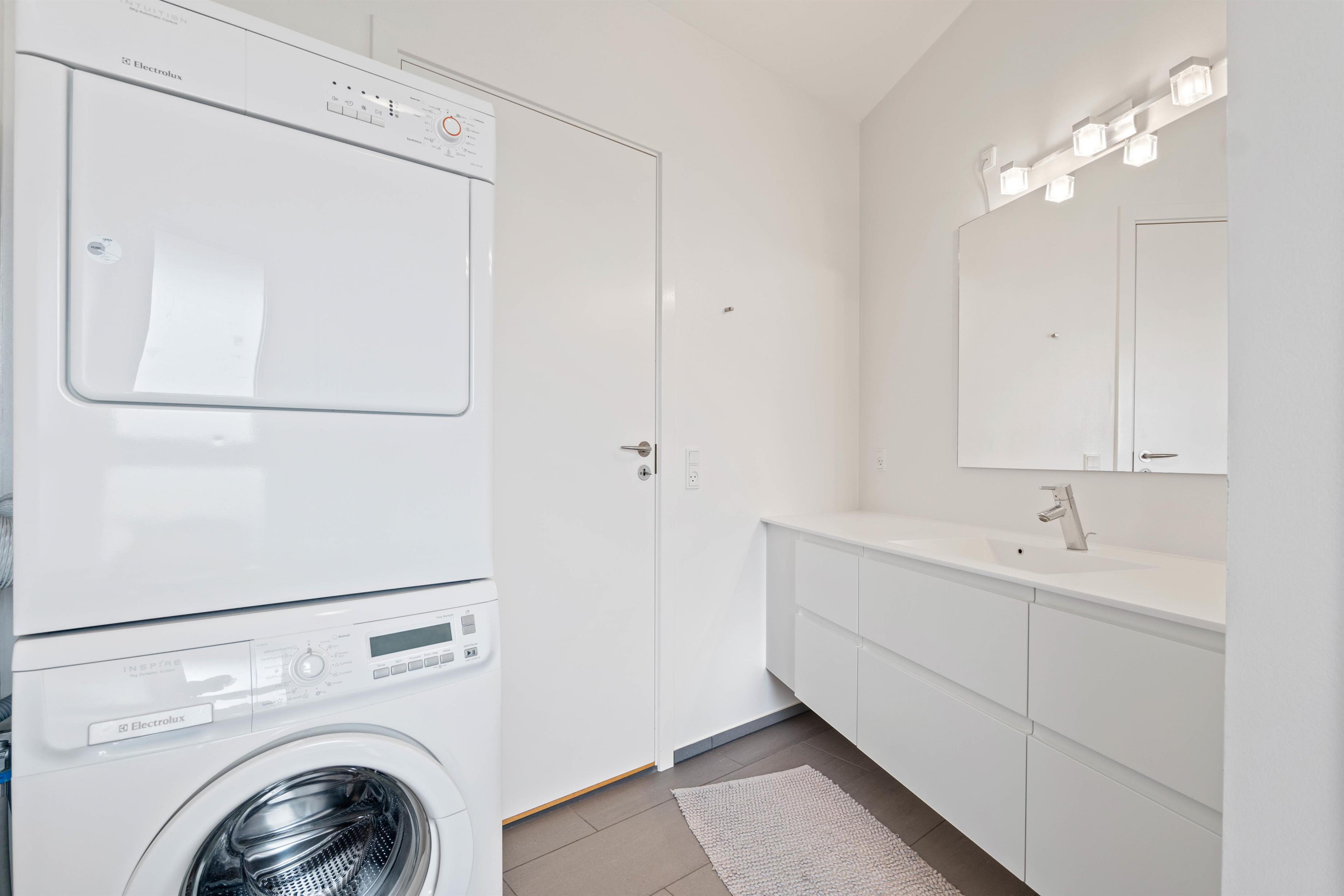 I sommerhusets køkken har I en opvaskemaskine, der sørger for at klare opvasken, efter I har lavet mad. Derudover har I på det ene af badeværelserne en vaskemaskine og tørretumbler, der hjælper jer med tøjvasken i løbet af ferien.