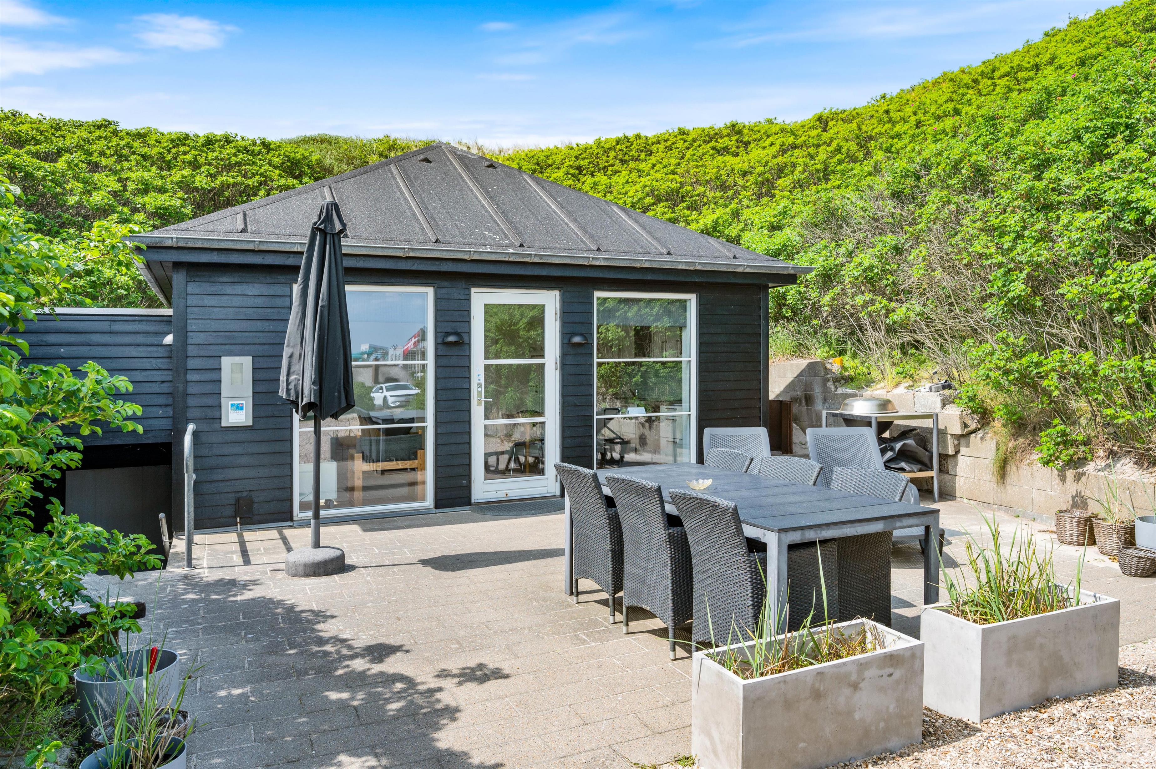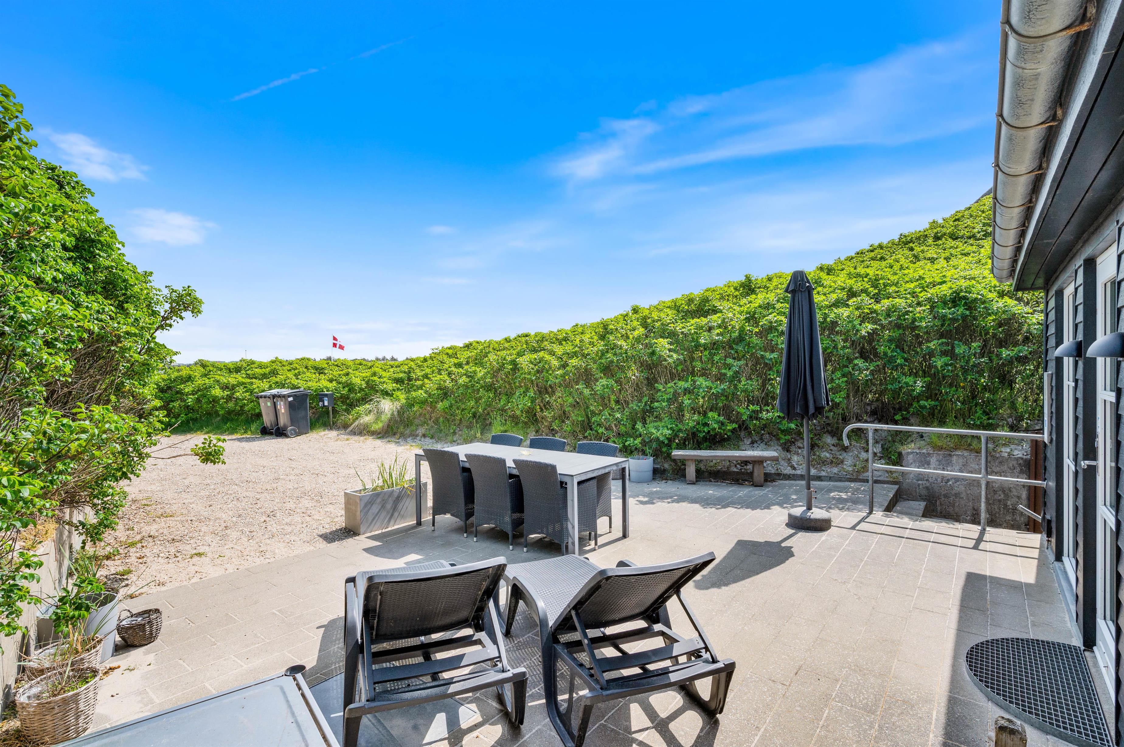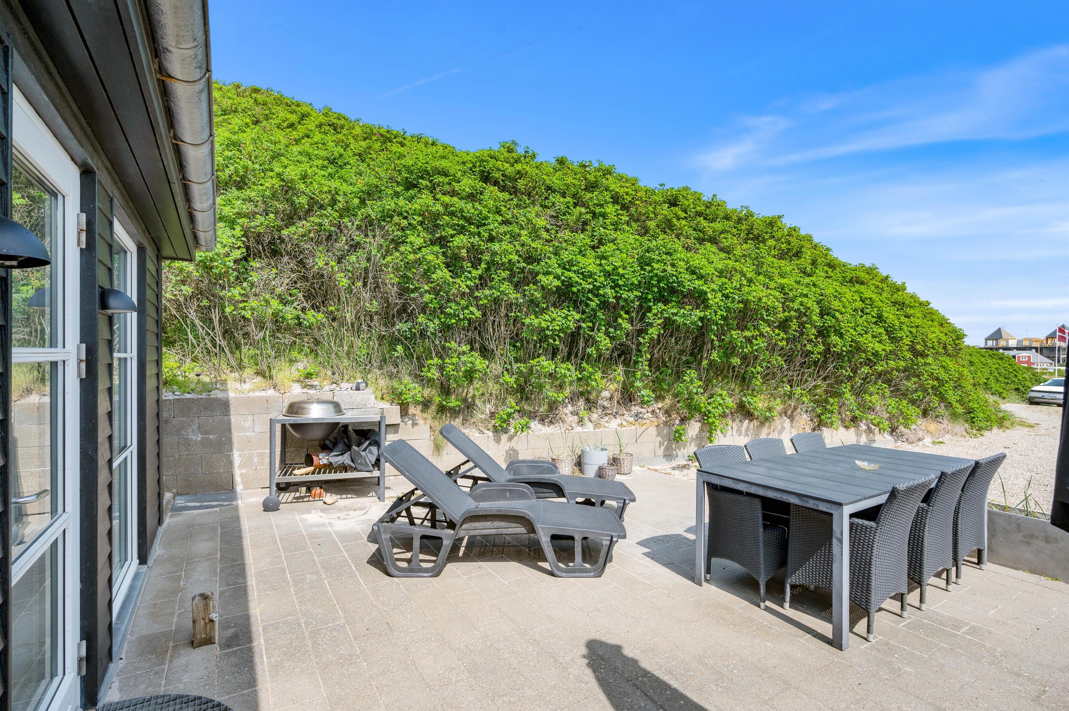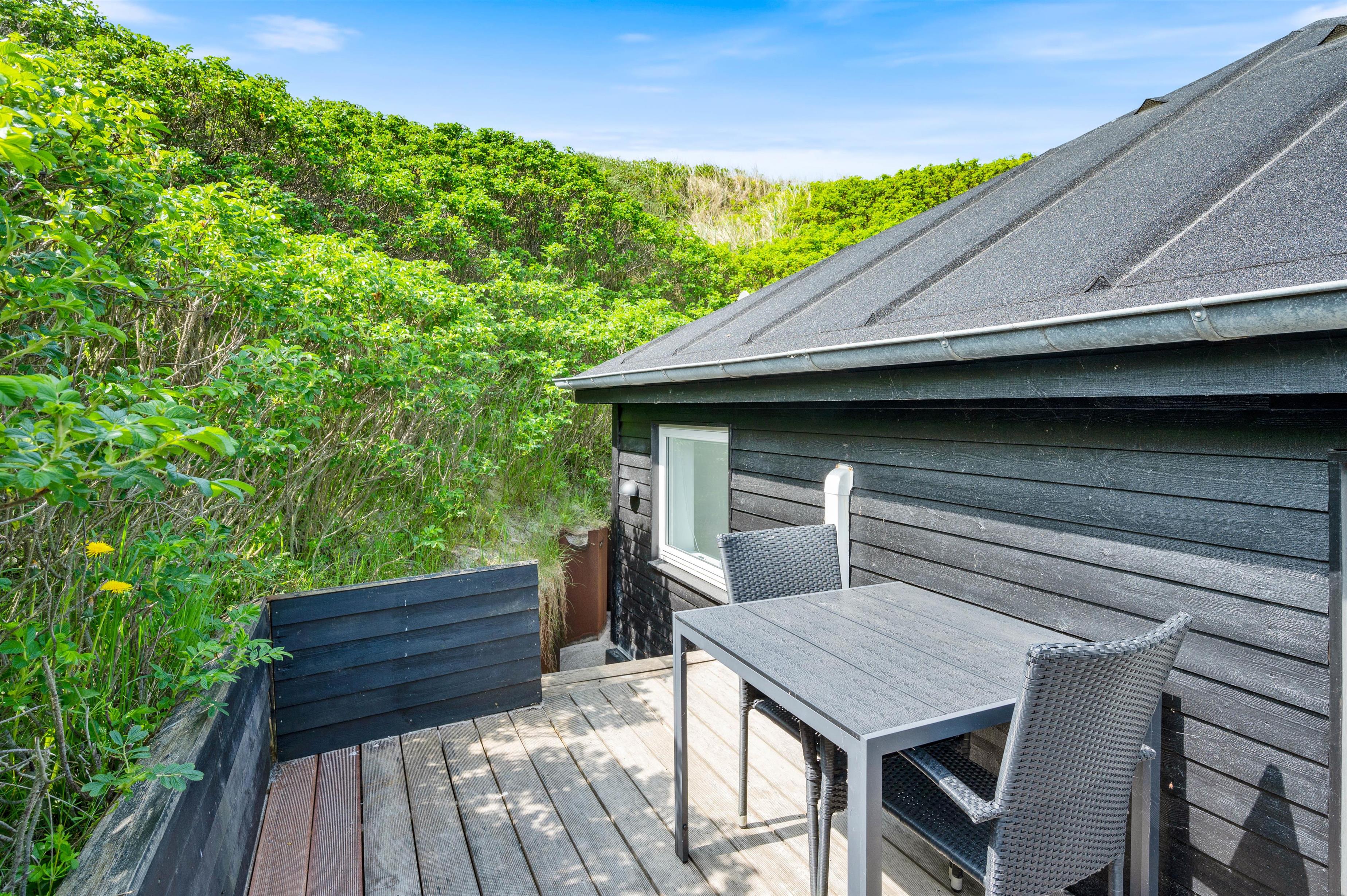 For at komme ned til sommerhuset skal du ned ad en lille grusvej. På en vindstille dag kan du sidde på terrassen helt uforstyrret og lytte til det brusende vand på den anden side af klitten. Terrassen er naturligvis møbleret med havemøbler, liggestole og grill. Perfekt til hyggelige grillaftener i godt selskab med familien.