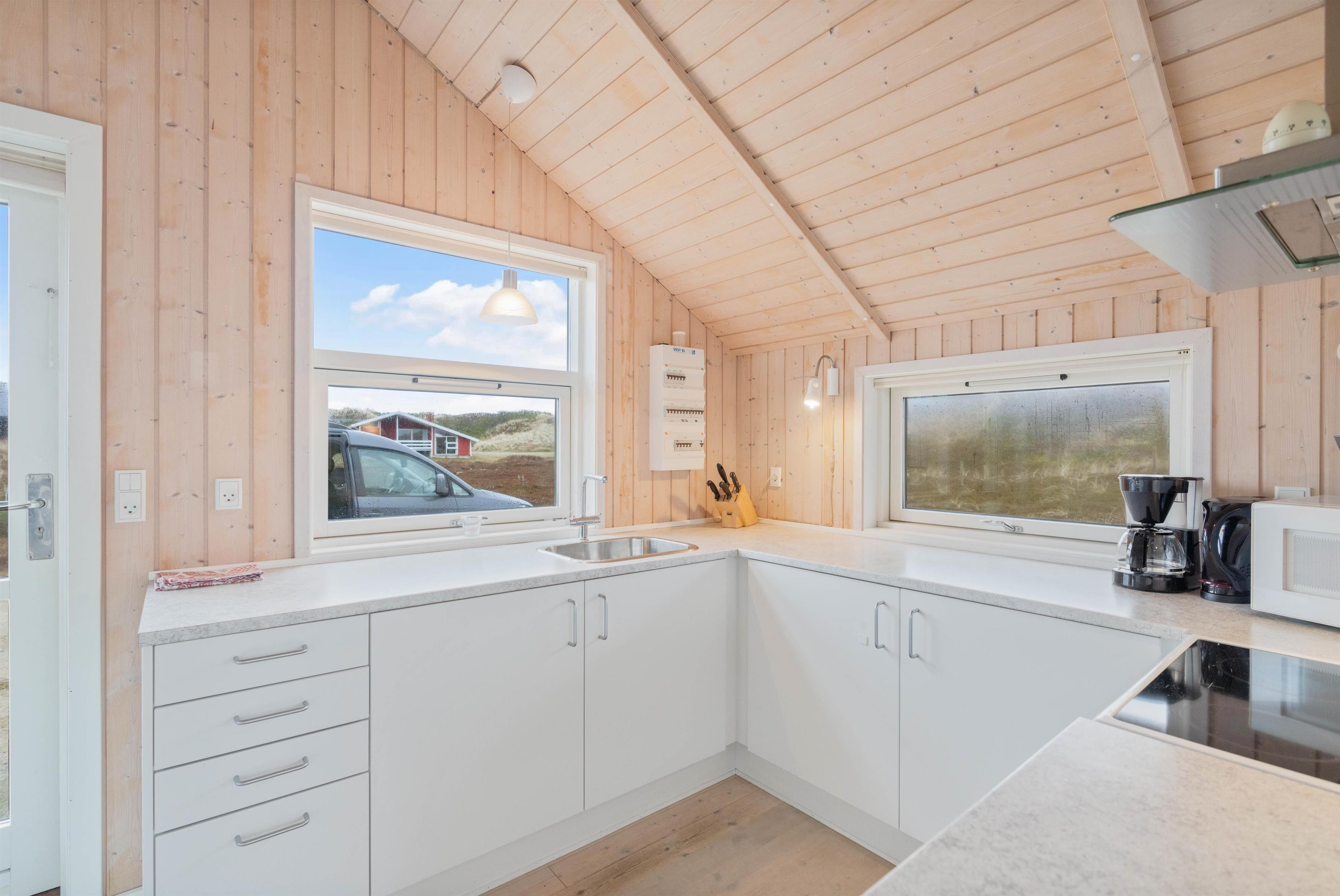 Det store opholdsrum er præget af to store vinduespartier, der bader rummet i lys. Men ikke nok med det, så inviterer vinduerne udsigten helt indenfor, så det føles som om, man befinder sig midt i klitterne. Det giver en helt særlig ro, og I vil helt sikkert mærke både puls og skuldre sænke sig.