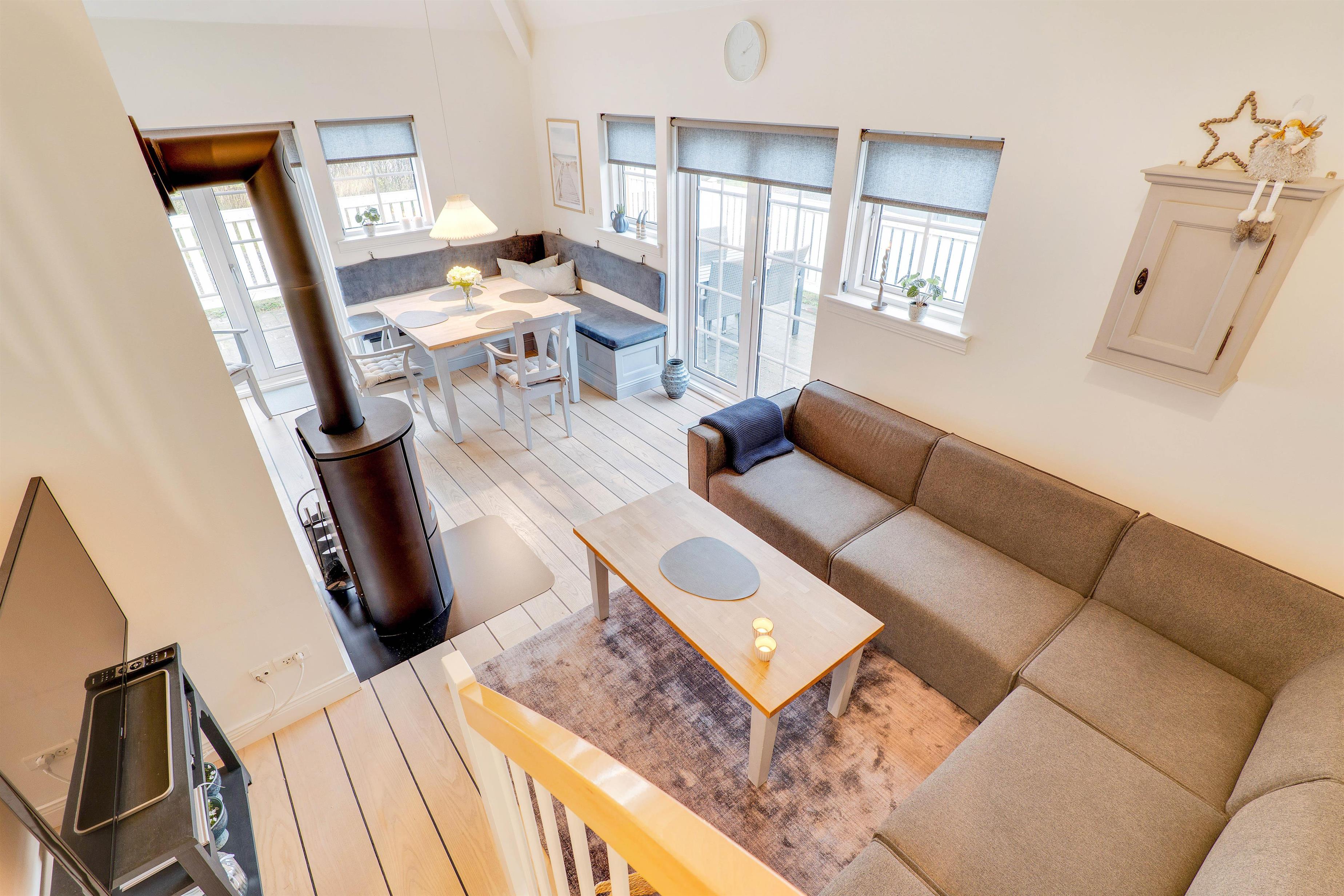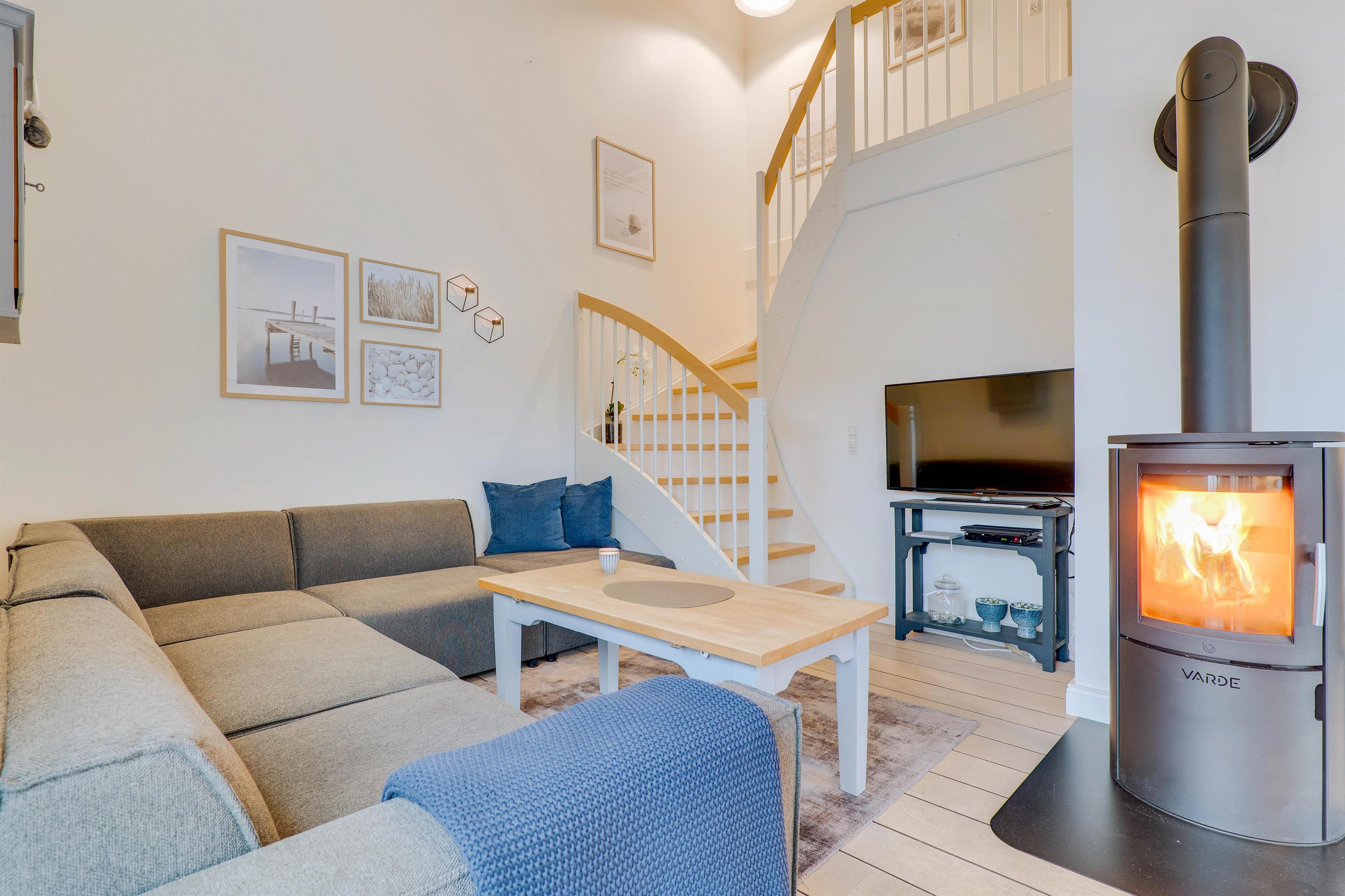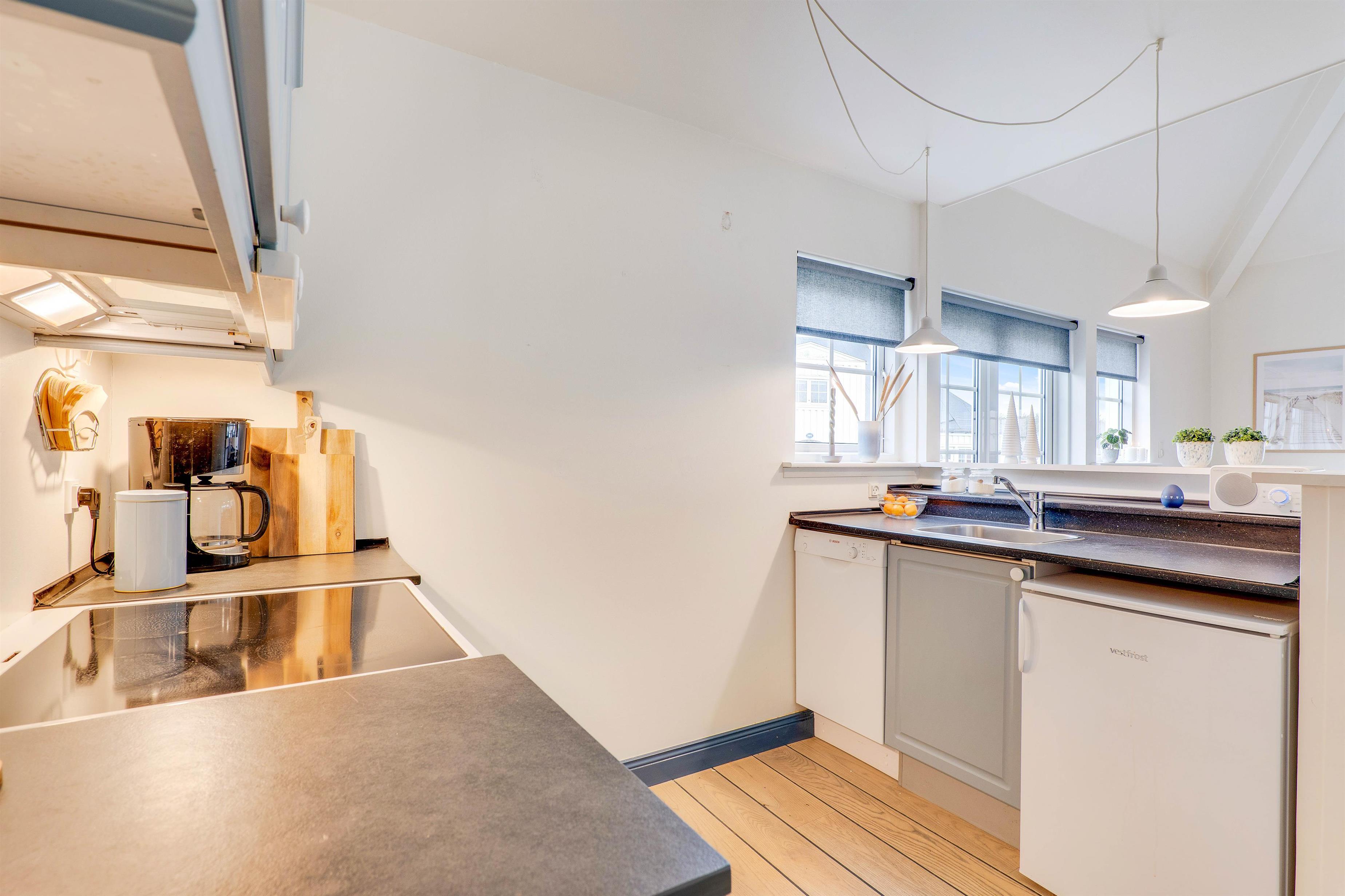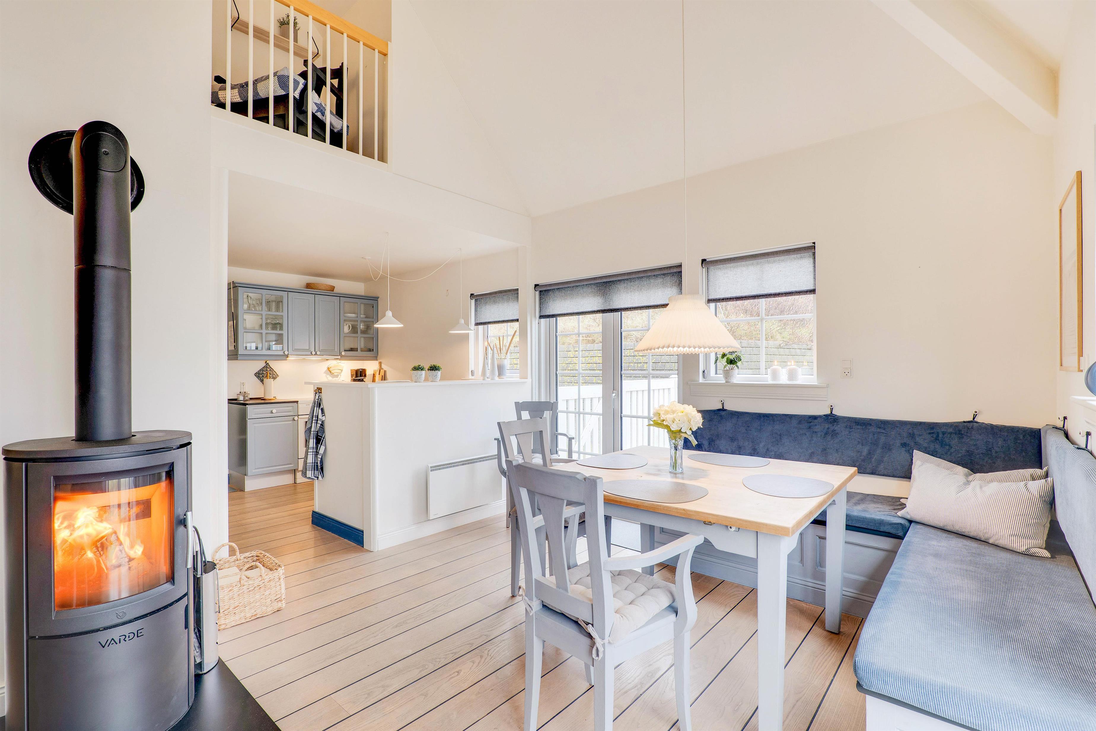 I stueetagen finder I et lille, fint køkken med komfur, opvaskemaskine og køleskab med 15 liters frysekapacitet. Fra køkkenet er der adgang til en hyggelig spisekrog i opholdsrummet, der er indrettet med indbygget bænk i klassisk stil. Fra pladsen på bænken er der et flot kig op til lejlighedens første etage. I opholdsrummet finder I også et hyggeligt hjørne med en knitrende brændeovn, behagelig sofa og fladskærms-tv.