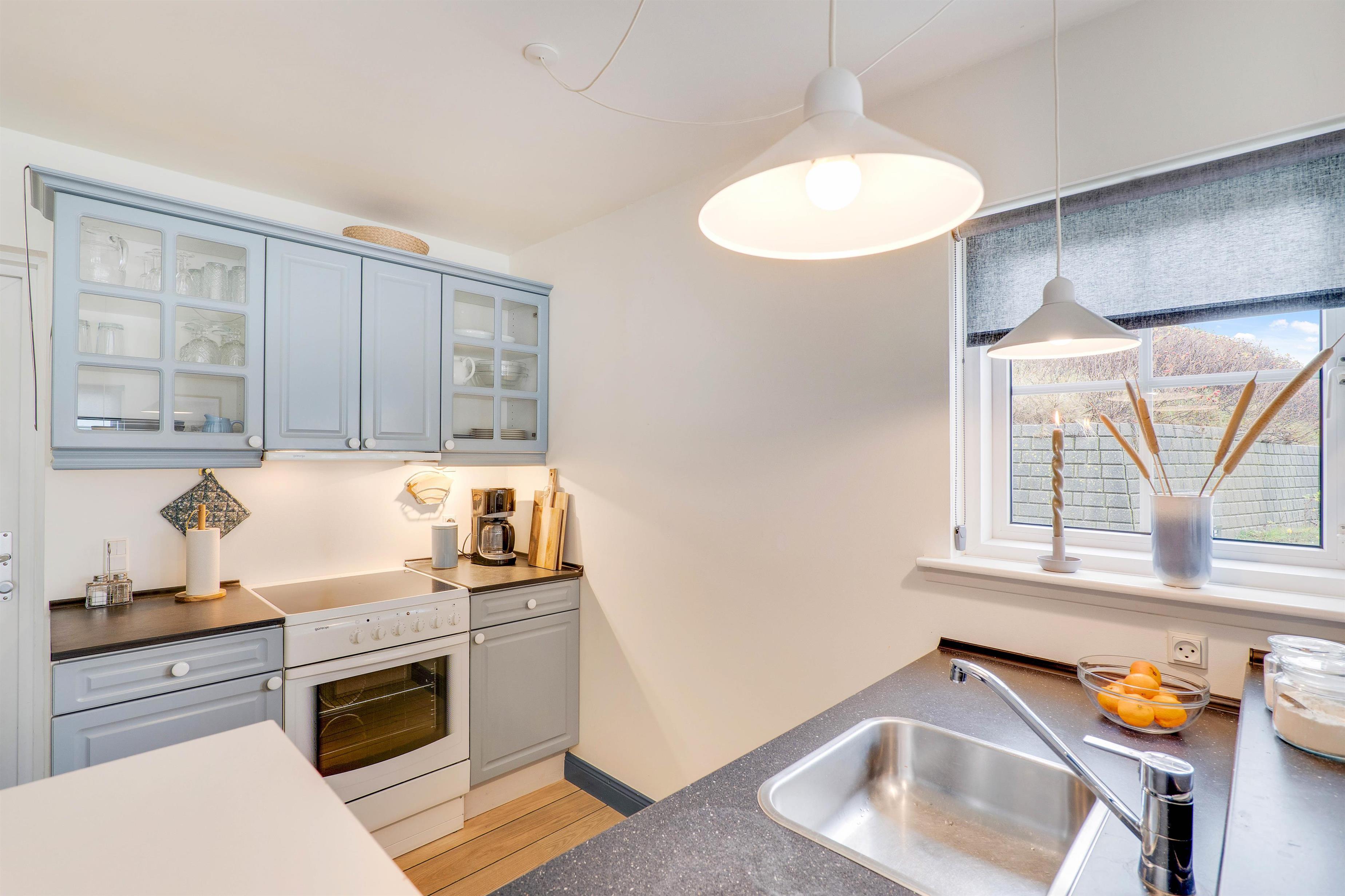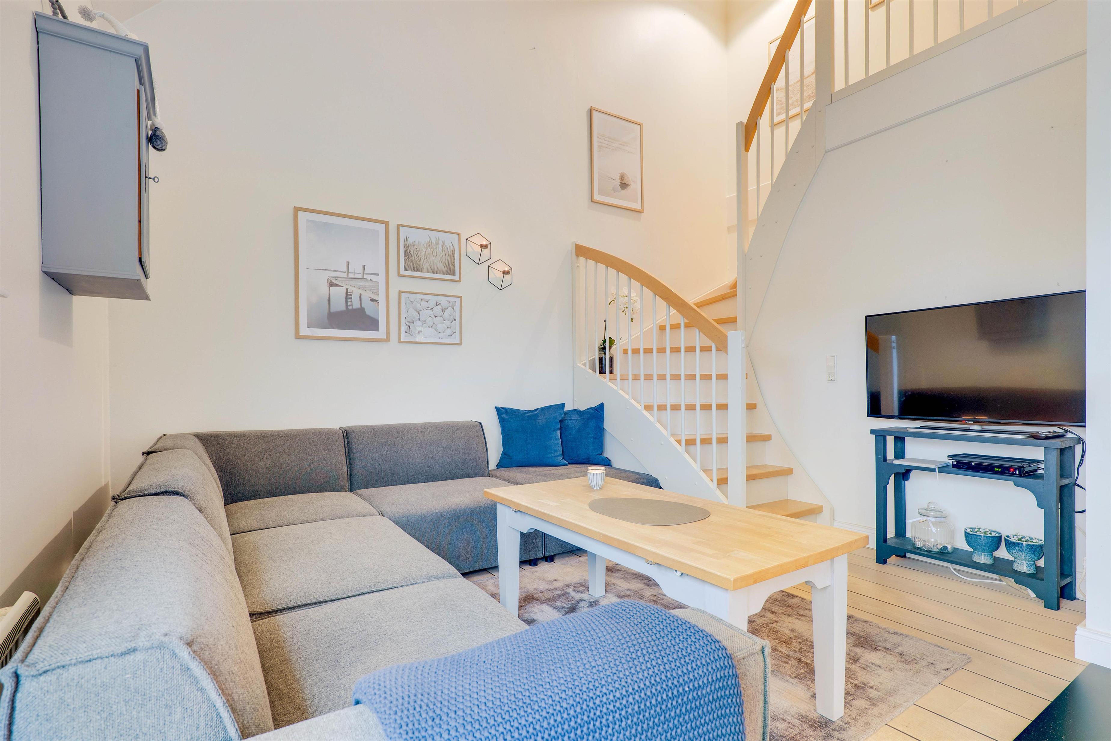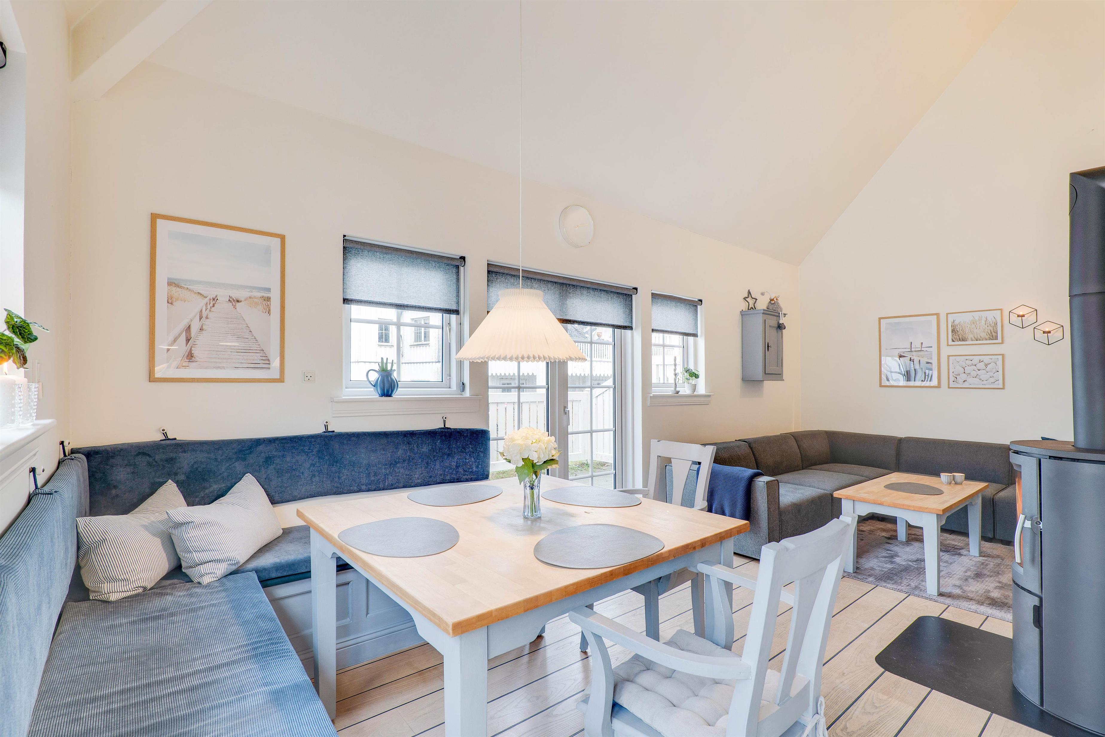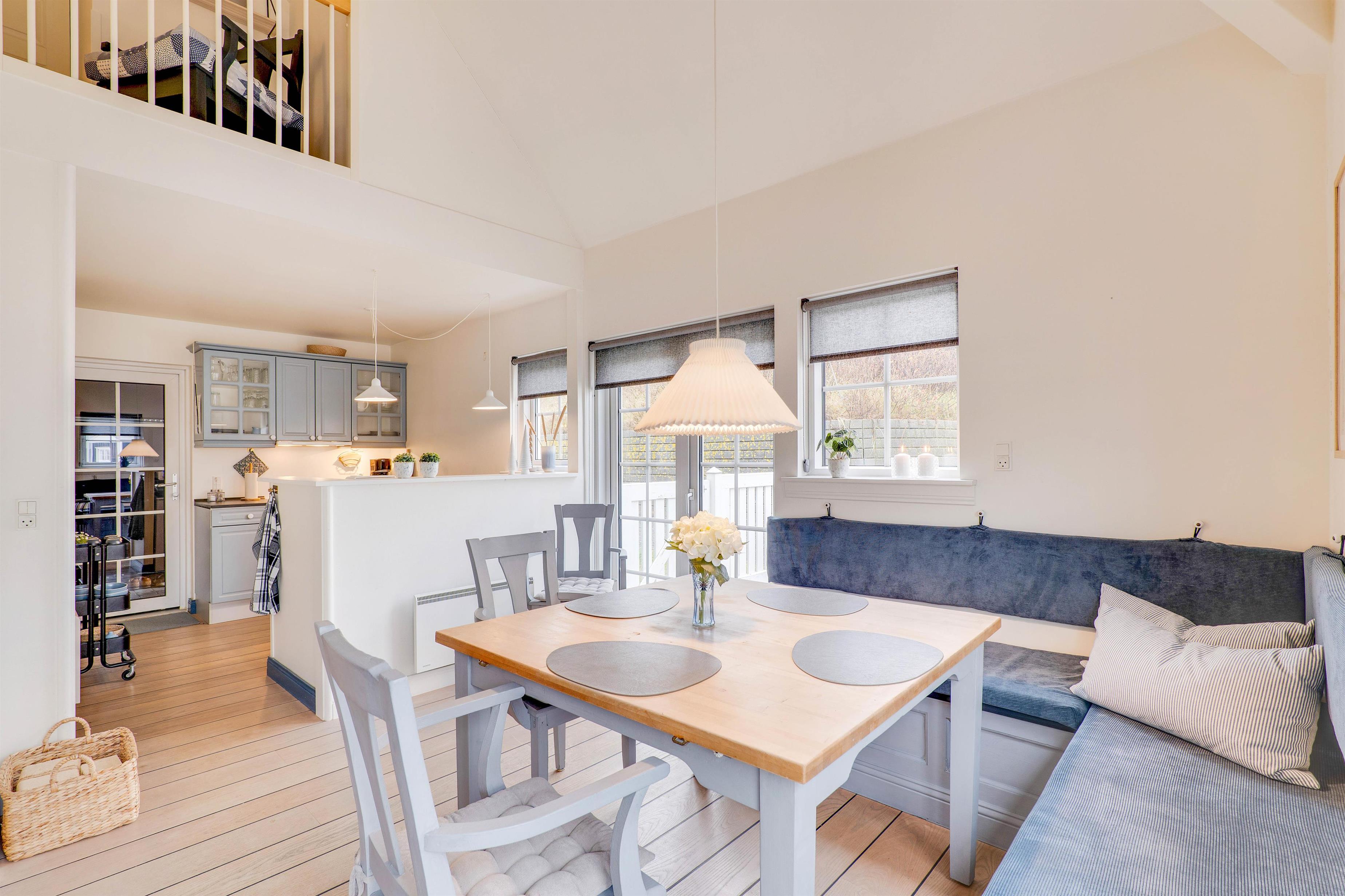 I stueetagen finder I et lille, fint køkken med komfur, opvaskemaskine og køleskab med 15 liters frysekapacitet. Fra køkkenet er der adgang til en hyggelig spisekrog i opholdsrummet, der er indrettet med indbygget bænk i klassisk stil. Fra pladsen på bænken er der et flot kig op til lejlighedens første etage. I opholdsrummet finder I også et hyggeligt hjørne med en knitrende brændeovn, behagelig sofa og fladskærms-tv.