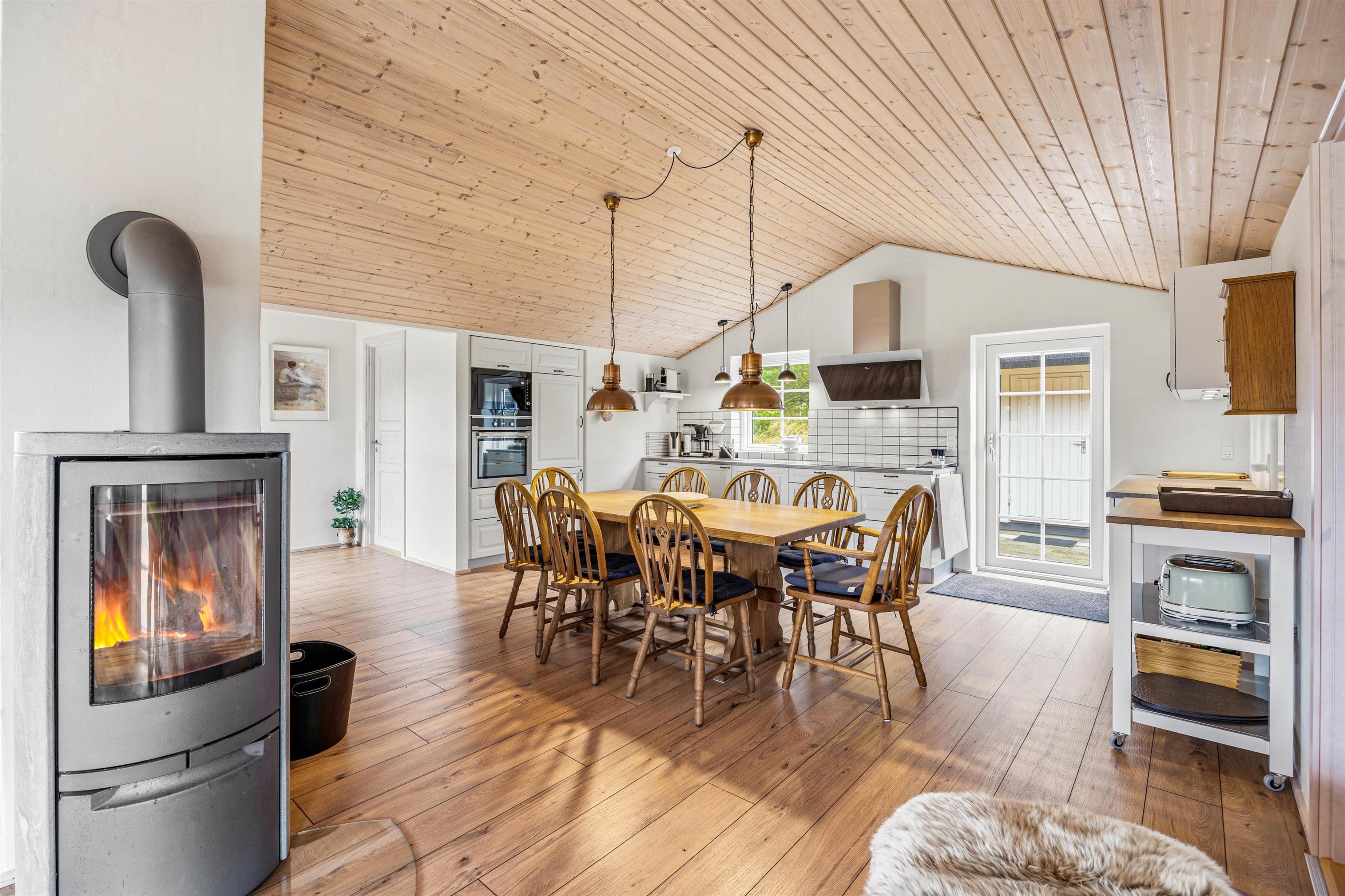 Når dagen går på hæld, kan I tænde op i brændeovnen og nyde den varme og hyggelige atmosfære. Der er gulvvarme i hele huset, som sørger for et behageligt indeklima året rundt.
