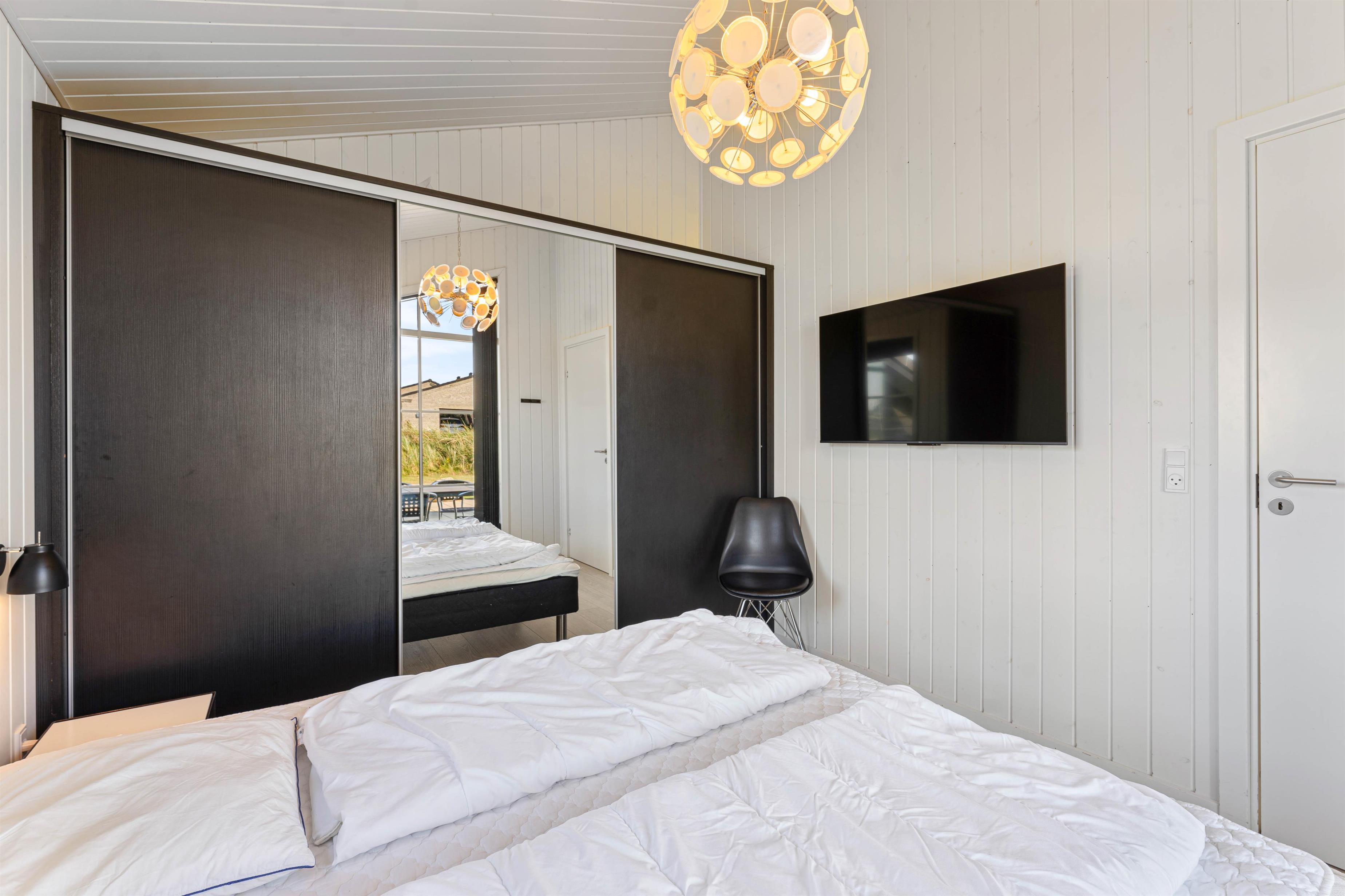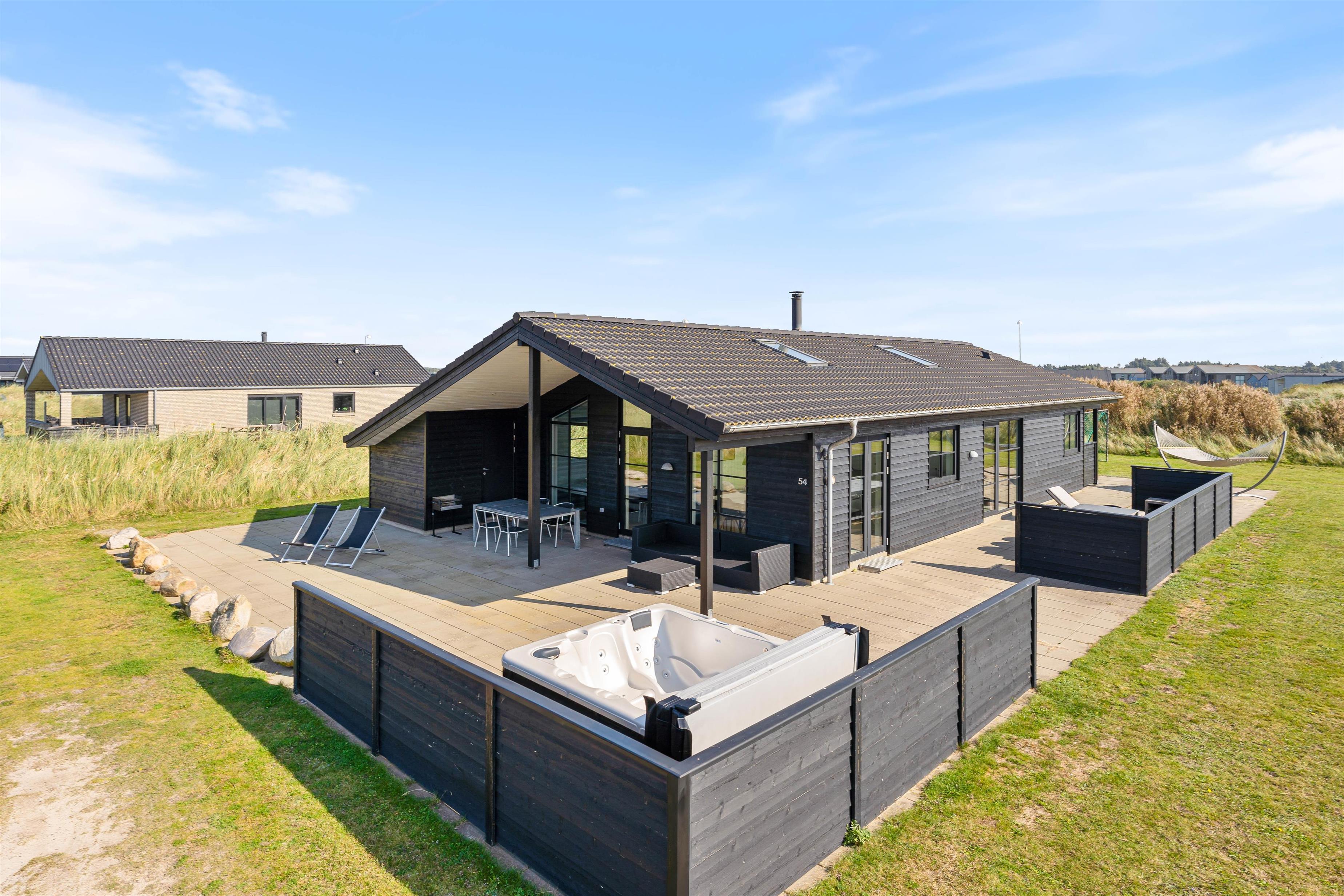 Feriehuset indeholder alle de moderne bekvemmeligheder, I vil forvente i et feriehus i dag. Det er lyst indrettet og har praktiske gulve, kabel tv og danske kanaler i alle værelser og en soundbar, som giver god lyd til dine film eller musik fra den medbragte tablet. De to badeværelser er godt indrettet og på det store er der spa og sauna opført i en lækker kvalitet. Der er et udhus mod vest, hvis du har medbragte cykler med. På hemsen er der mulighed for skøn hygge for børnene. Fladskærmene på værelserne er til egen medbragt spillekonsol, Google Chromecast eller DVD-afspiller, da de er ikke tilsluttet parabol.