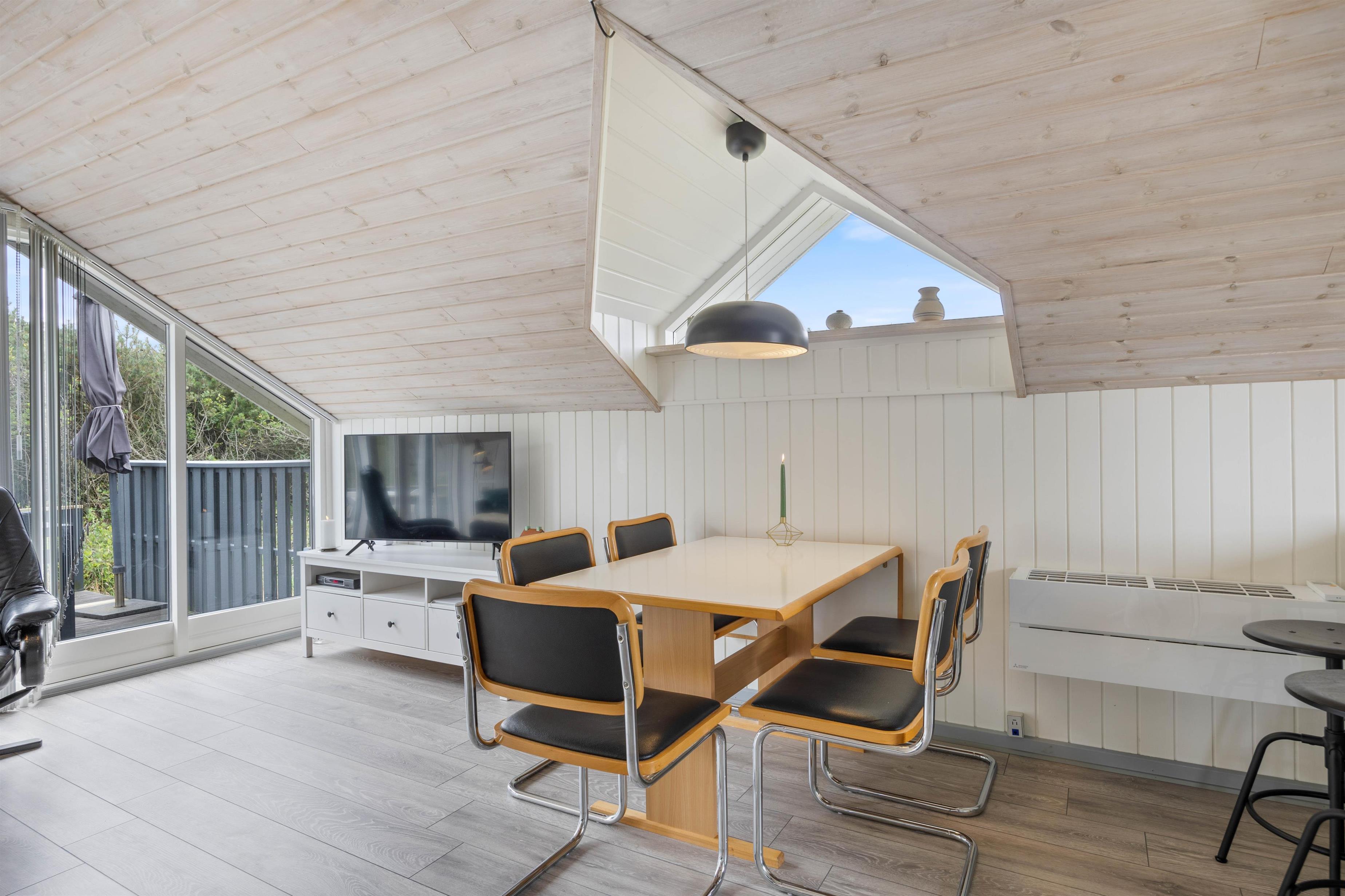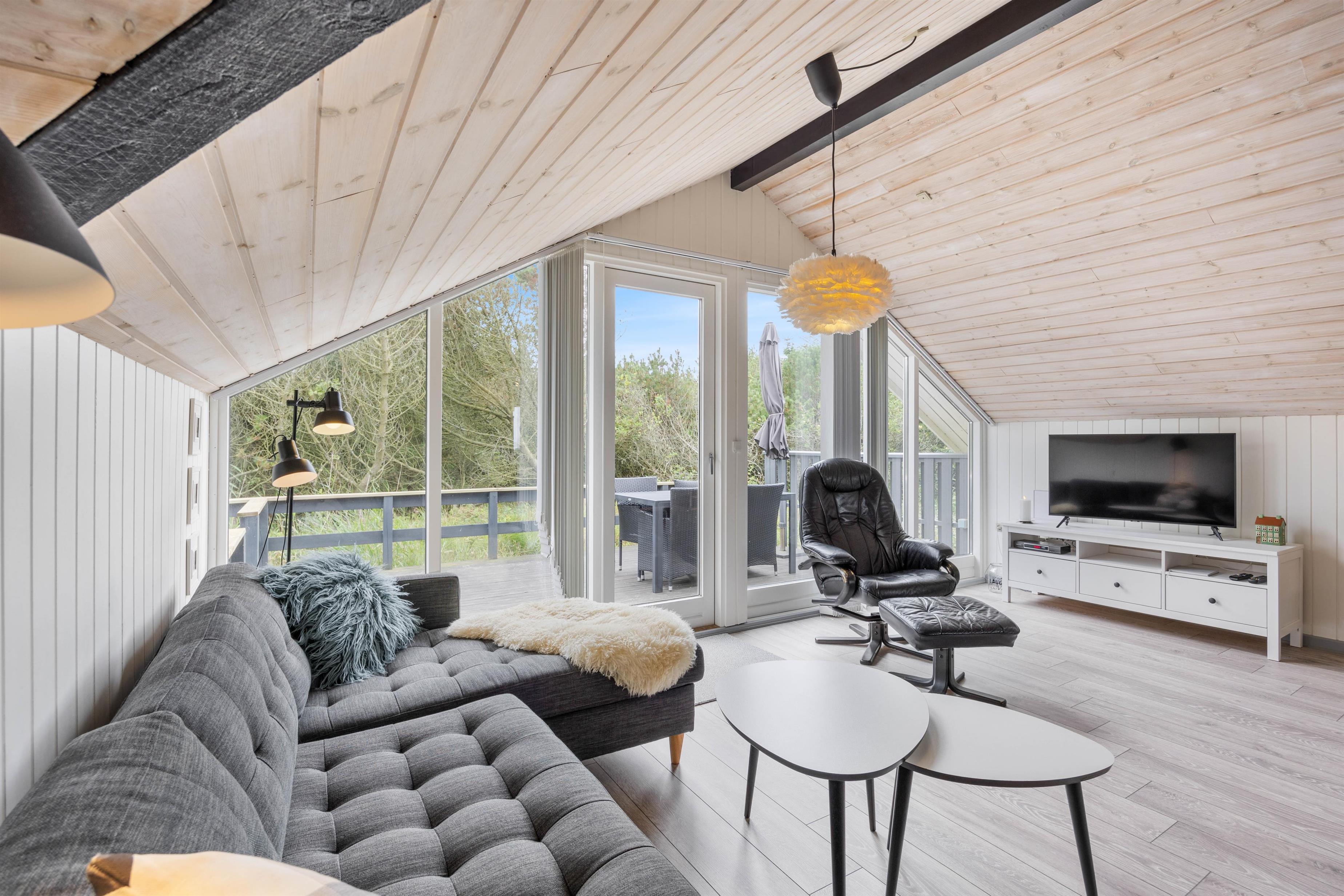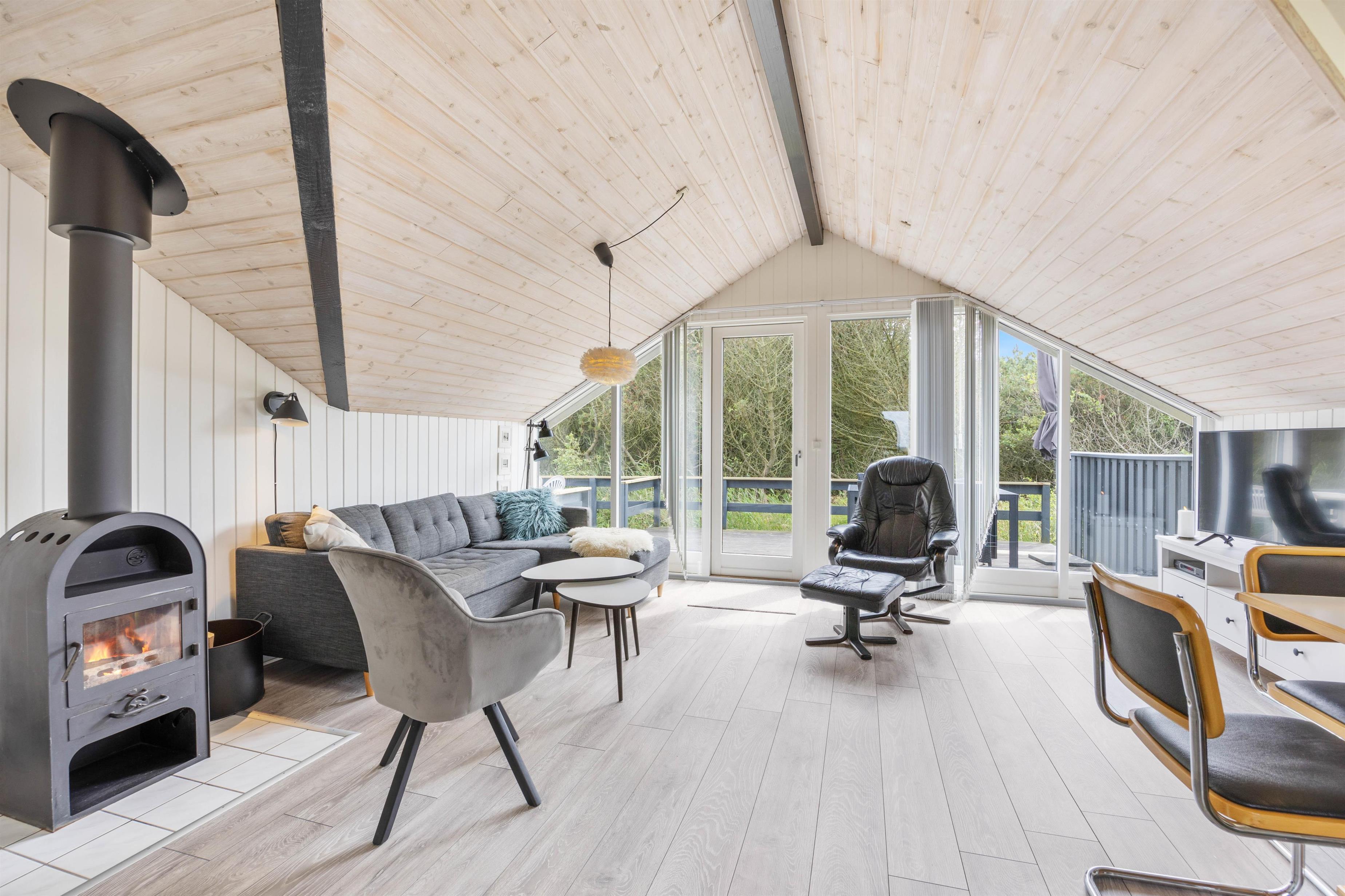 Huset emmer af klassisk sommerhuscharme. Det kan til dels tilskrives det høje loft til kip, de lyse paneler på vægge og lofter og den lune brændeovn, der sender varmebølger ud i hele opholdsrummet. De store vinduespartier sørger for at bade rummet i lys, hvilket bidrager til den gode atmosfære og rummelighed.