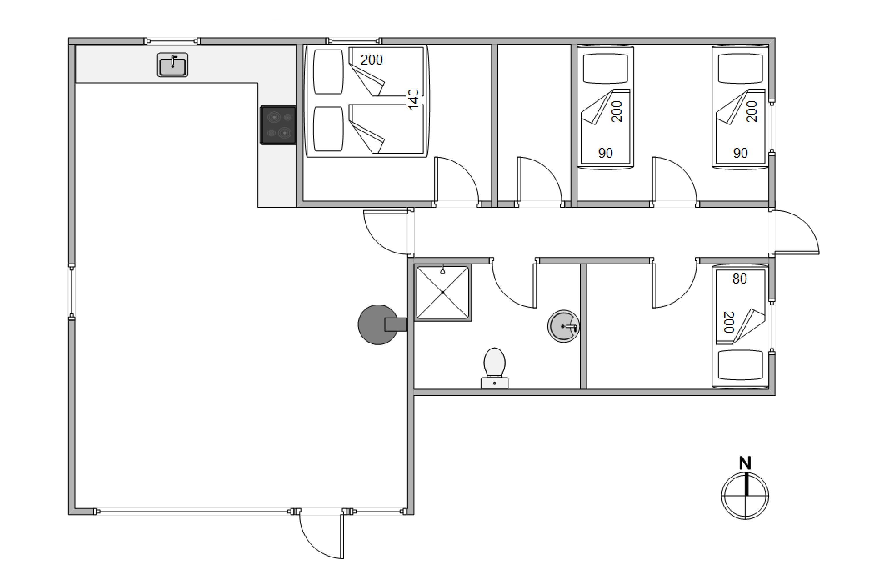 Huset råder over tre gode værelser. Det første værelse er indrettet med dobbeltseng, det næste med to enkeltsenge, mens det sidste er udstyret med én enkeltseng. Så der er plads til at børnene kan få deres eget værelse under deres ophold. Herudover er der et nydeligt badeværelse med bruseniche, vaskemaskine og gulvvarme.