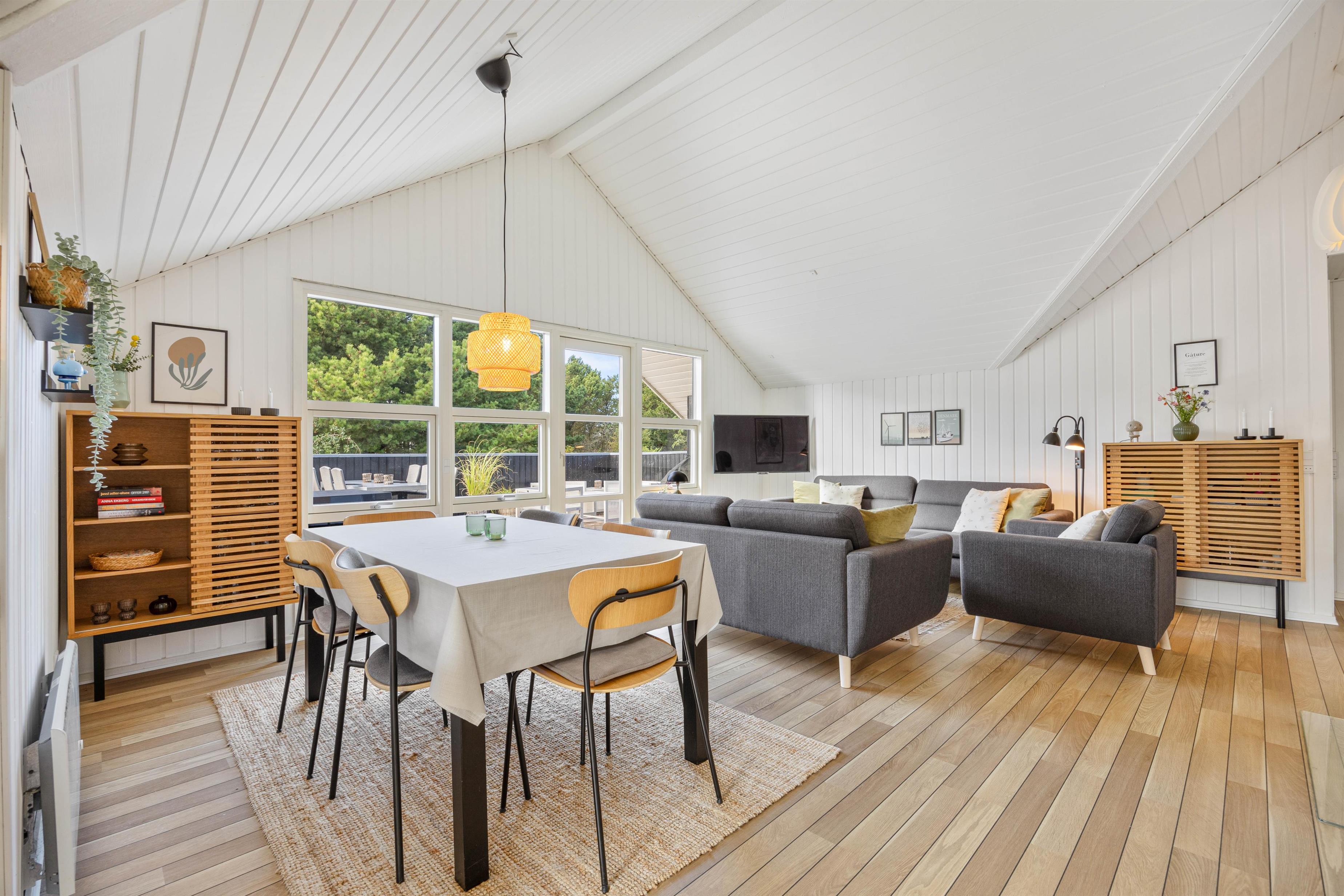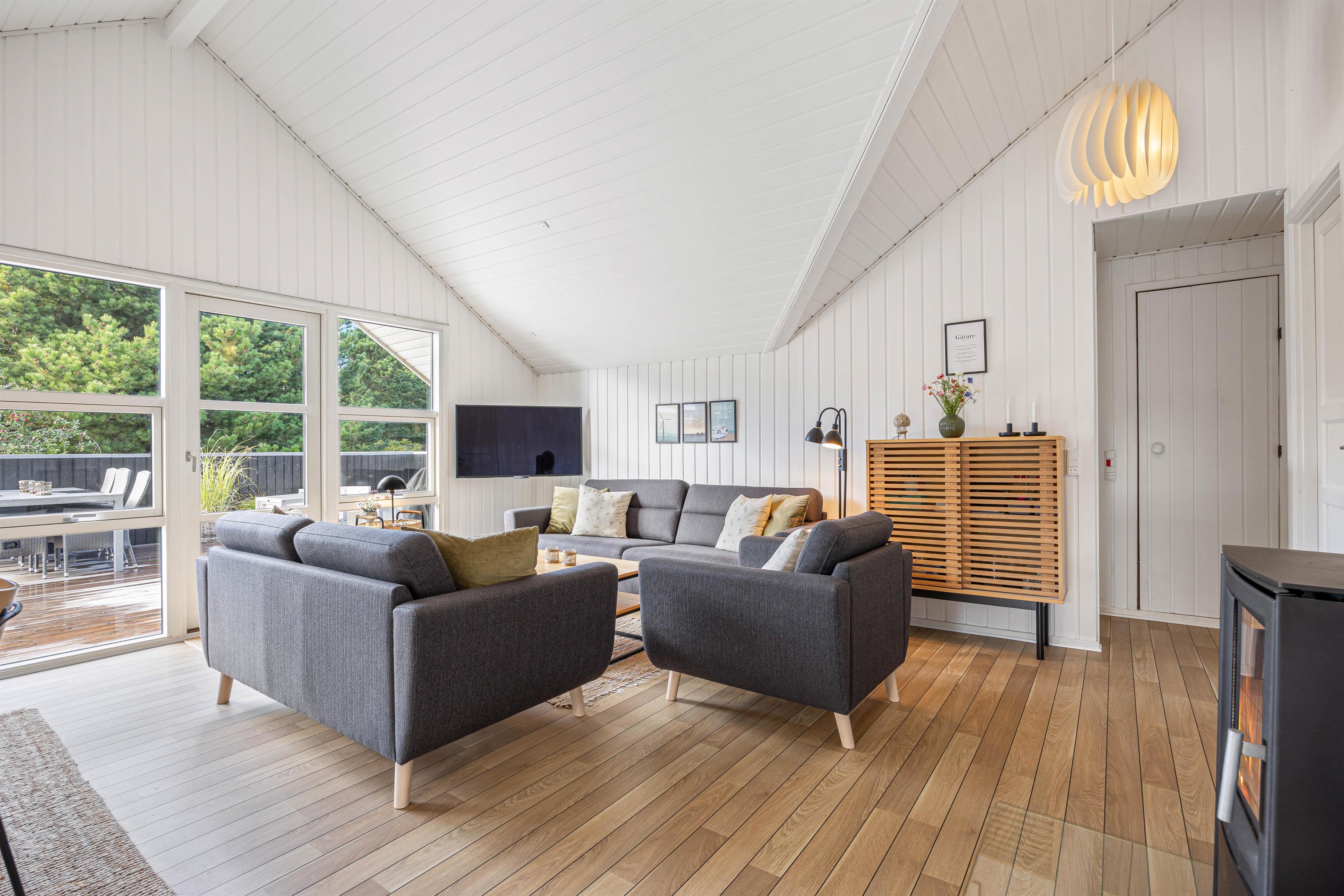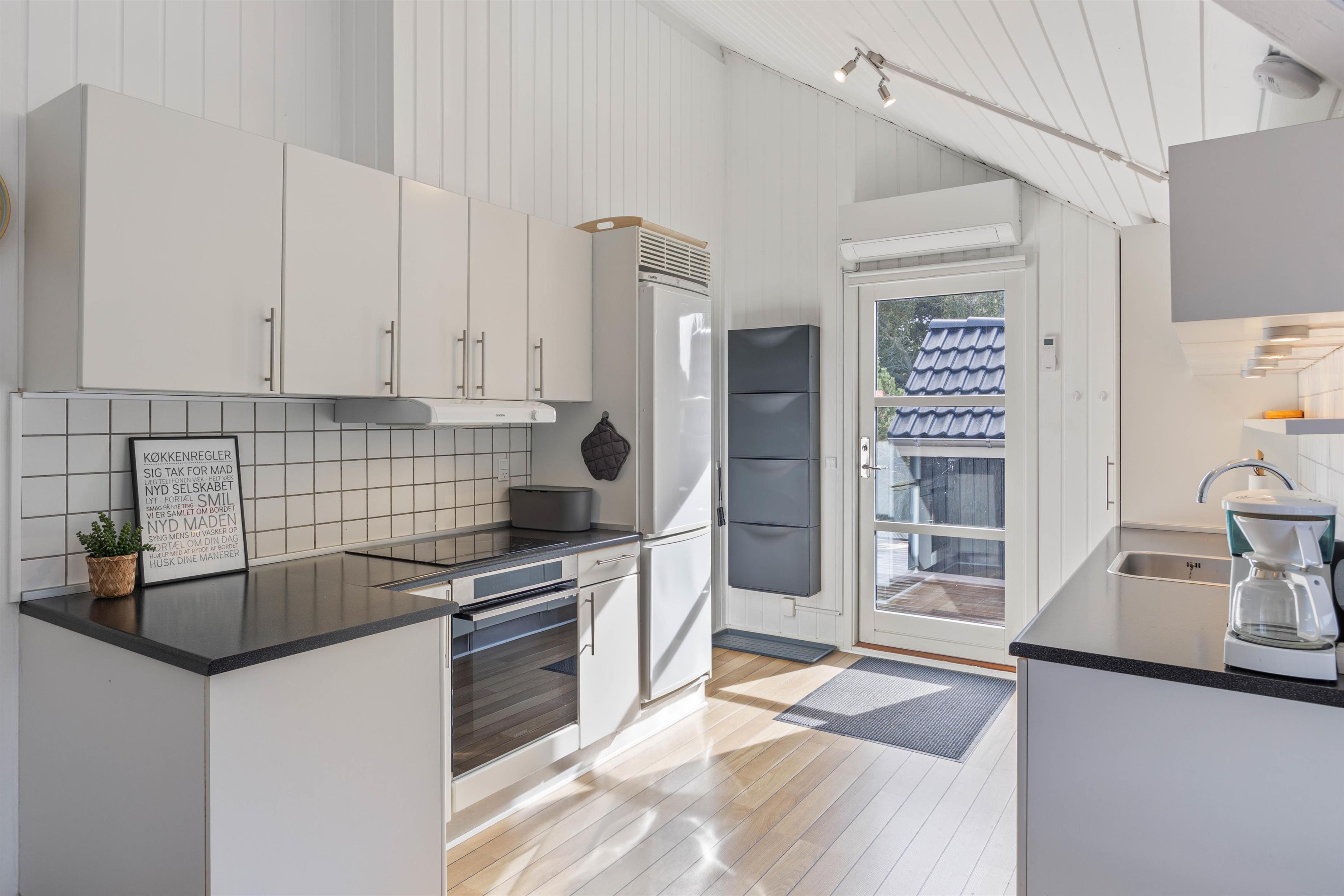 Sommerhusets hjerte er alrummet, og her kan I samle hele ferieflokken til mange hyggelige stunder i løbet af ferien. Her kan I både være sammen om at lave mad i køkkenet, spille spil omkring spisebordet og se film i tv’et, mens brændeovnens knitren fuldender den hyggelige stemning.