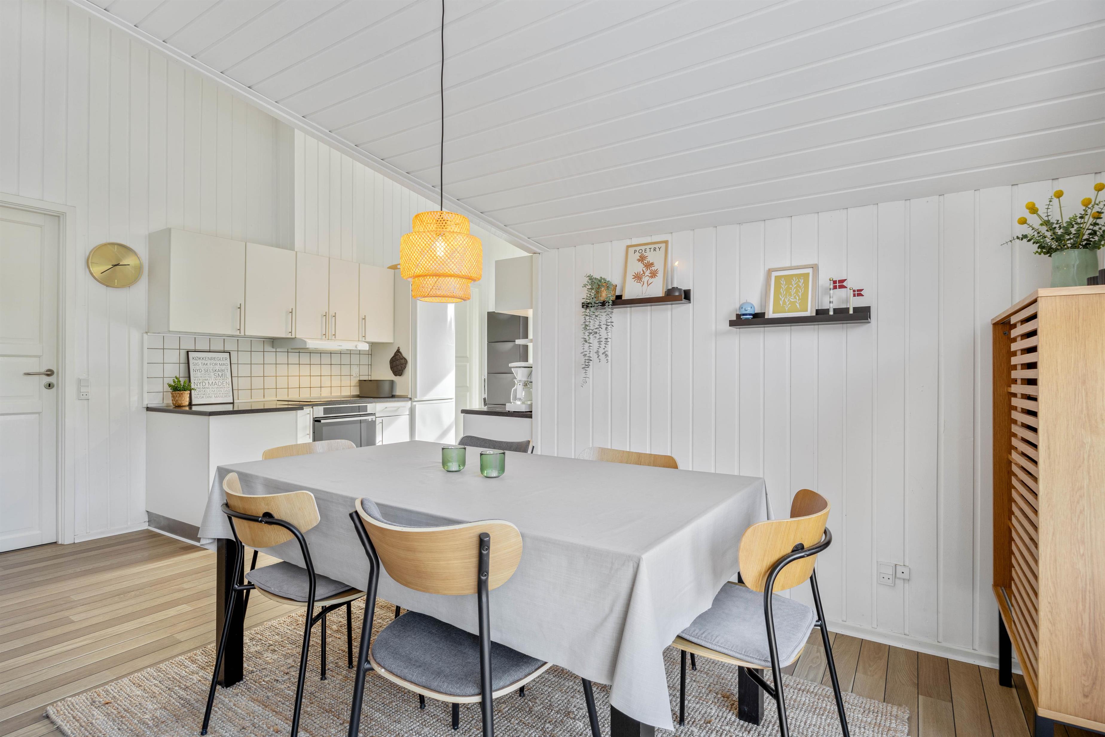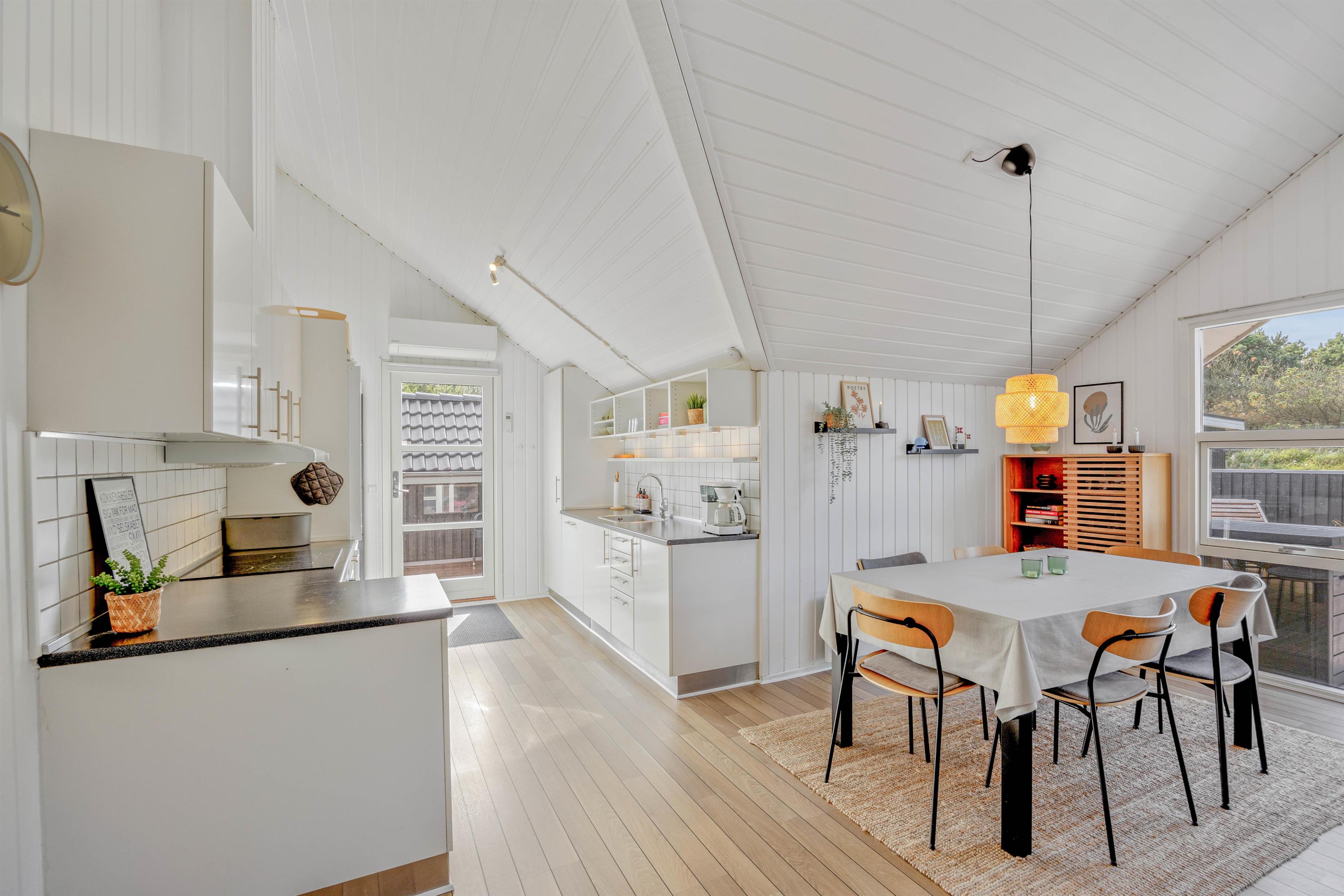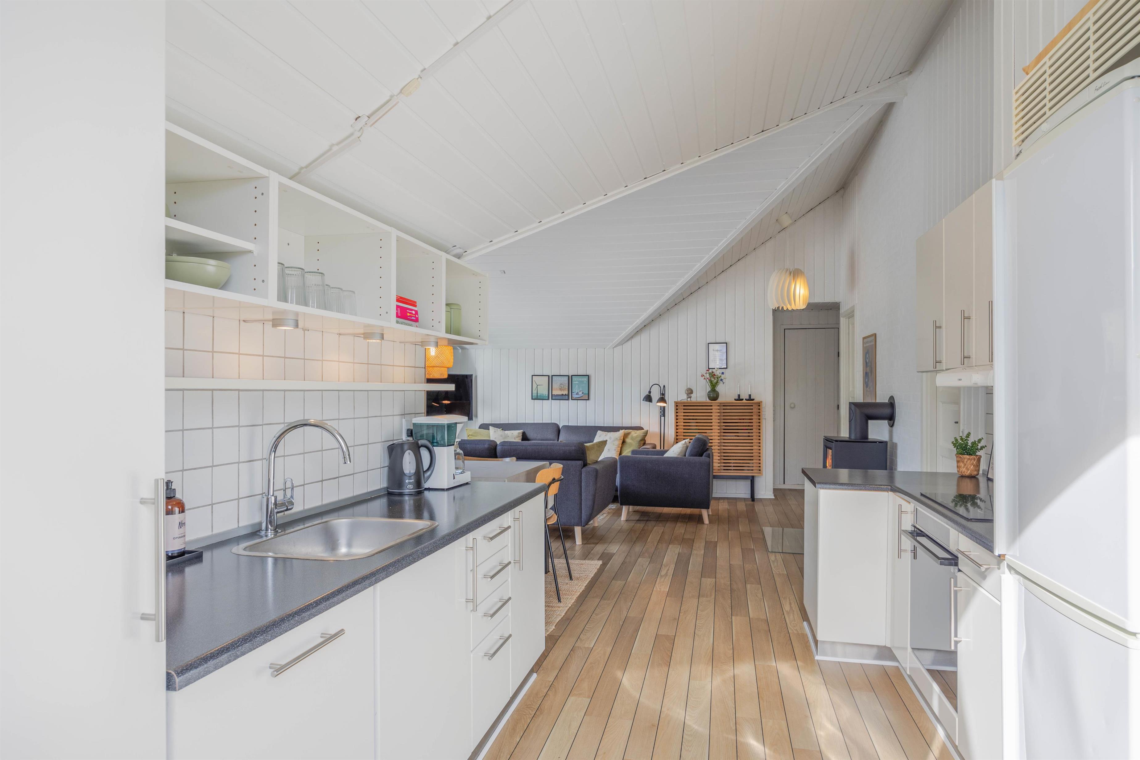 Sommerhusets hjerte er alrummet, og her kan I samle hele ferieflokken til mange hyggelige stunder i løbet af ferien. Her kan I både være sammen om at lave mad i køkkenet, spille spil omkring spisebordet og se film i tv’et, mens brændeovnens knitren fuldender den hyggelige stemning.