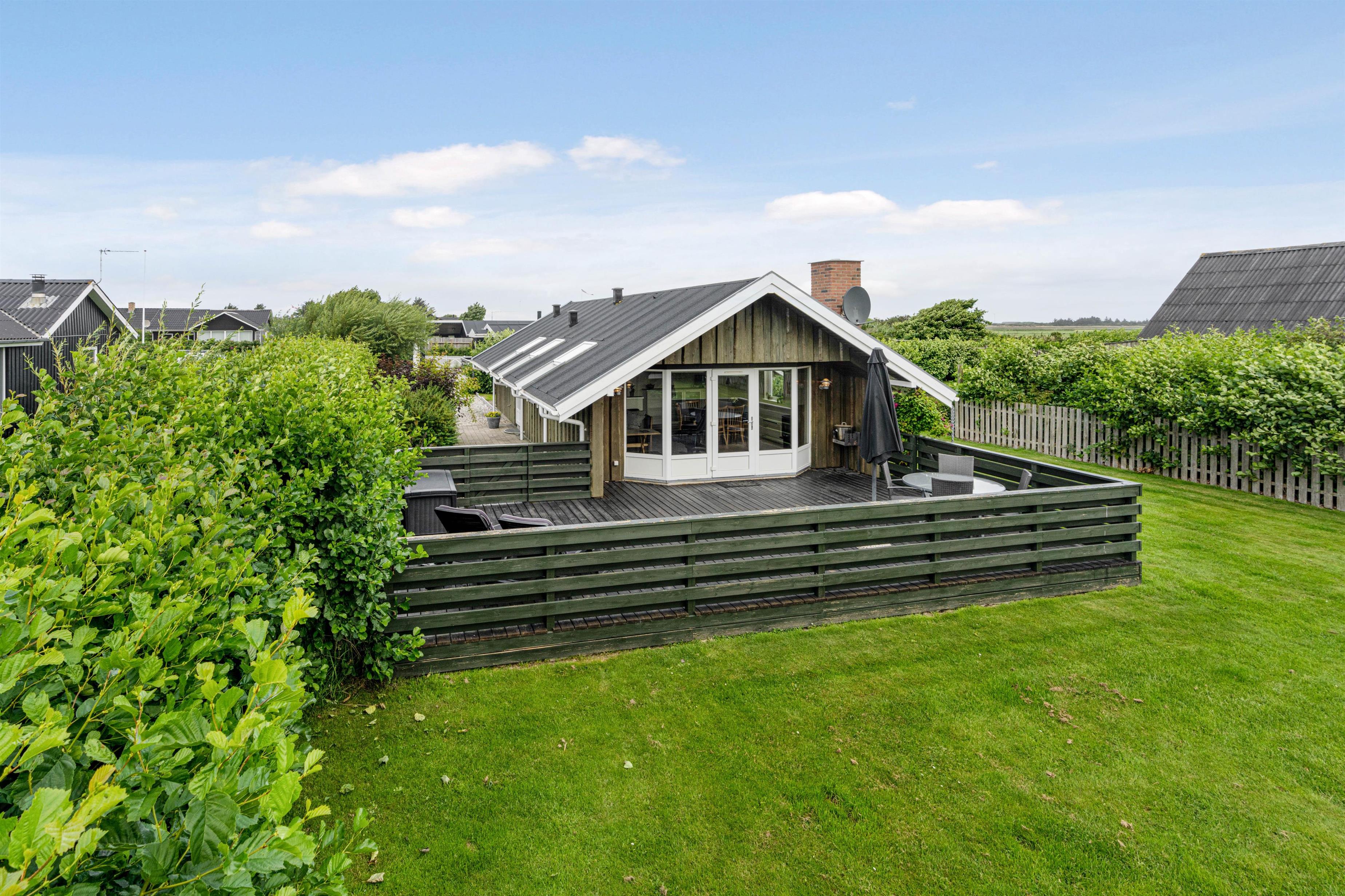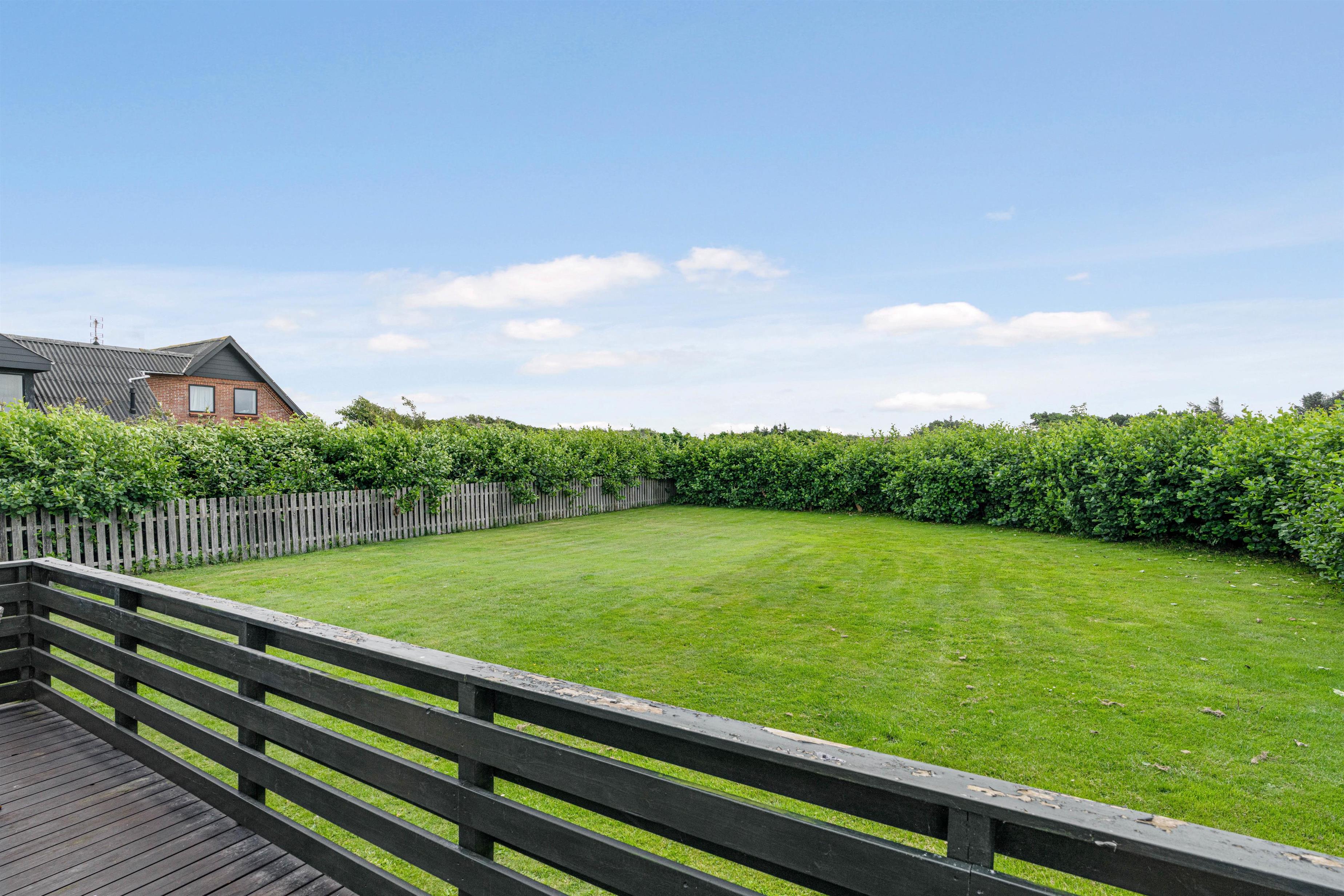 Huset ligger på en rigtig dejlig stor og komplet lukket plænegrund. Her er der plads til at lege, spille bold og hygge sig. Terrassen er ligeledes helt lukket af og vender ud mod haven. Perfekt, hvis I er på ferie med små børn eller har jeres hund med. På terrassen finder I naturligvis havemøbler, liggestole og grill, der tillader jer at rykke al feriehyggen udenfor på de dage hvor vejret er ekstra godt.