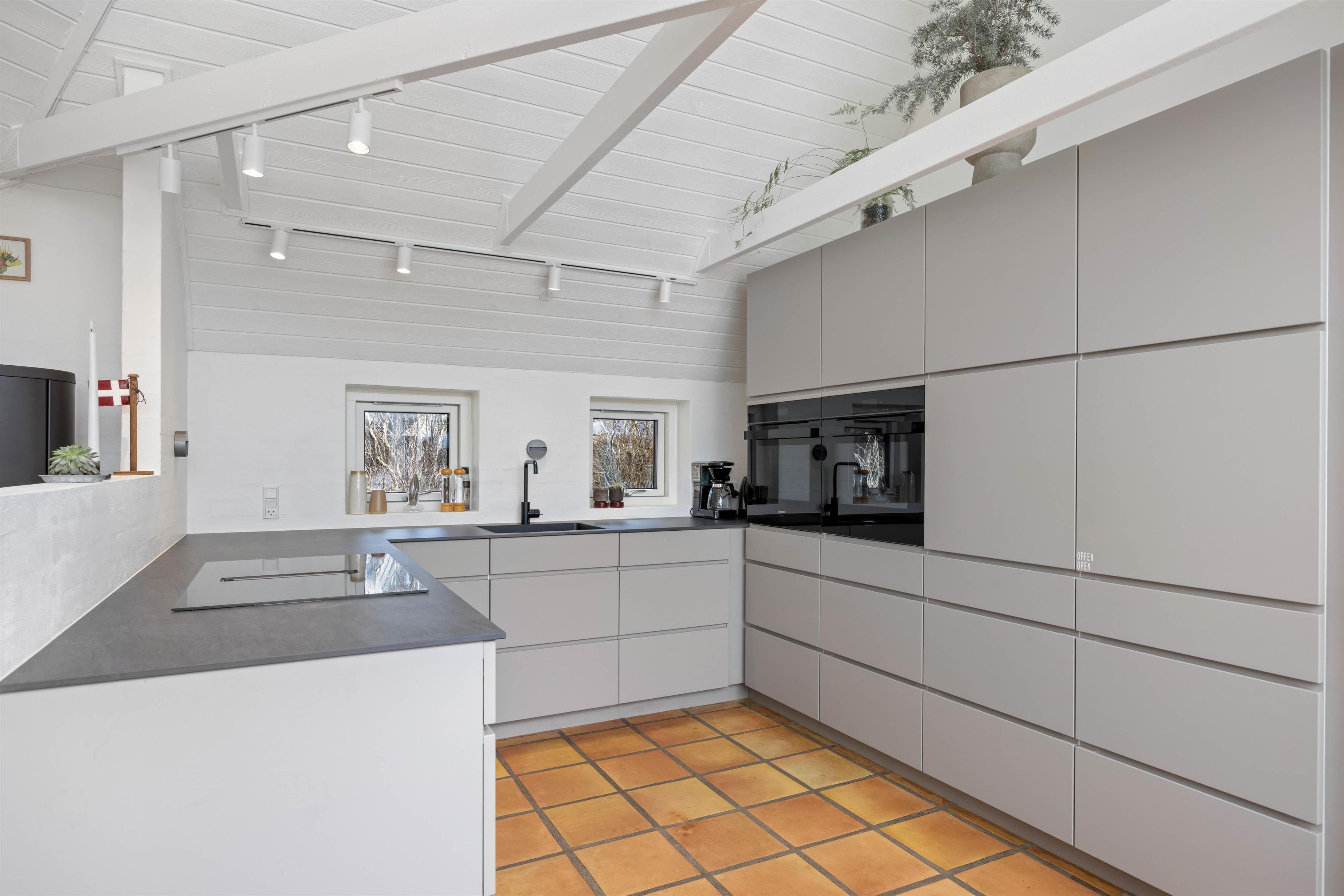 Det moderne køkken er fuldt udstyret med to indbygningsovne, induktionskomfur, stort køleskab, fryser og opvaskemaskine, mens stuen byder på komfortable møbler og et 65” smart-TV med Chromecast til hyggelige aftener.