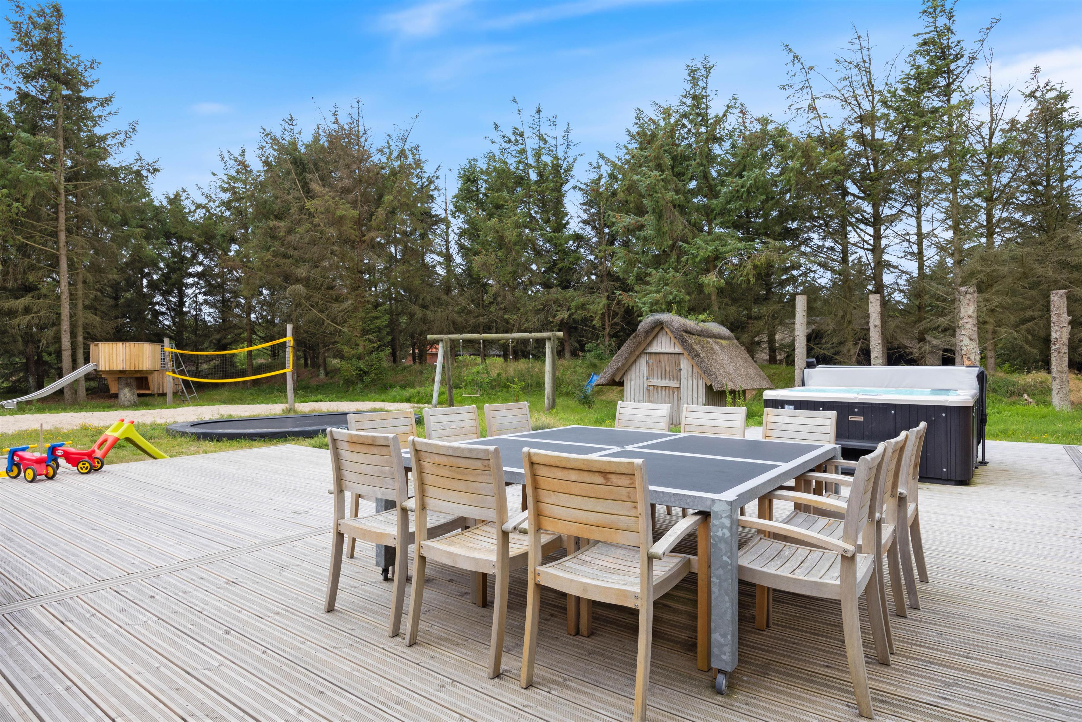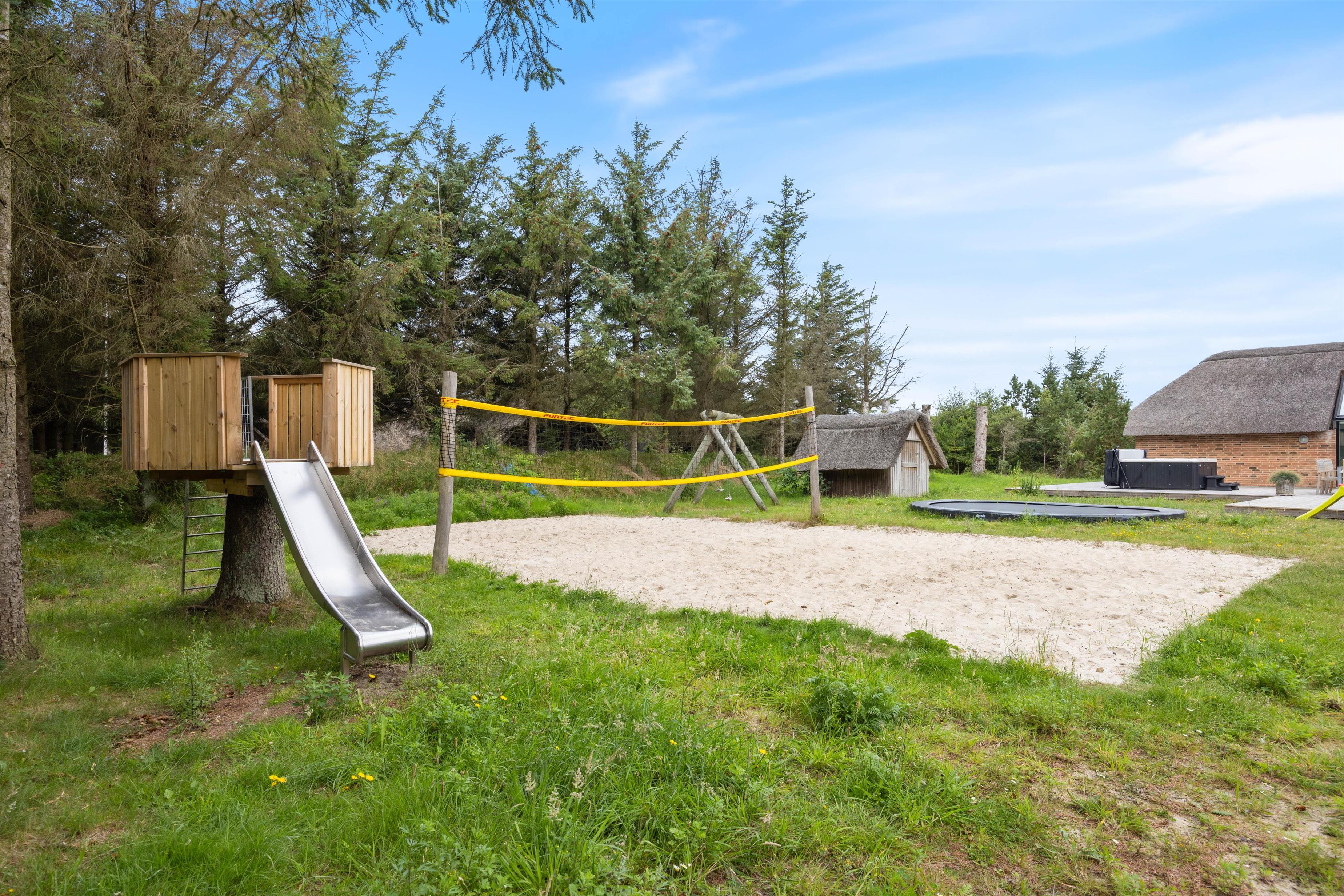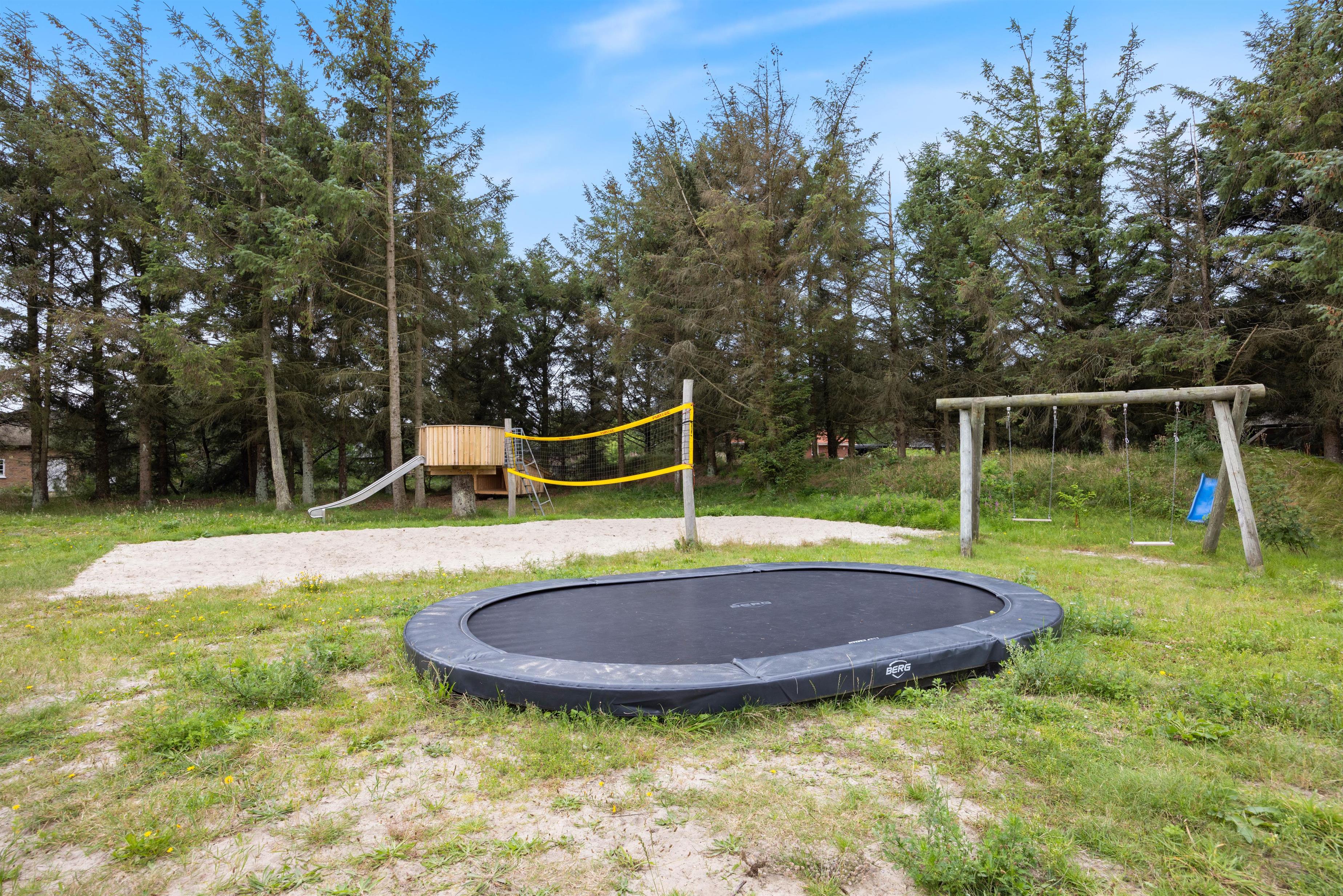 Slap af på den store sydvestvendte terrasse med kvalitets havemøbler, solvogne, parasol og gasgrill, eller find hyggen på den åbne terrasse, mens børnene leger på gynger, i sandkassen eller hopper på trampolinen. Grunden på 2.367 m² er et sandt paradis for udendørs aktiviteter, hvor I også kan spille beachvolley, lege i shelters eller bruge rutsjebanen.