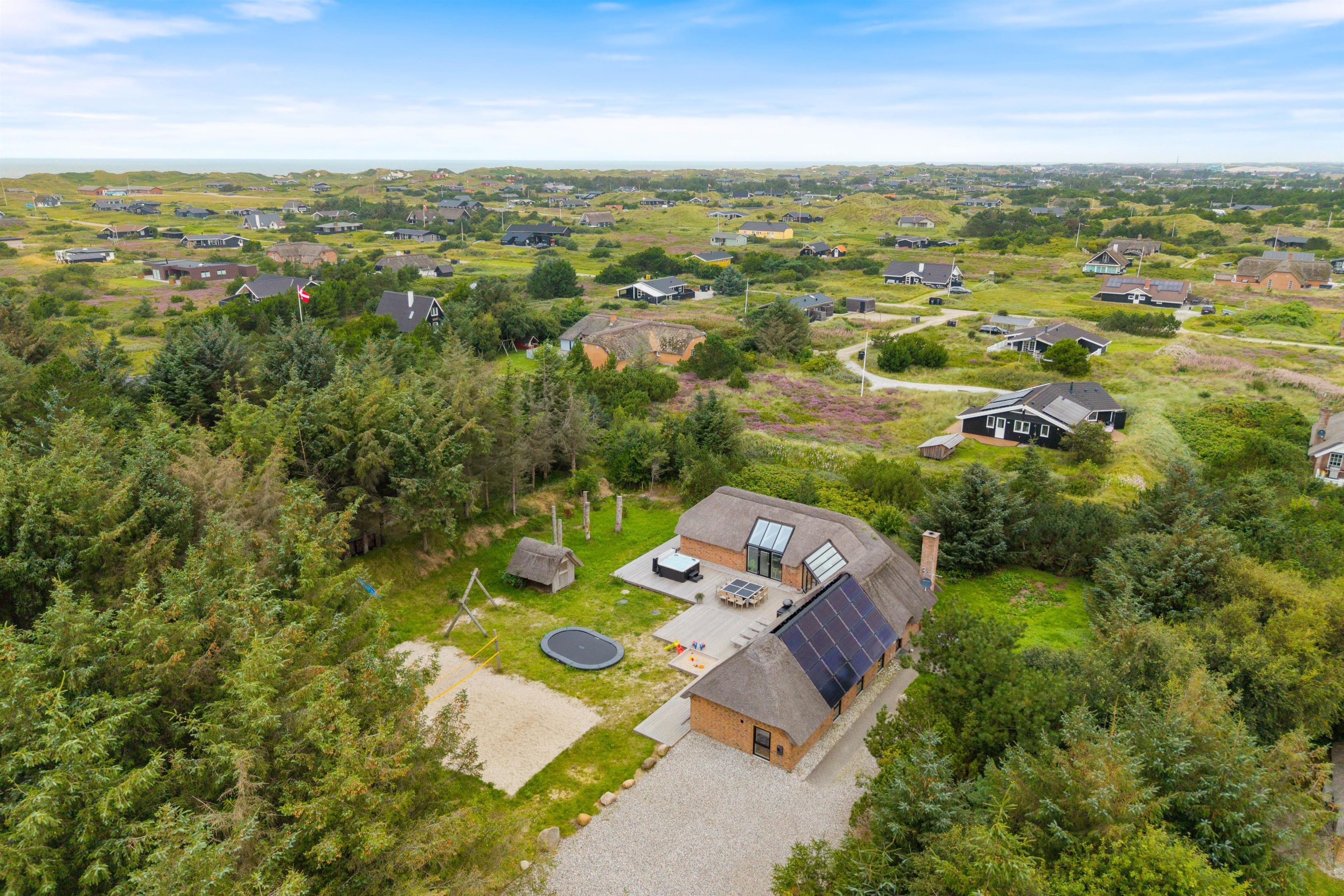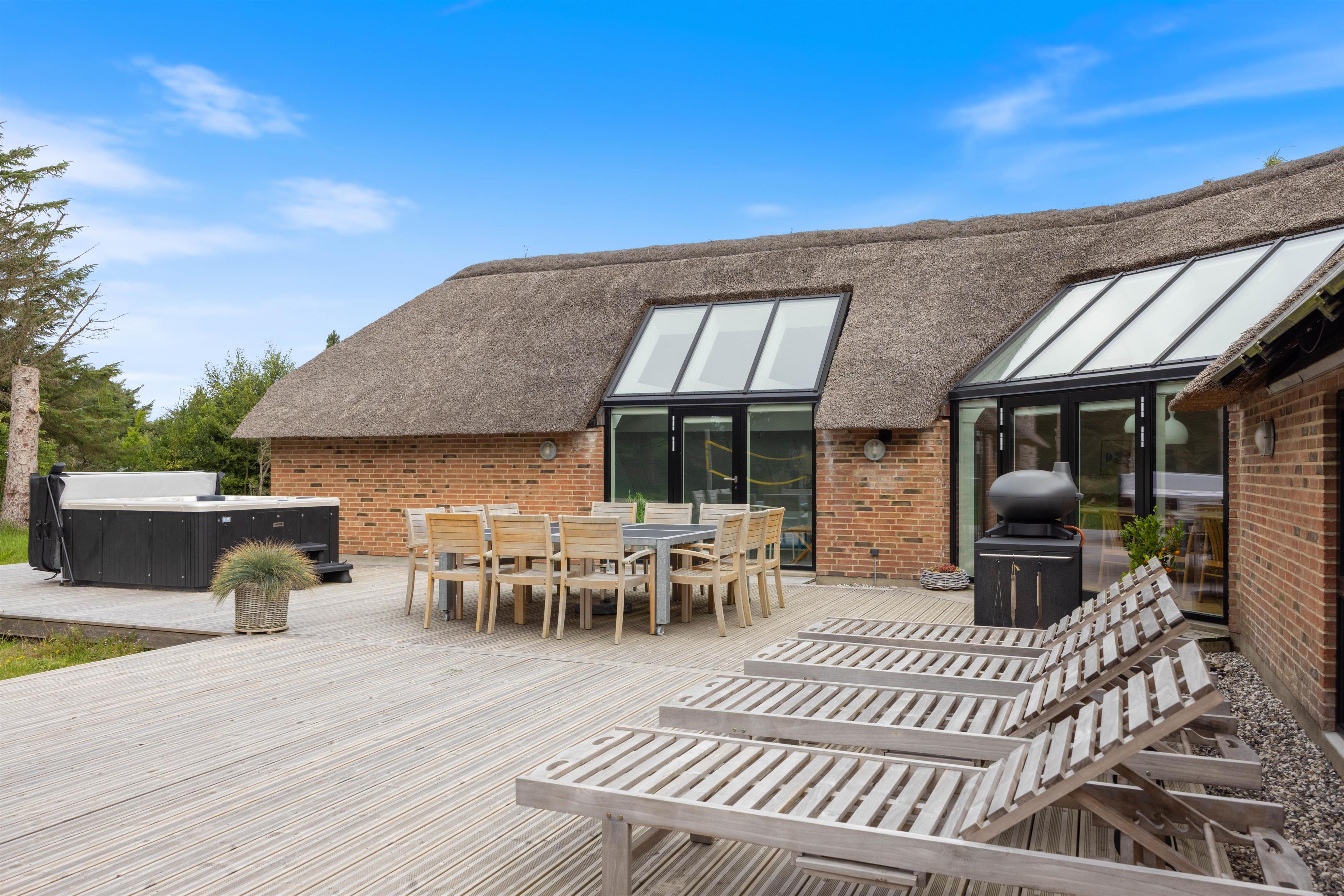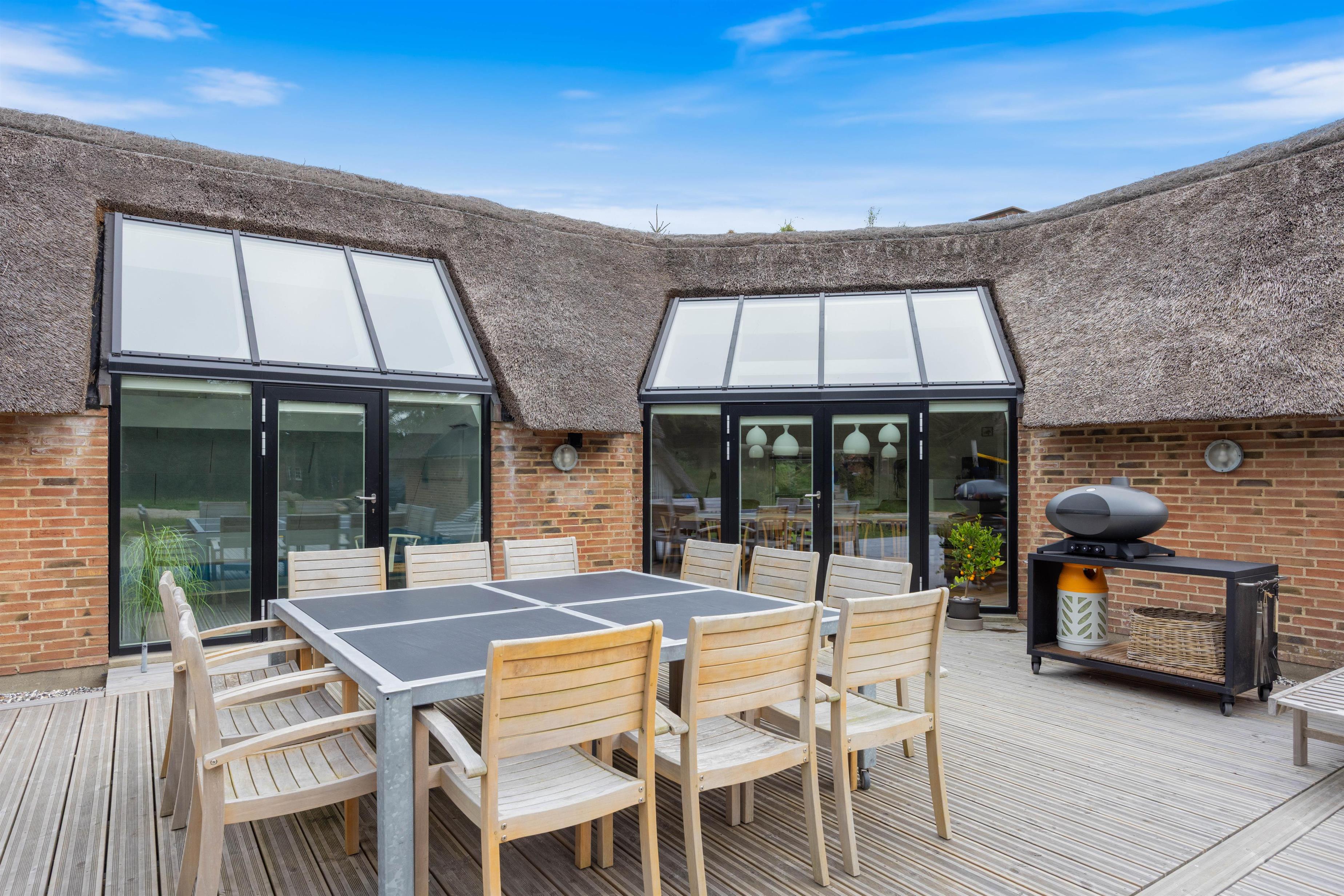 Velkommen til dette sommerhus på 220 kvadratmeter, beliggende på en fredelig 2.500 kvadratmeter stor naturgrund for enden af en stille vej. Huset er stråtækt, totalrenoveret i 2024 og indrettet med alt, hvad I behøver til en uforglemmelig ferie. Her er der plads til op til 12 personer og 2 kæledyr, og I kan se frem til masser af komfort og afslapning. Med brændeovn, gode faciliteter og mulighed for opladning af elbil direkte ved huset er rammerne sat for en ferie, I sent vil glemme.