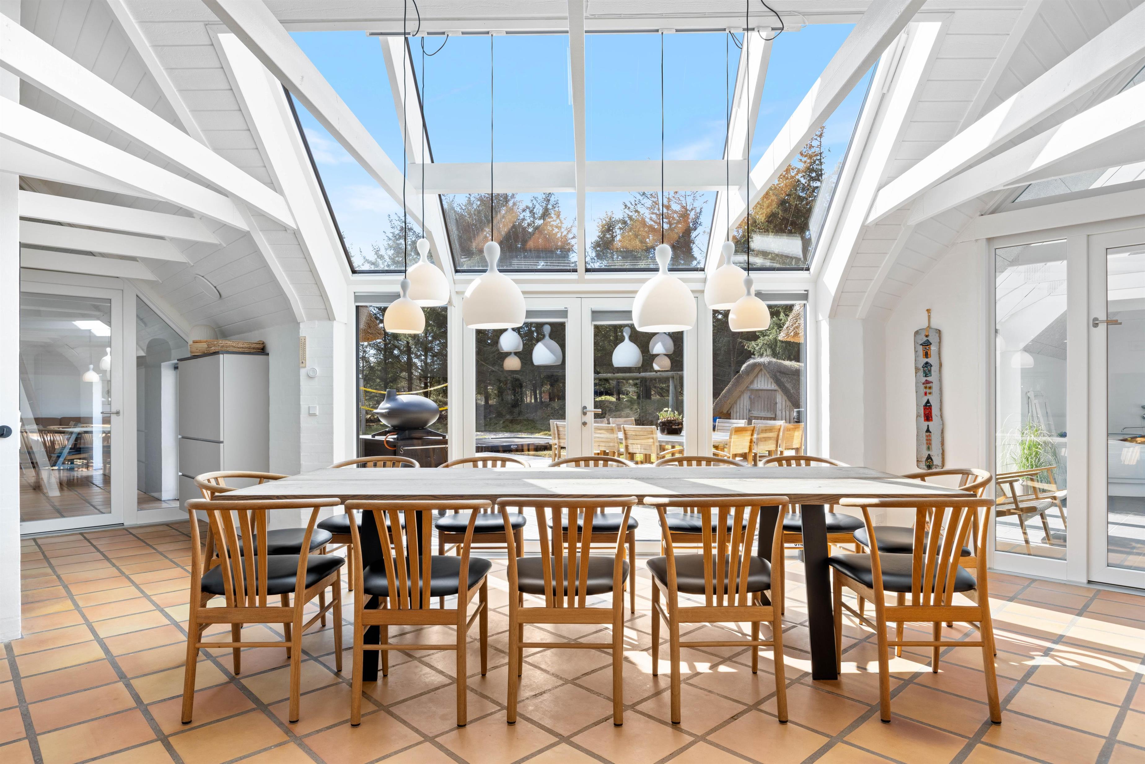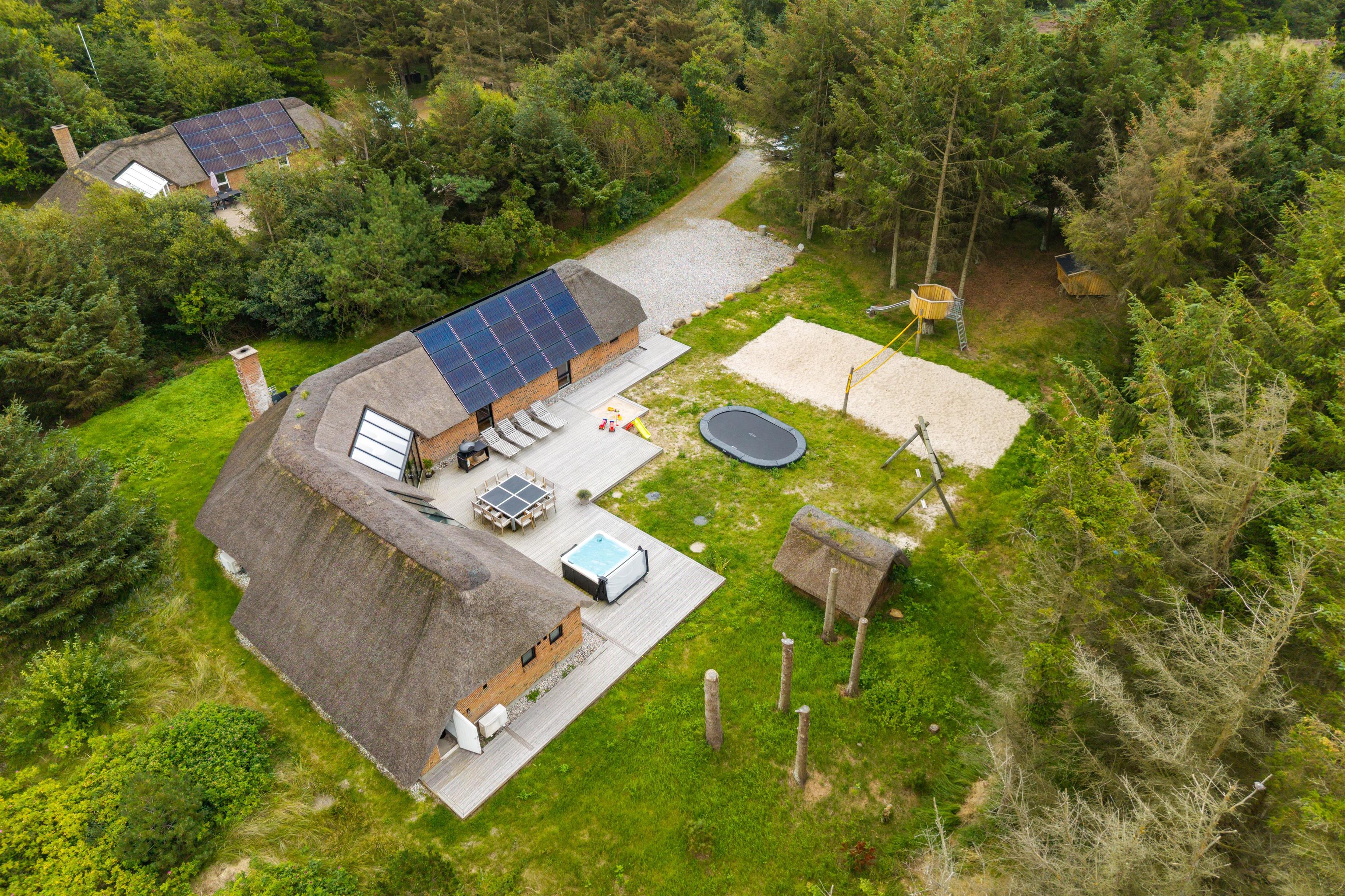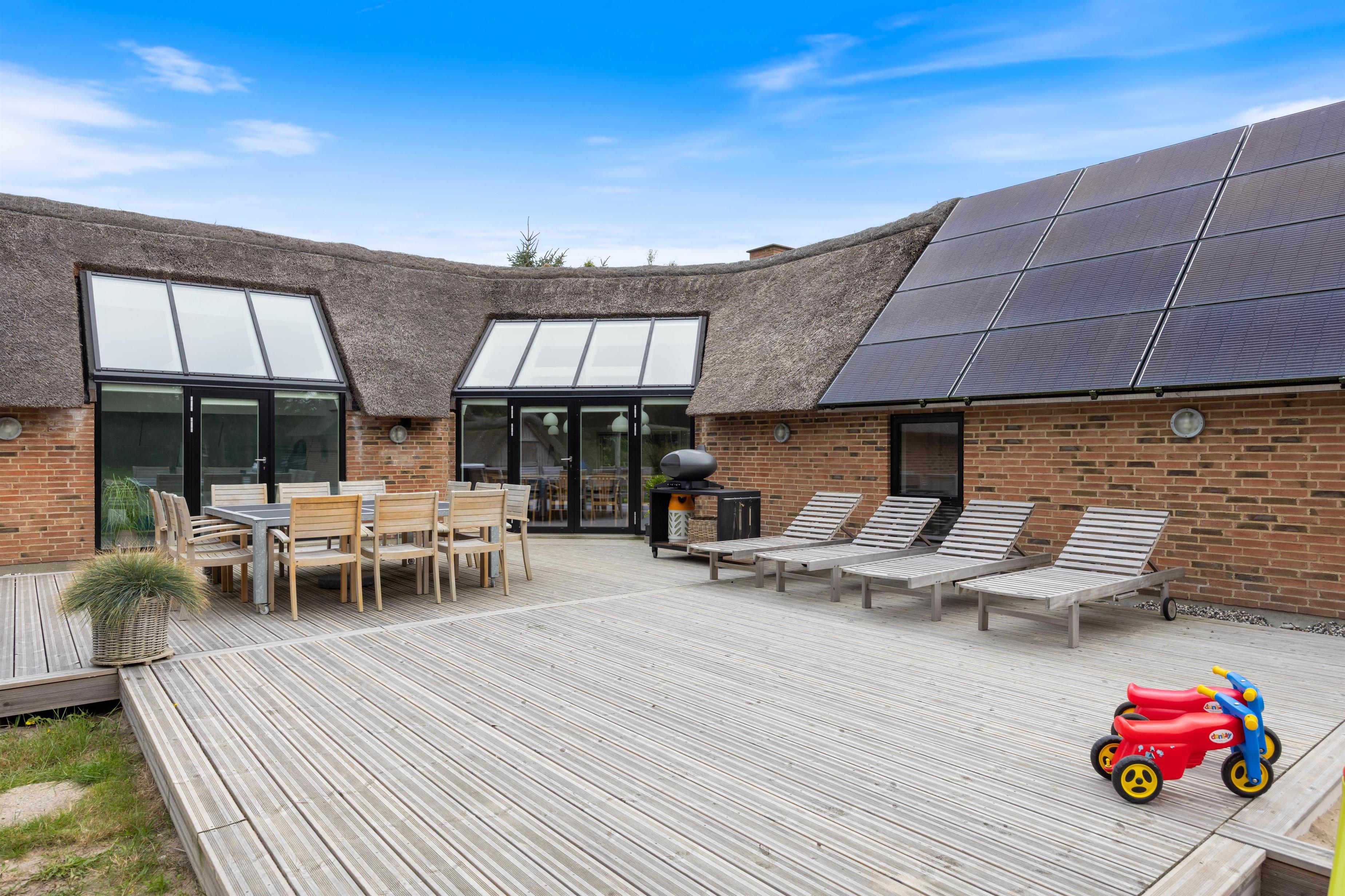 Velkommen til dette sommerhus på 220 kvadratmeter, beliggende på en fredelig 2.500 kvadratmeter stor naturgrund for enden af en stille vej. Huset er stråtækt, totalrenoveret i 2024 og indrettet med alt, hvad I behøver til en uforglemmelig ferie. Her er der plads til op til 12 personer og 2 kæledyr, og I kan se frem til masser af komfort og afslapning. Med brændeovn, gode faciliteter og mulighed for opladning af elbil direkte ved huset er rammerne sat for en ferie, I sent vil glemme.
