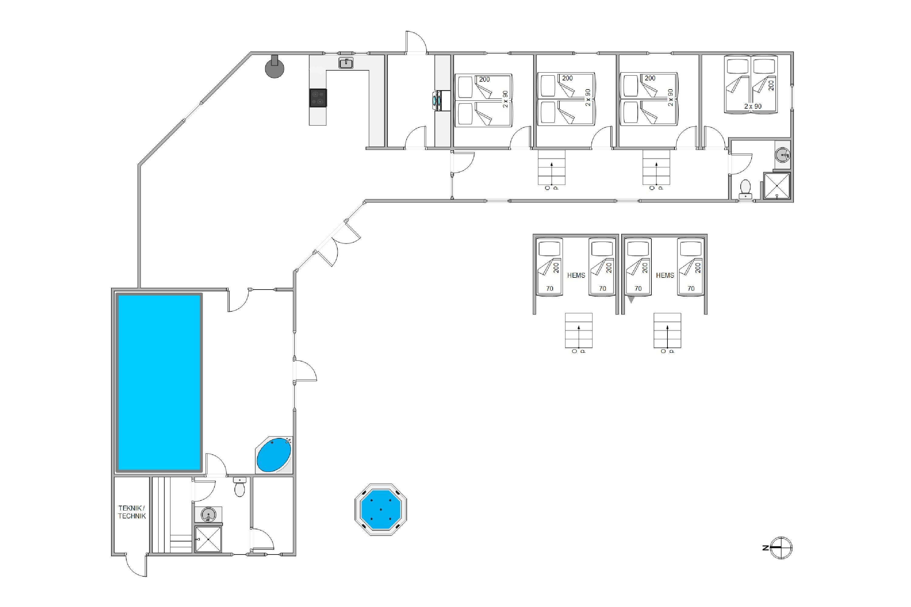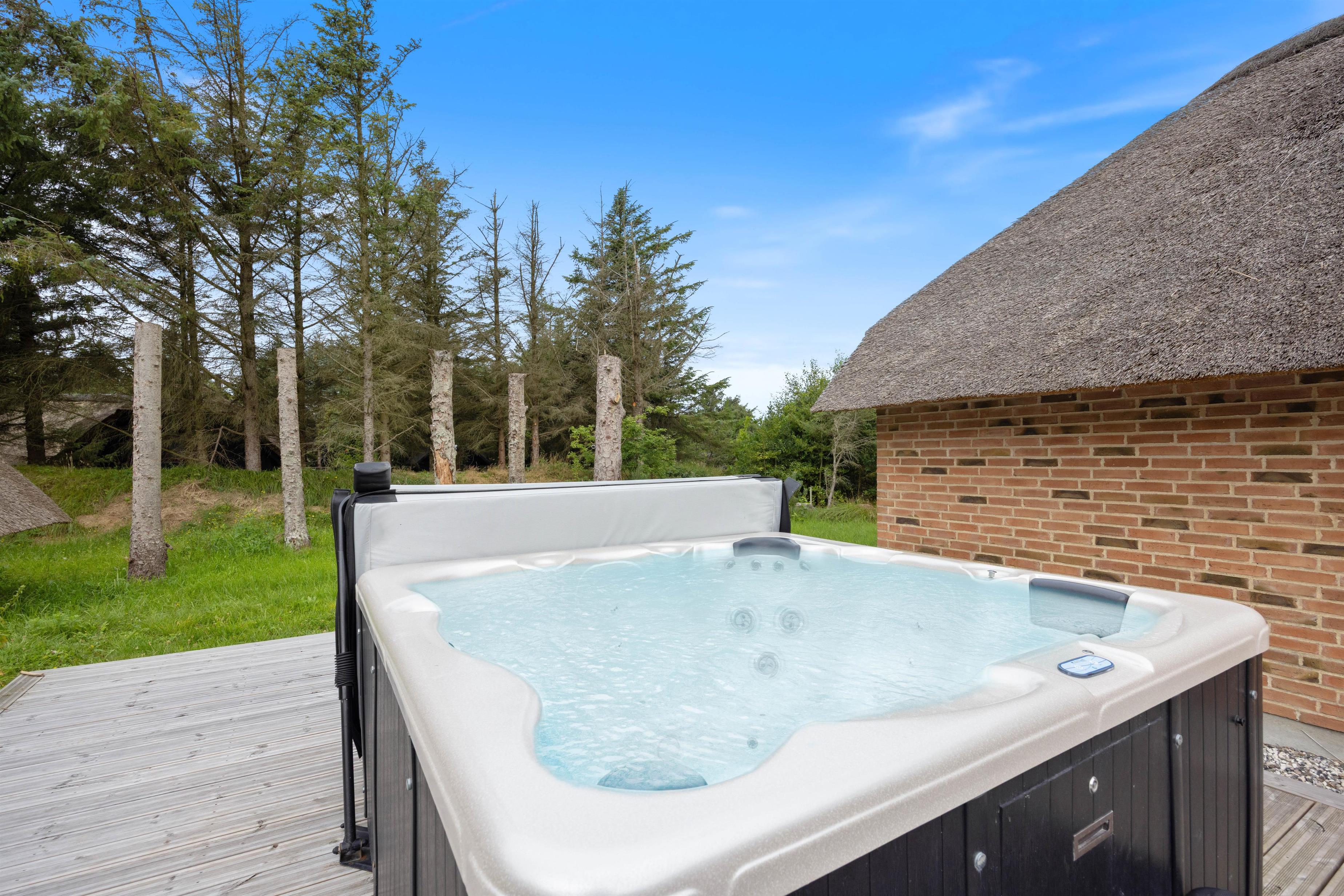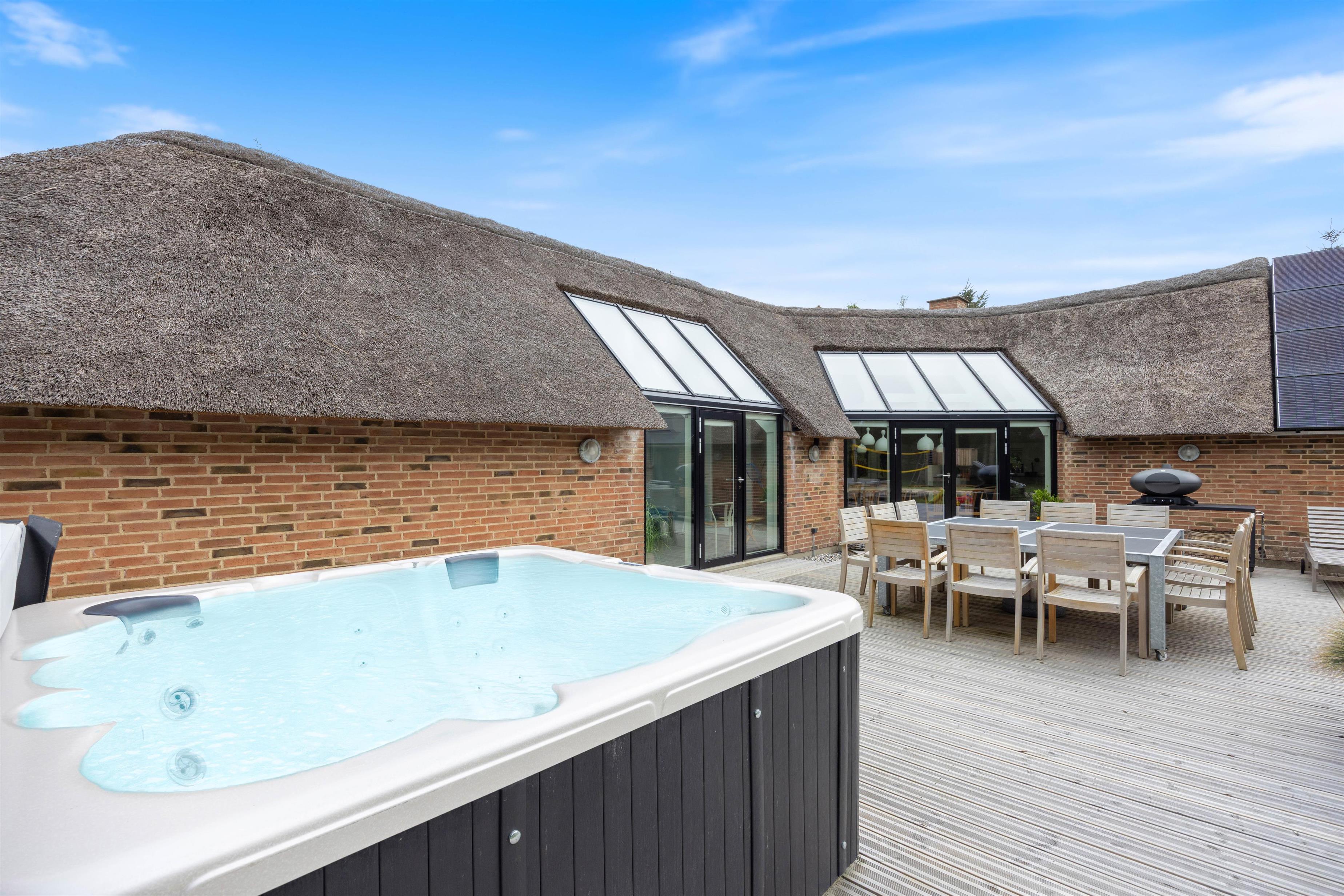 Sommerhusets store højdepunkt er den 18 kvadratmeter saltvandspool med modstrømsanlæg og energivenlig varmepumpe, som holder strømforbruget nede og vandtemperaturen behagelig året rundt. Vandkvaliteten overvåges automatisk døgnet rundt, så forholdene altid er optimale.