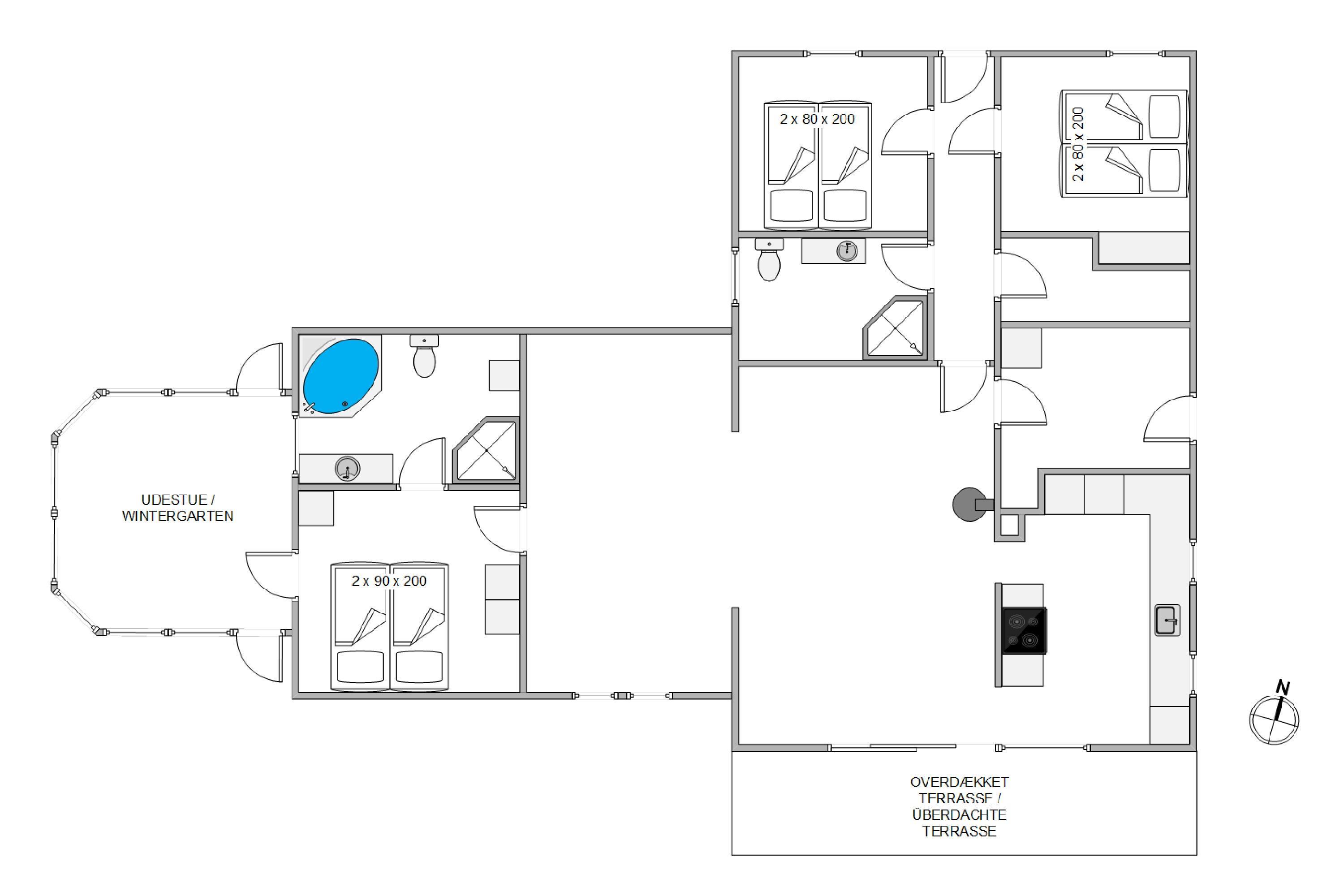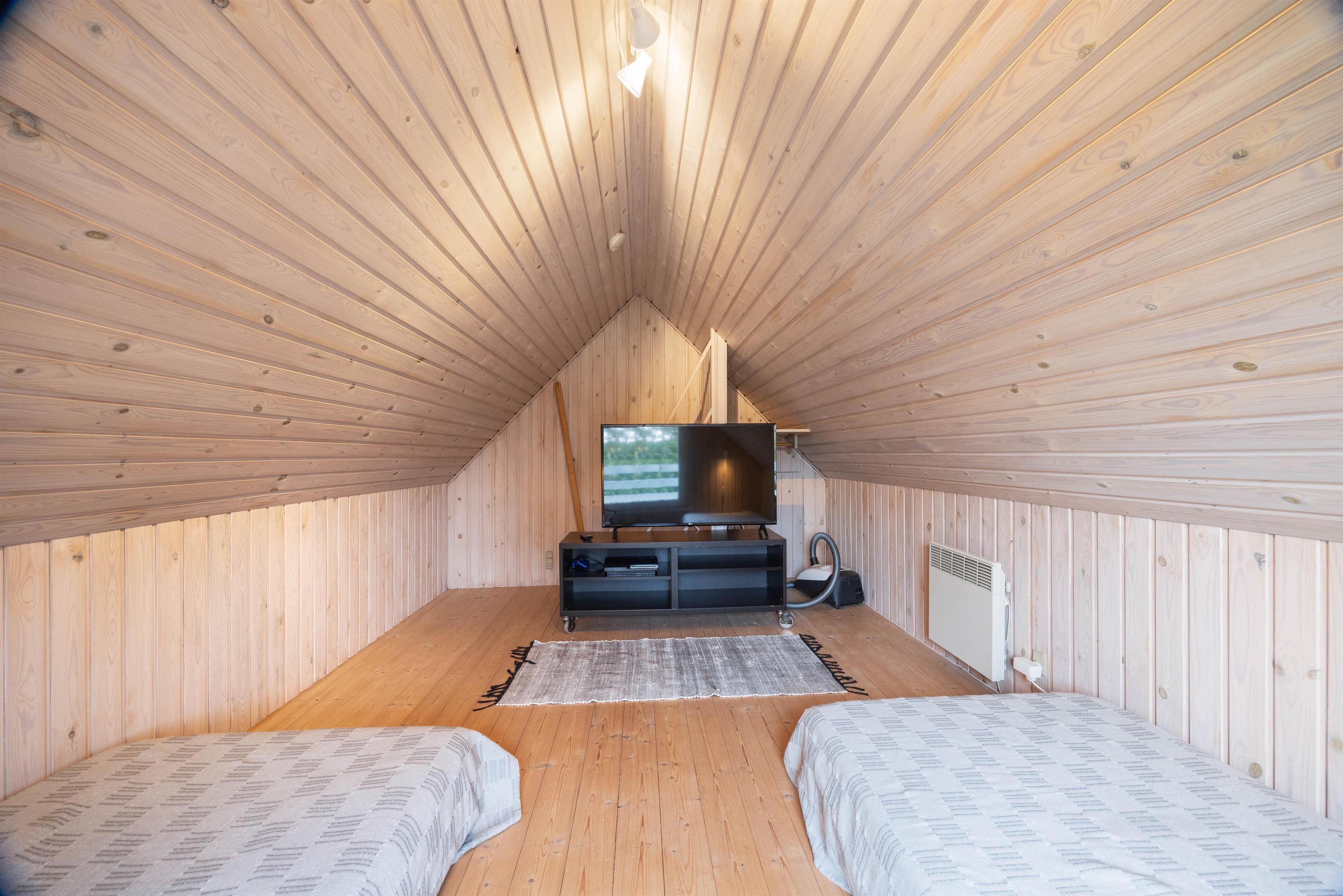 Feriehuset har tre soveværelser, hvor man kan slappe af efter en lang dag i den friske Vesterhavsluft. To badeværelser sørger for, at ingen behøver at stå i kø om morgenen. Sommerhuset er endvidere også udstyret med en miljøvenlig luft-til-vand varmepumpe, der sikrer en effektiv og yderst energivenlig opvarmning af hele sommerhuset. Skulle I være også være så uheldige og spilde noget på jeres tøj, er der en vaskemaskine til rådighed.
