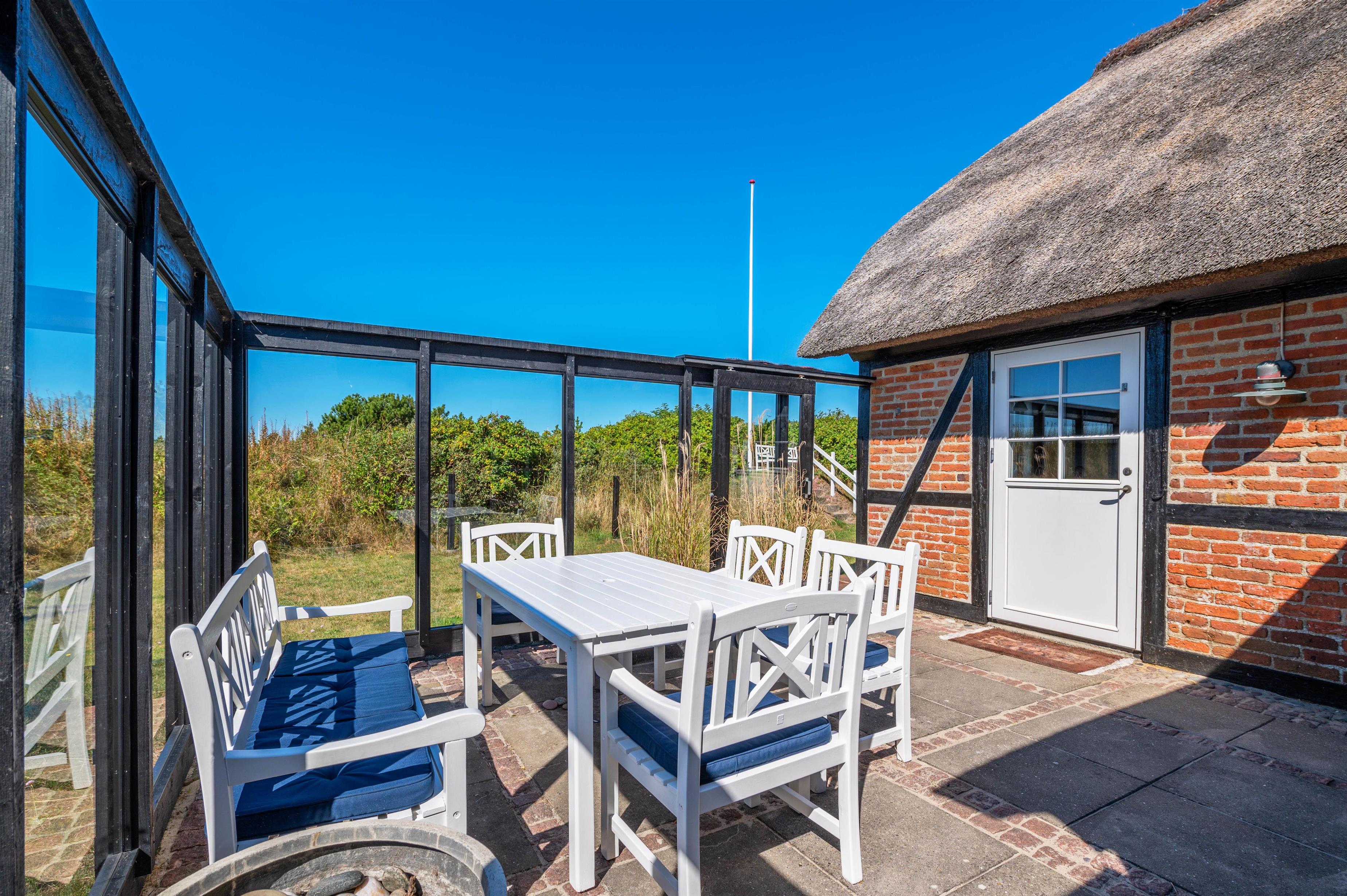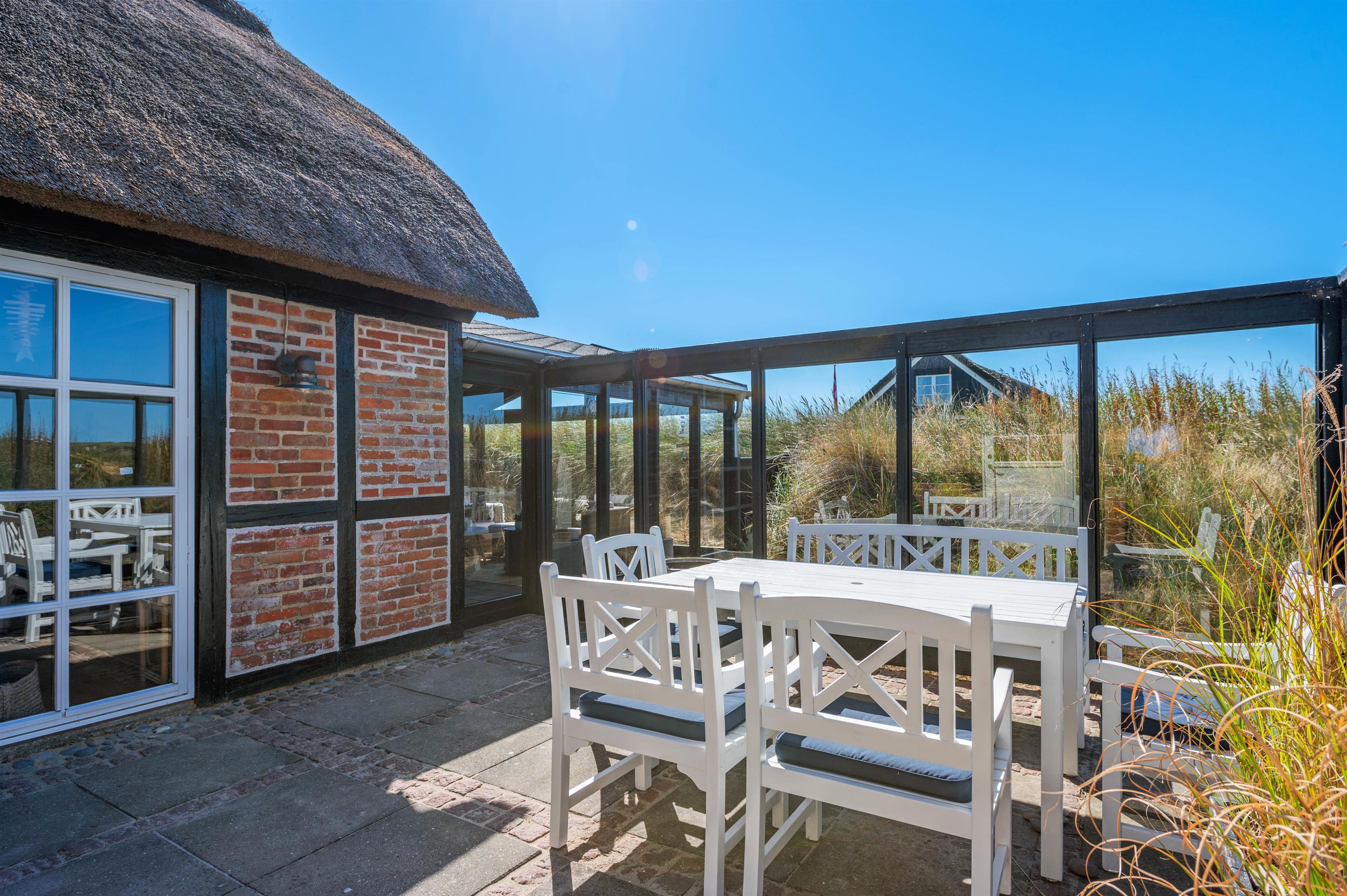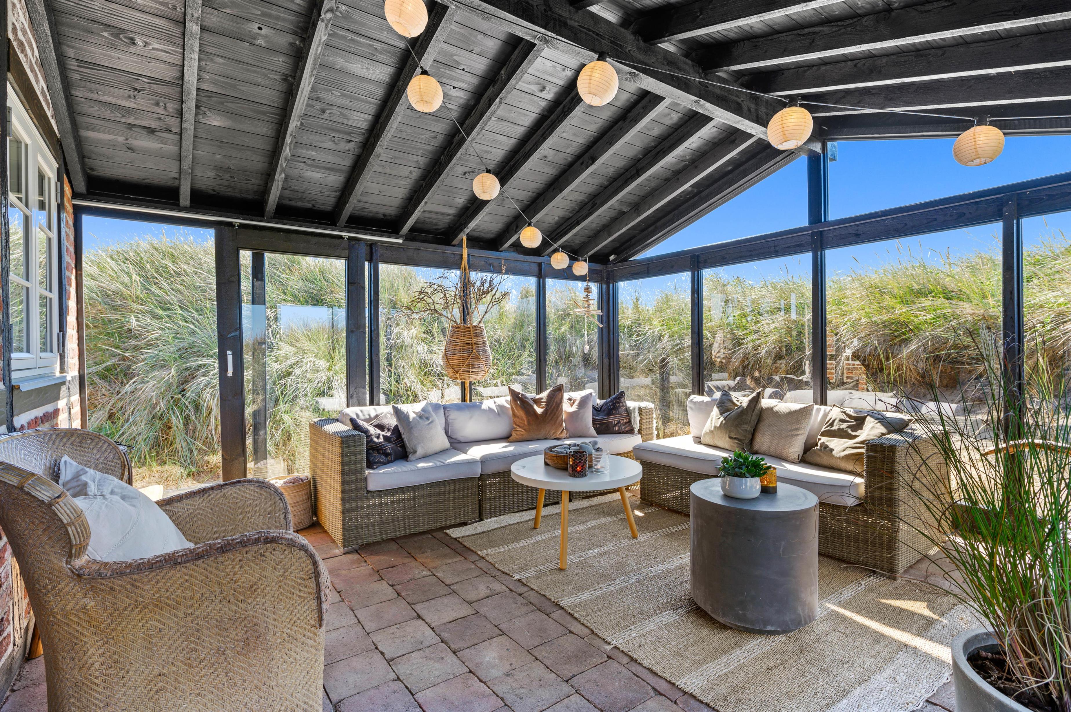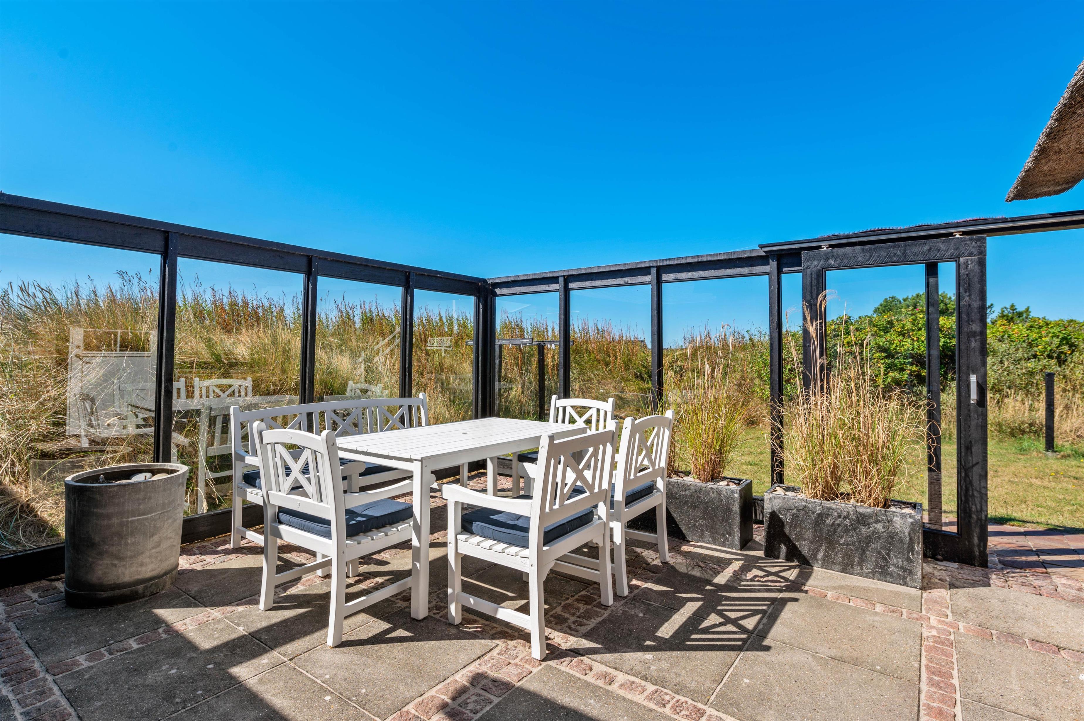 Rund om feriehuset har I en skøn grund med masser af plads og blandt andet et stort separat redskabsrum. Helt fantastisk er husets syd-vest-terrasse. Da terrassen er omgivet af glasvægge, der åbner for et fint udsyn og lukker sol og lys ind, har I her altid dejlig læ for vinden, der af og til godt kan bide lidt herude ved Vesterhavet. I den skønne udestue finder I også en terrassevarmer, der hjælper jer med at holde varmen i de kolde årstider.