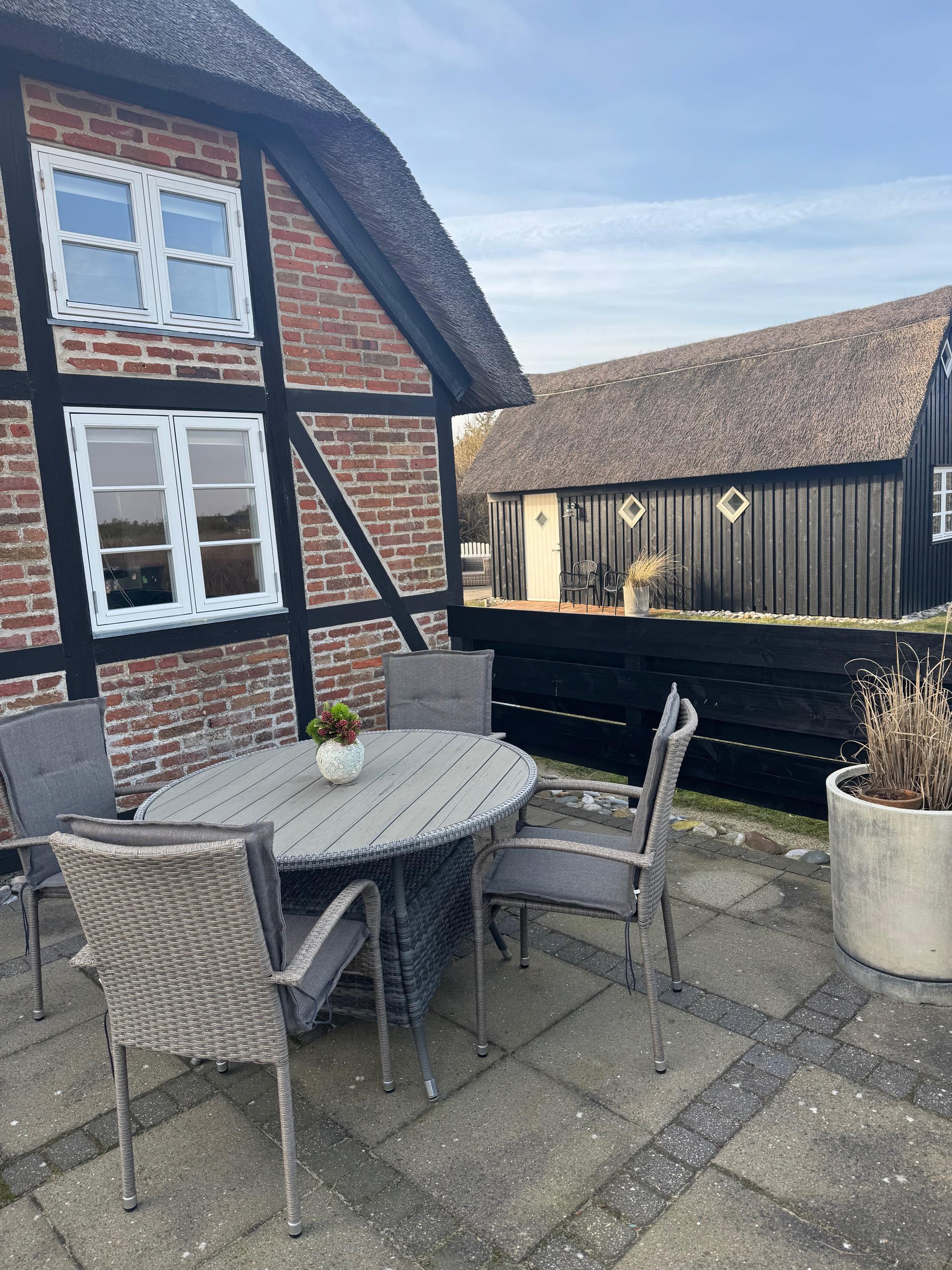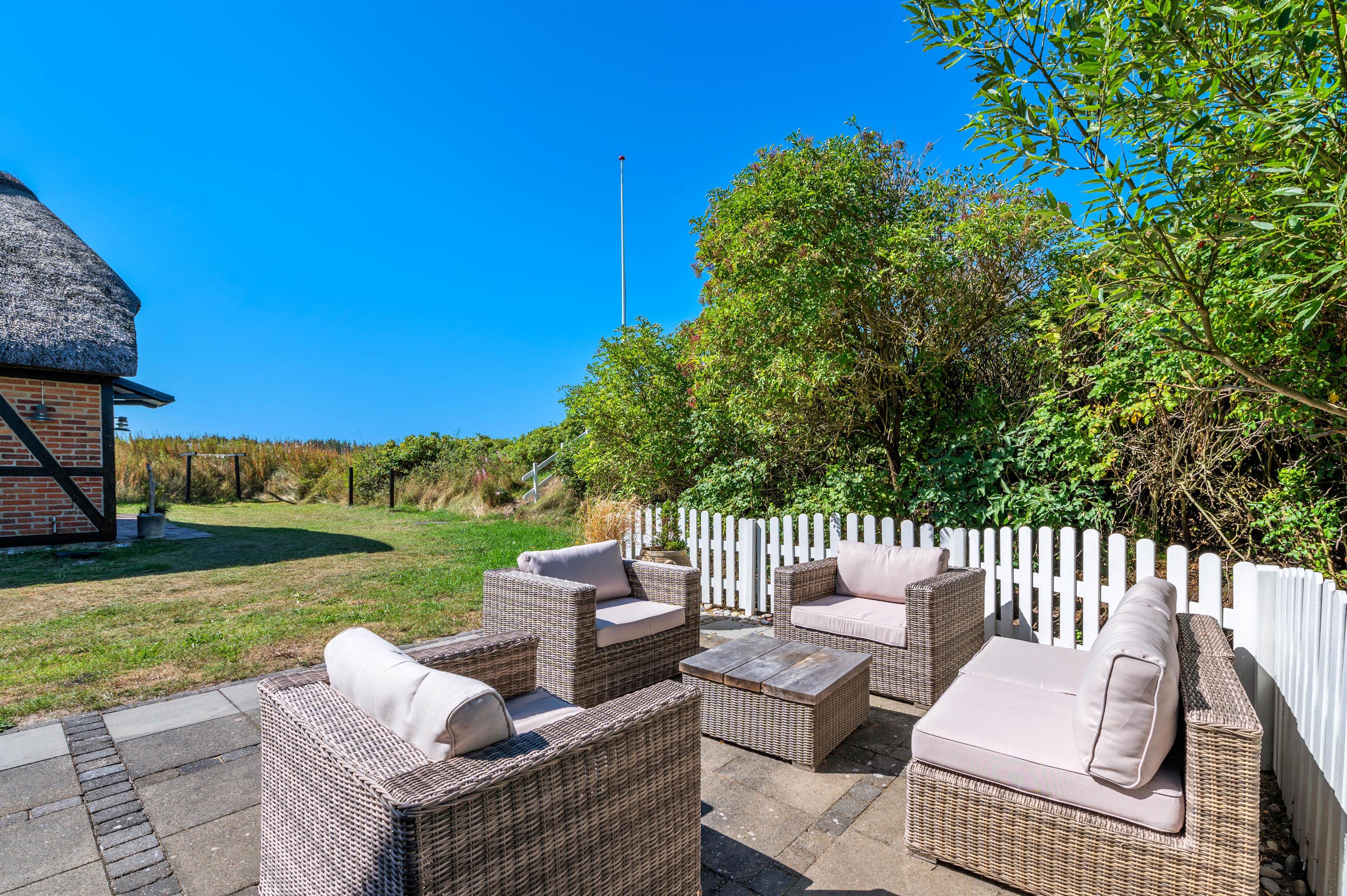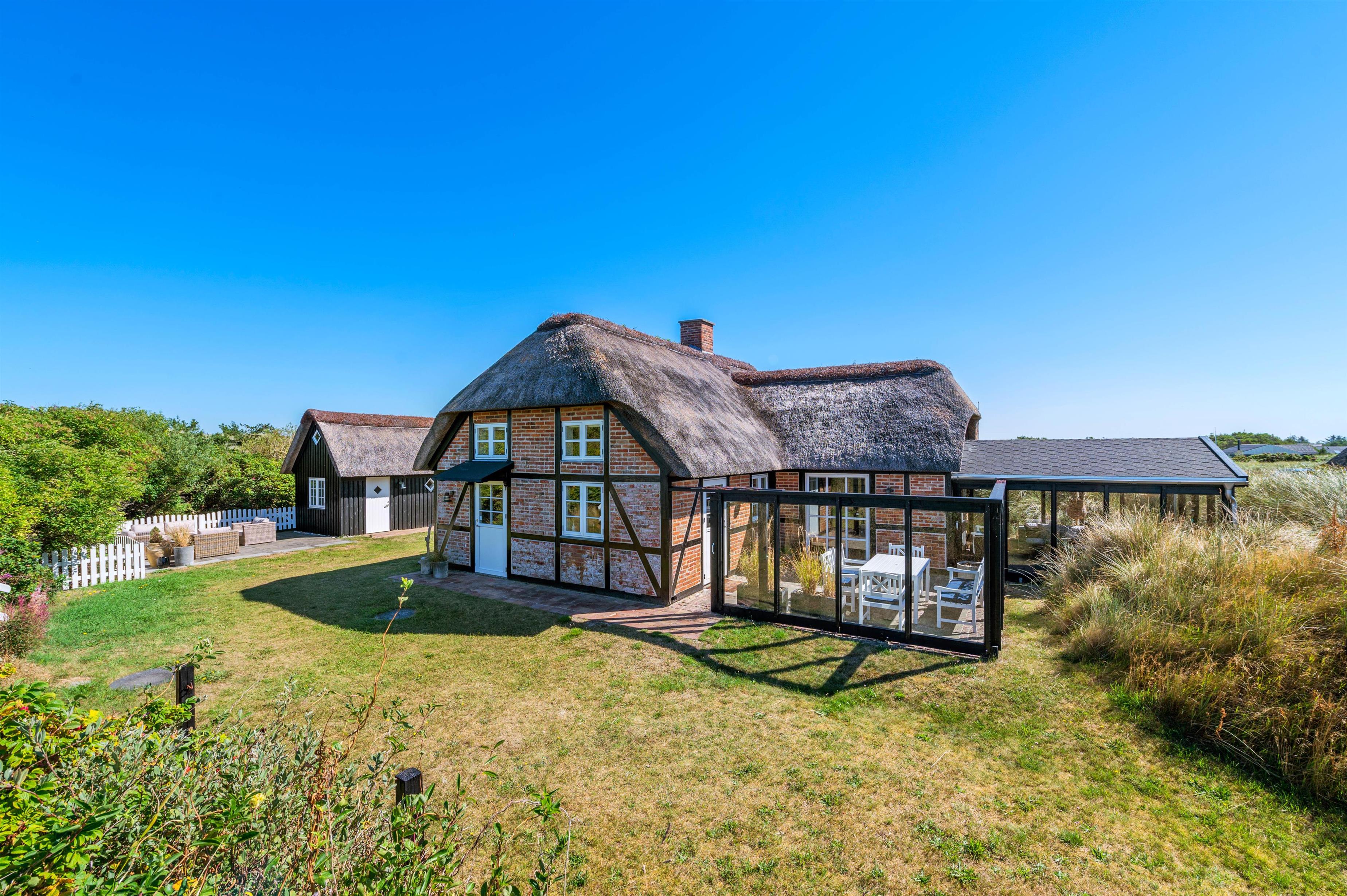 Rund om feriehuset har I en skøn grund med masser af plads og blandt andet et stort separat redskabsrum. Helt fantastisk er husets syd-vest-terrasse. Da terrassen er omgivet af glasvægge, der åbner for et fint udsyn og lukker sol og lys ind, har I her altid dejlig læ for vinden, der af og til godt kan bide lidt herude ved Vesterhavet. I den skønne udestue finder I også en terrassevarmer, der hjælper jer med at holde varmen i de kolde årstider.