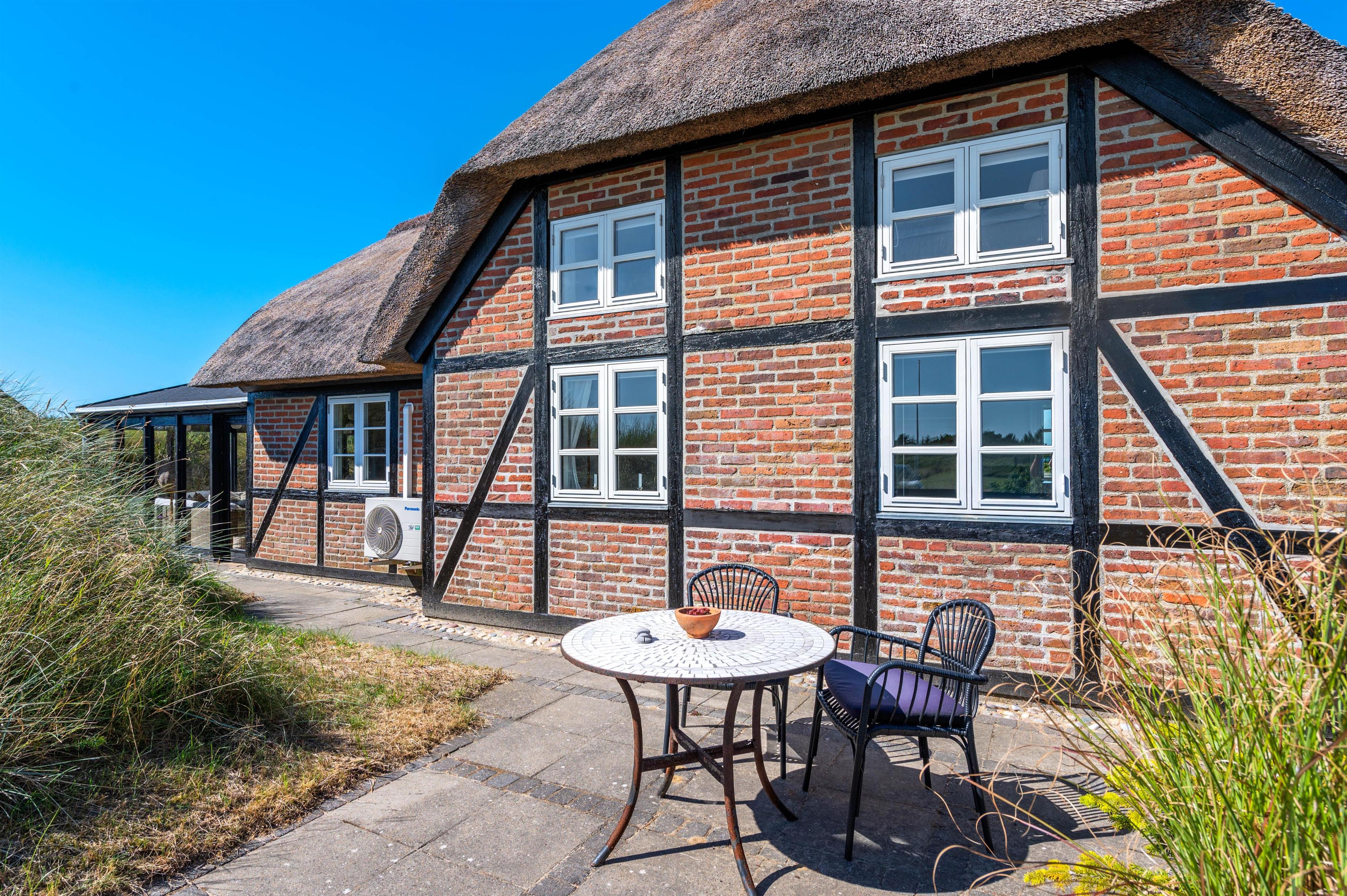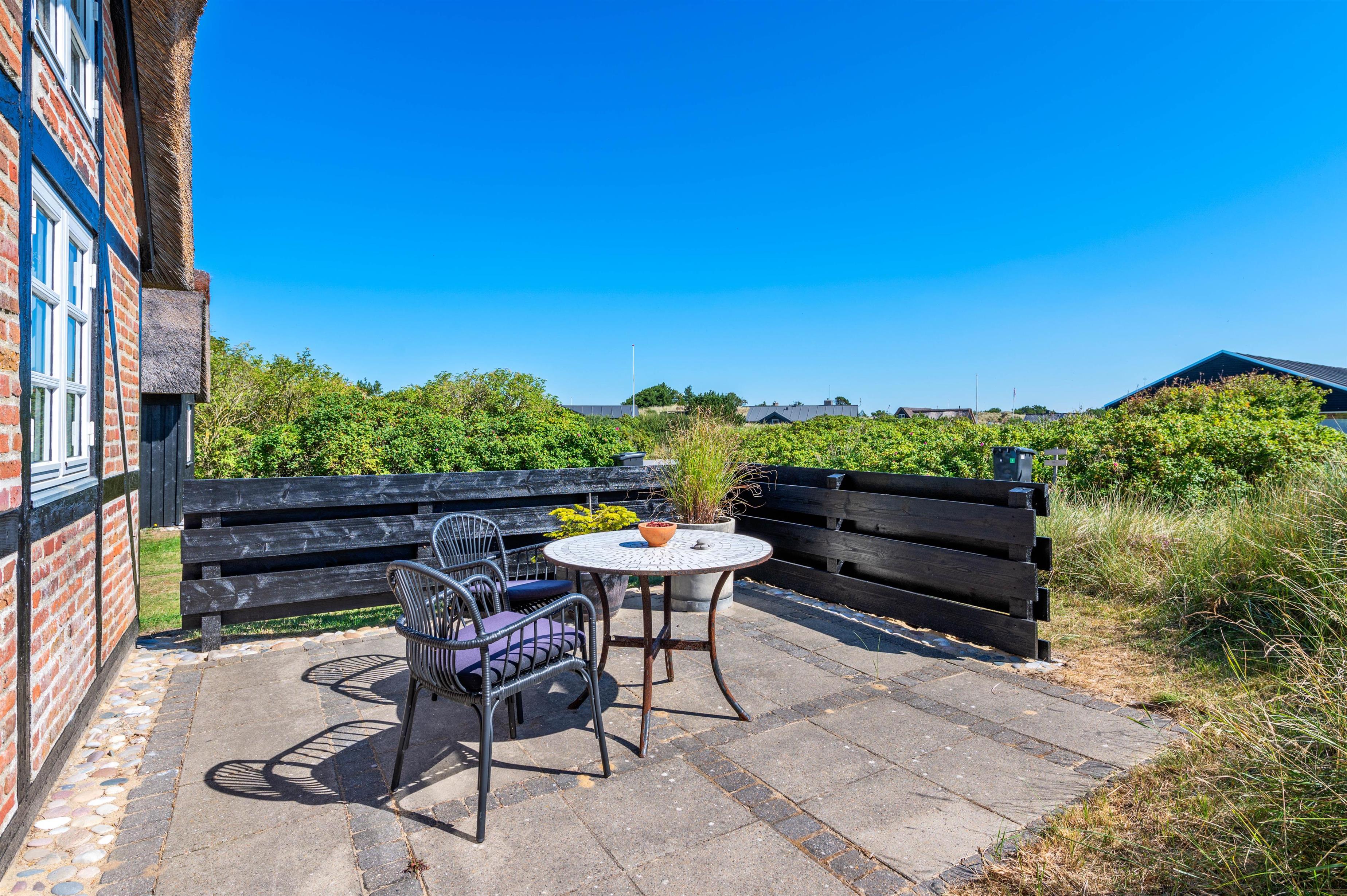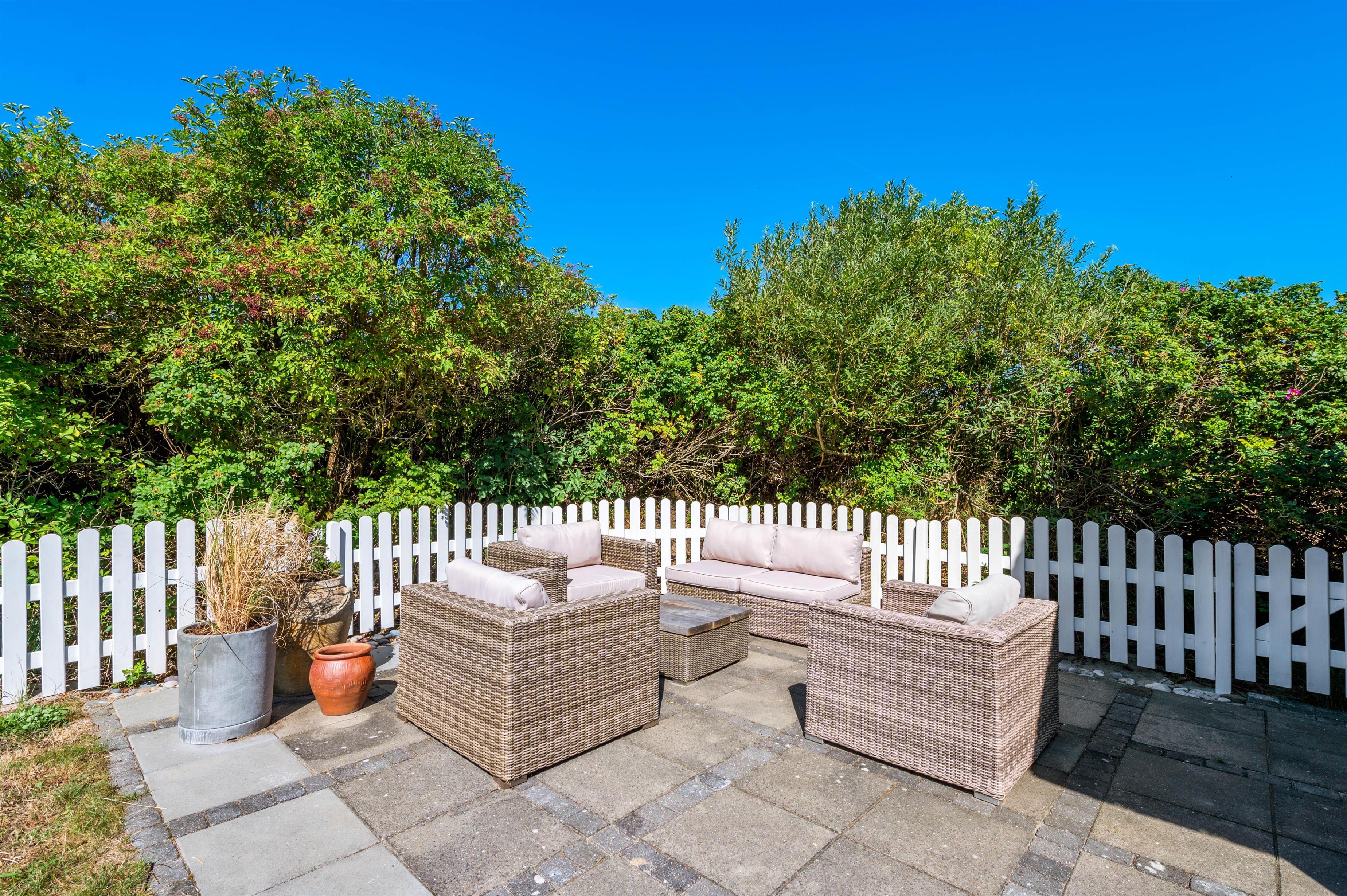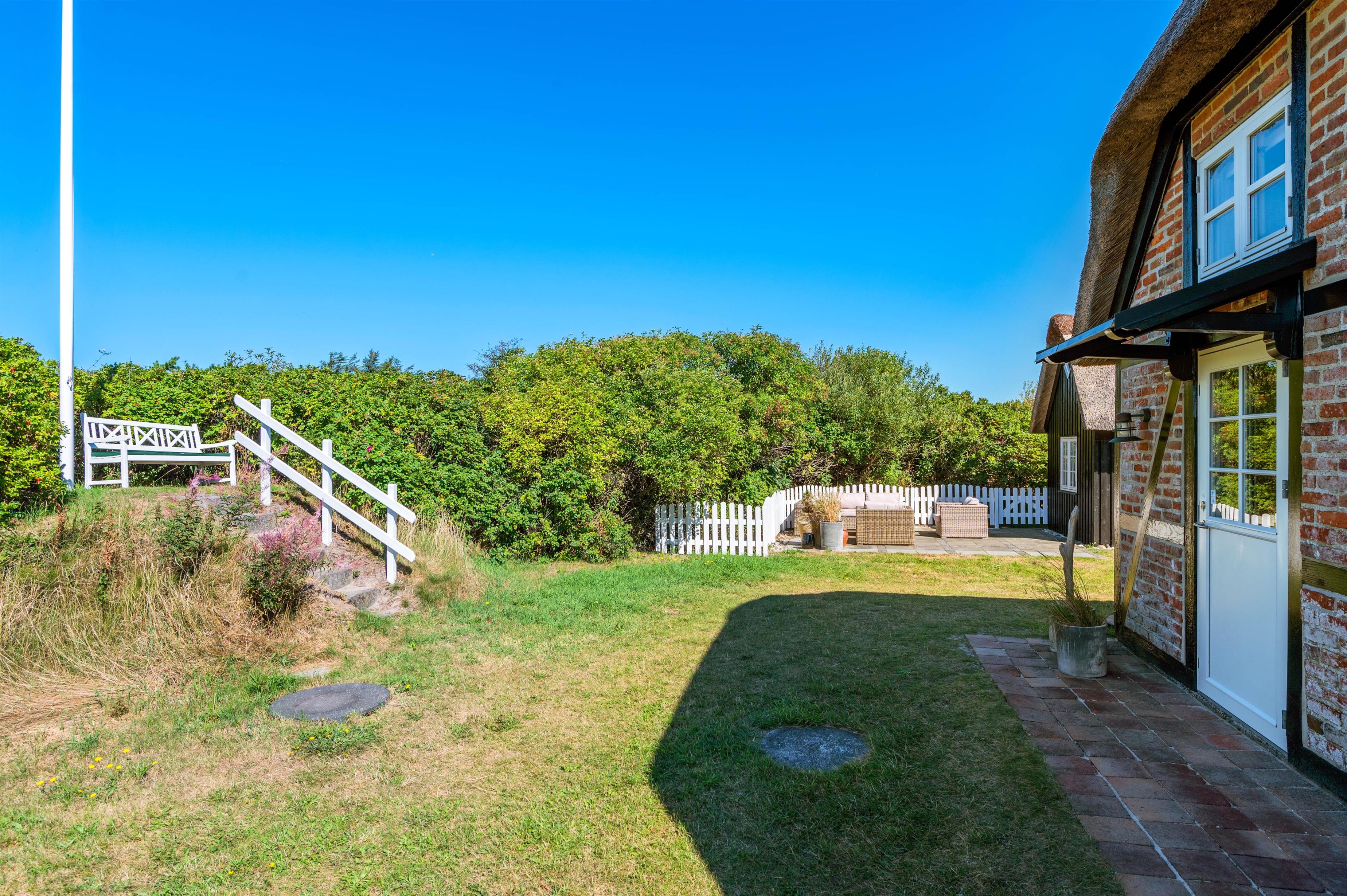 Rund om feriehuset har I en skøn grund med masser af plads og blandt andet et stort separat redskabsrum. Helt fantastisk er husets syd-vest-terrasse. Da terrassen er omgivet af glasvægge, der åbner for et fint udsyn og lukker sol og lys ind, har I her altid dejlig læ for vinden, der af og til godt kan bide lidt herude ved Vesterhavet. I den skønne udestue finder I også en terrassevarmer, der hjælper jer med at holde varmen i de kolde årstider.