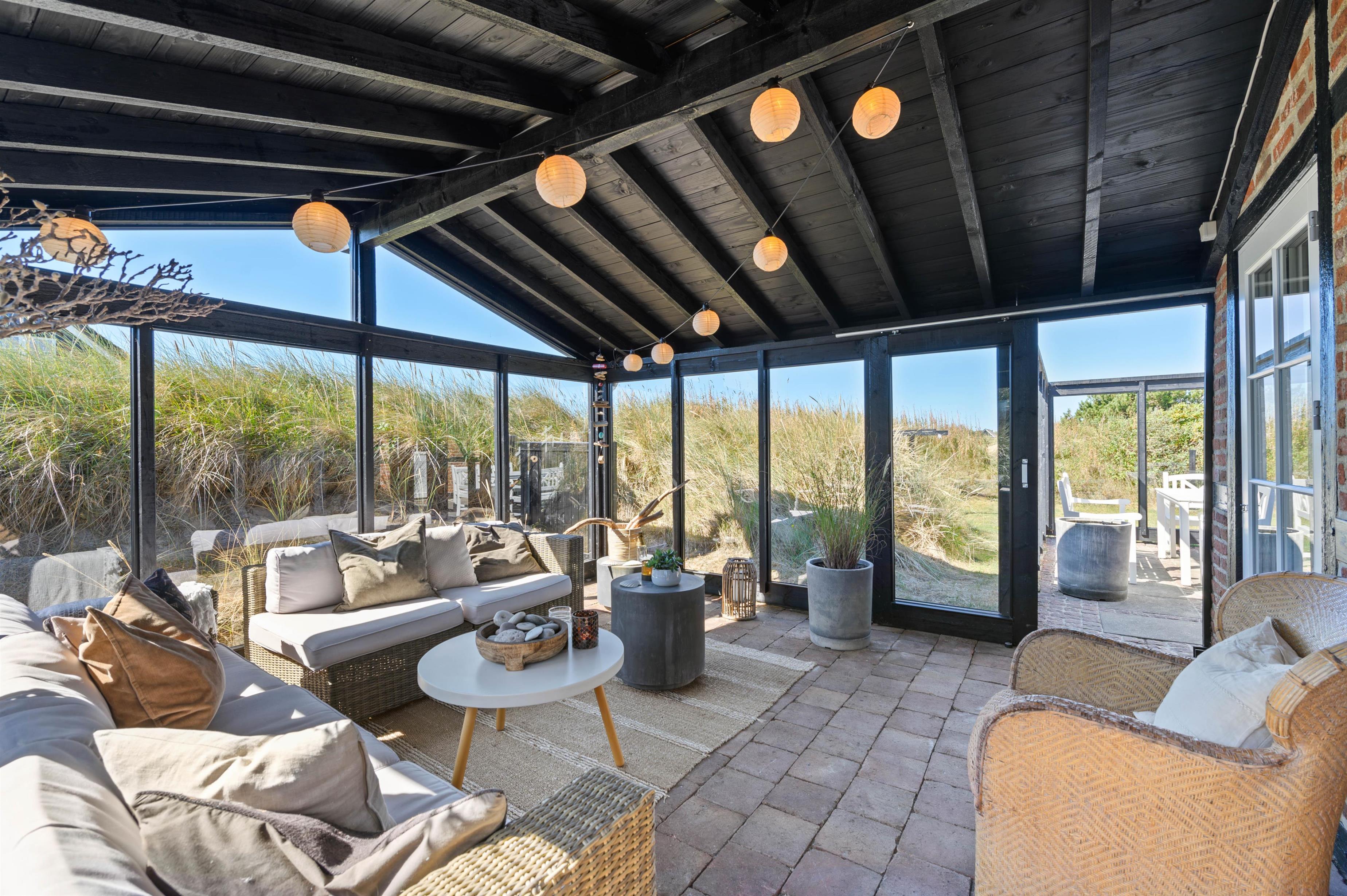 Fra husets opholdsstue er der direkte udgang til den skønne nyetablerede udestue. Her er virkelig dømt hyggestemning med brændeovn og udsigt lige ud til klitterne. Her kan I tilbringe mange hyggelige feriestunder sammen mens I nyder flammerne i brændeovnen og klitlandskabet udenfor.