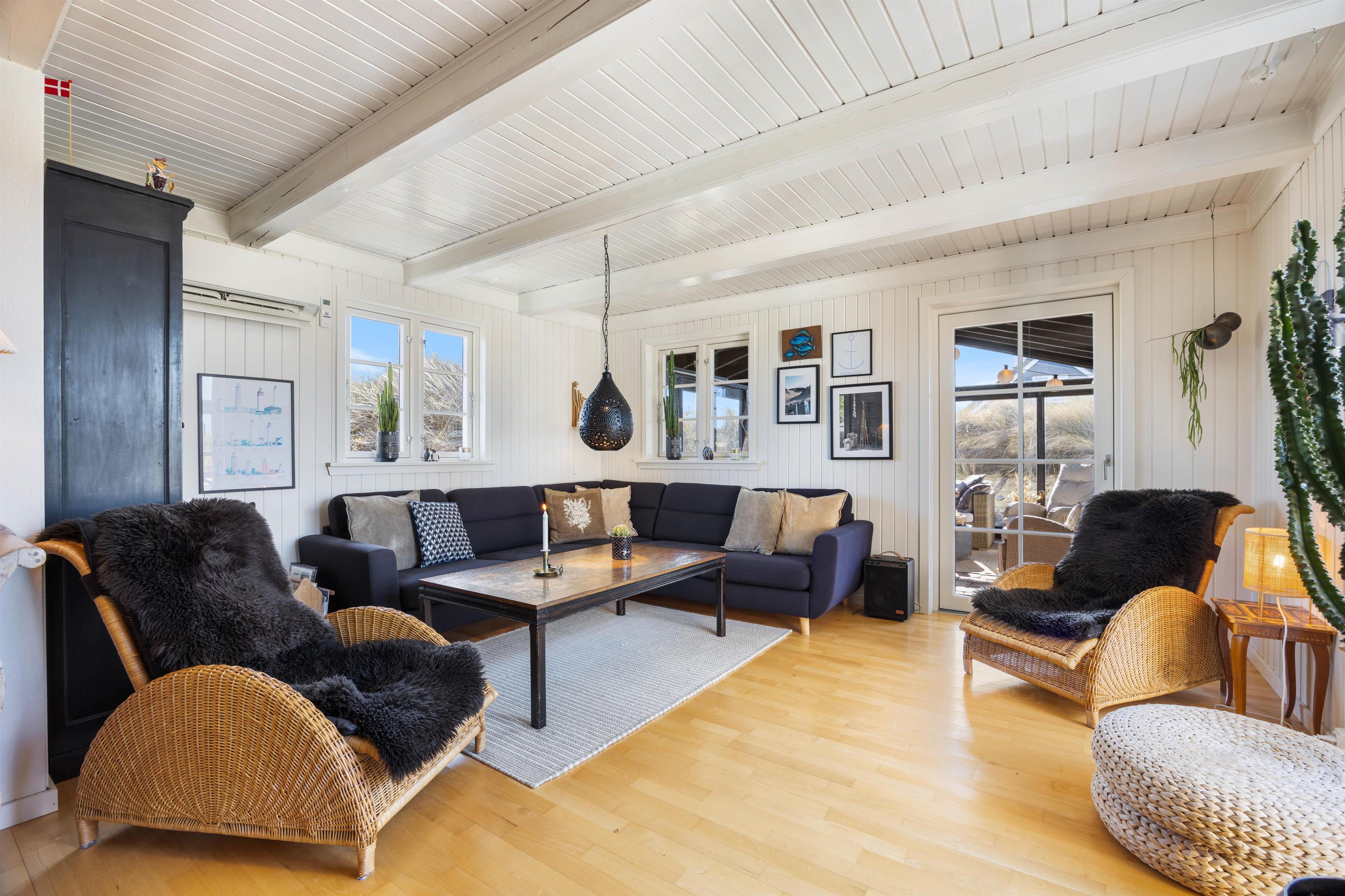Med 129m2 har I god plads i dette bindingsværkshus. Huset er smukt indrettet med en fin blanding af romantisk nostalgi og moderne med hvidmalede lofter og vægge og lyse møbler. En smuk indbygget kamin afrunder billedet og skaber en dejlig varm stemning. Foruden den herlige udestue med stengulv og udsigt til klitterne.