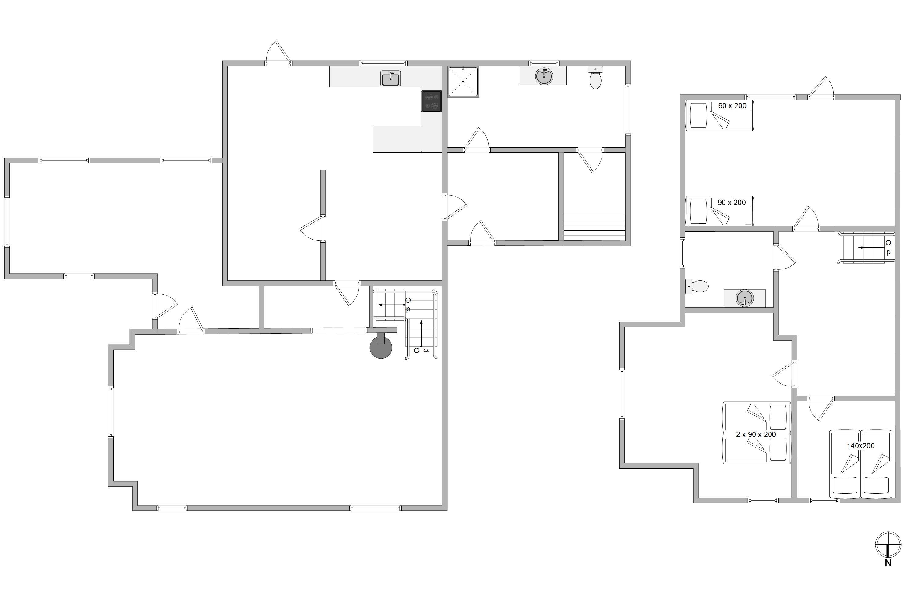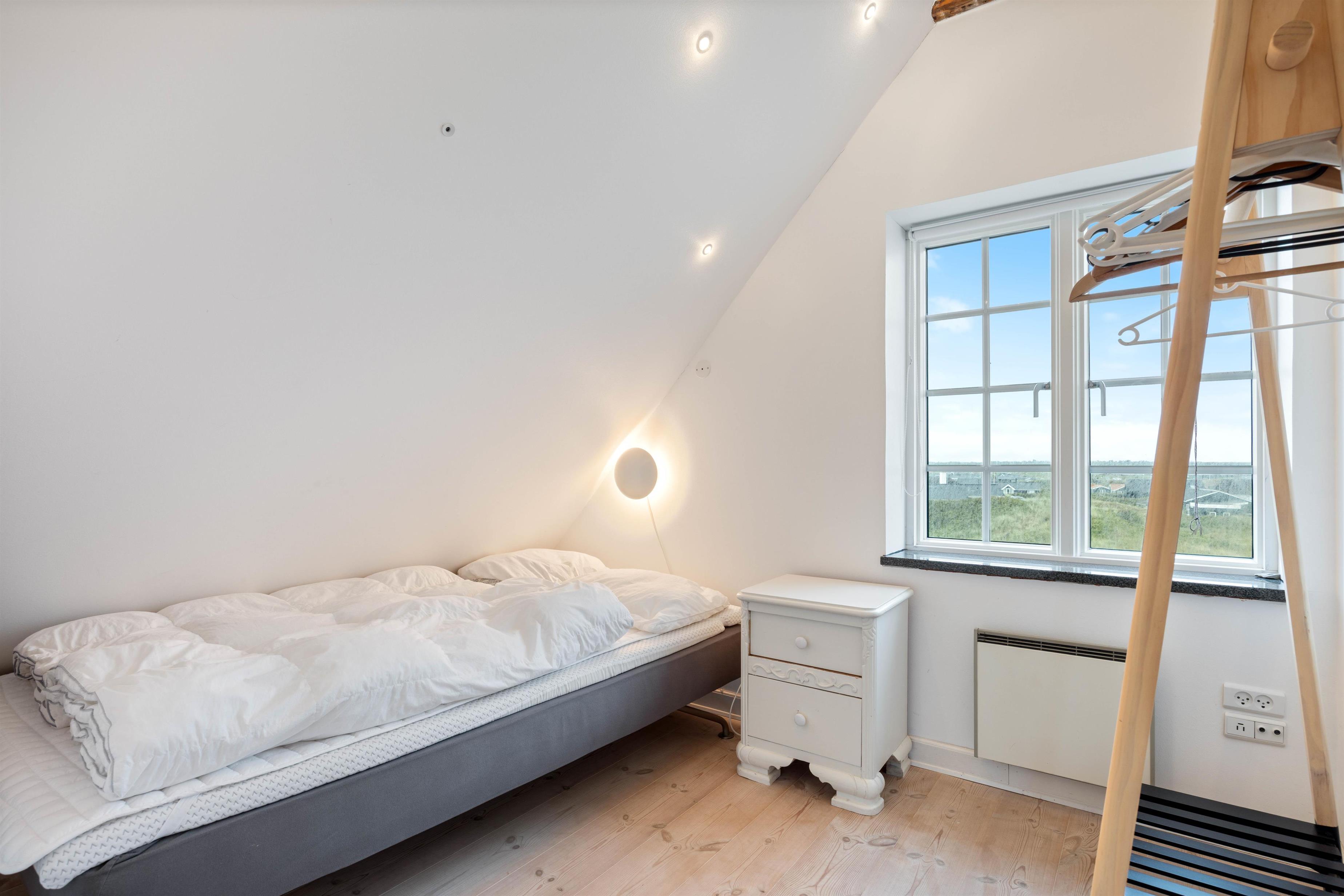 Dette utraditionelle og flotte feriehus i Søndervig har plads til 5 personer med soveværelser fordelt på to etager. Hver etage er udstyret med eget toilet, og på stueplanens badeværelse finder I også en dejlig sauna, hvor I kan varme jer efter en god udflugt til det fascinerende Vesterhav. Desuden er der 2 varmepumper i sommerhuset i både stue og køkken, derfor er feriehuset ekstra nemt og billigt at opvarme og den sørger dermed også for et behageligt indeklima. Derudover kan I også på de lidt køligere sommeraftener igen få varmen fra den hyggelige og varme brændeovn.