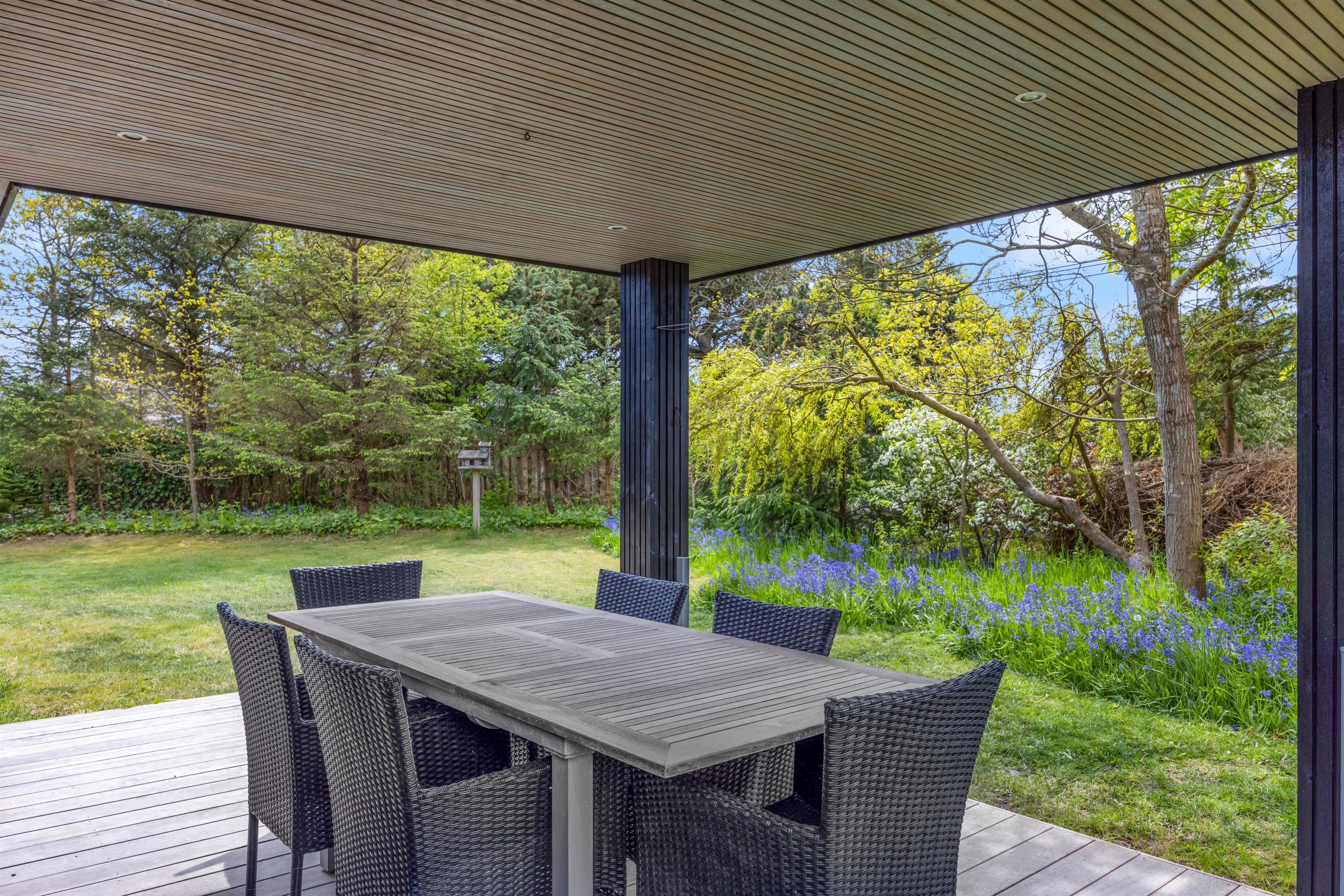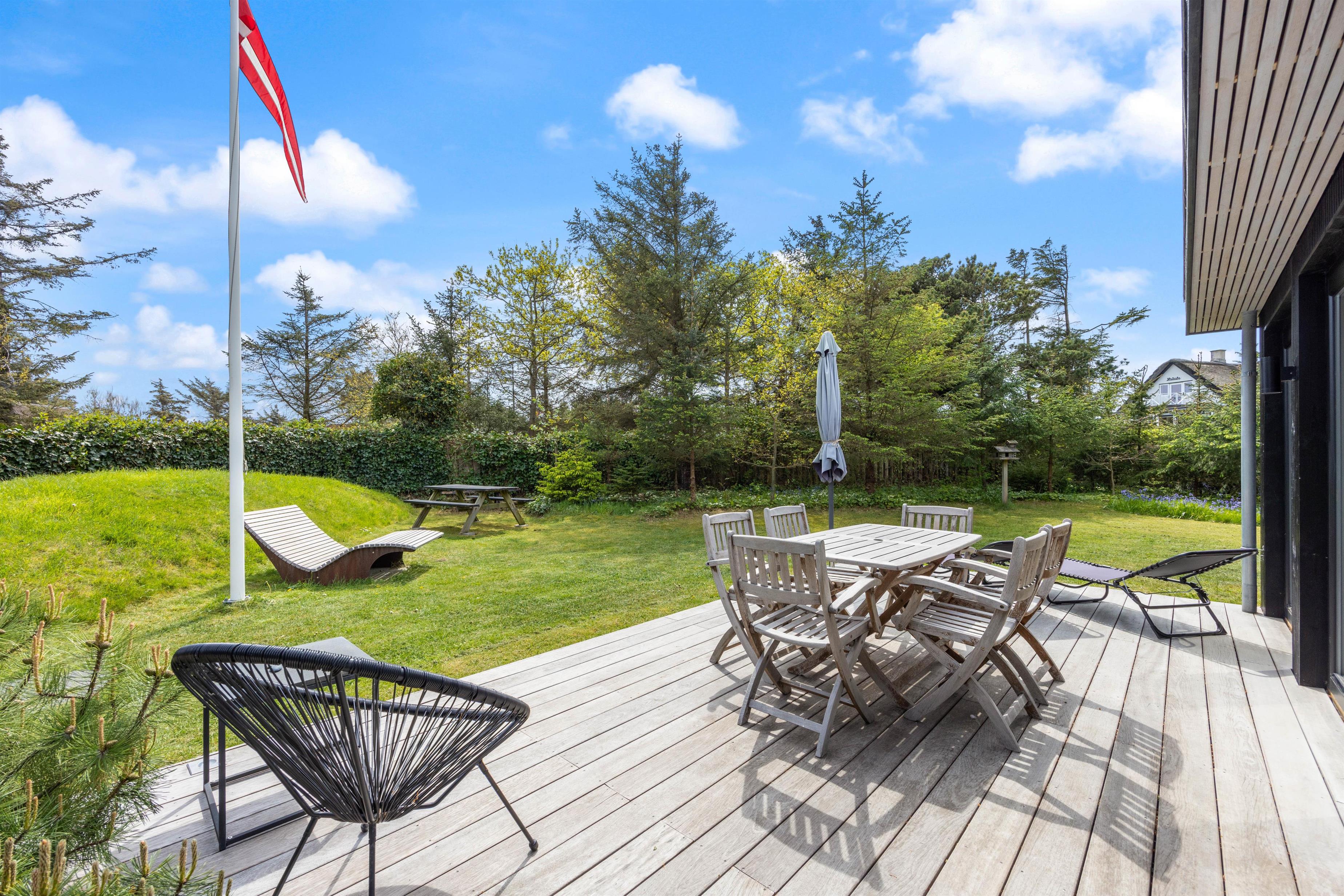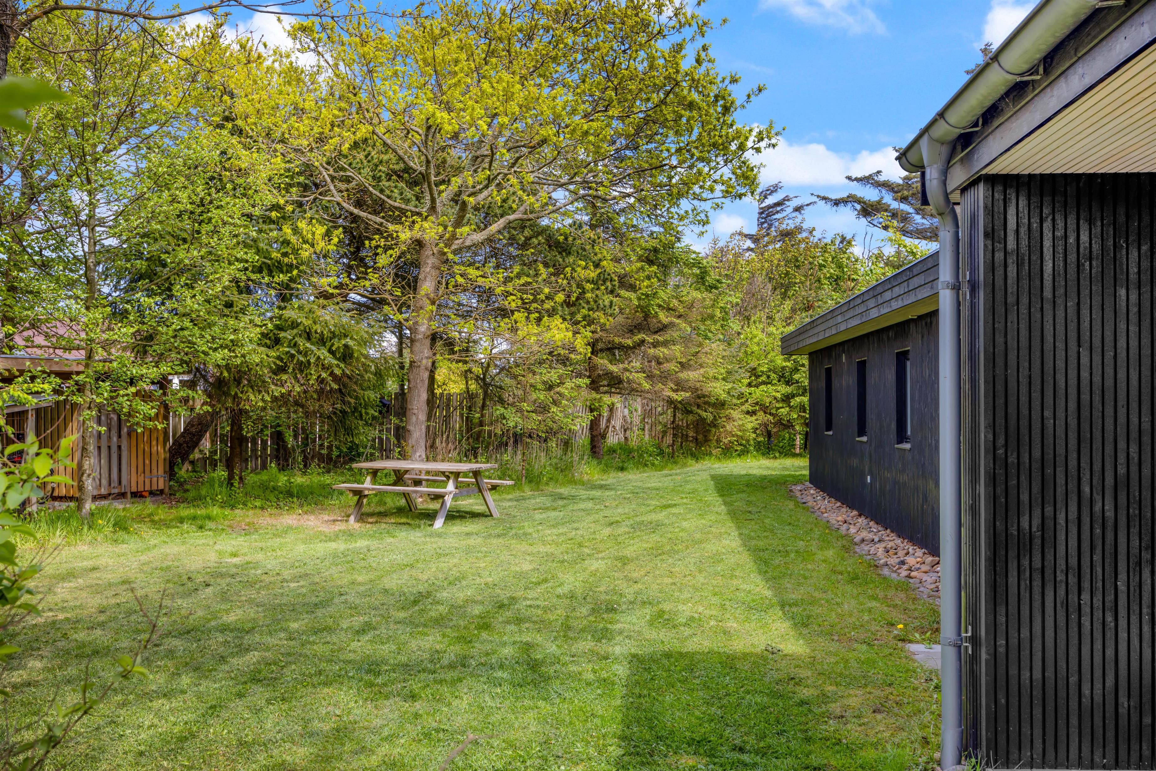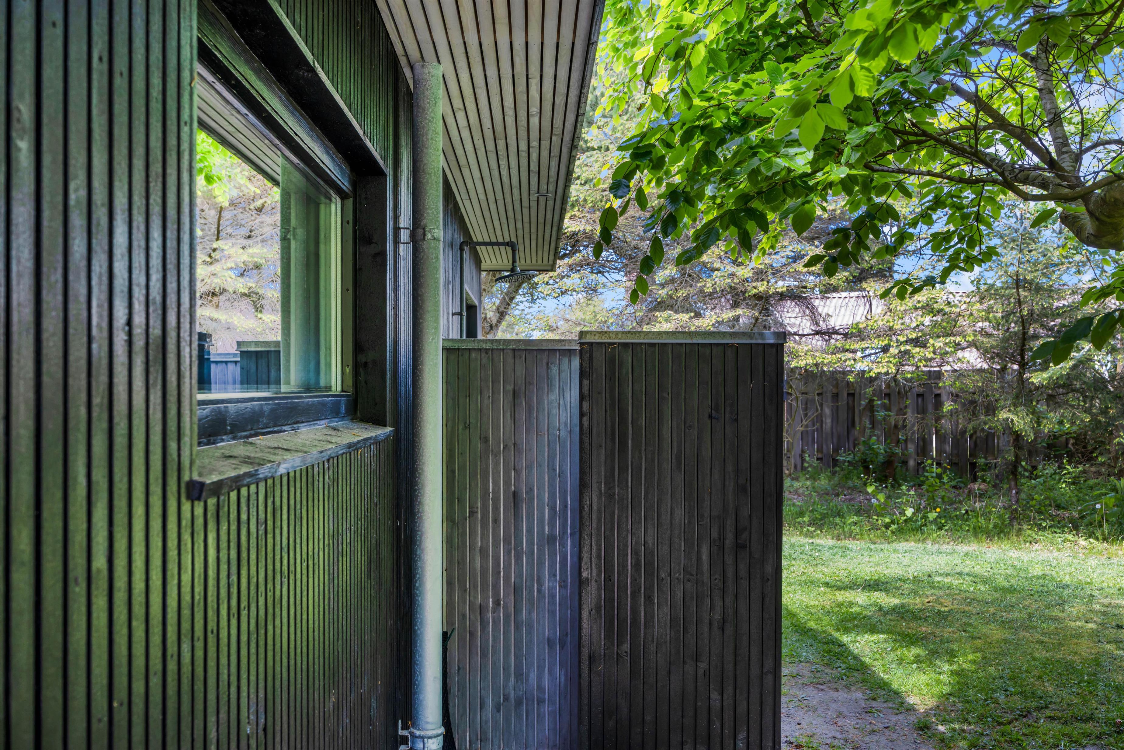 Feriehuset har en skøn, ugeneret beliggenhed omgivet af grøn natur og træer. Der er flere gode terrasser med liggestole og havemøbler, en stor indhegnet græsplæne til glæde for børnene samt en udendørs bruser, hvor I kan skylle fødderne efter en tur ved vandet. Udebruseren kan kun benyttes i perioden april til november.