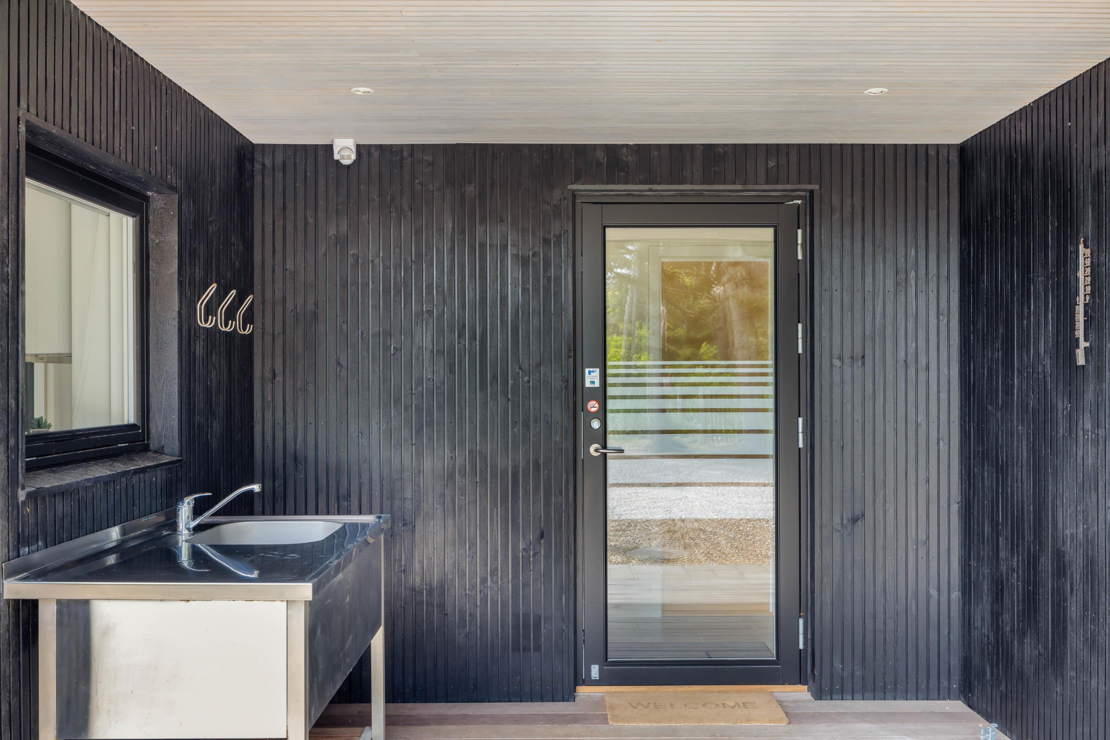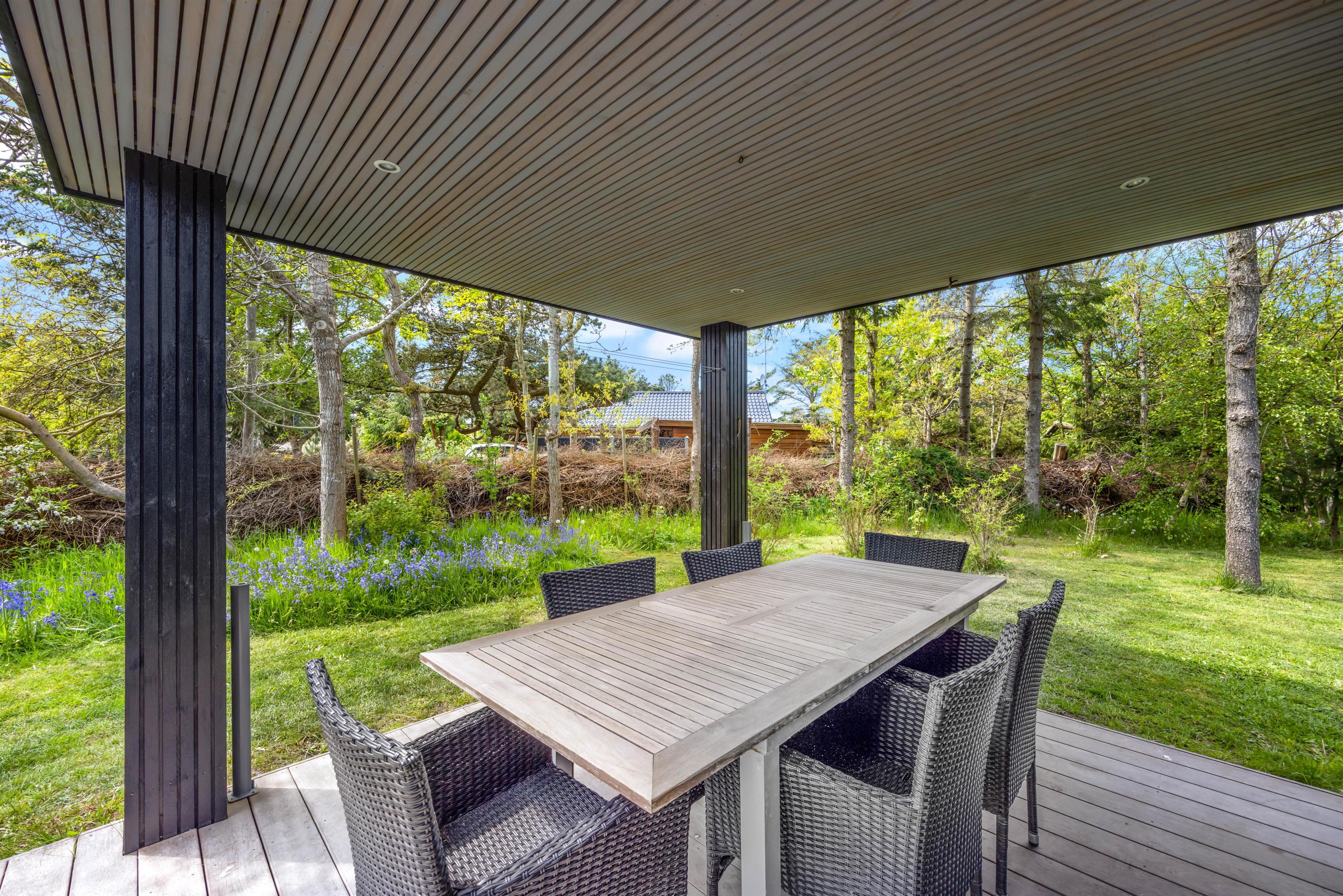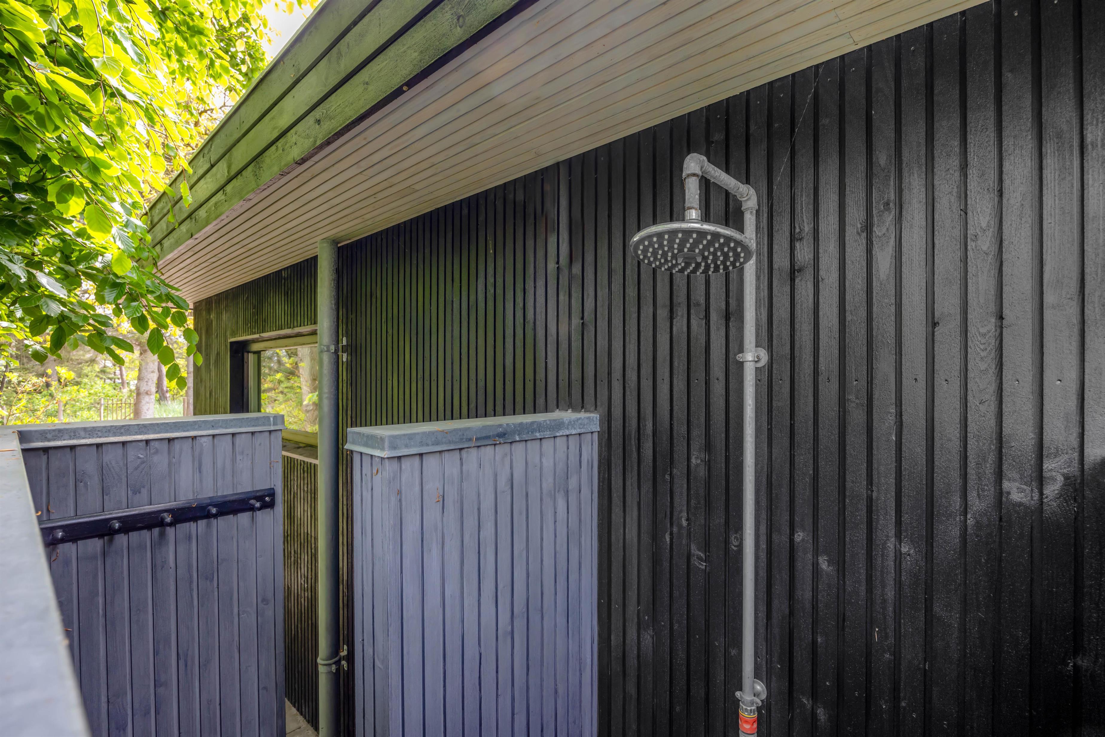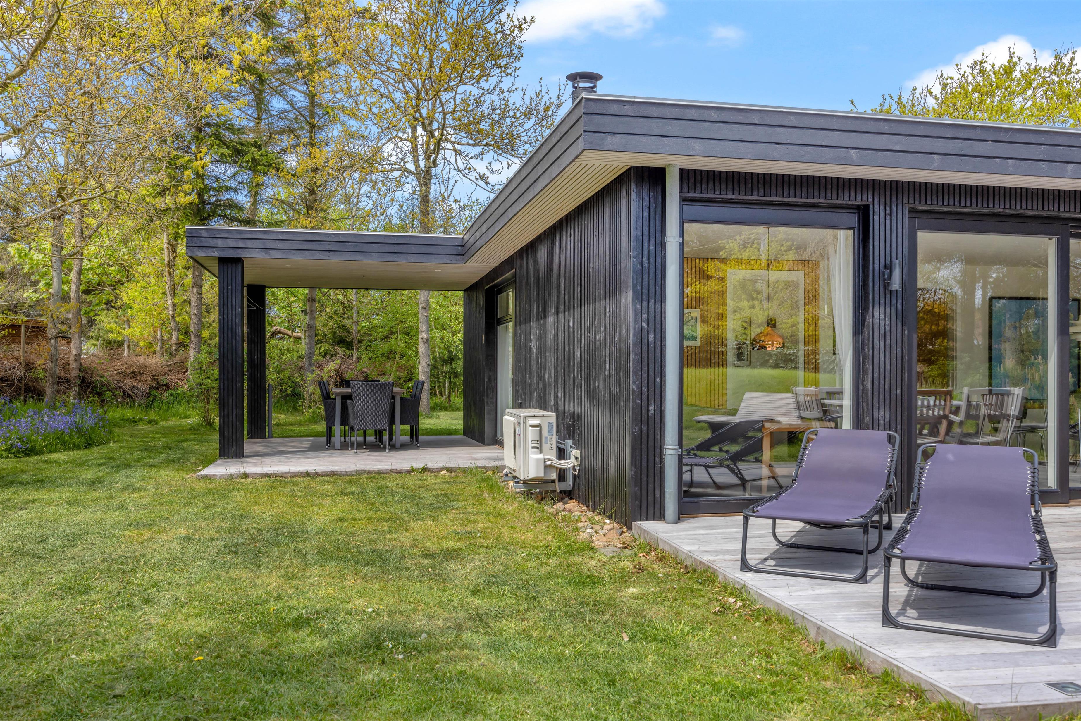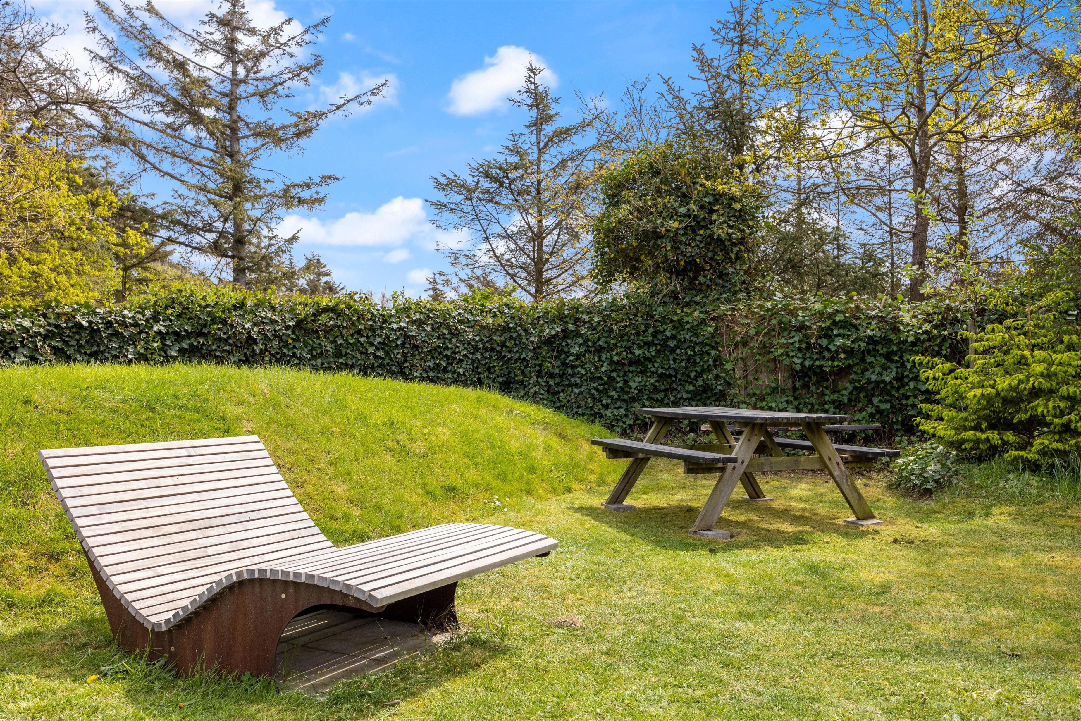 Feriehuset har en skøn, ugeneret beliggenhed omgivet af grøn natur og træer. Der er flere gode terrasser med liggestole og havemøbler, en stor indhegnet græsplæne til glæde for børnene samt en udendørs bruser, hvor I kan skylle fødderne efter en tur ved vandet. Udebruseren kan kun benyttes i perioden april til november.