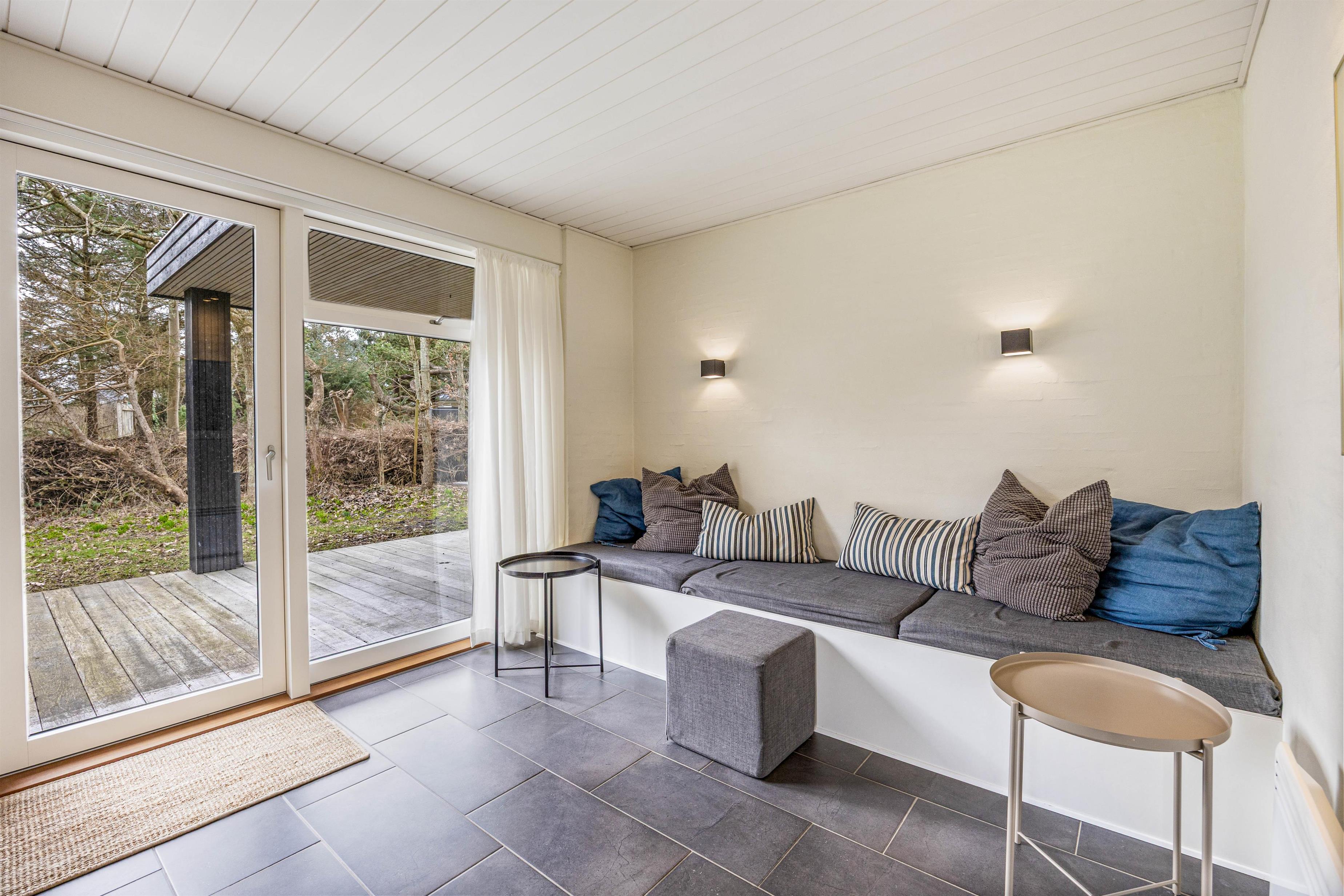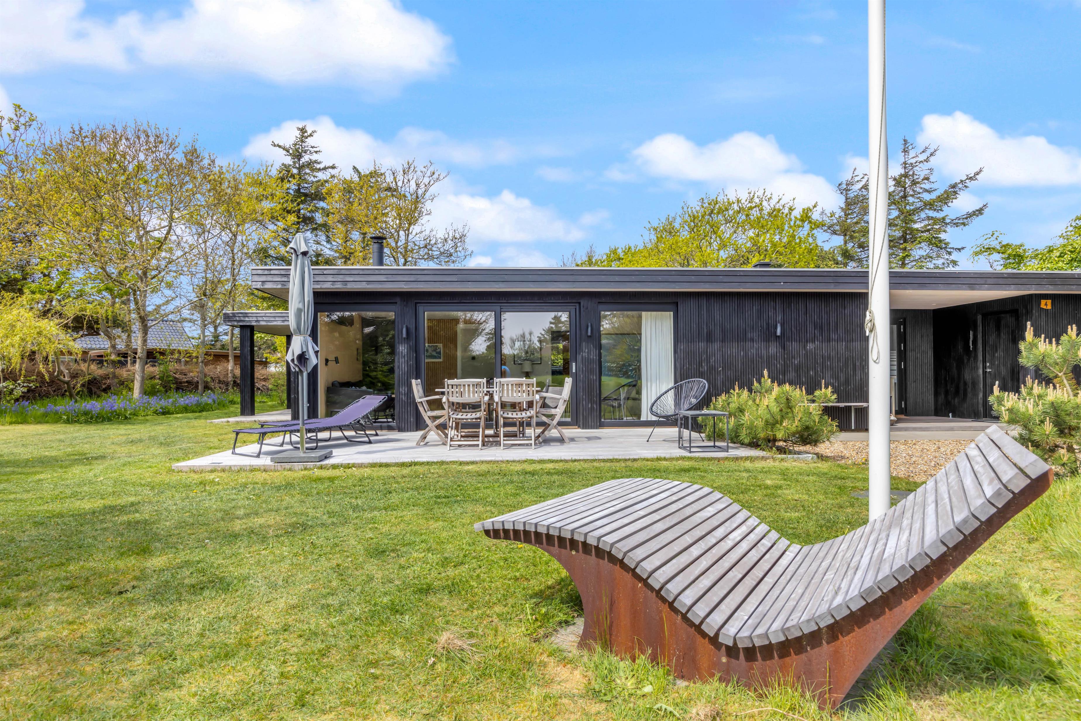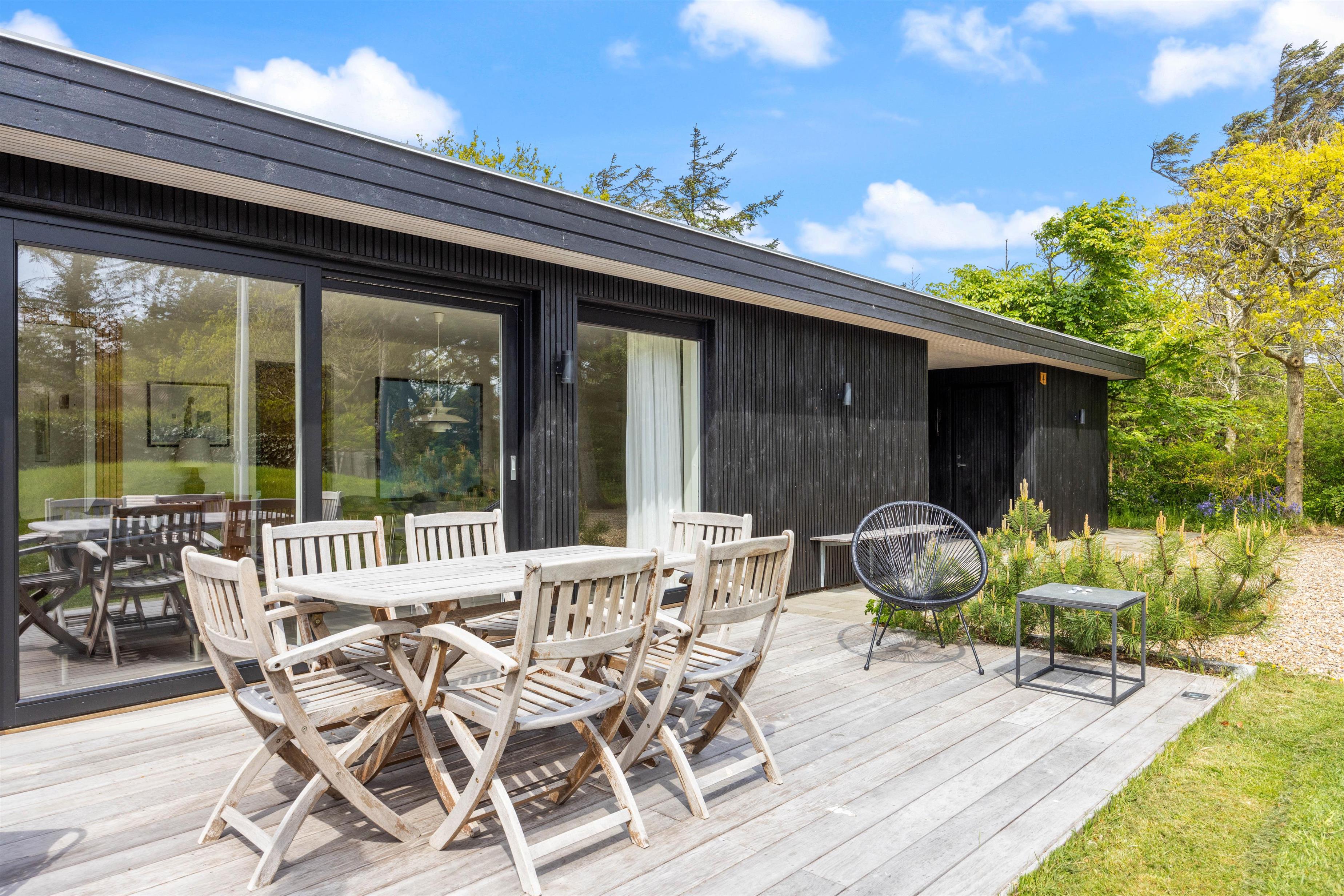 Få minutters gang fra stranden og Søndervigs centrum ligger dette flotte renoverede (2018) feriehus. Beliggenheden er både naturskøn og ugeneret, indretningen er stilfuld og moderne. Der er sauna, flere lækre terrasser og en udendørs bruser.