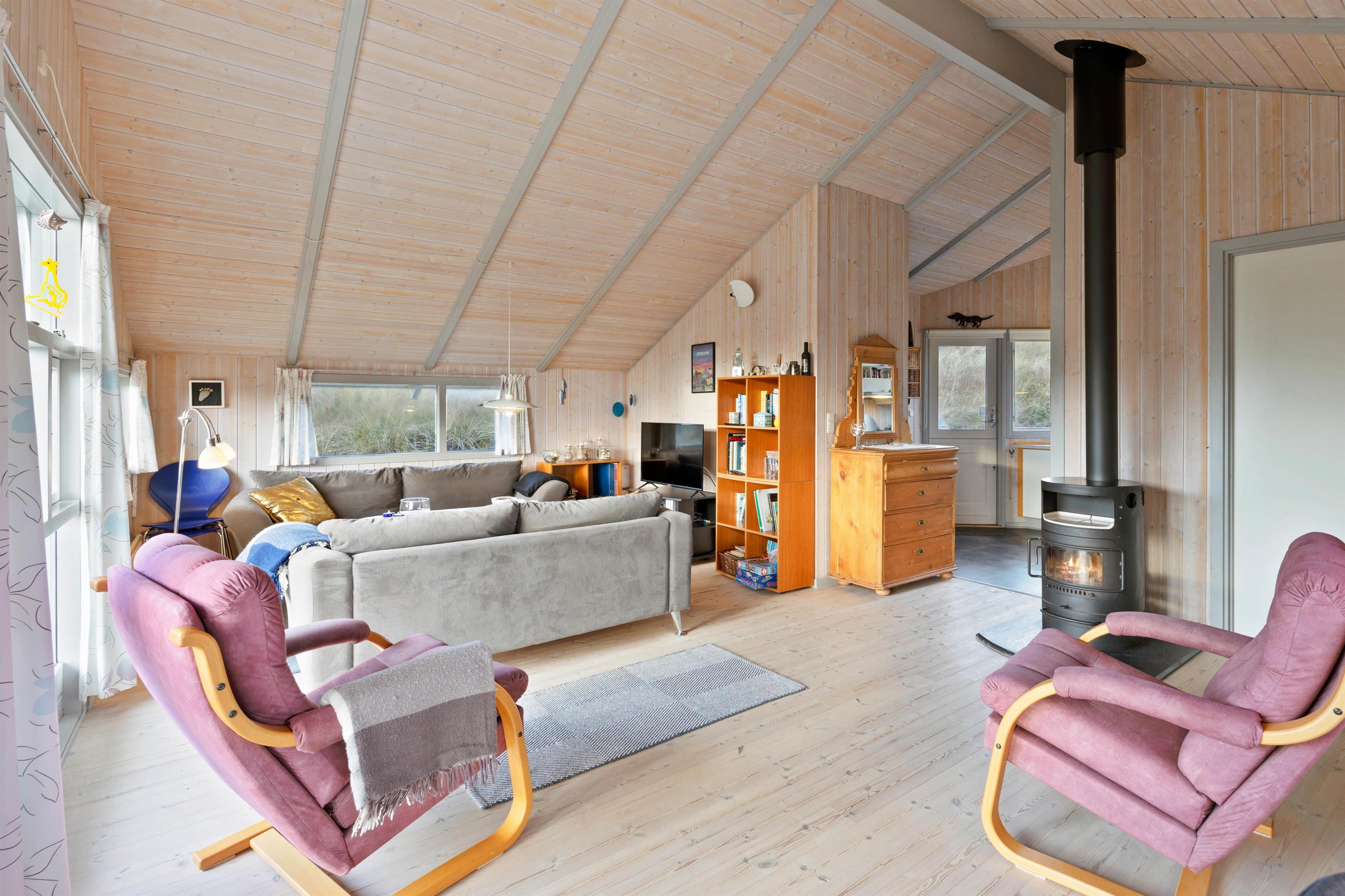 Når I træder ind på Molsvej 36 i Søndervig, vil I blive mødt af en lys og venlig indretning. Her er I ikke i tvivl om, at der er ferie på menuen. Den gode brændeovn er placeret centralt i feriehuset og sørger for varmen på de koldere dage.