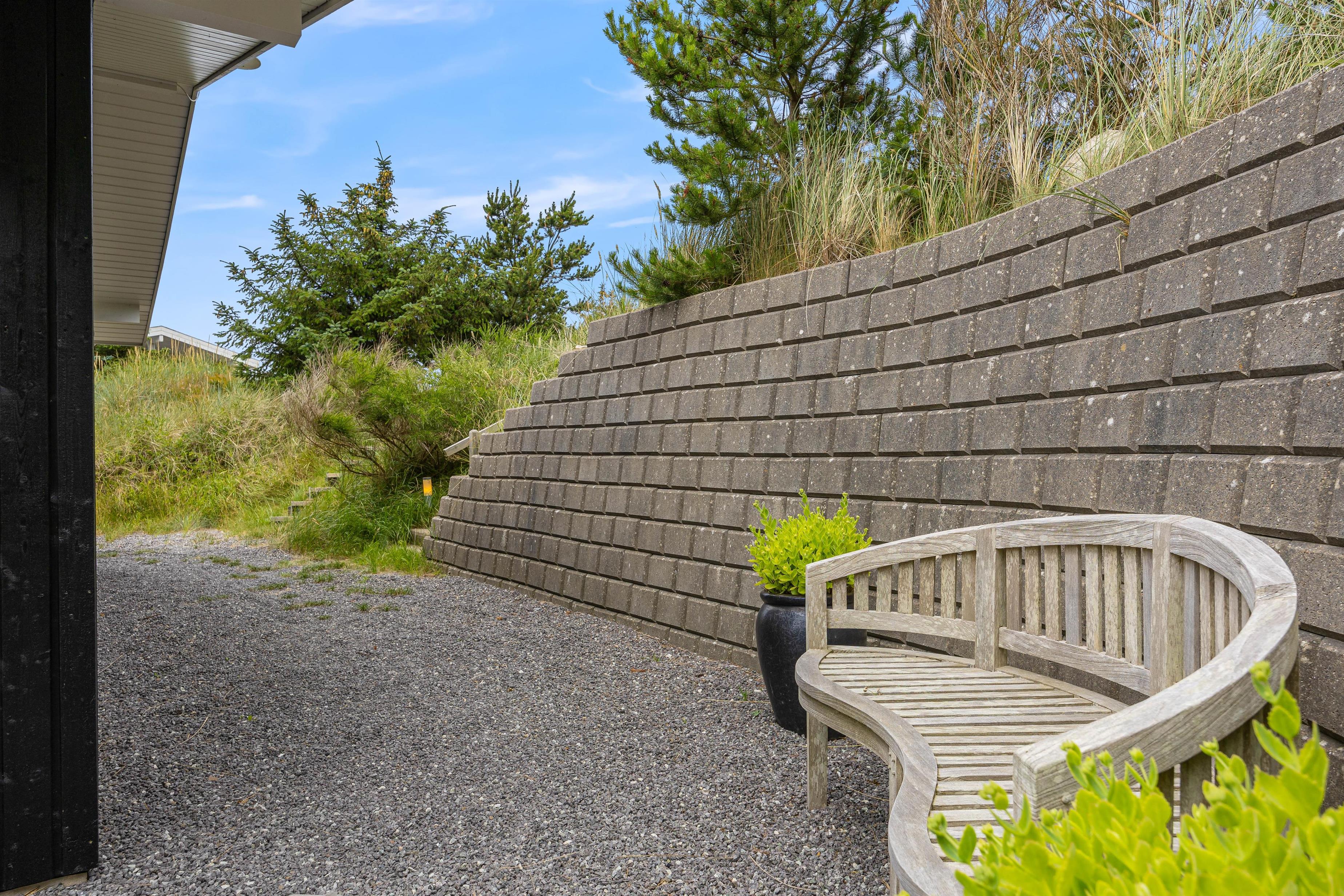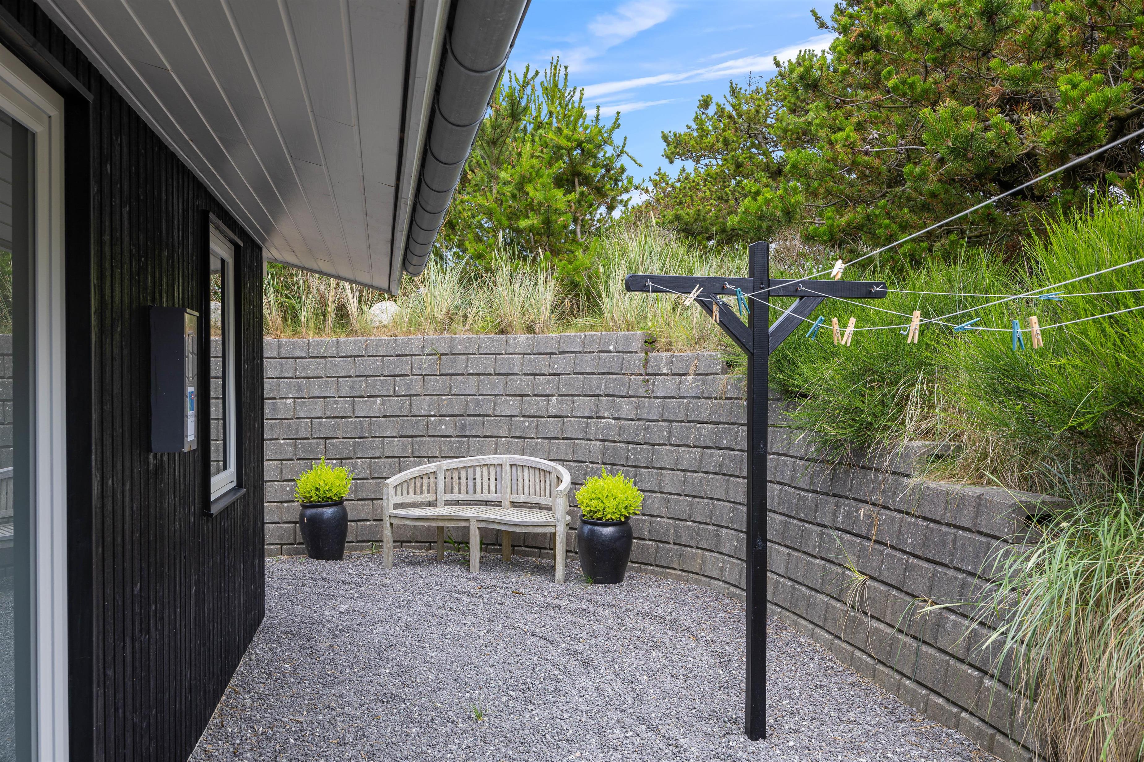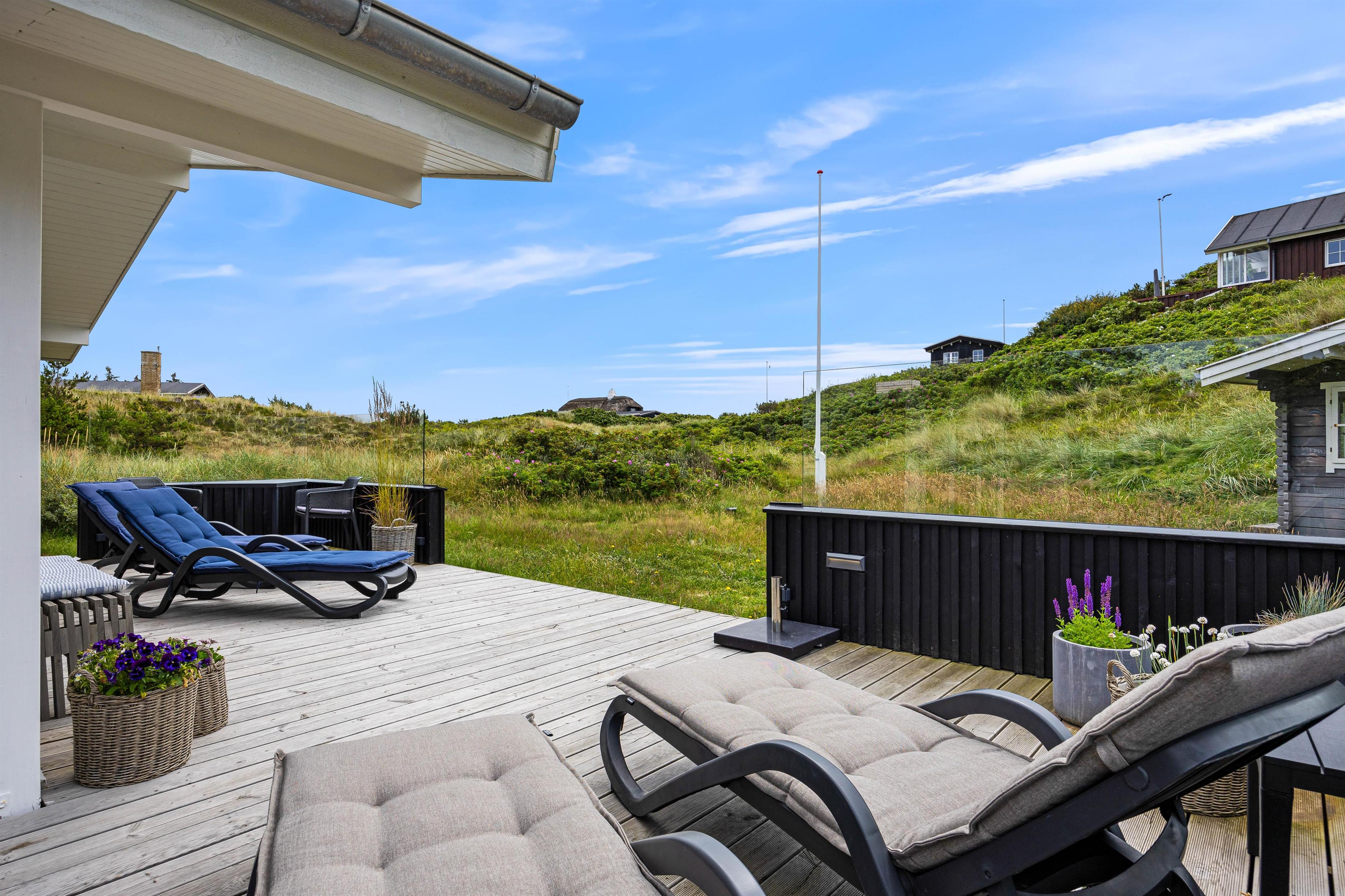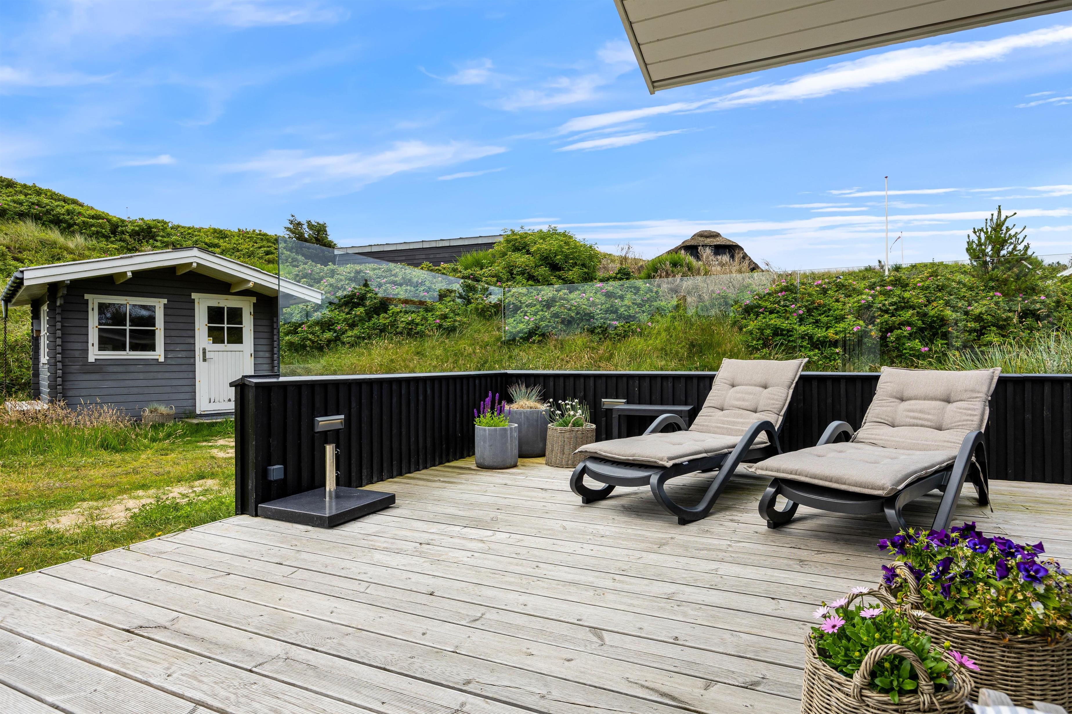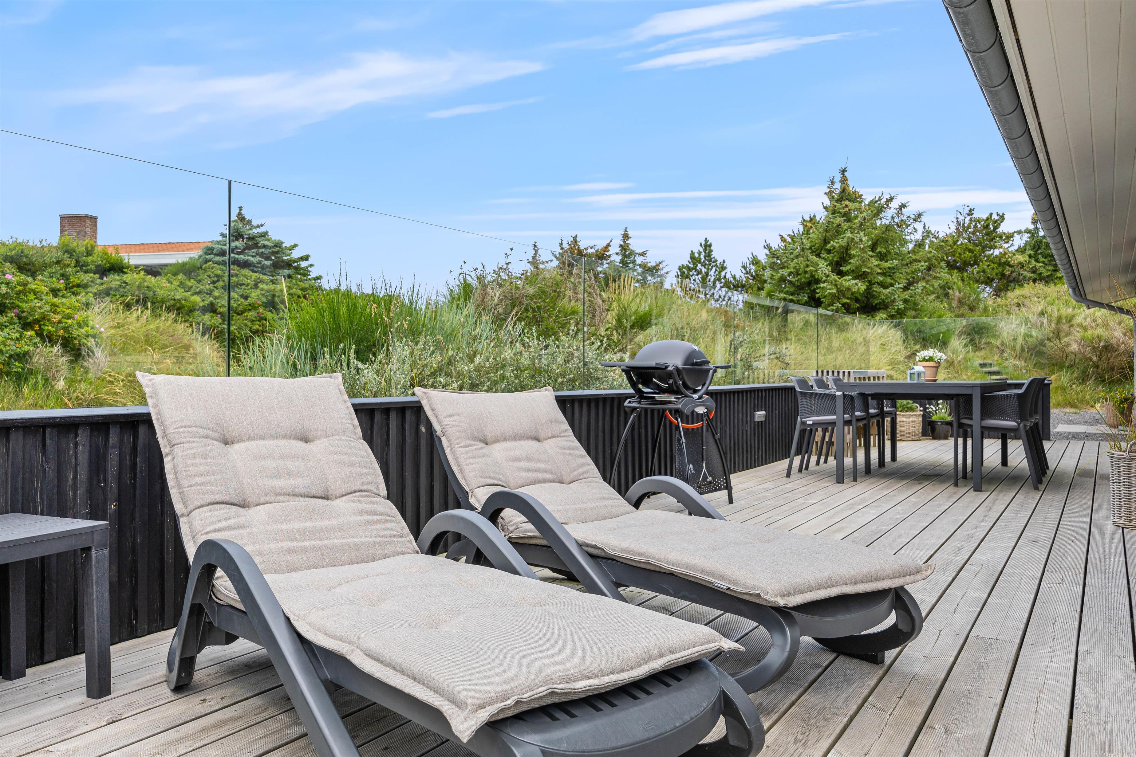 Terrassen har både en åben del og en afskærmet del mod vest, så i kan sidde i sol og samtidig have læ. Morgenkaffen nydes bedst på den syg-østvendte terrasse, hvor der er morgensol og dejlig læ. Havemøbler, liggestole og grill står til fri afbenyttelse, så sommerdagene kan nydes i fulde drag.