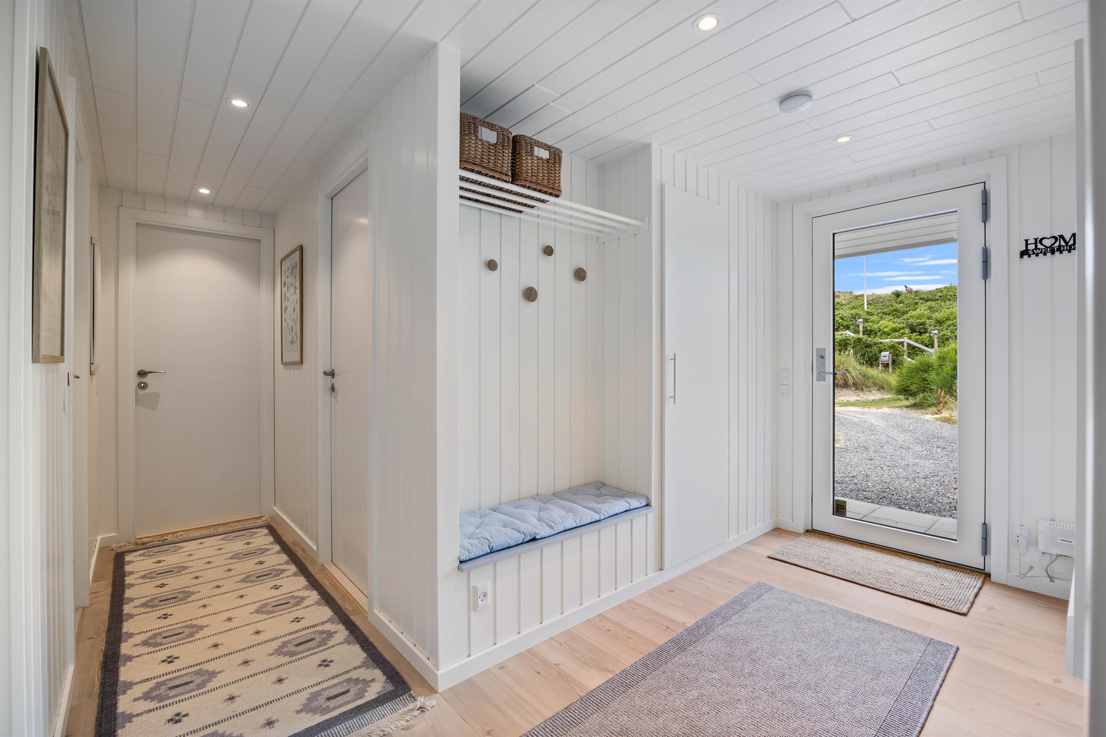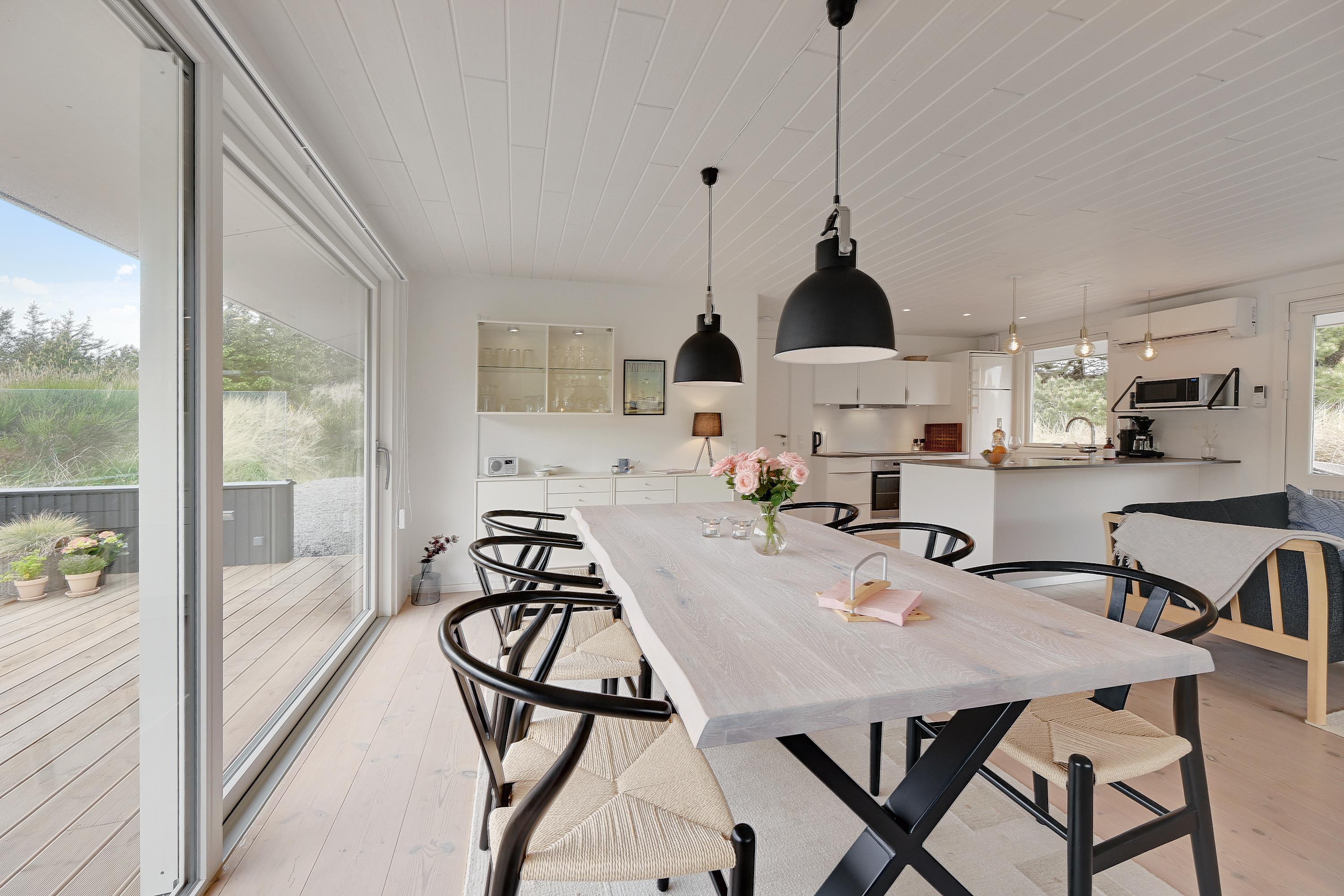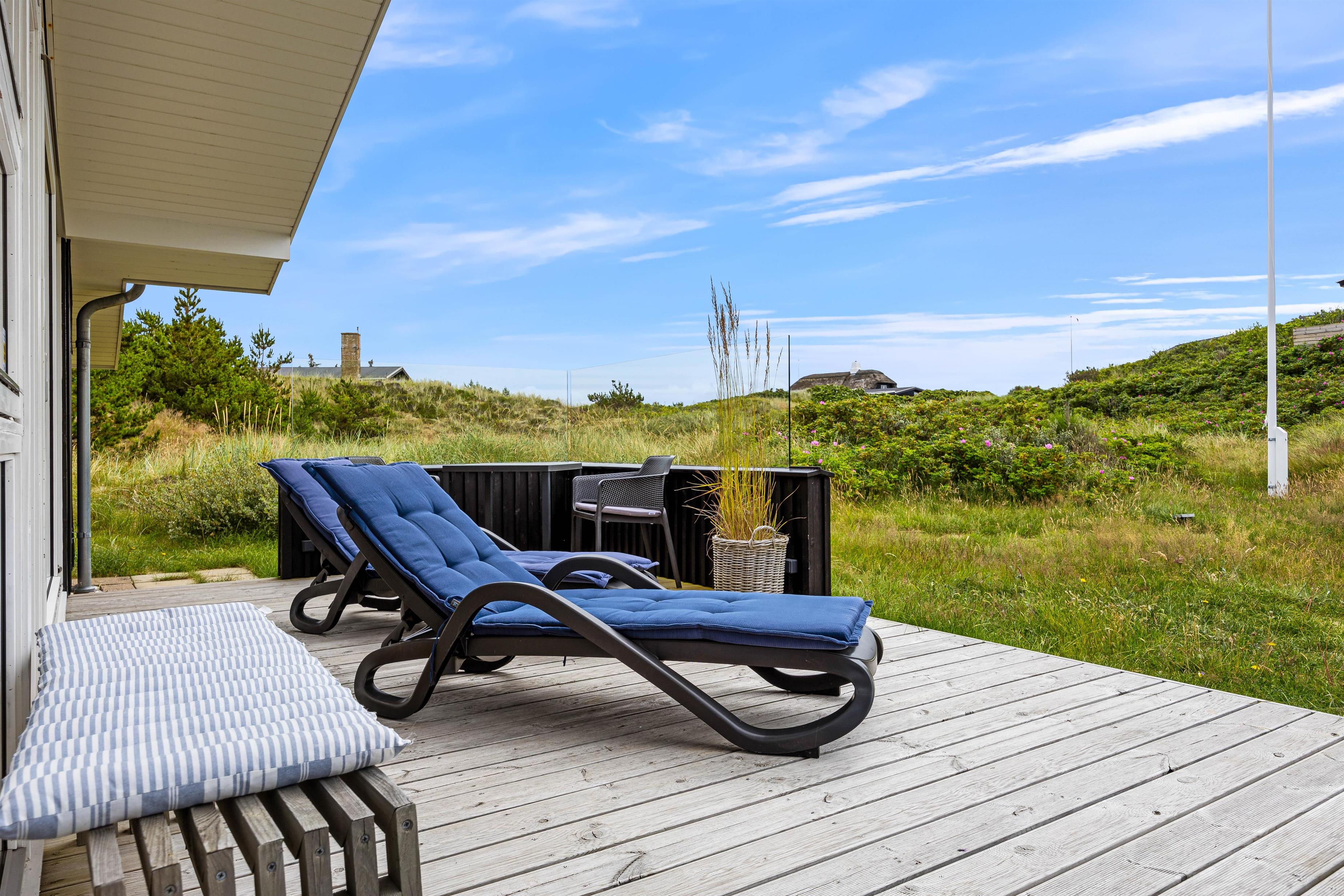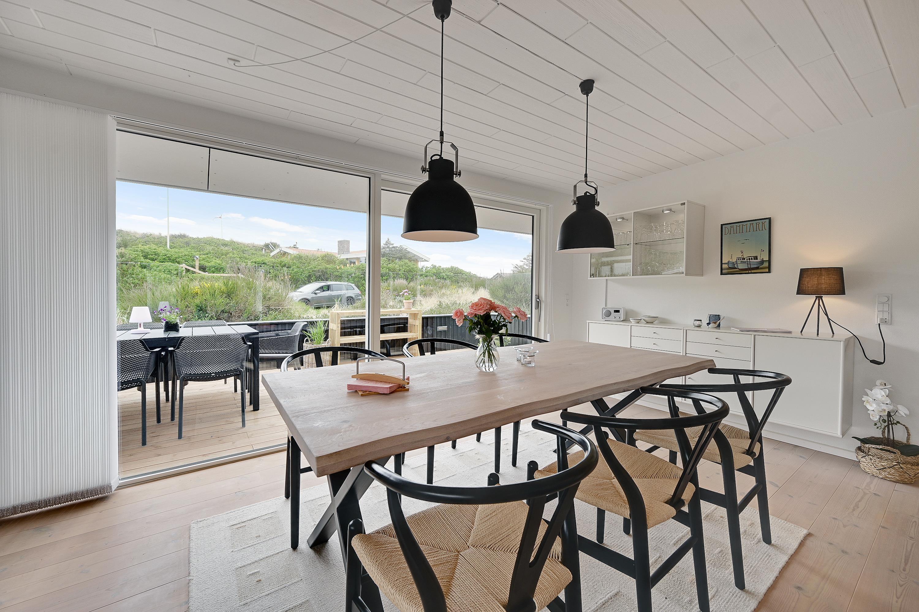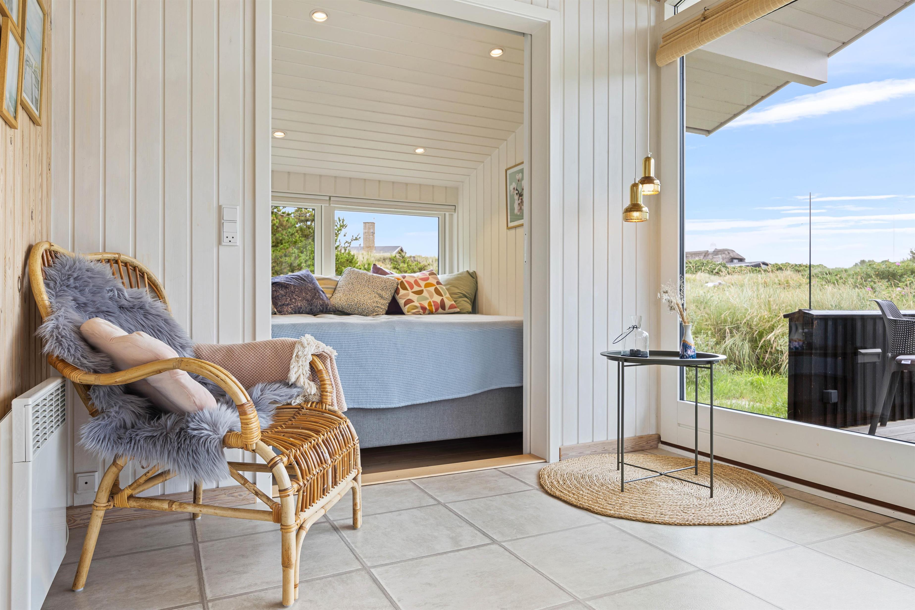 Fra stuen kommer I ind i sommerhusets udestue, som med sikkerhed vil sende feriestemningen helt i top. Fra udestuen har I udsigt ud over det smukke klitlandskab, og selv i regn og blæst kan I nyde den vestjyske natur over en varm kop kaffe, måske med lidt lækkerier fra Søndervigs lokale bager ved siden af.