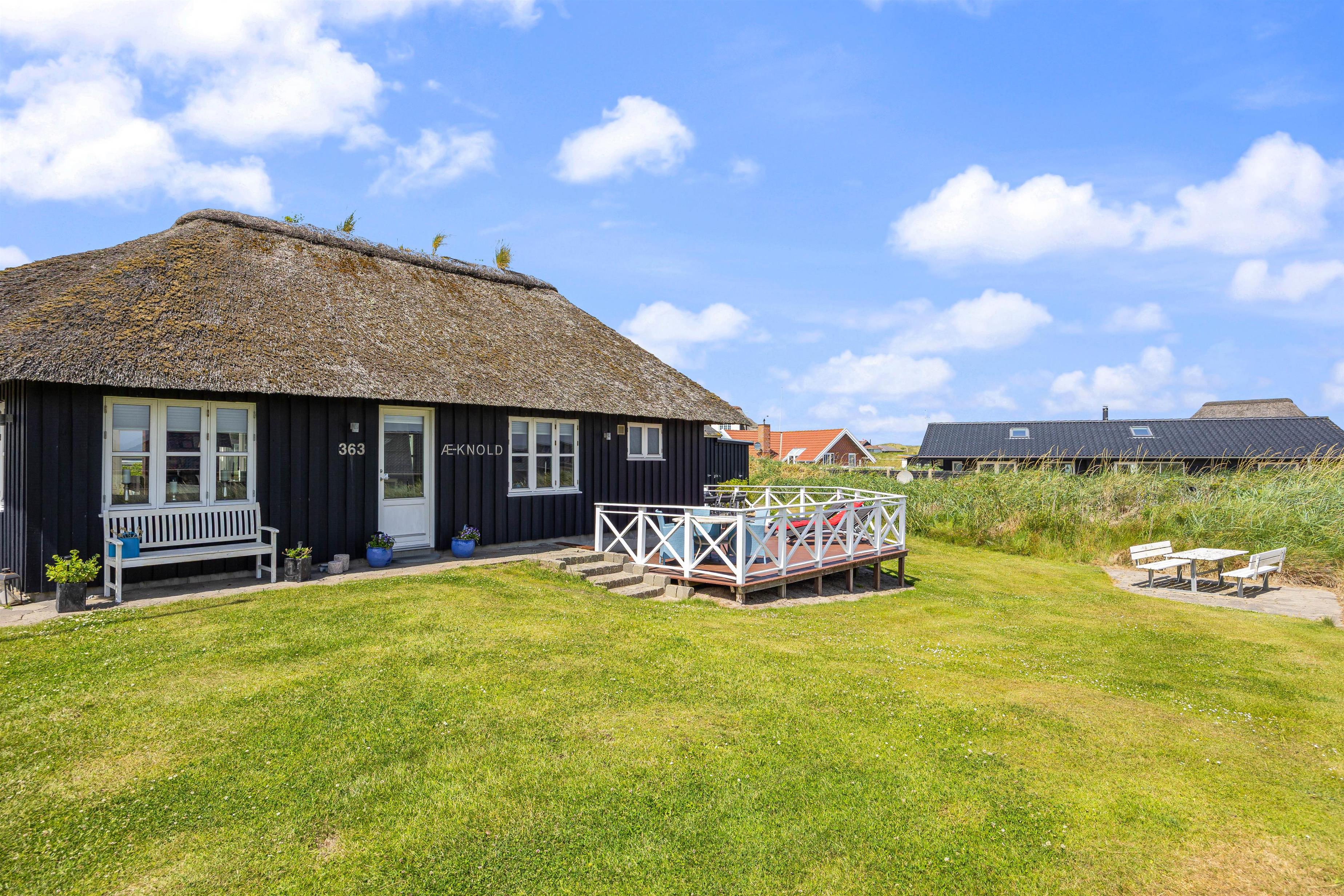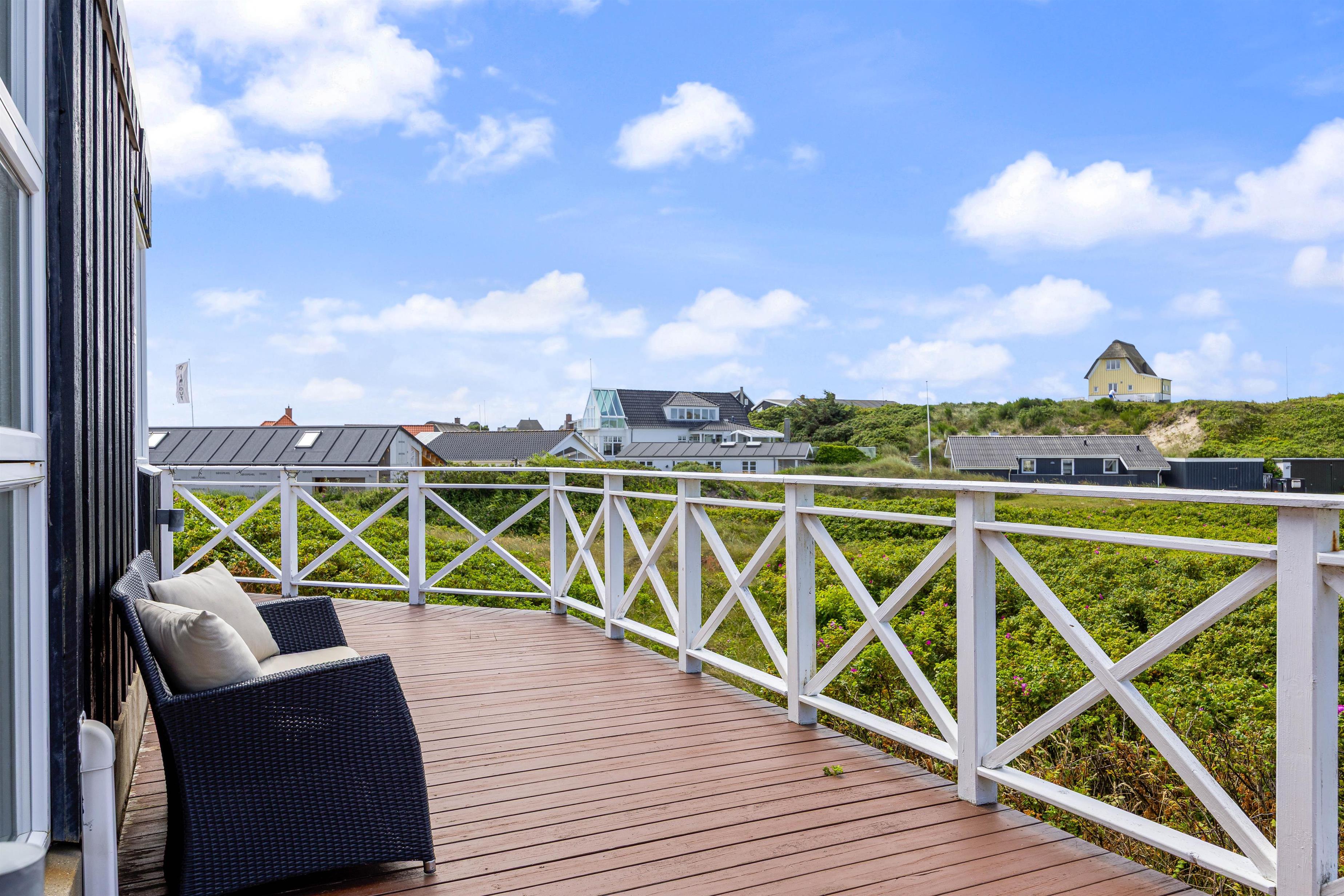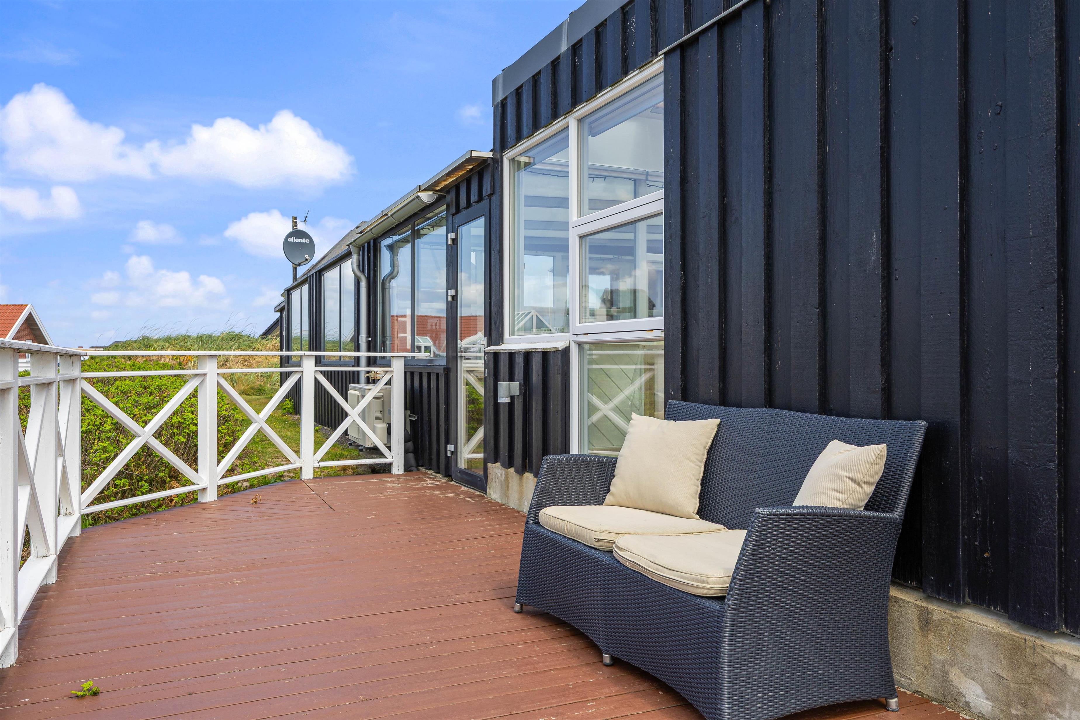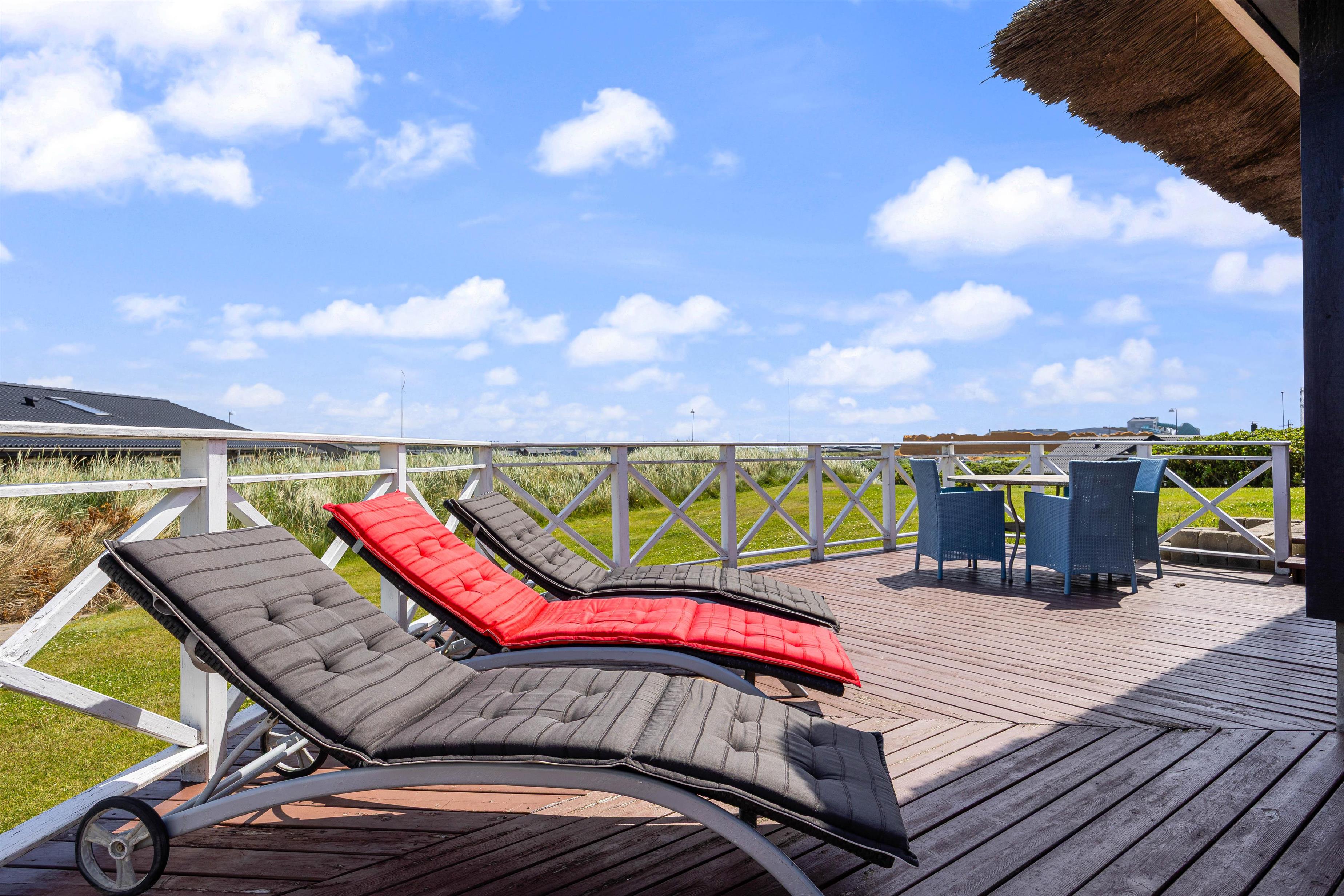 Der er skønne terrasser tilhørende dette sommerhus, Lodbergsvej 363. Mod øst er der en god og åben terrasse, som er ideel fra morgenstunden af og til hen på eftermiddagen. Mod vest er der en afskærmet terrasse, som gør den særdeles velegnet til hyggelige grill aftener. Man fornemmer tydeligt vesterhavet fra terrasserne, både duften og lyden, ligesom den hyggelige stemning fra den populære badeby Søndervig, tydeligt fornemmes fra hus og terrasser.