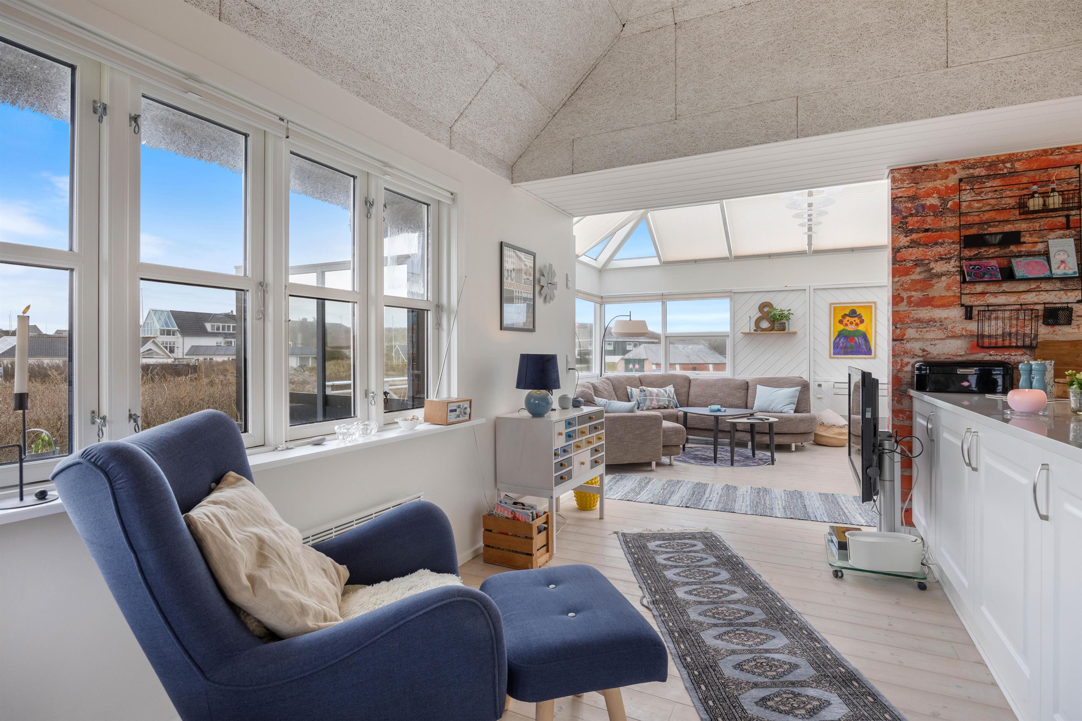Stuen er rigtig hyggelig og stilfuldt indrettet med lækre og komfortable møbler. Her er der et fladskærms-TV, radio og gratis trådløst internet, så I kan virkelig føle jer hjemme. Udestuen ligger i forbindelse med stue og køkken, og helt mod vest. Den er fantastisk, der er et vidunderligt lys i den, og den er smukt forbundet med resten af huset, selvom den er meget anderledes, primært fordi der er loft til kip samt store vinduespartier. Her kan I sidde trygt og varmt, og bare føle jer i et med den omkringliggende natur.