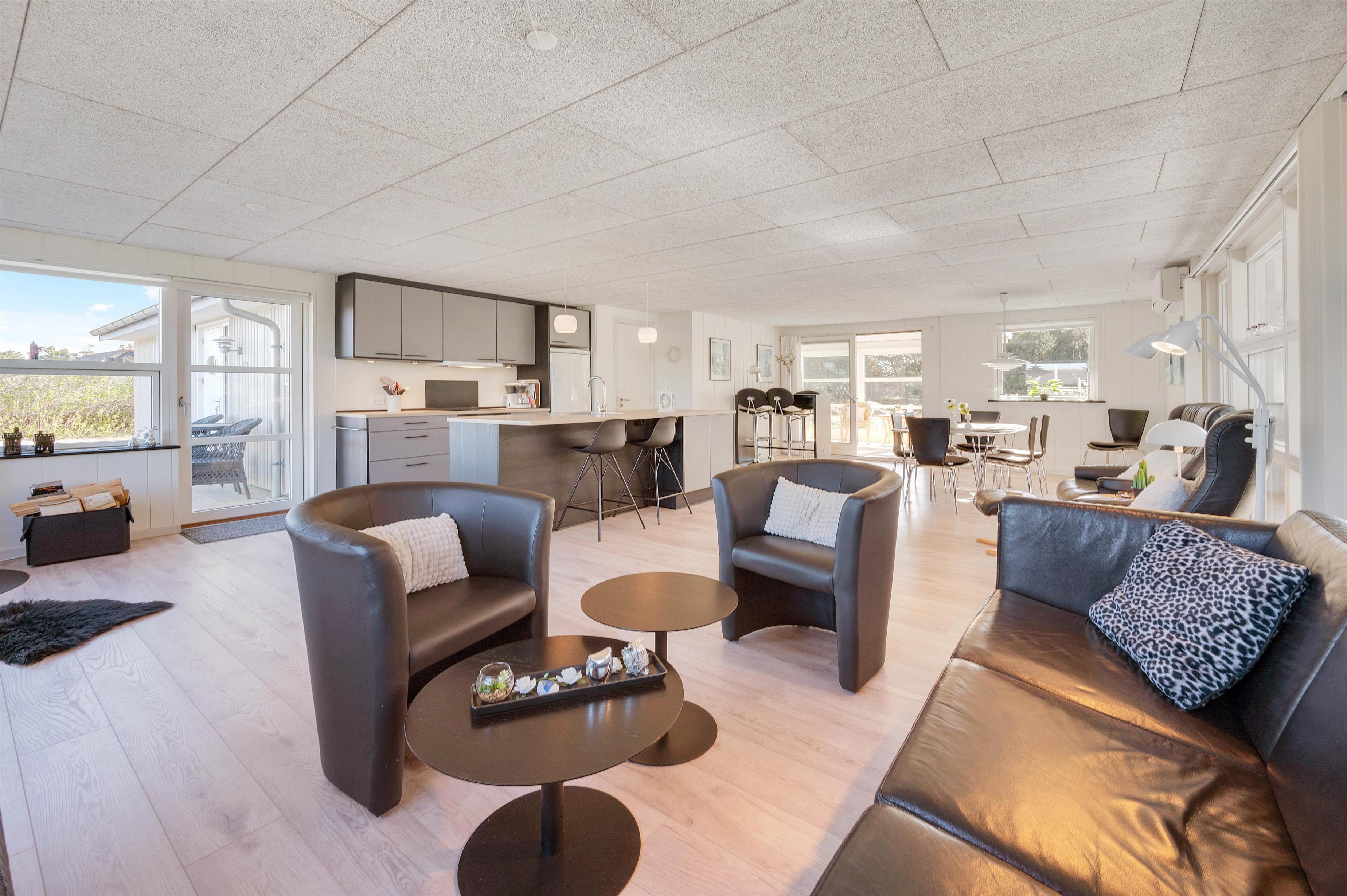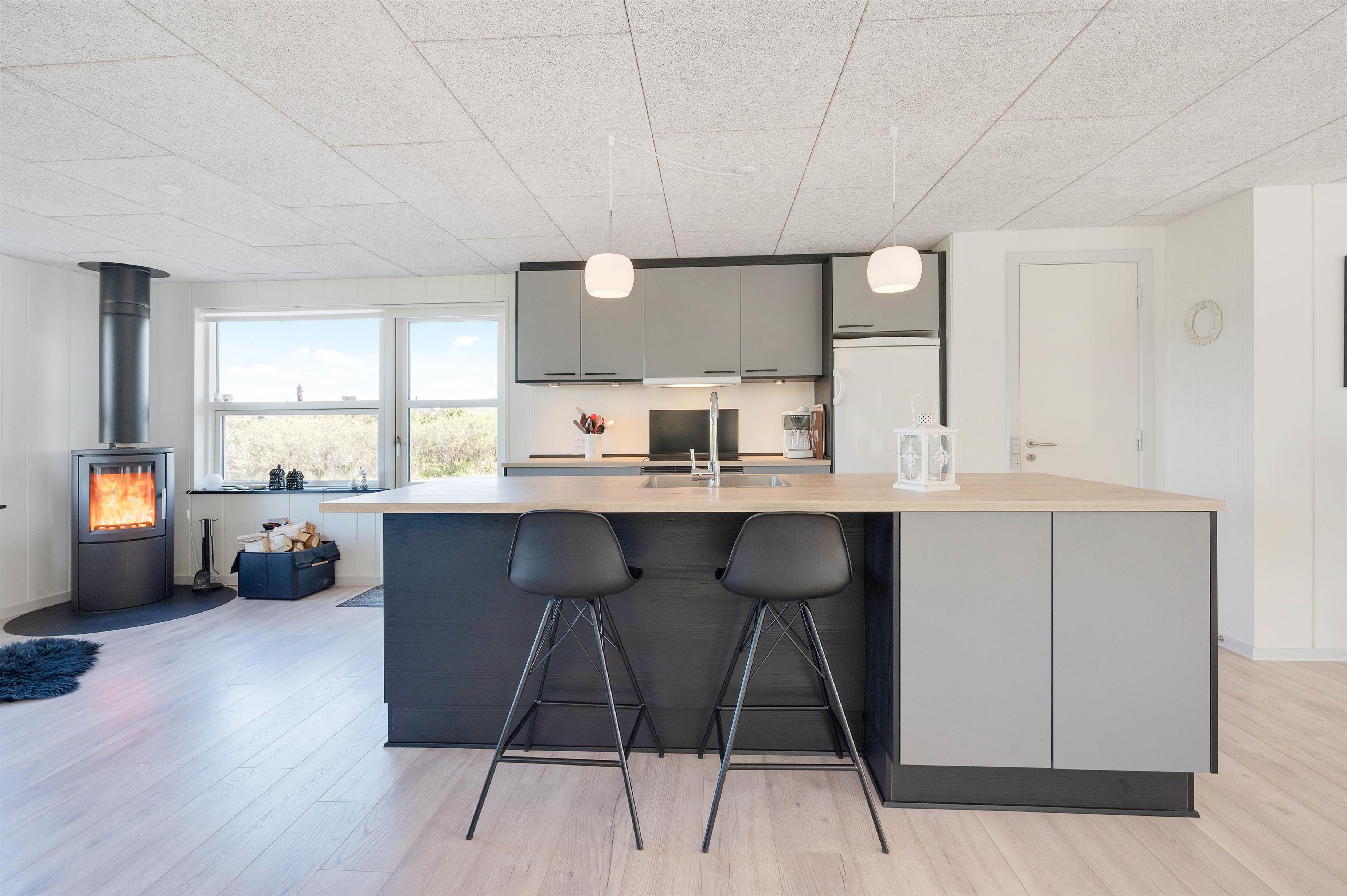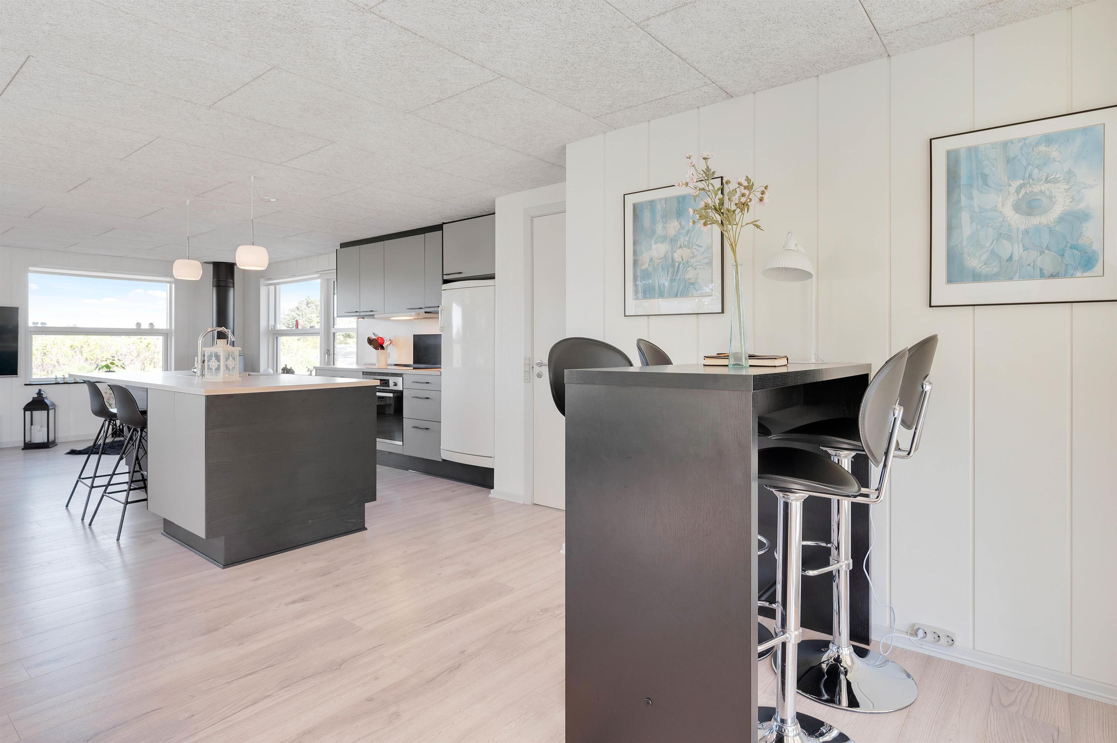 Dette velplejede og energivenlige sommerhus i Søndervig fremstår lyst og indbydende. Man mærker tydeligt, at der er tænkt på selv de mindste detaljer og gæstens ve og vel. Indretningen er holdt i smagfulde sorte og hvide nuancer, der kun brydes af det flotte, moderne køkkens grå fronter og enkelte billeder i sarte pastelfarver.