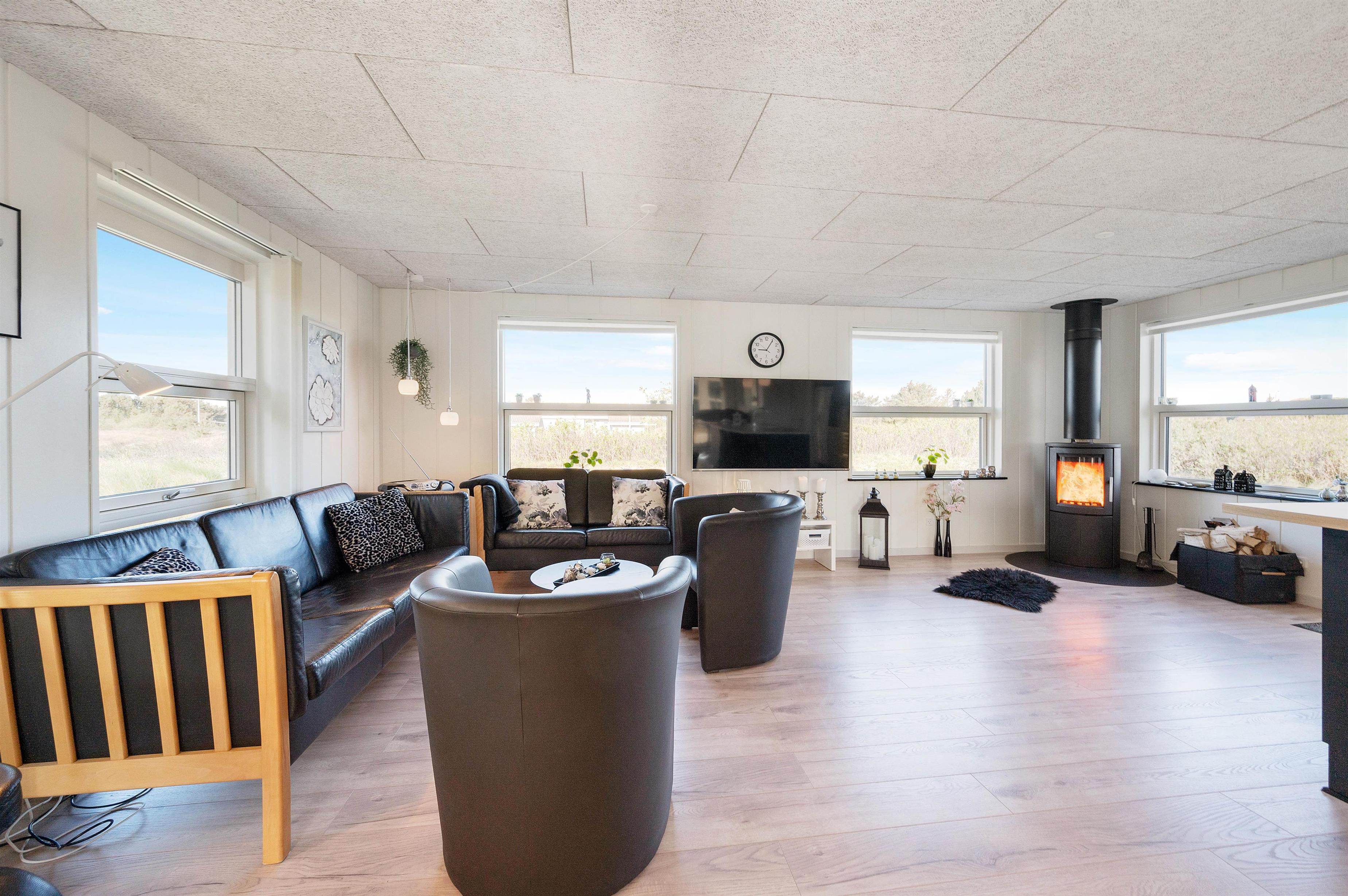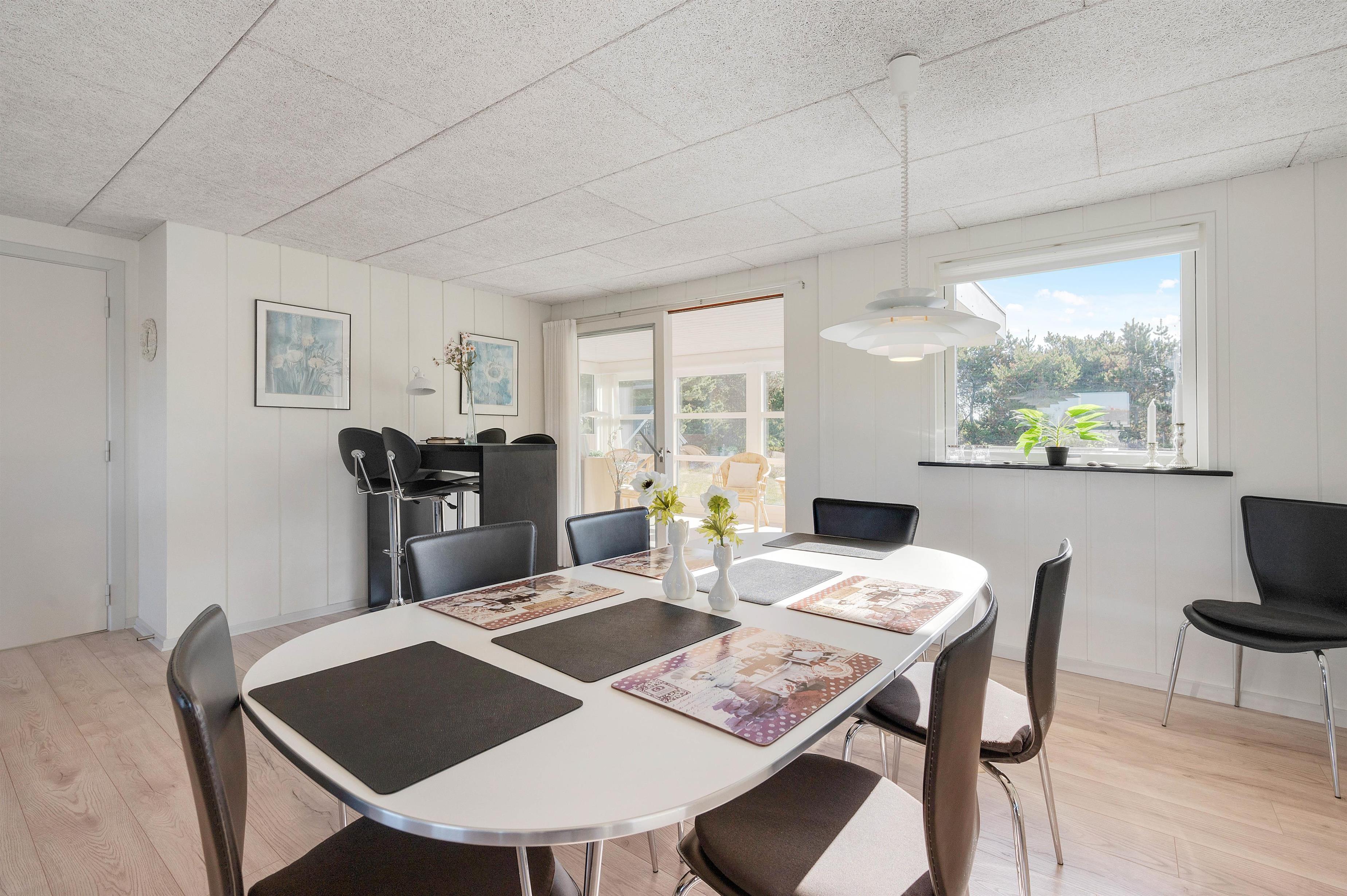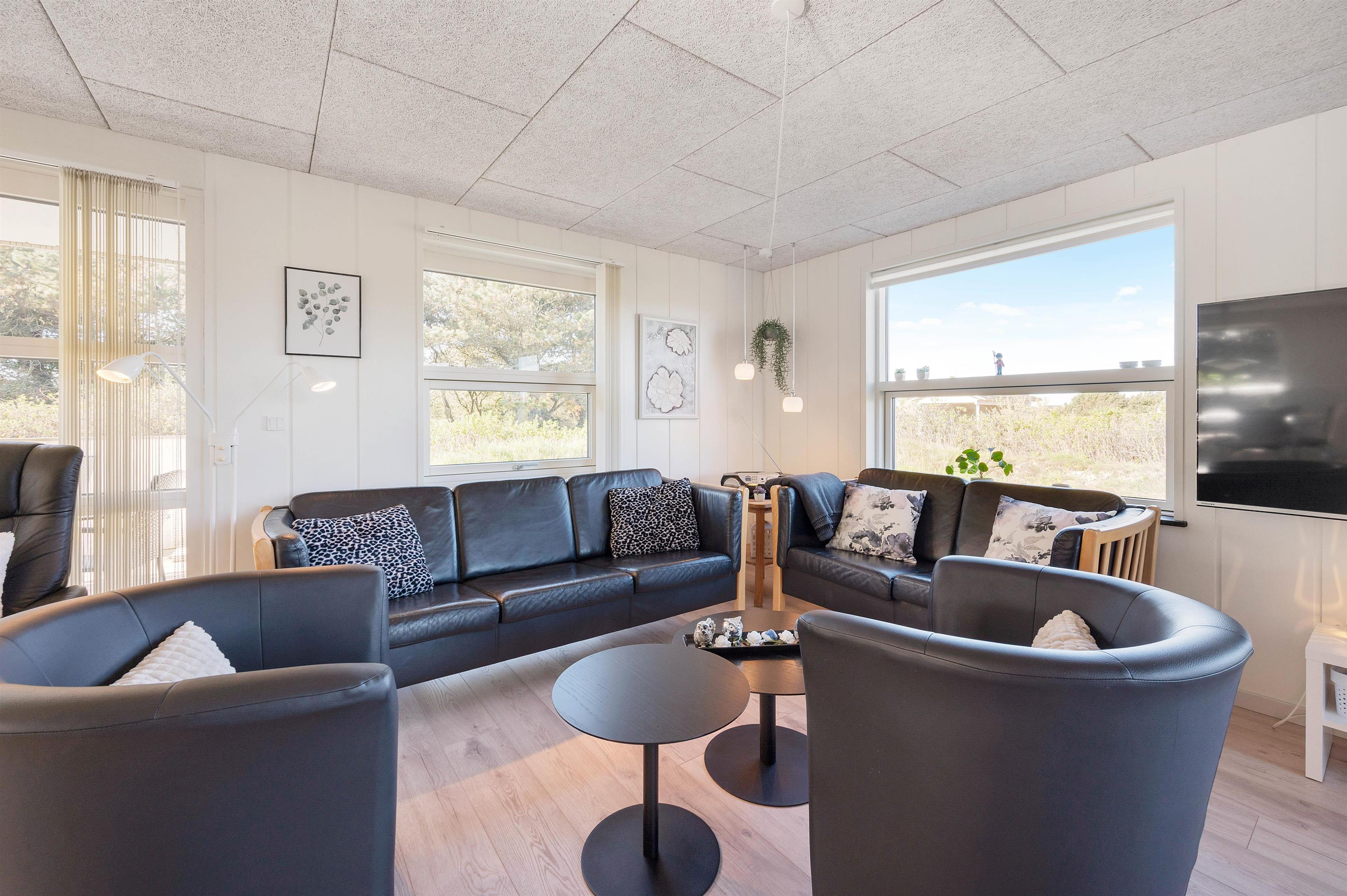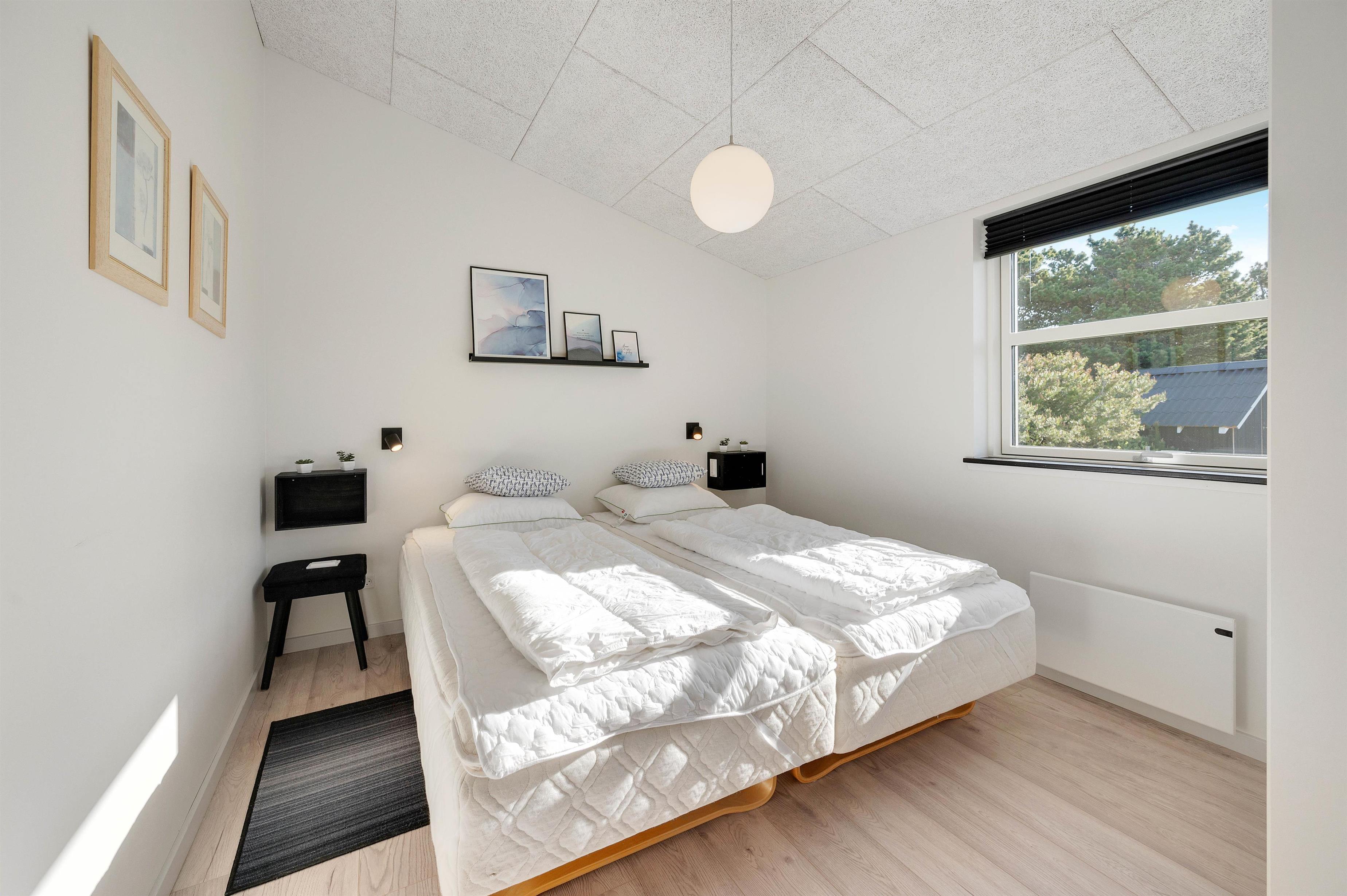 Dette velplejede og energivenlige sommerhus i Søndervig fremstår lyst og indbydende. Man mærker tydeligt, at der er tænkt på selv de mindste detaljer og gæstens ve og vel. Indretningen er holdt i smagfulde sorte og hvide nuancer, der kun brydes af det flotte, moderne køkkens grå fronter og enkelte billeder i sarte pastelfarver.