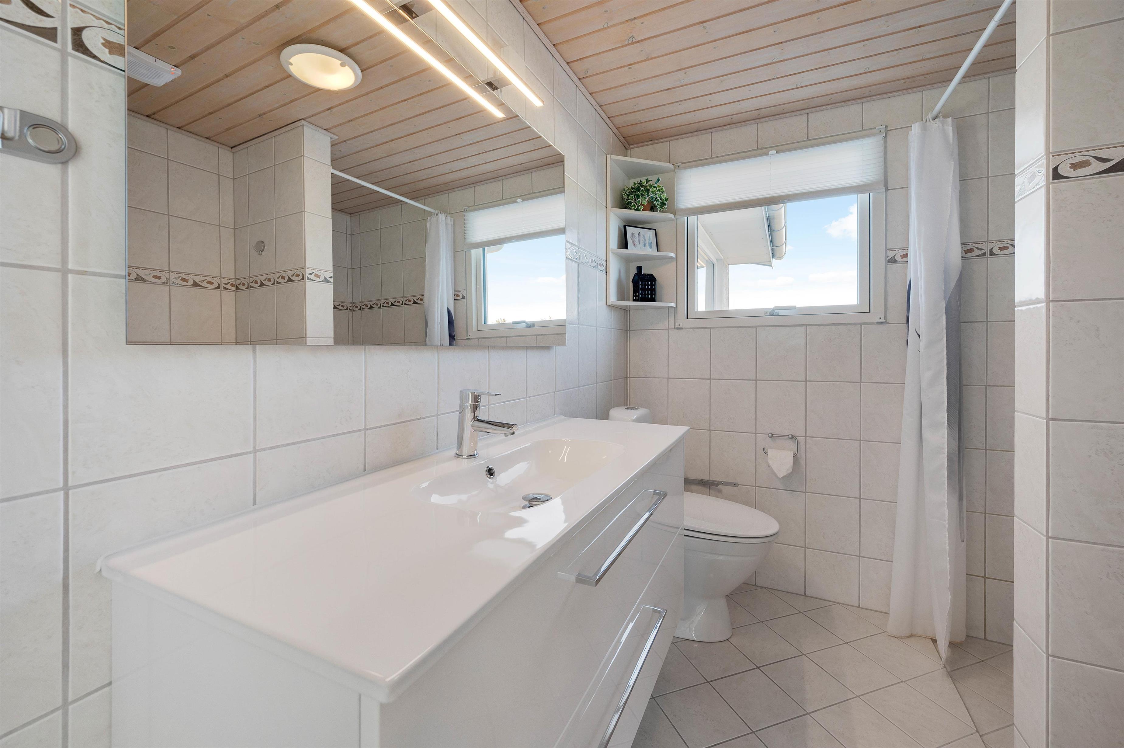Der findes tre gode og lyse soveværelser i huset – to med dobbeltseng og et værelse med to enkeltsenge. Derudover er der et fint og lyst badeværelse med bruseniche og opvarmet flisegulv. En energibesparende varmepumpe/aircondition sørger desuden for en behagelig opvarmning af huset.