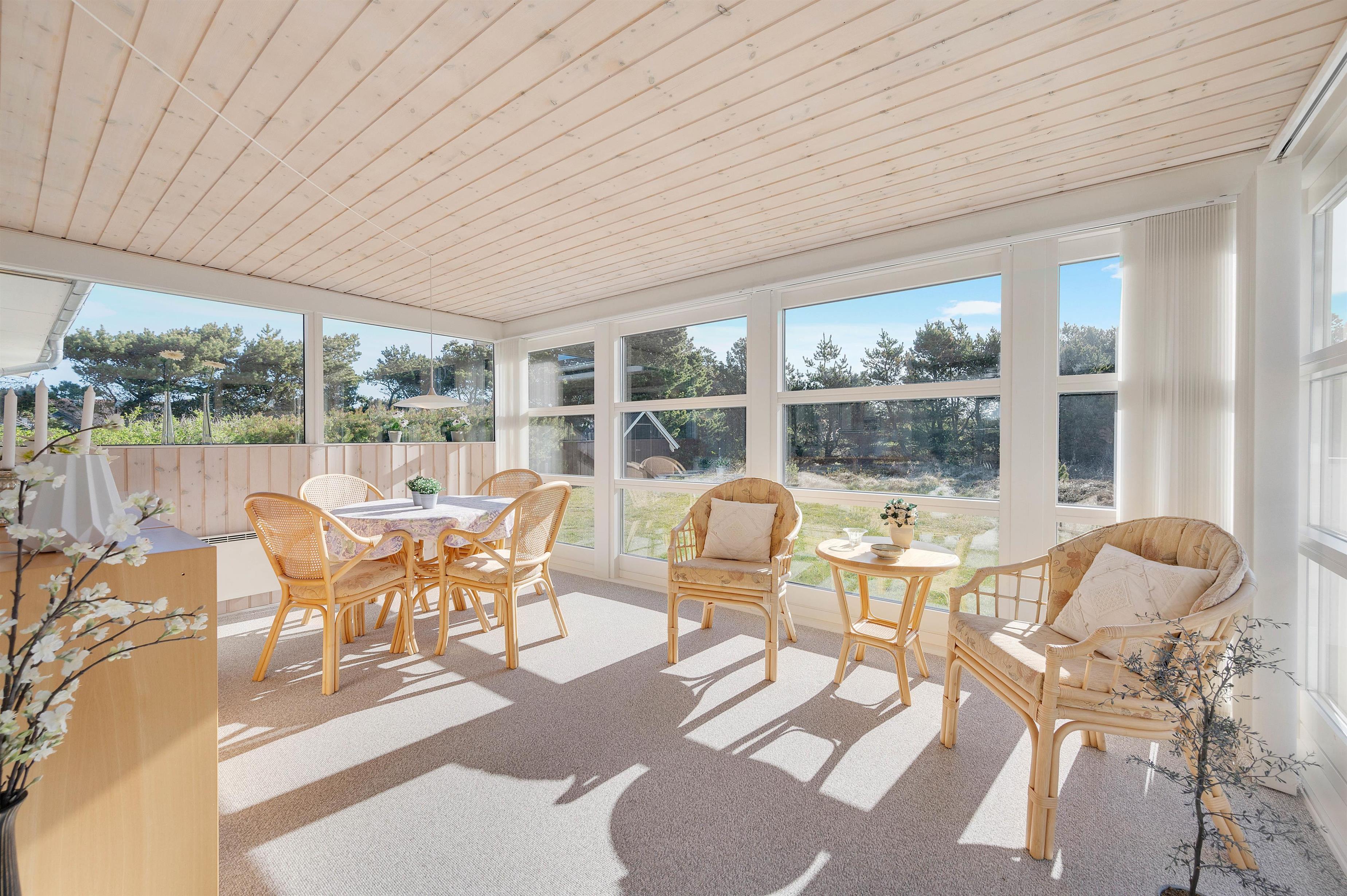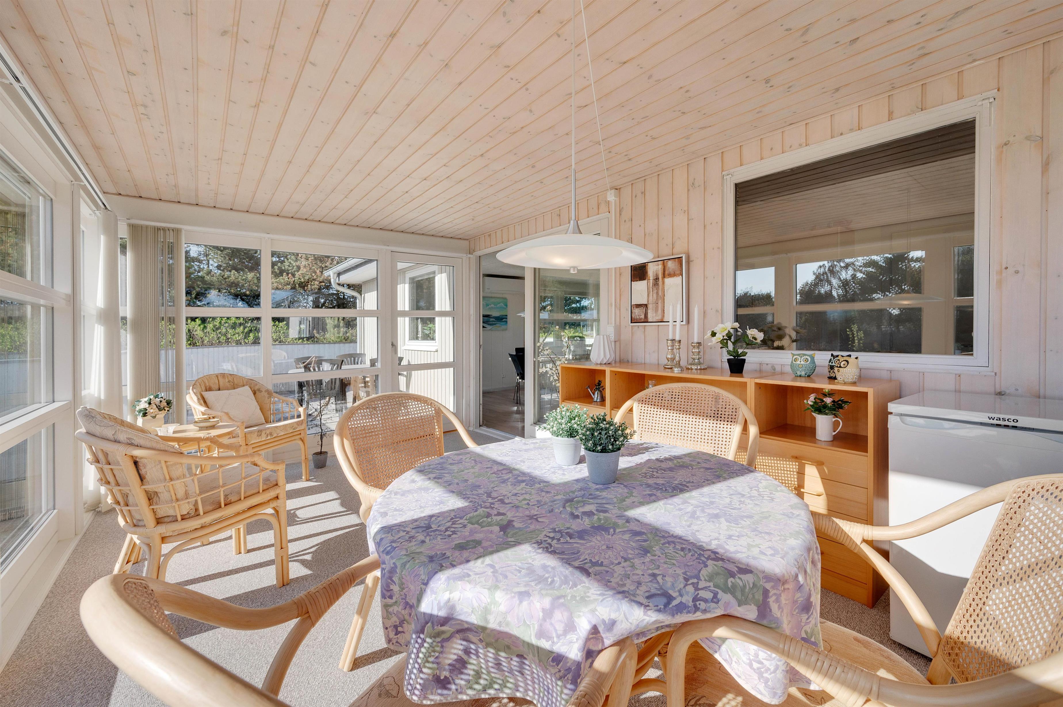 Derudover råder huset over en dejlig, lys udestue, som virkelig sætter prikken over i’et. Udestuen er indrettet med flotte fletmøbler, og fra pladsen i stolene kan I nyde den smukke udsigt ud over naturgrunden. Det er ikke uden fortilfælde, at I kan spotte råvildt, der undersøger buske og krat udenfor.