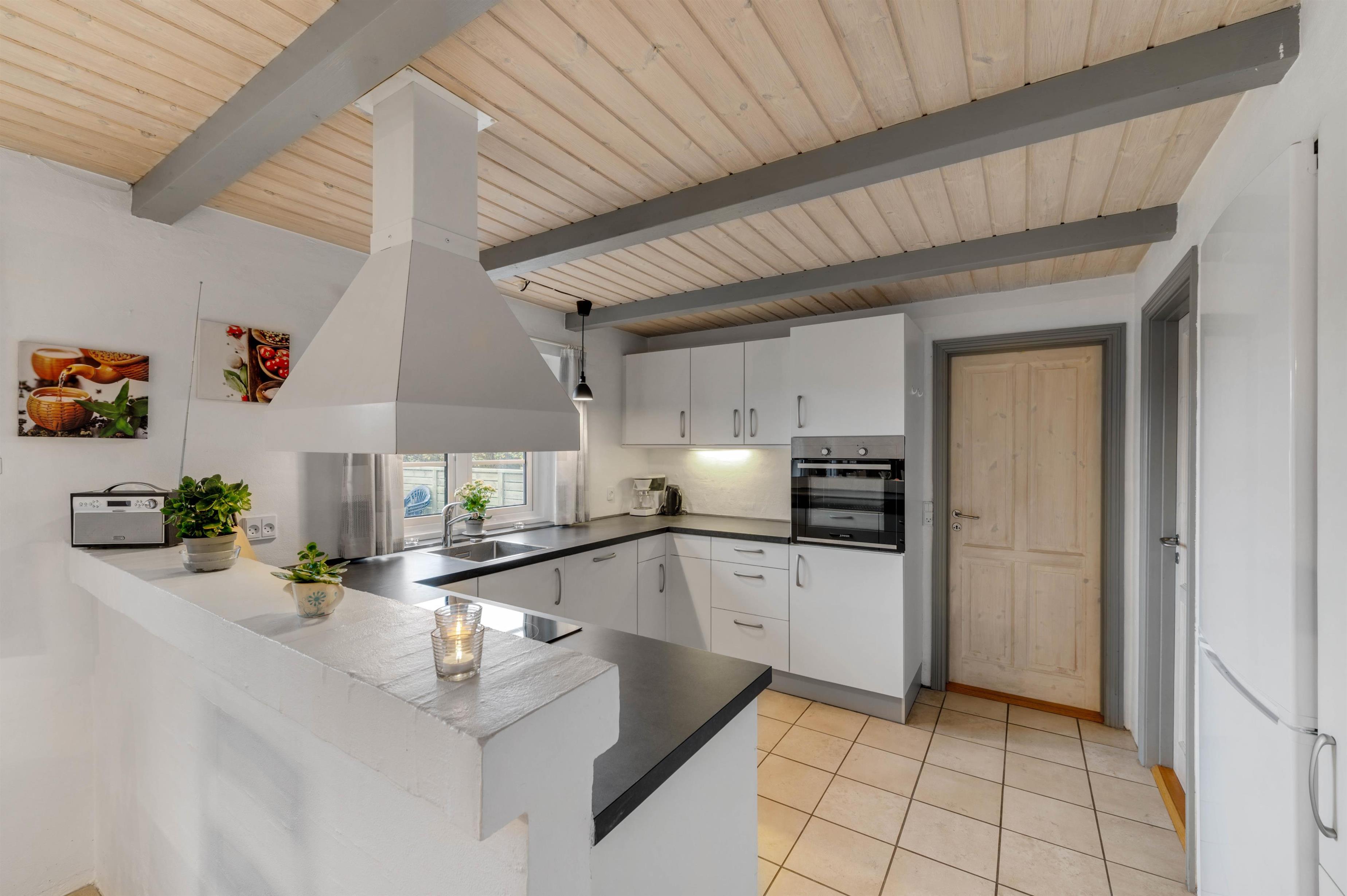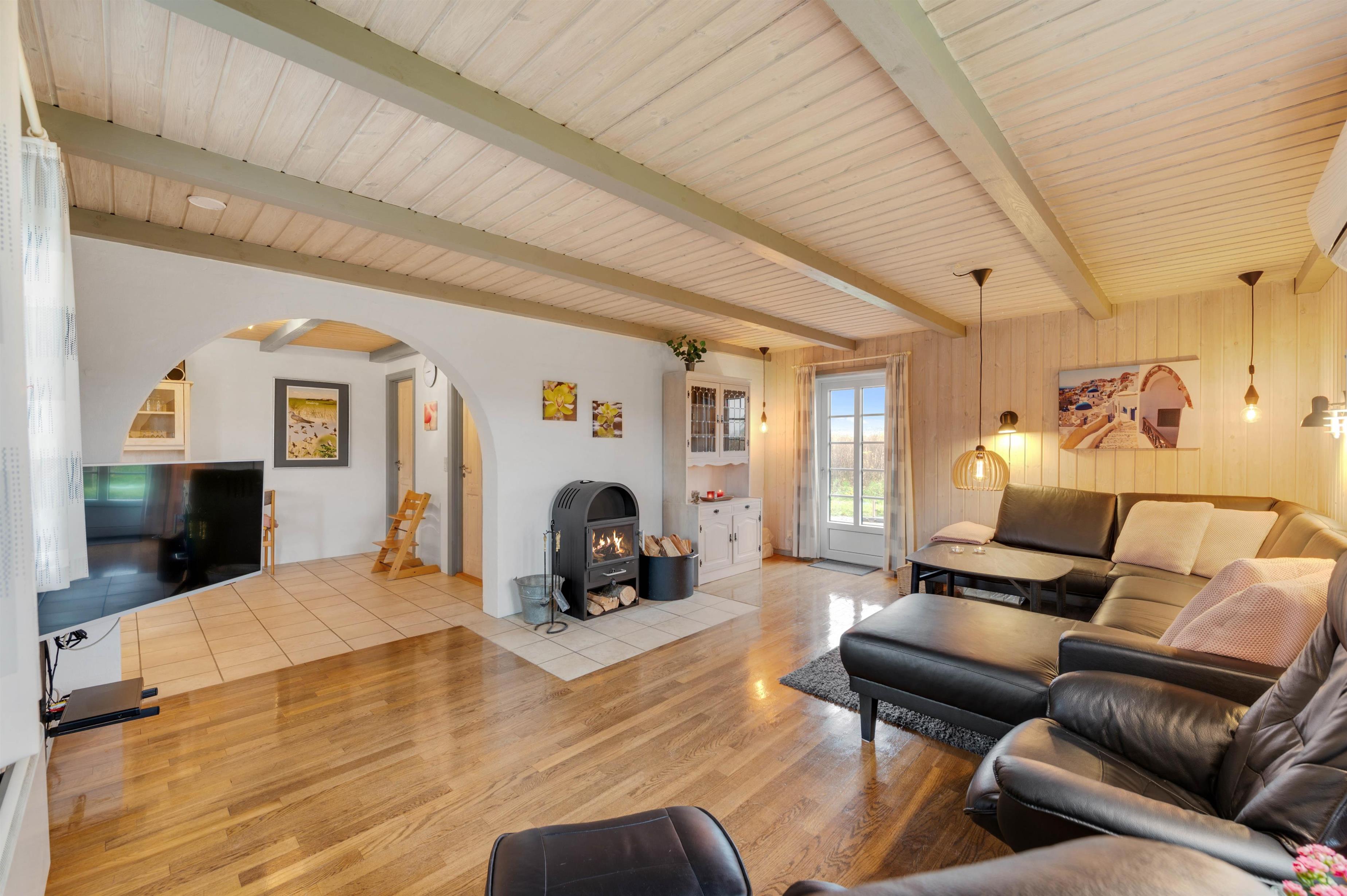 Der er noget ganske særligt over et sommerhus, der ligger med kort afstand til havet. Det er næsten som om, at bølgernes brus har en afsmittende effekt på husets sjæl. Der er i hvert fald dømt vaskeægte sommerhushygge i sommerhuset på Hafavej. Huset er indrettet i klassisk sommerhusstil med bløde møbler, panelvægge og synlige loftsbjælker. Og så er der naturligvis også en lun brændeovn, der sørger for at kaste sin stråleglans på feriedagene med et ekstra drys hygge.